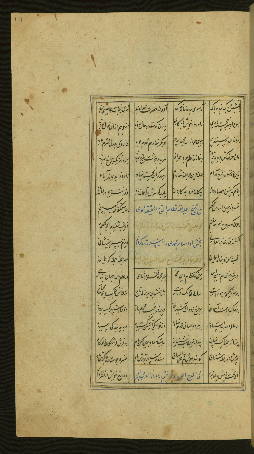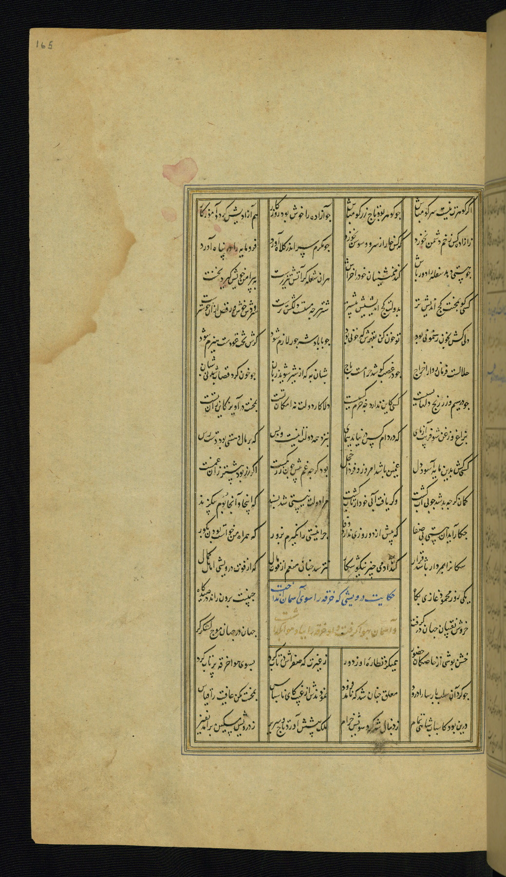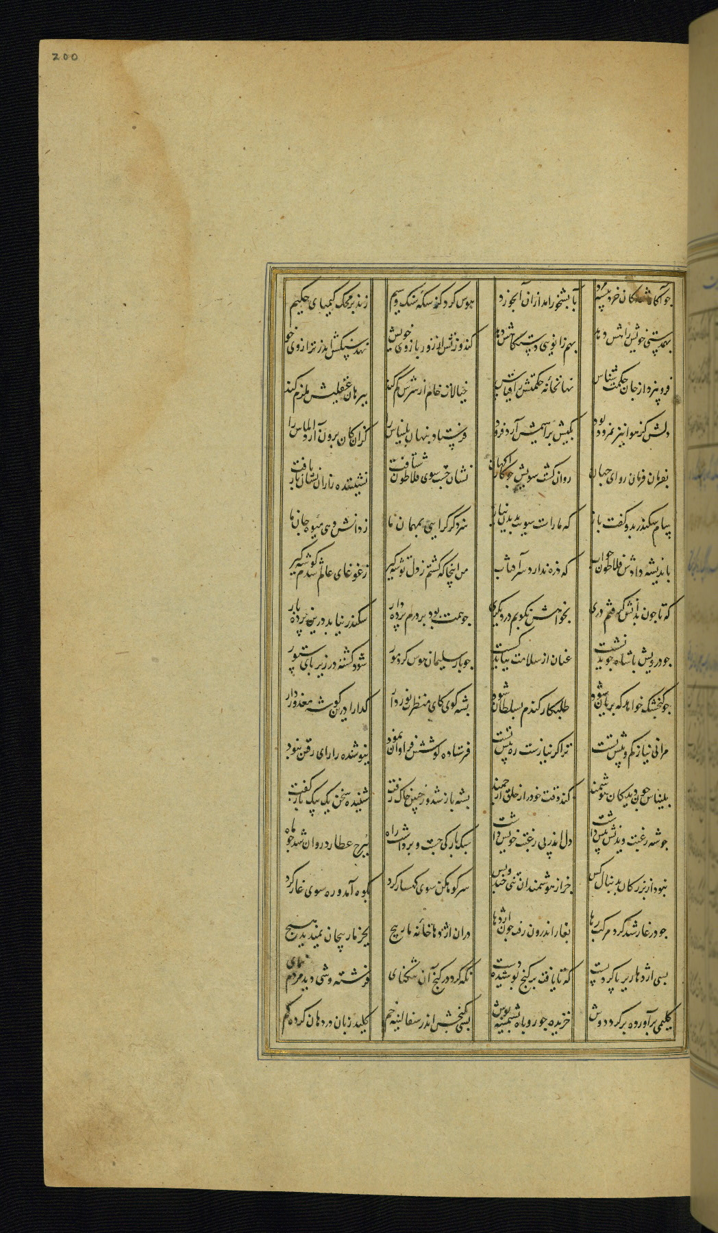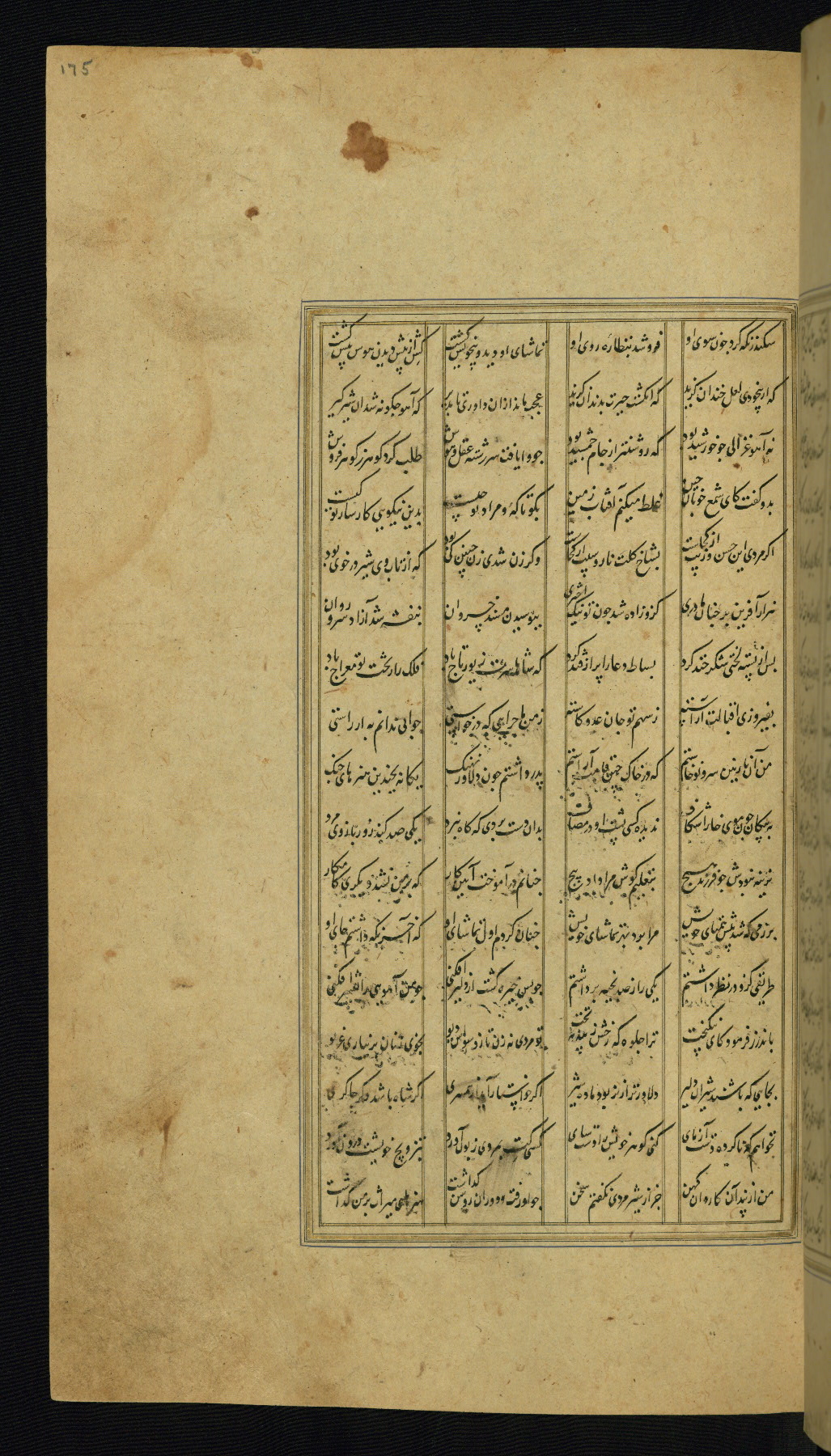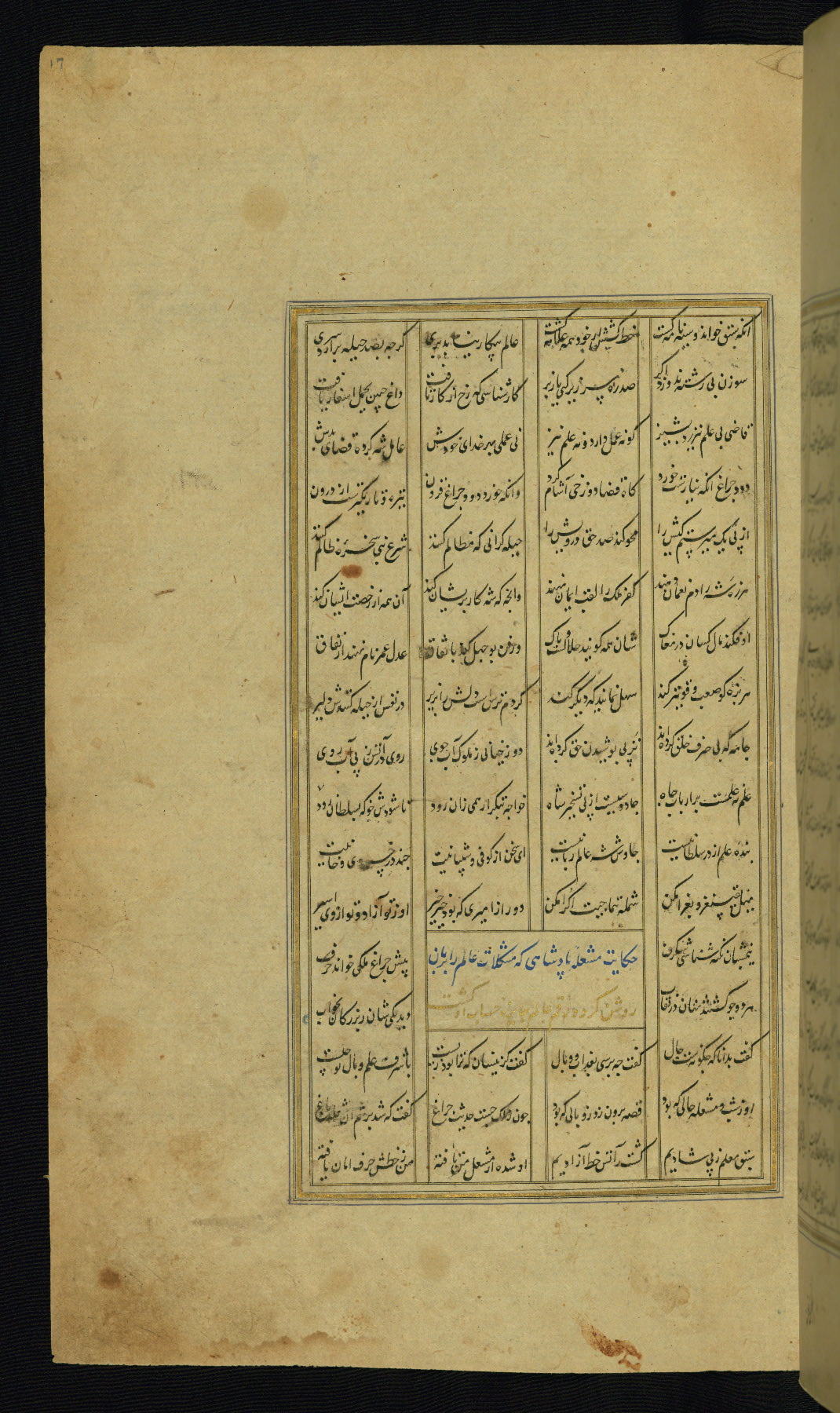 This is an illustrated and illuminated Safavid copy of the Khamsah (quintet) of Amīr Khusraw Dihlavī (d. 725 AH / 1325 CE), written by Pīr Ḥusayn al-Kātib al-Shīrāzī in 935 AH / 1529 CE. The codex opens with a double-page illuminated frontispiece with verses in honor of the poet Mir (Amir) Khusraw (fols. 1b-2a). There are four illuminated incipit pages introducing the individual poems, and thirteen paintings illustrate the text. The lacquer binding, which is not original to the manuscript, has a hunting scene on the upper and lower boards. The lower board is inscribed yā Shāh Najaf (oh, King of Najaf, i.e. ʿAlī) and is dated 1271 AH / 1854 CE.
