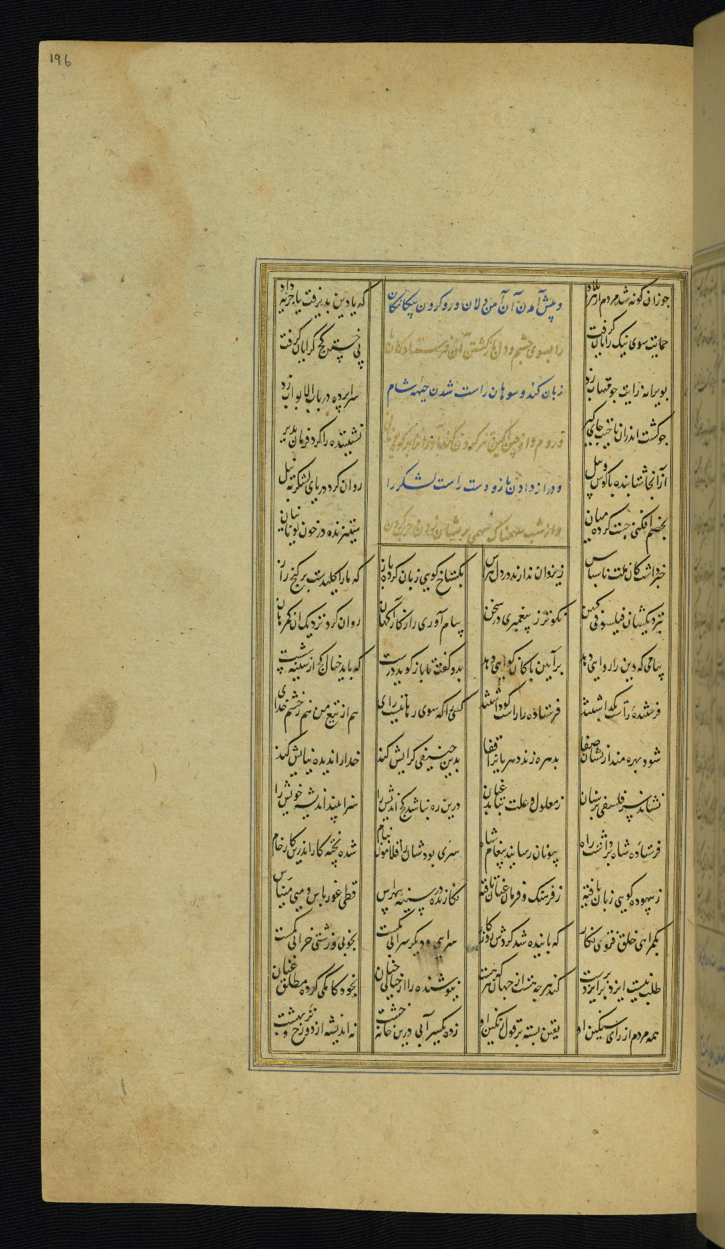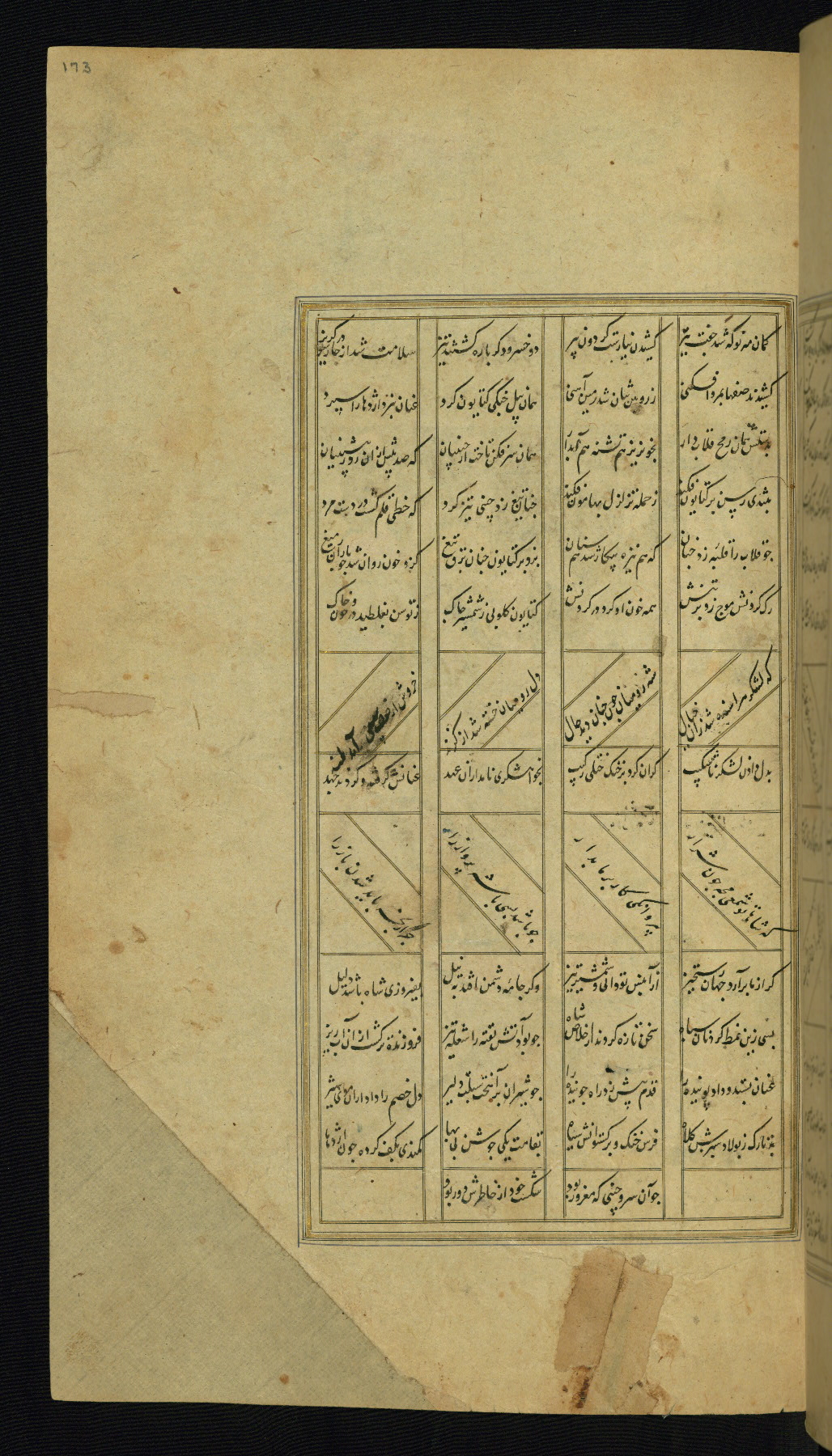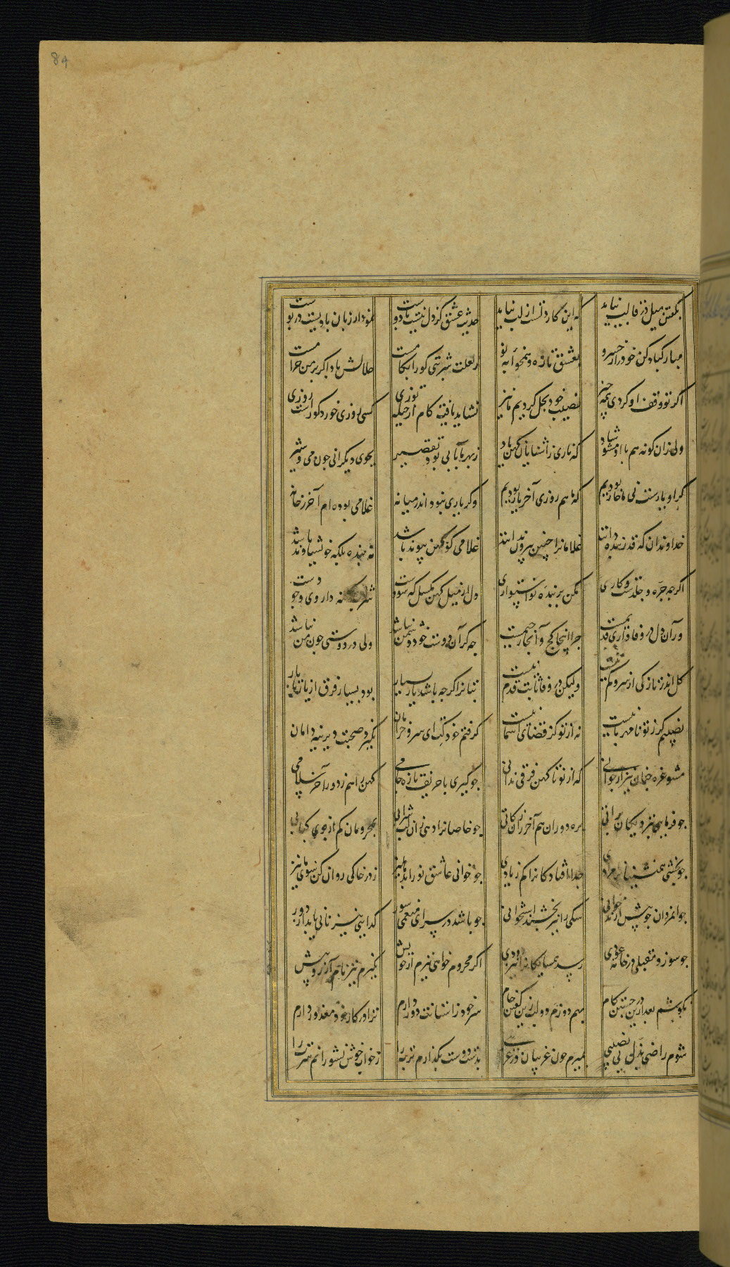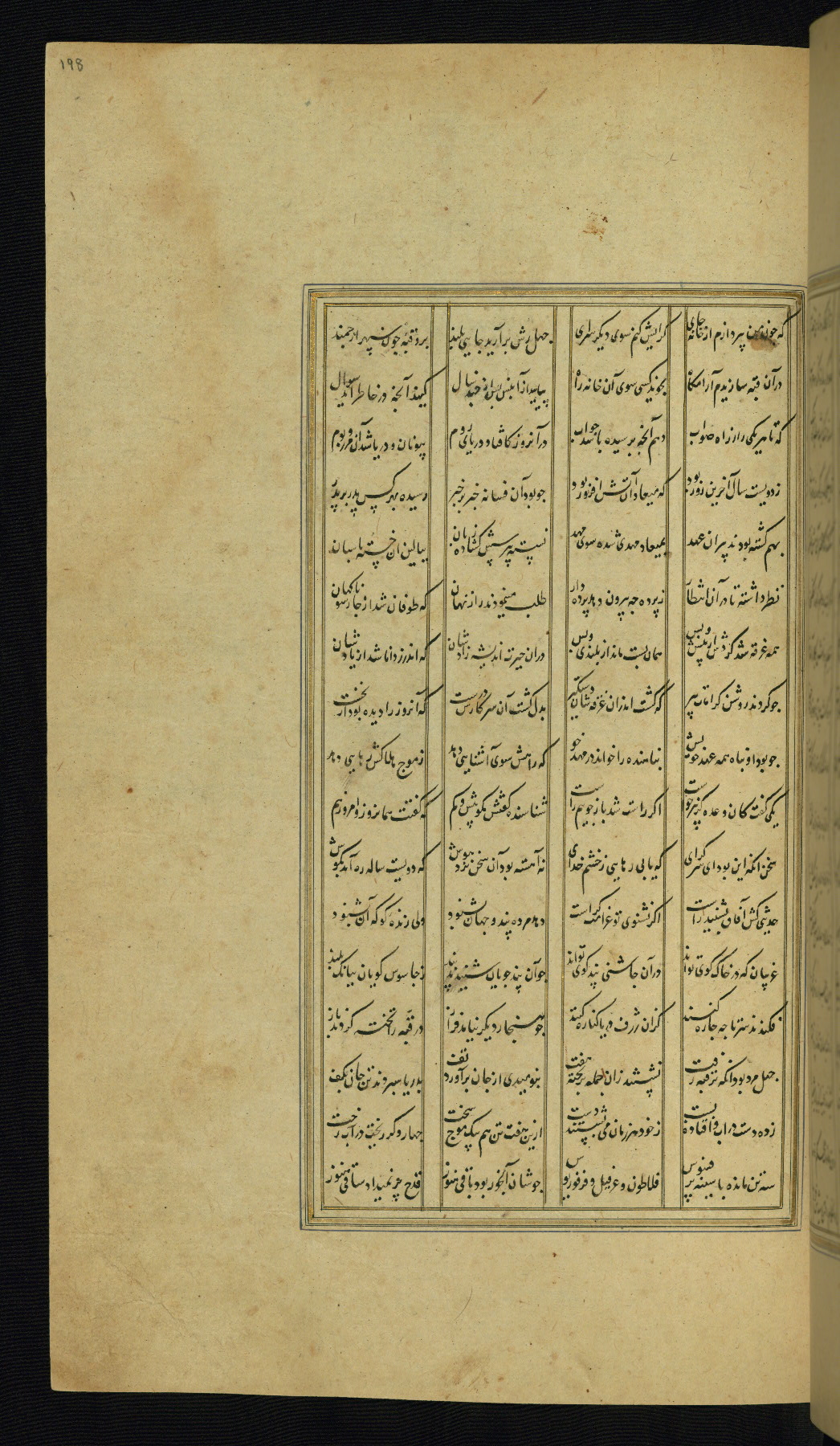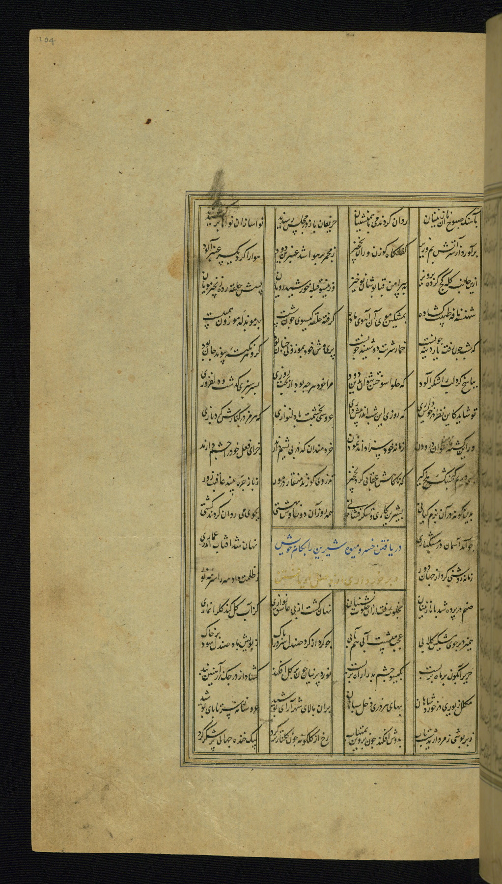 This is an illustrated and illuminated Safavid copy of the Khamsah (quintet) of Amīr Khusraw Dihlavī (d. 725 AH / 1325 CE), written by Pīr Ḥusayn al-Kātib al-Shīrāzī in 935 AH / 1529 CE. The codex opens with a double-page illuminated frontispiece with verses in honor of the poet Mir (Amir) Khusraw (fols. 1b-2a). There are four illuminated incipit pages introducing the individual poems, and thirteen paintings illustrate the text. The lacquer binding, which is not original to the manuscript, has a hunting scene on the upper and lower boards. The lower board is inscribed yā Shāh Najaf (oh, King of Najaf, i.e. ʿAlī) and is dated 1271 AH / 1854 CE.