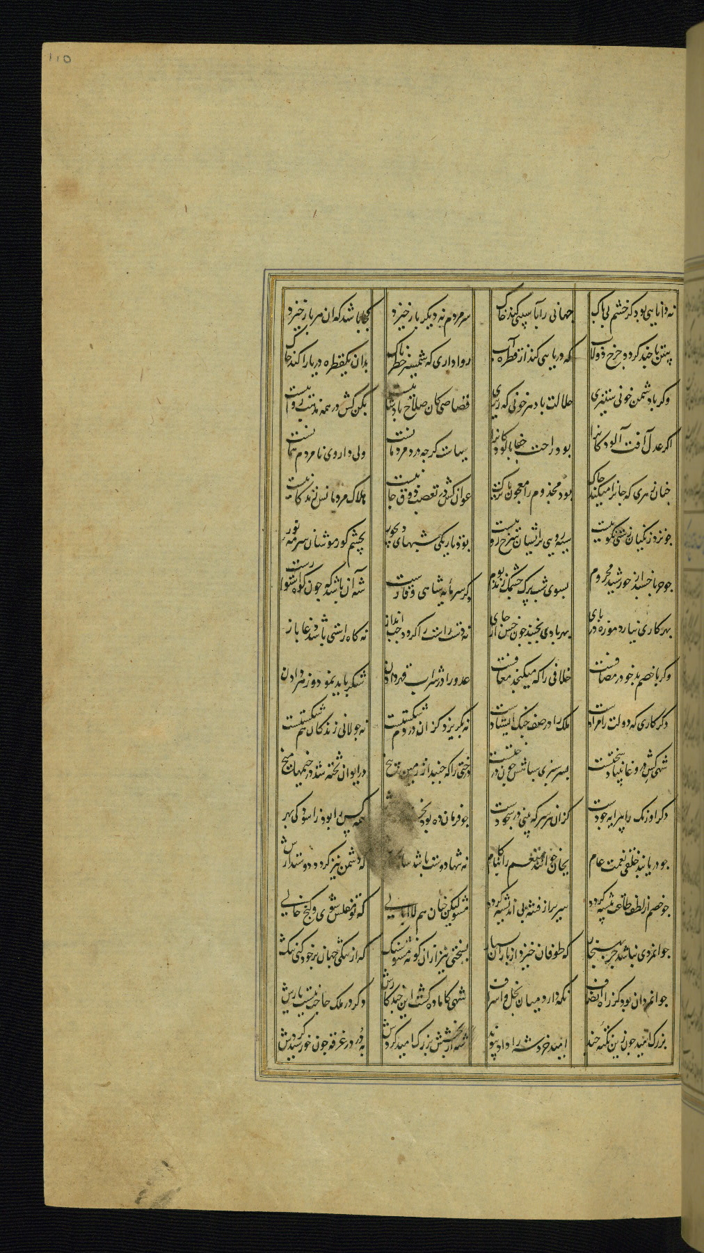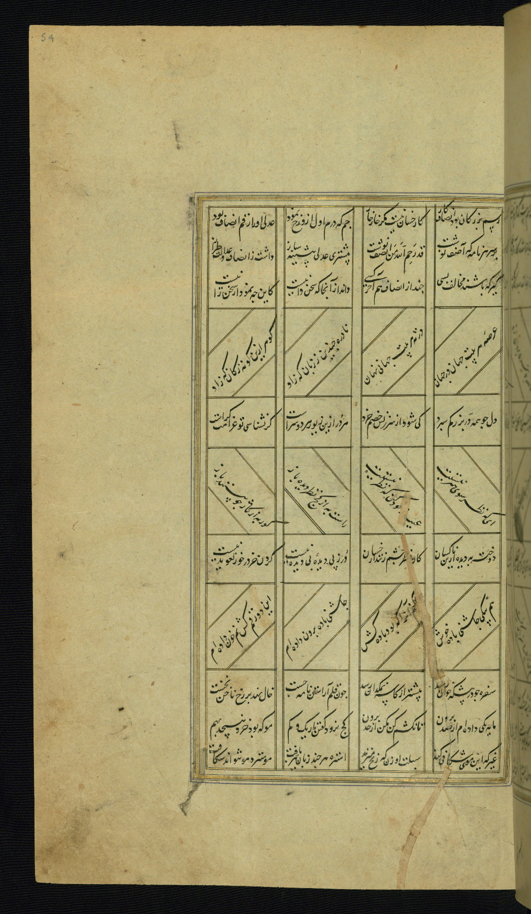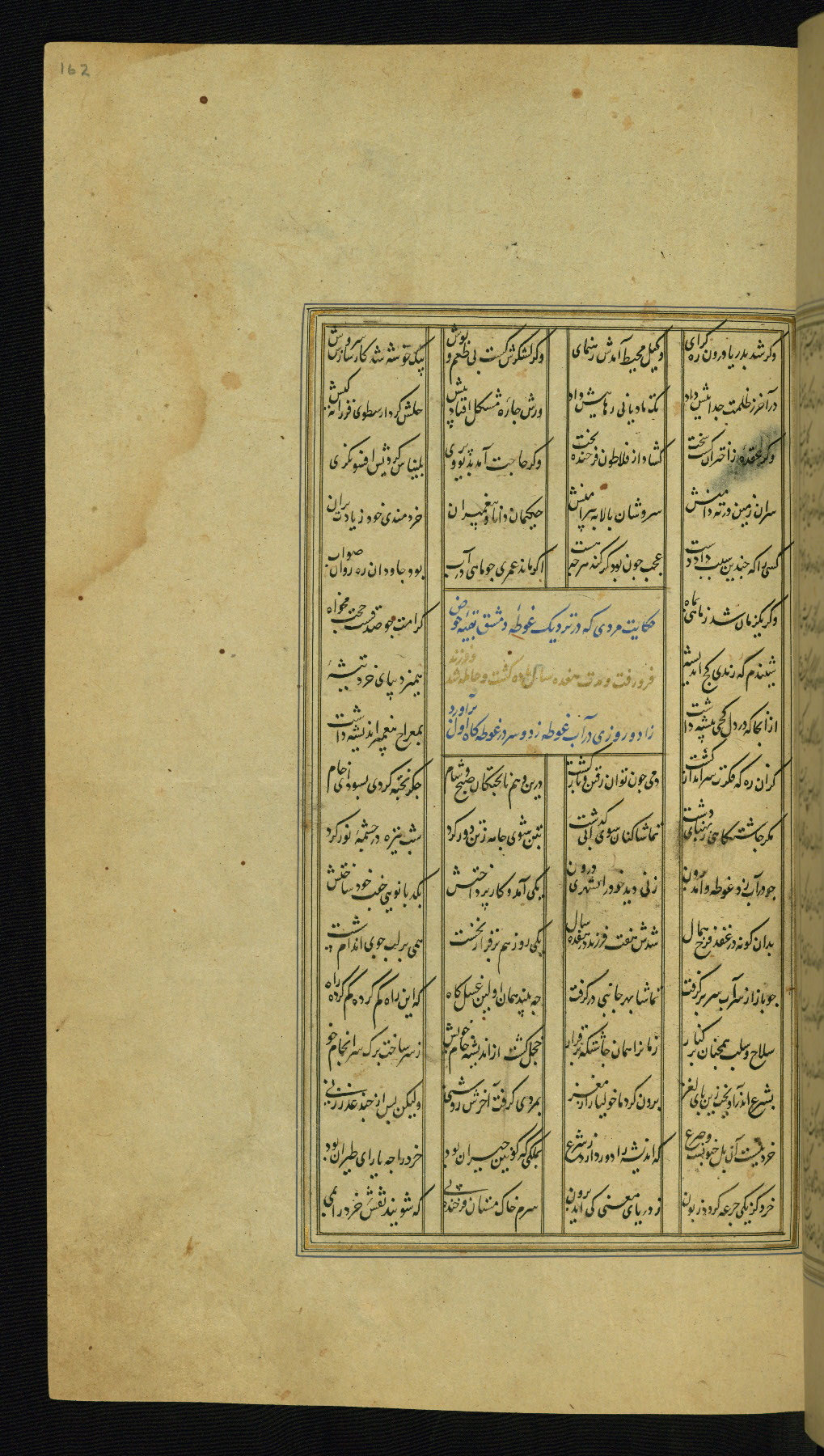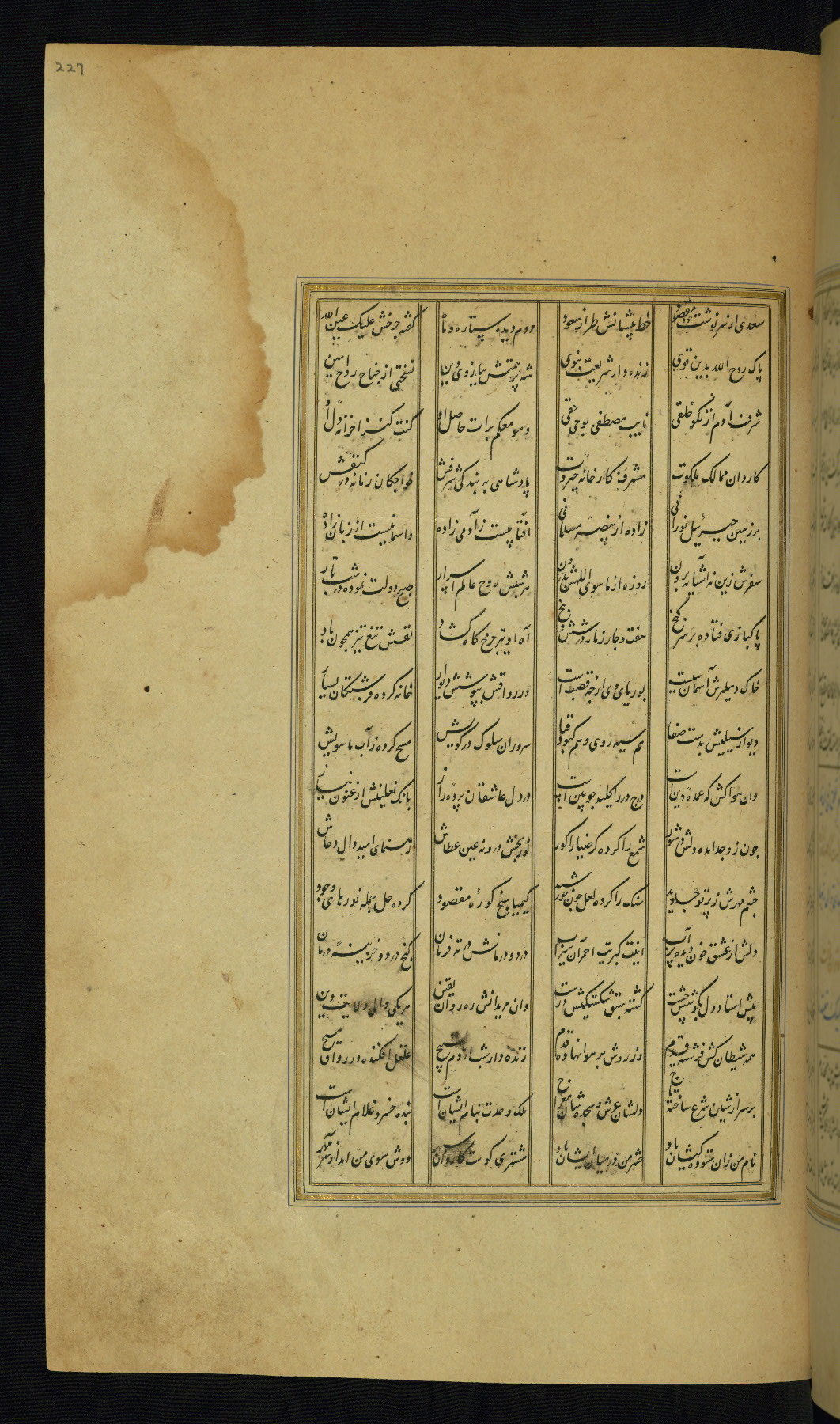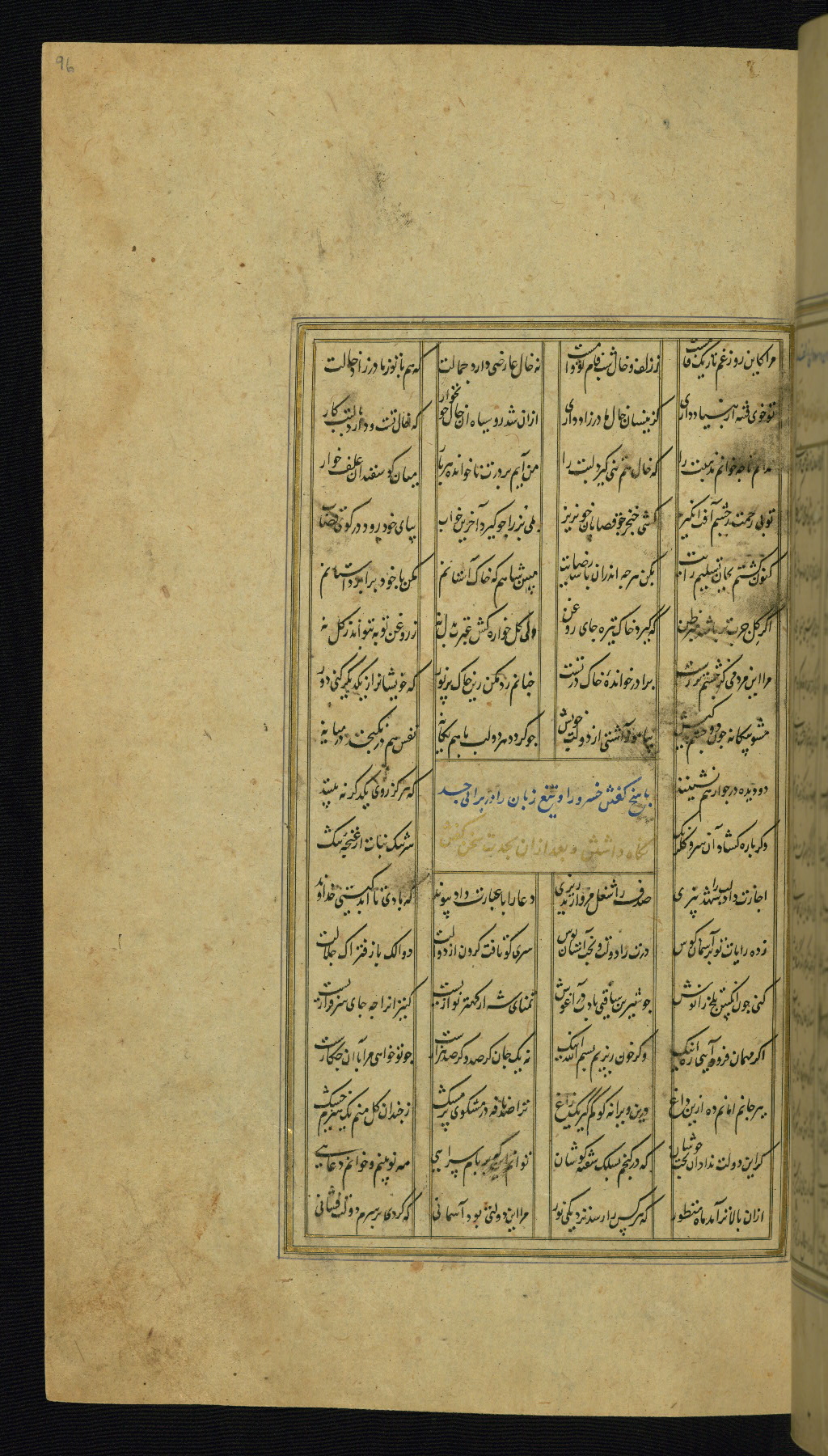 This is an illustrated and illuminated Safavid copy of the Khamsah (quintet) of Amīr Khusraw Dihlavī (d. 725 AH / 1325 CE), written by Pīr Ḥusayn al-Kātib al-Shīrāzī in 935 AH / 1529 CE. The codex opens with a double-page illuminated frontispiece with verses in honor of the poet Mir (Amir) Khusraw (fols. 1b-2a). There are four illuminated incipit pages introducing the individual poems, and thirteen paintings illustrate the text. The lacquer binding, which is not original to the manuscript, has a hunting scene on the upper and lower boards. The lower board is inscribed yā Shāh Najaf (oh, King of Najaf, i.e. ʿAlī) and is dated 1271 AH / 1854 CE.