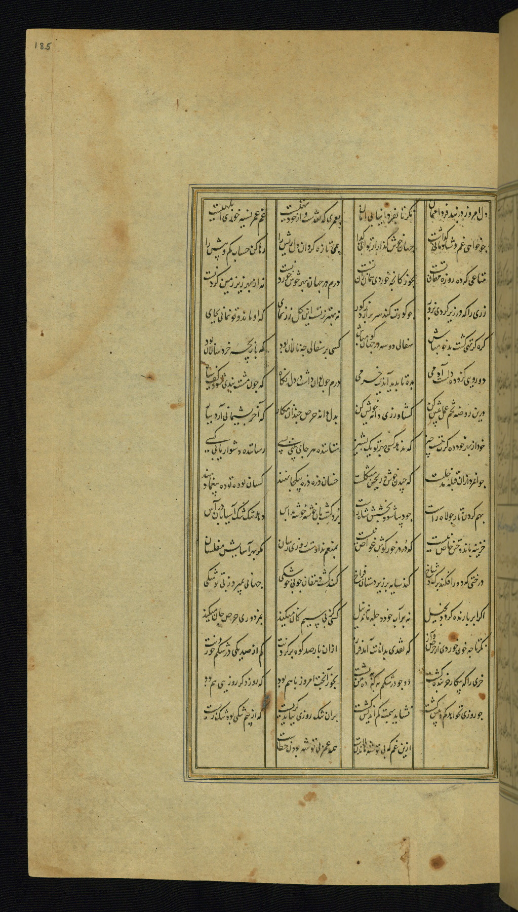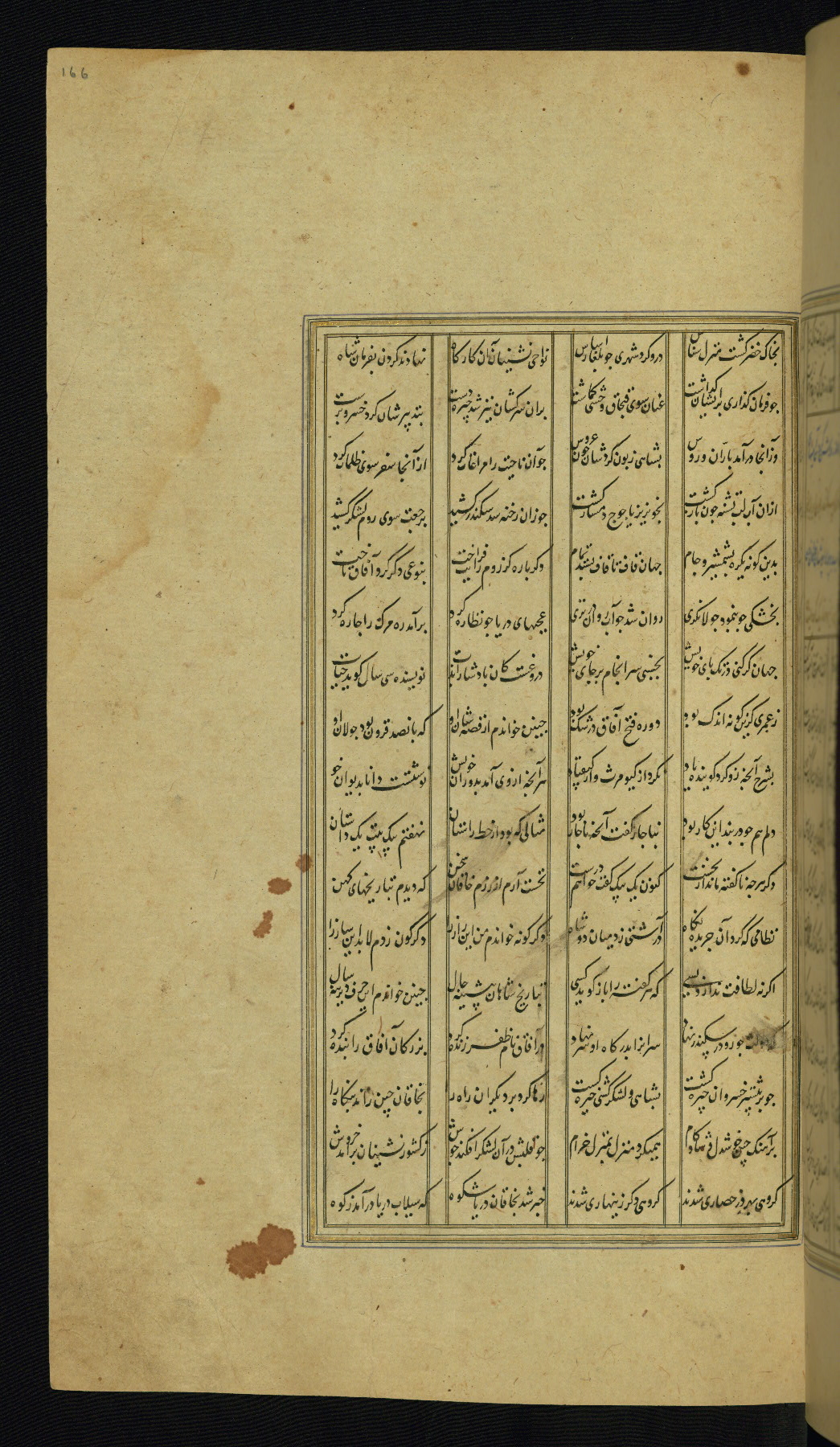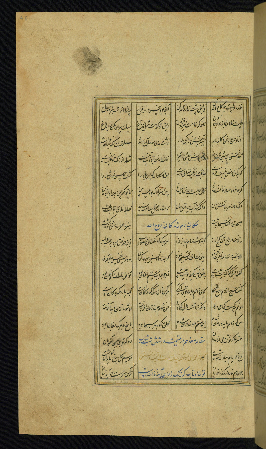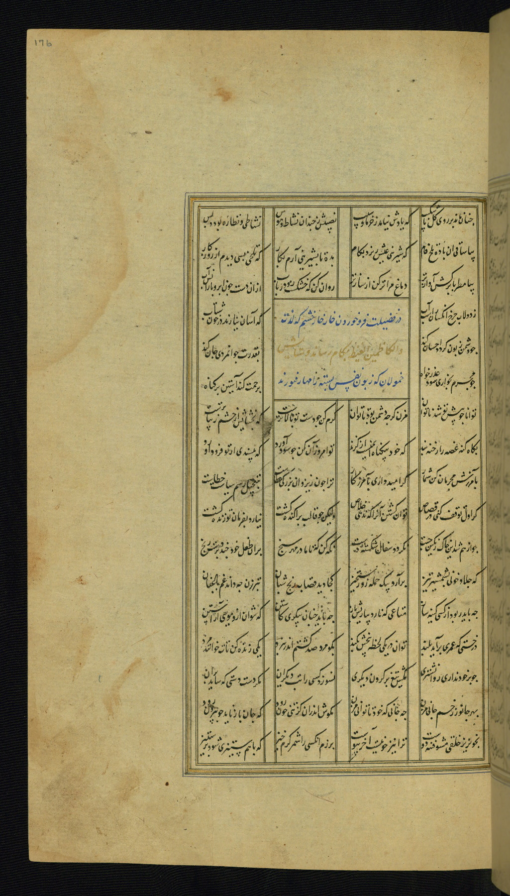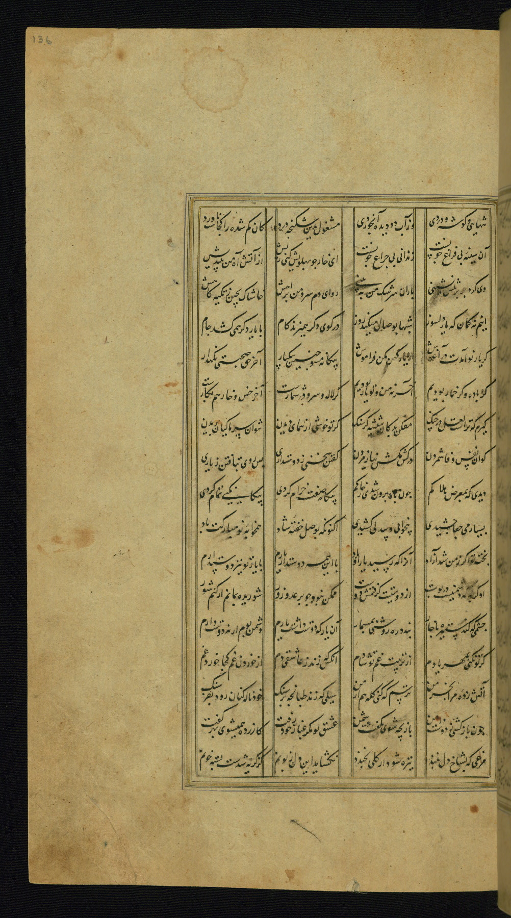 This is an illustrated and illuminated Safavid copy of the Khamsah (quintet) of Amīr Khusraw Dihlavī (d. 725 AH / 1325 CE), written by Pīr Ḥusayn al-Kātib al-Shīrāzī in 935 AH / 1529 CE. The codex opens with a double-page illuminated frontispiece with verses in honor of the poet Mir (Amir) Khusraw (fols. 1b-2a). There are four illuminated incipit pages introducing the individual poems, and thirteen paintings illustrate the text. The lacquer binding, which is not original to the manuscript, has a hunting scene on the upper and lower boards. The lower board is inscribed yā Shāh Najaf (oh, King of Najaf, i.e. ʿAlī) and is dated 1271 AH / 1854 CE.