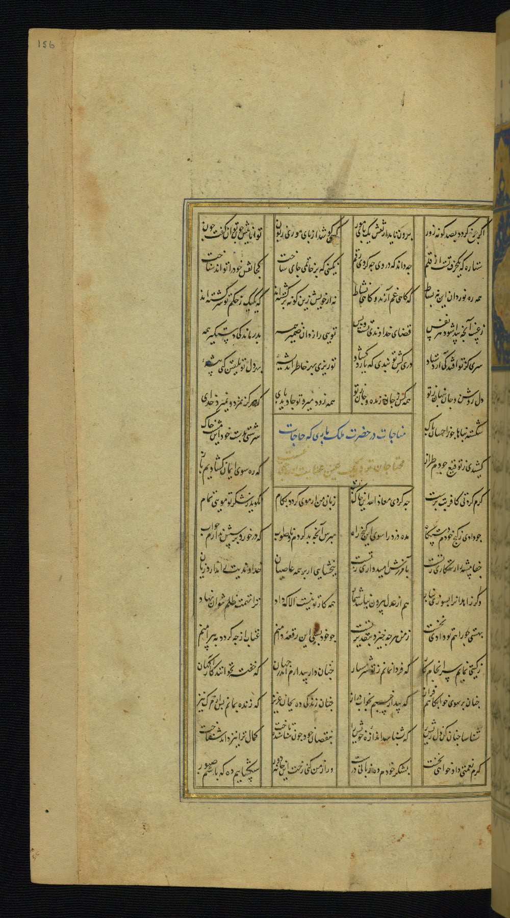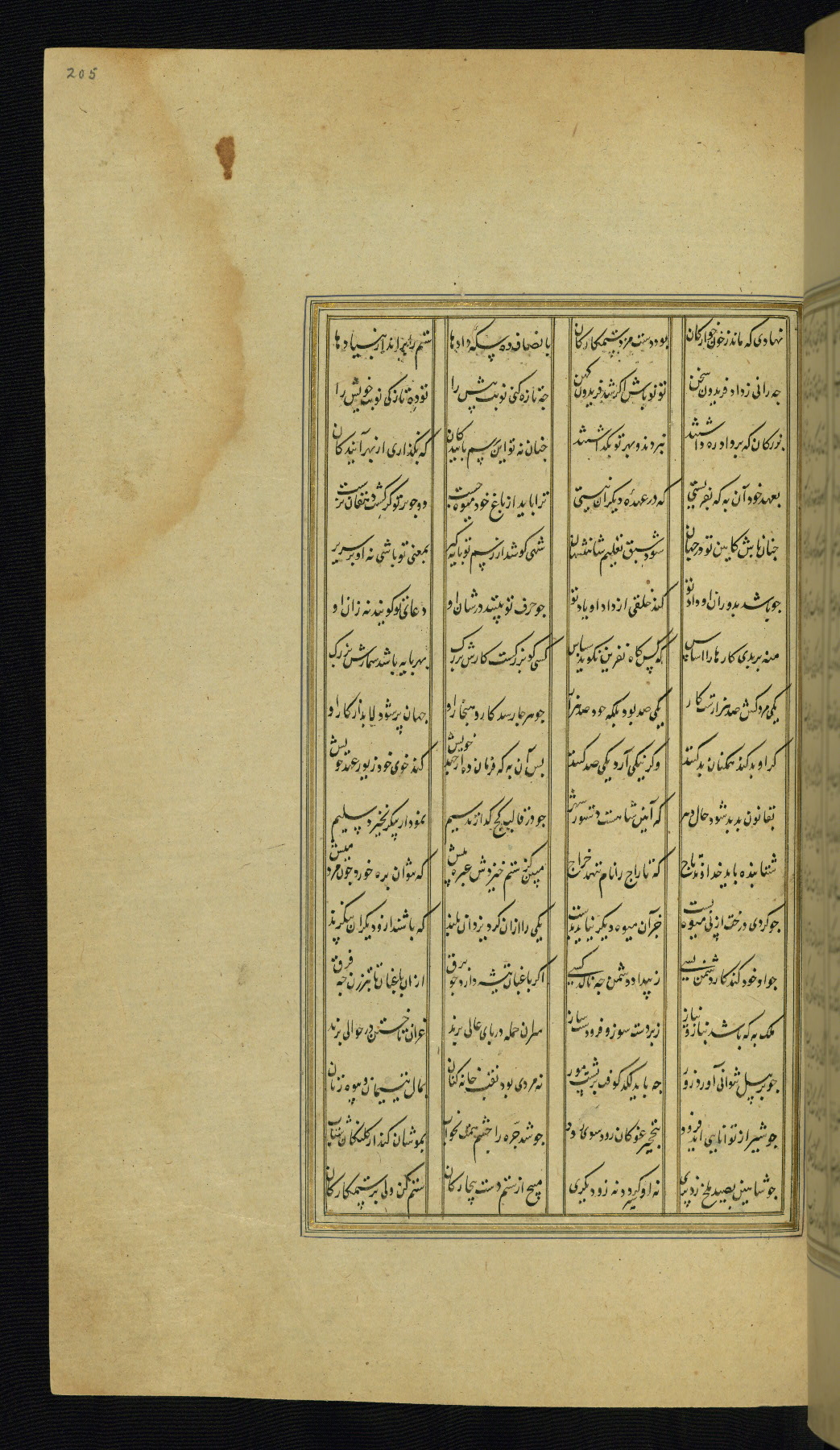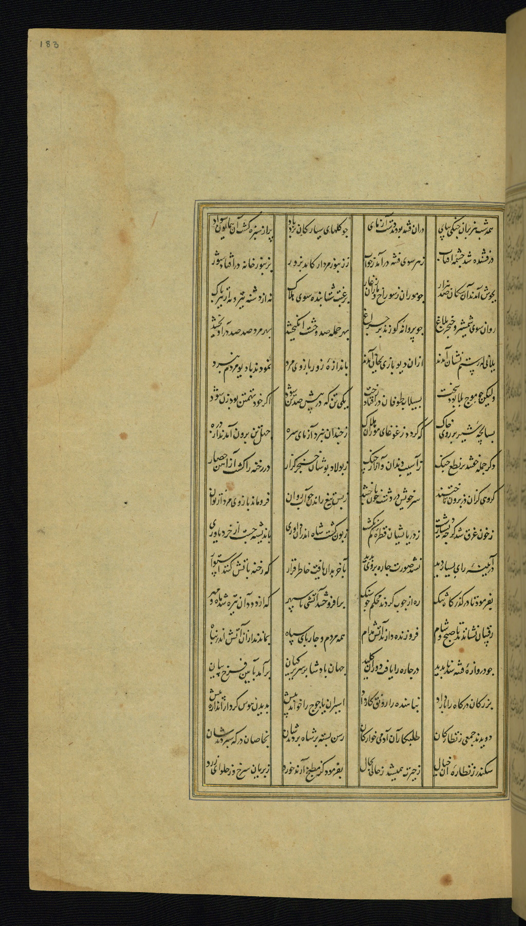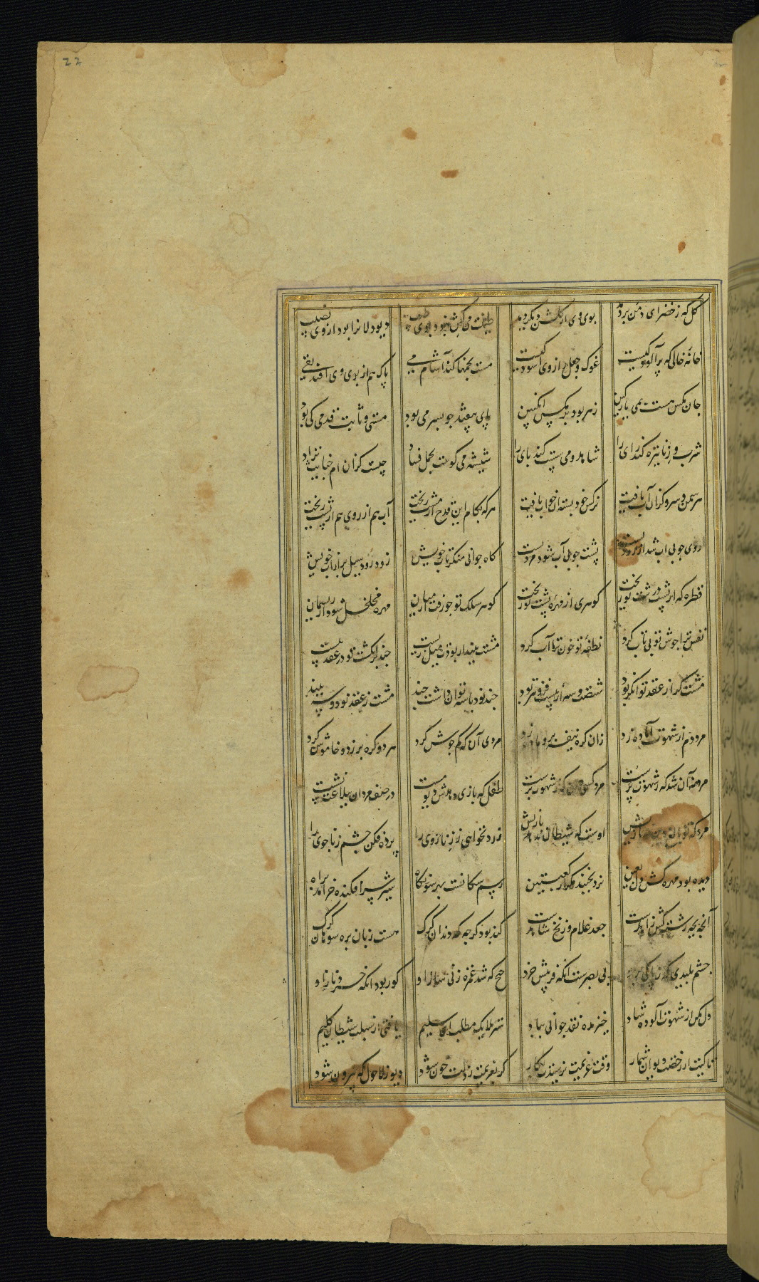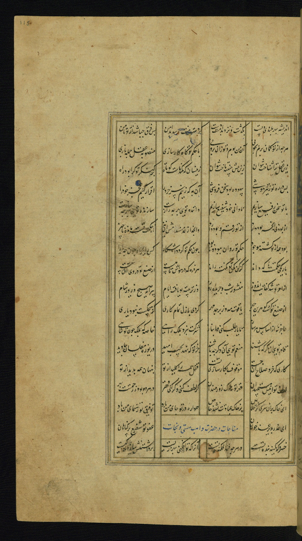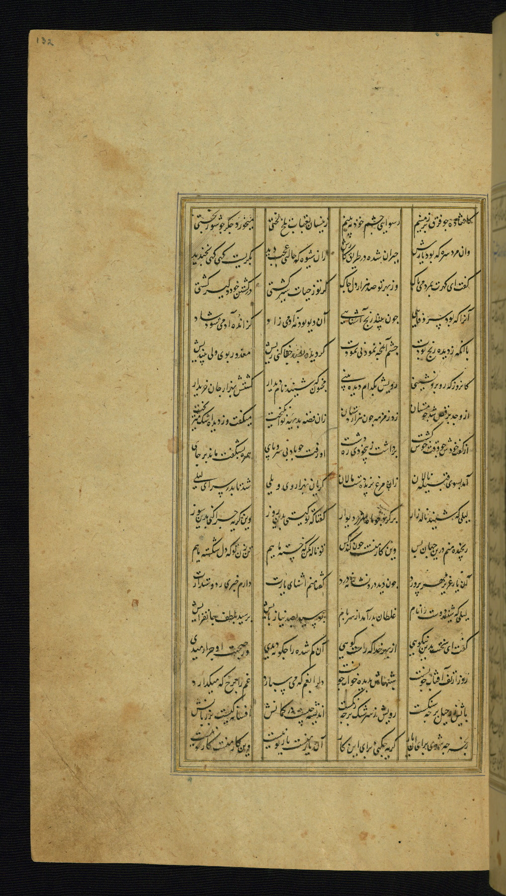 This is an illustrated and illuminated Safavid copy of the Khamsah (quintet) of Amīr Khusraw Dihlavī (d. 725 AH / 1325 CE), written by Pīr Ḥusayn al-Kātib al-Shīrāzī in 935 AH / 1529 CE. The codex opens with a double-page illuminated frontispiece with verses in honor of the poet Mir (Amir) Khusraw (fols. 1b-2a). There are four illuminated incipit pages introducing the individual poems, and thirteen paintings illustrate the text. The lacquer binding, which is not original to the manuscript, has a hunting scene on the upper and lower boards. The lower board is inscribed yā Shāh Najaf (oh, King of Najaf, i.e. ʿAlī) and is dated 1271 AH / 1854 CE.