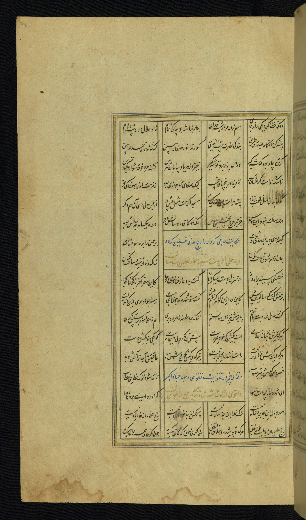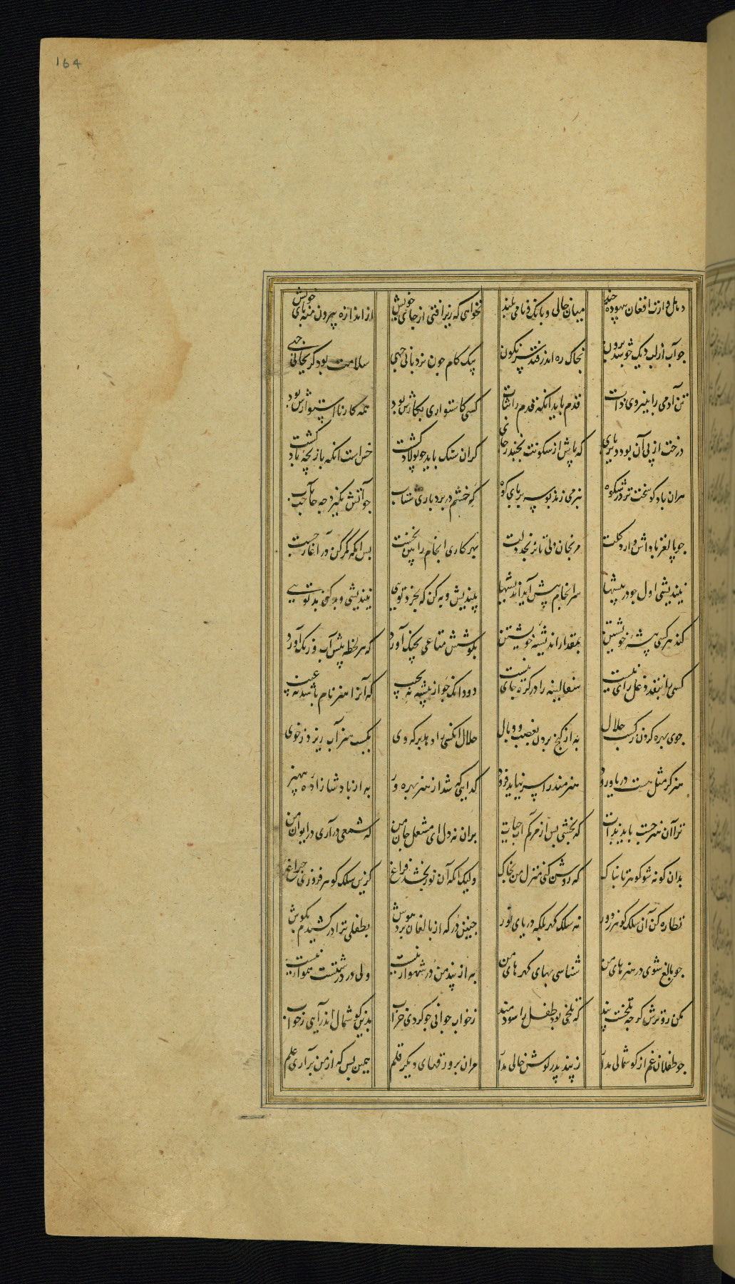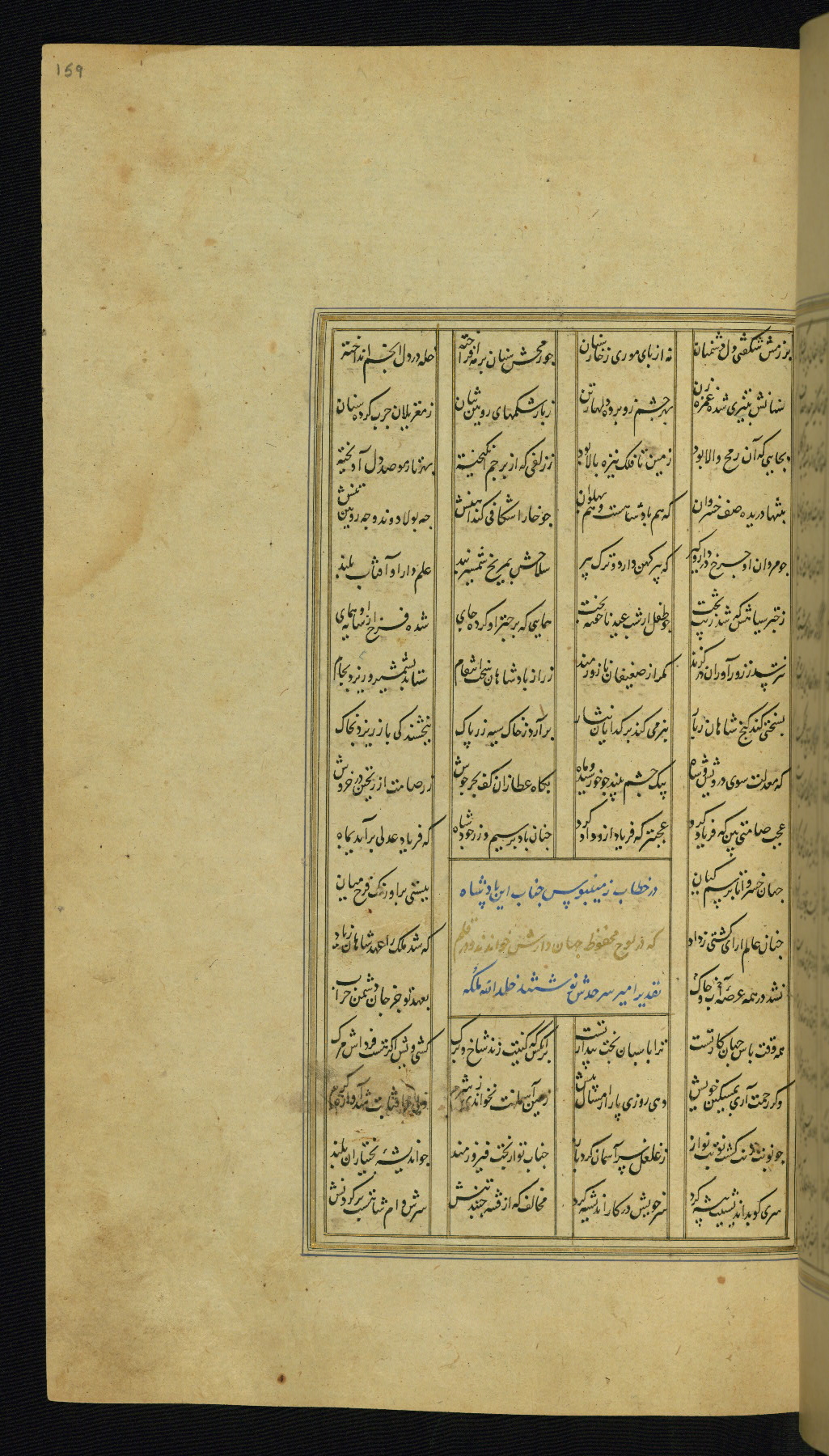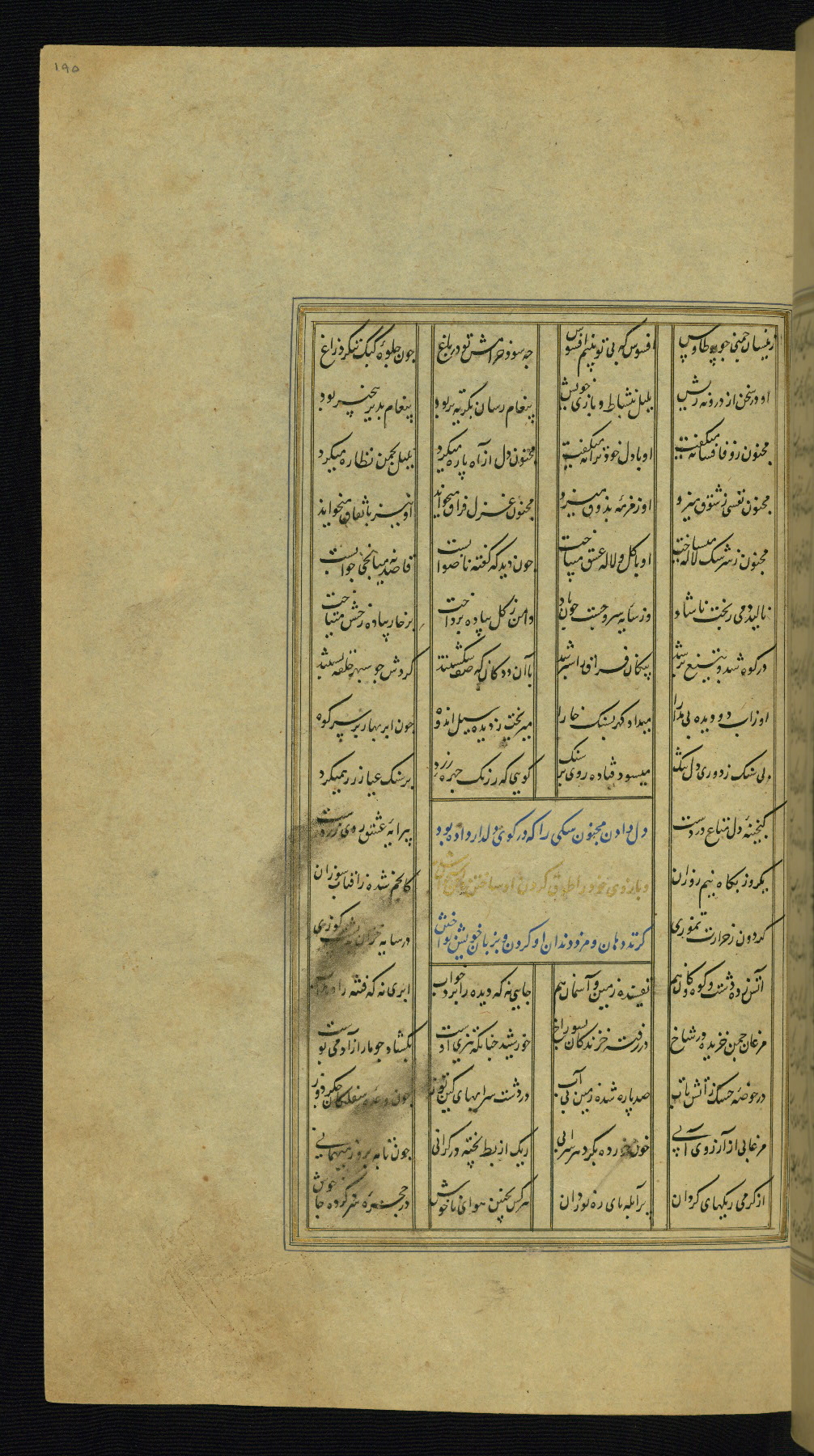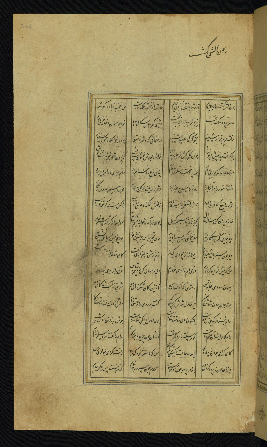 This is an illustrated and illuminated Safavid copy of the Khamsah (quintet) of Amīr Khusraw Dihlavī (d. 725 AH / 1325 CE), written by Pīr Ḥusayn al-Kātib al-Shīrāzī in 935 AH / 1529 CE. The codex opens with a double-page illuminated frontispiece with verses in honor of the poet Mir (Amir) Khusraw (fols. 1b-2a). There are four illuminated incipit pages introducing the individual poems, and thirteen paintings illustrate the text. The lacquer binding, which is not original to the manuscript, has a hunting scene on the upper and lower boards. The lower board is inscribed yā Shāh Najaf (oh, King of Najaf, i.e. ʿAlī) and is dated 1271 AH / 1854 CE.