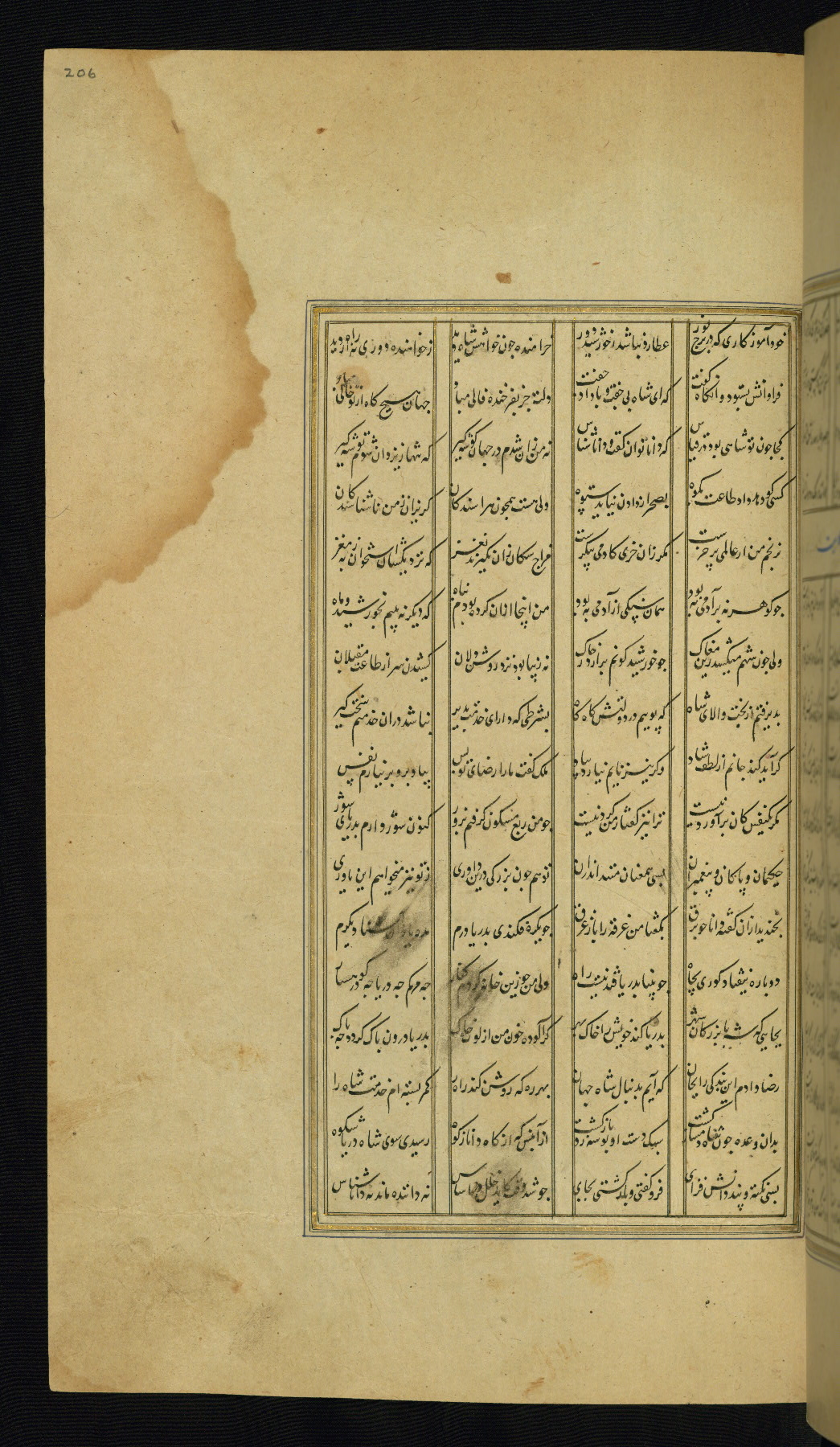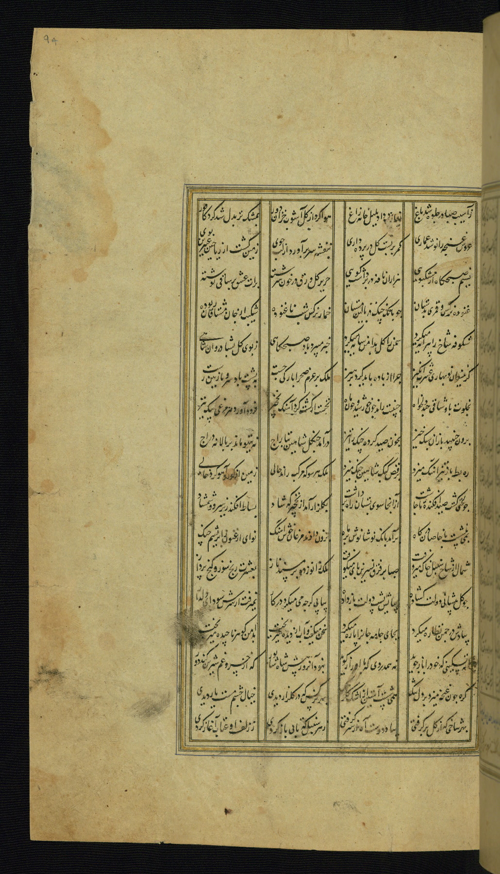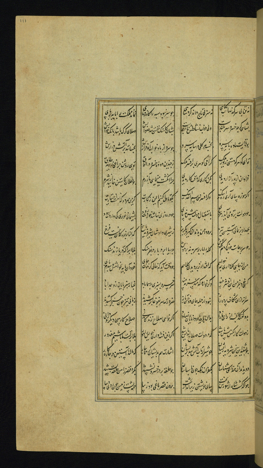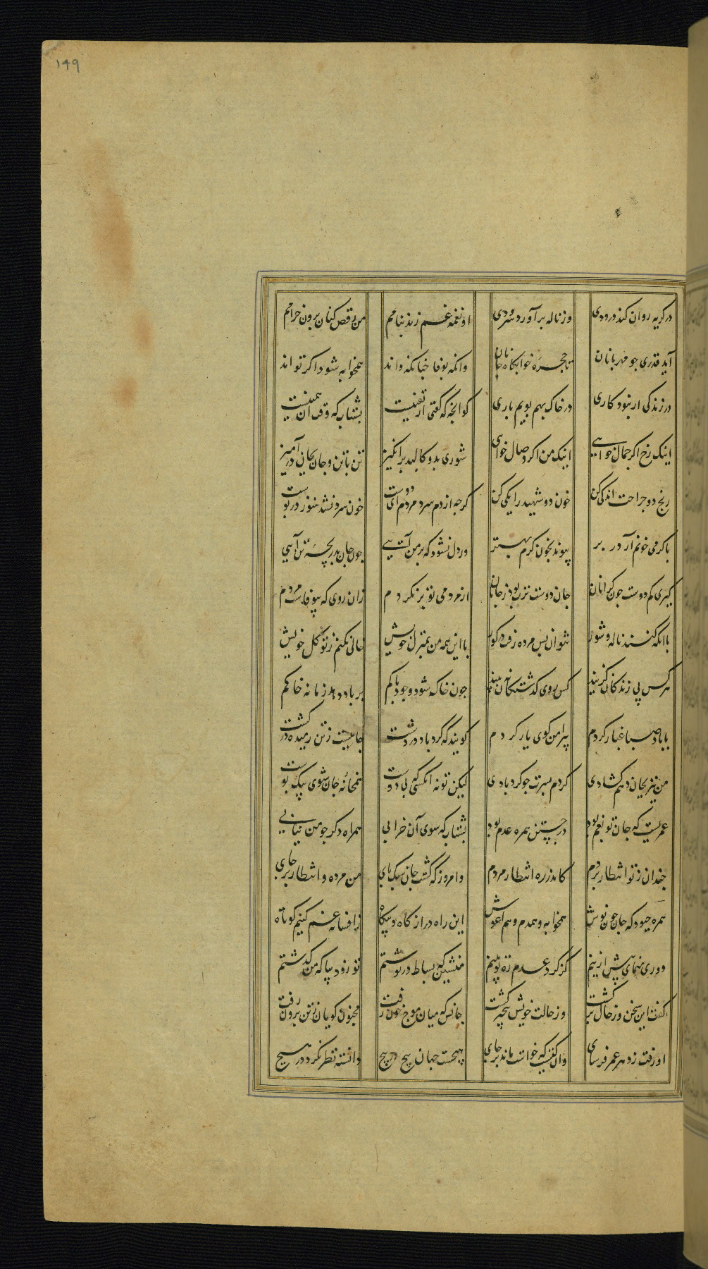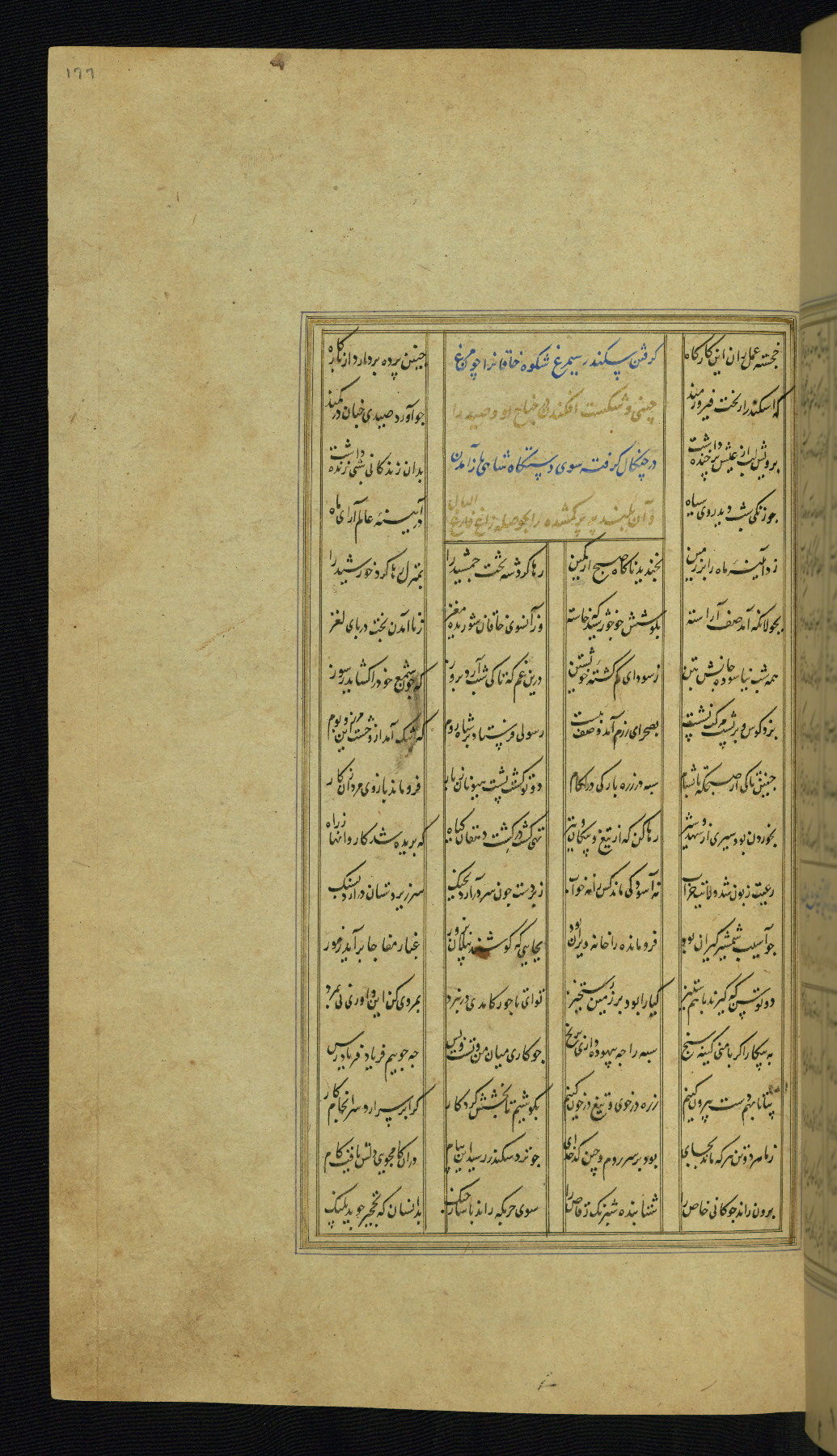 This is an illustrated and illuminated Safavid copy of the Khamsah (quintet) of Amīr Khusraw Dihlavī (d. 725 AH / 1325 CE), written by Pīr Ḥusayn al-Kātib al-Shīrāzī in 935 AH / 1529 CE. The codex opens with a double-page illuminated frontispiece with verses in honor of the poet Mir (Amir) Khusraw (fols. 1b-2a). There are four illuminated incipit pages introducing the individual poems, and thirteen paintings illustrate the text. The lacquer binding, which is not original to the manuscript, has a hunting scene on the upper and lower boards. The lower board is inscribed yā Shāh Najaf (oh, King of Najaf, i.e. ʿAlī) and is dated 1271 AH / 1854 CE.