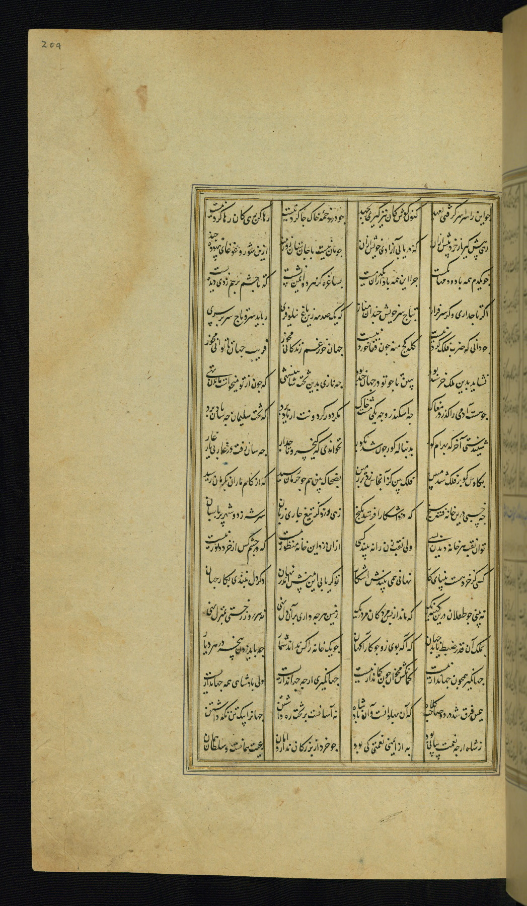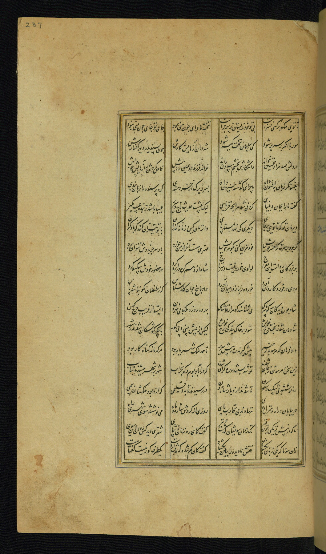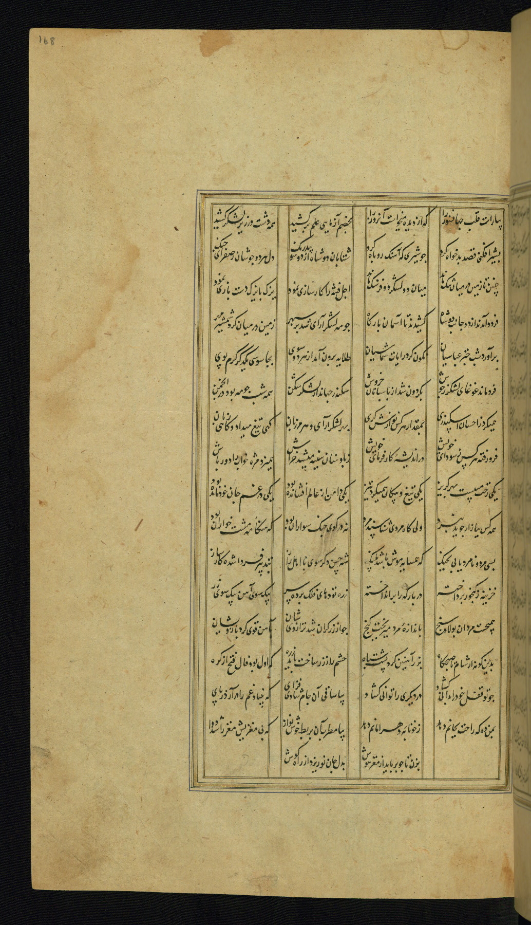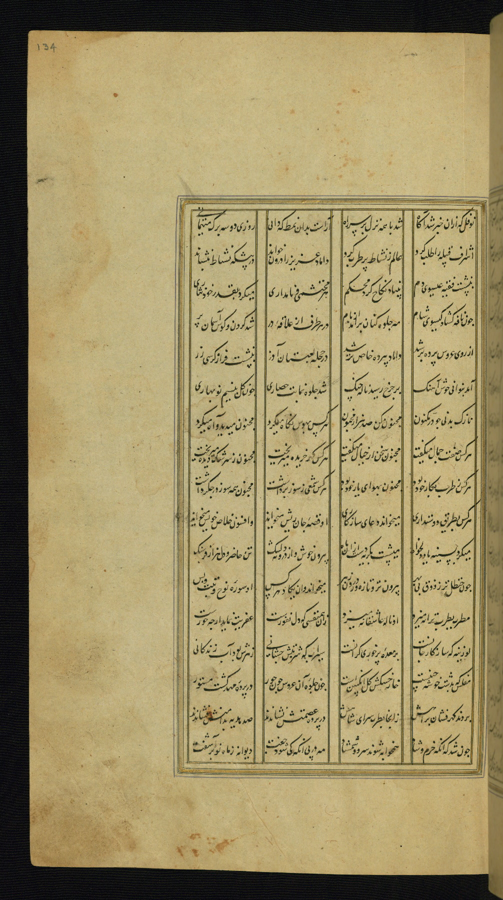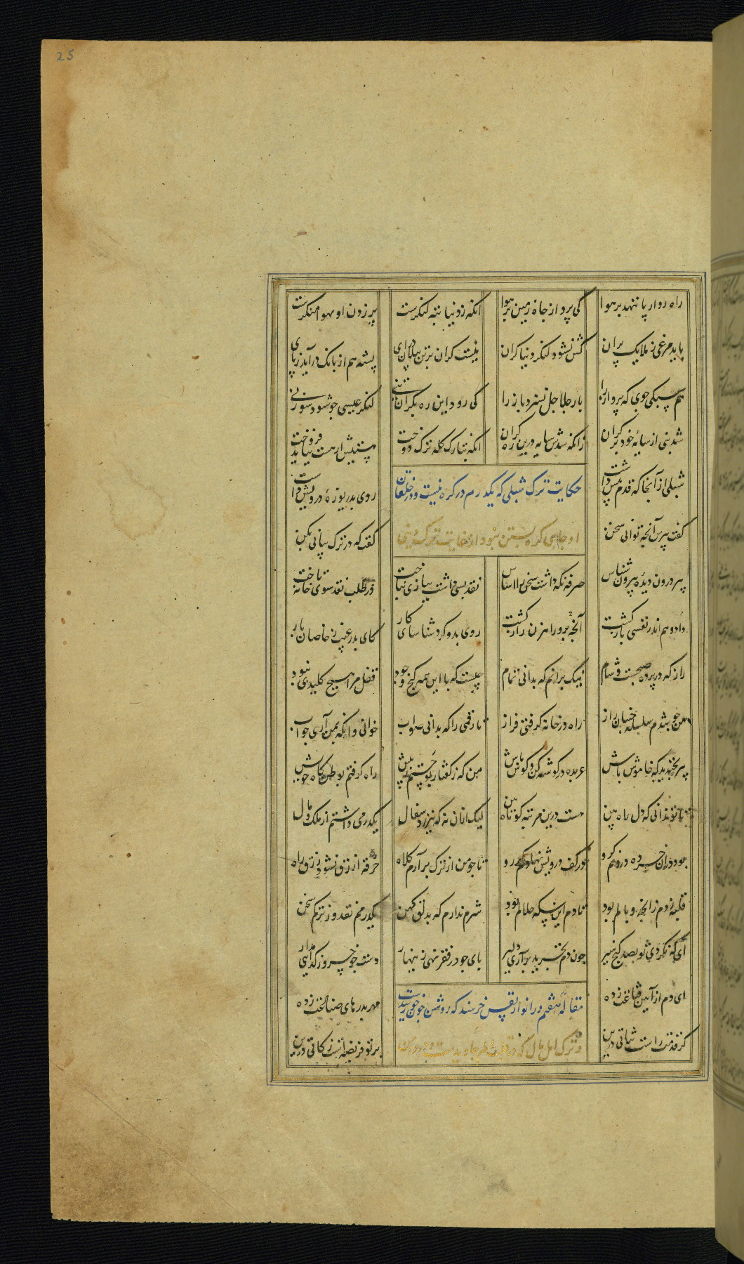 This is an illustrated and illuminated Safavid copy of the Khamsah (quintet) of Amīr Khusraw Dihlavī (d. 725 AH / 1325 CE), written by Pīr Ḥusayn al-Kātib al-Shīrāzī in 935 AH / 1529 CE. The codex opens with a double-page illuminated frontispiece with verses in honor of the poet Mir (Amir) Khusraw (fols. 1b-2a). There are four illuminated incipit pages introducing the individual poems, and thirteen paintings illustrate the text. The lacquer binding, which is not original to the manuscript, has a hunting scene on the upper and lower boards. The lower board is inscribed yā Shāh Najaf (oh, King of Najaf, i.e. ʿAlī) and is dated 1271 AH / 1854 CE.