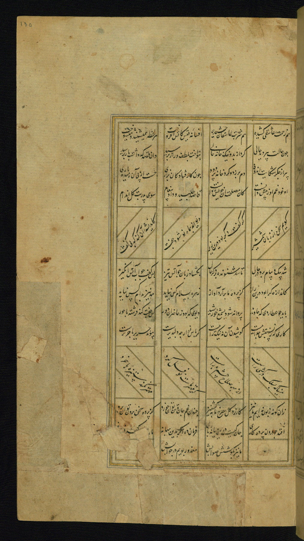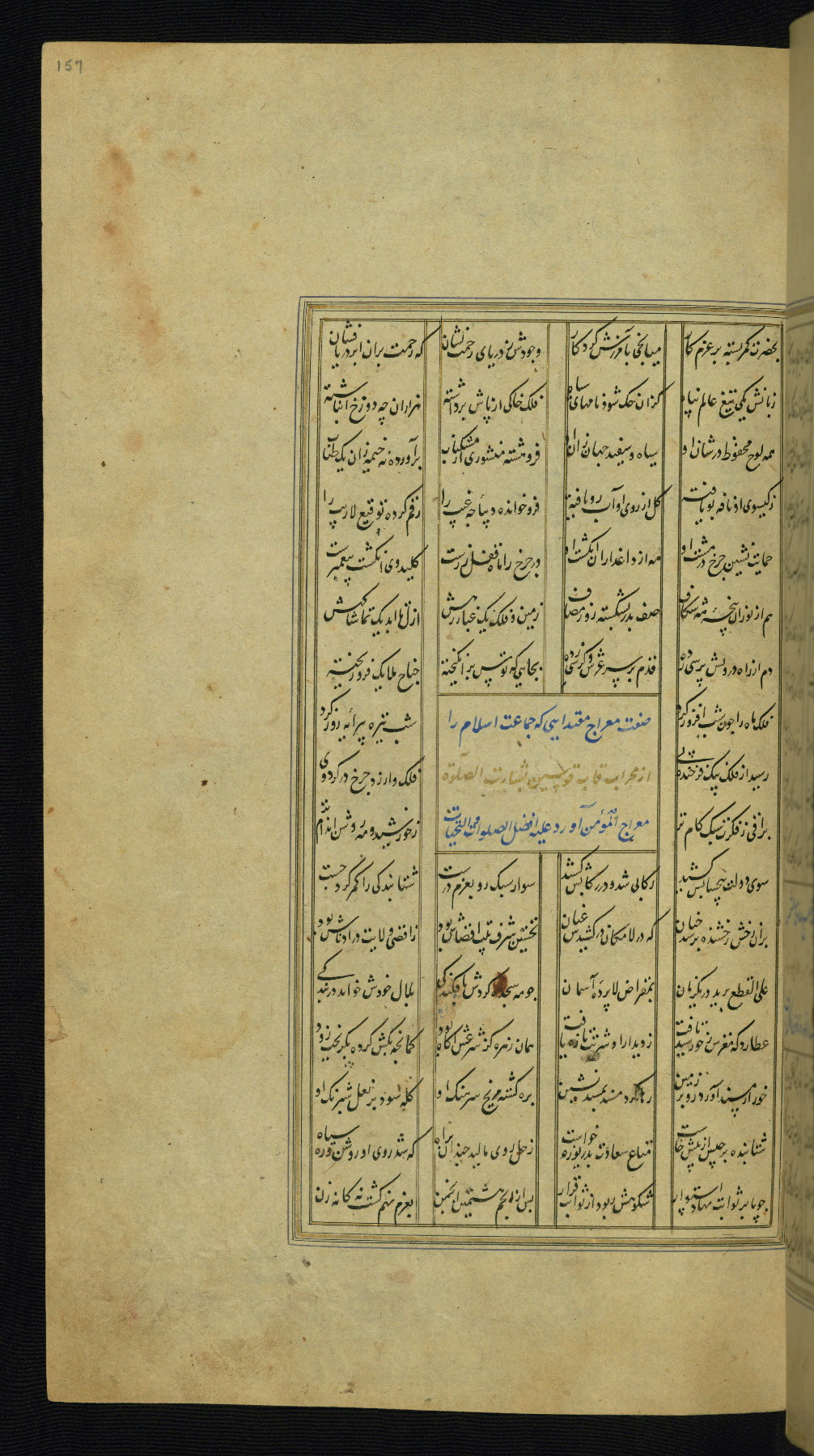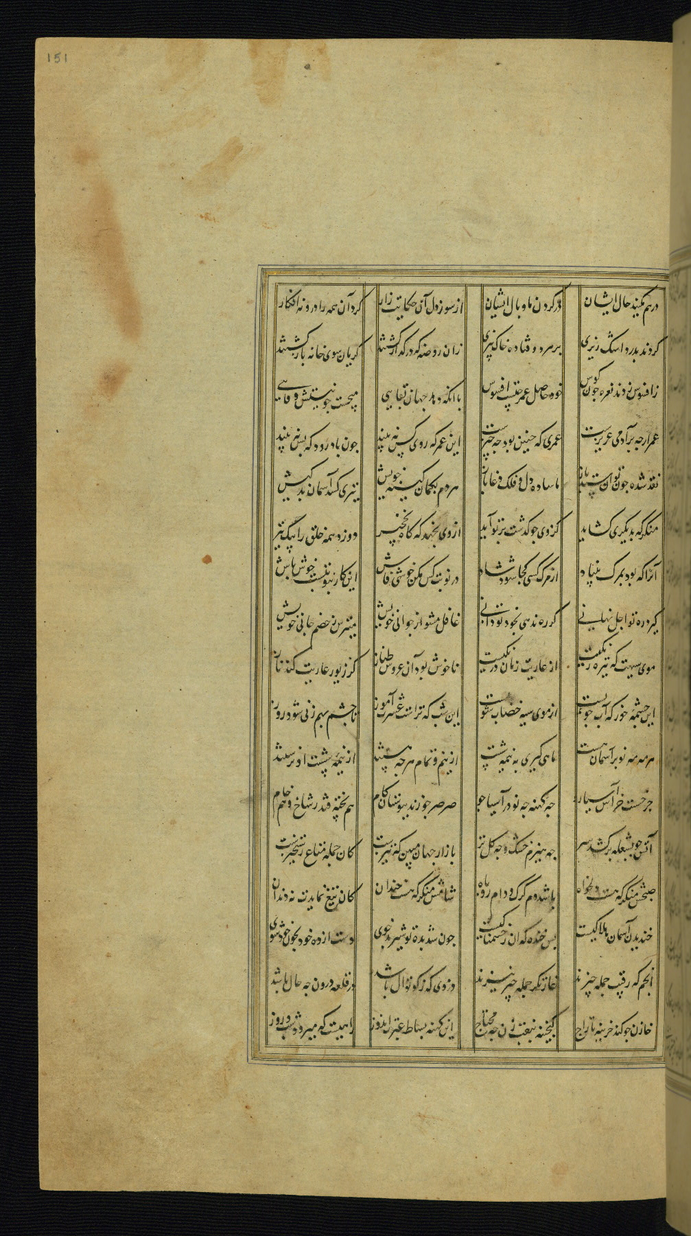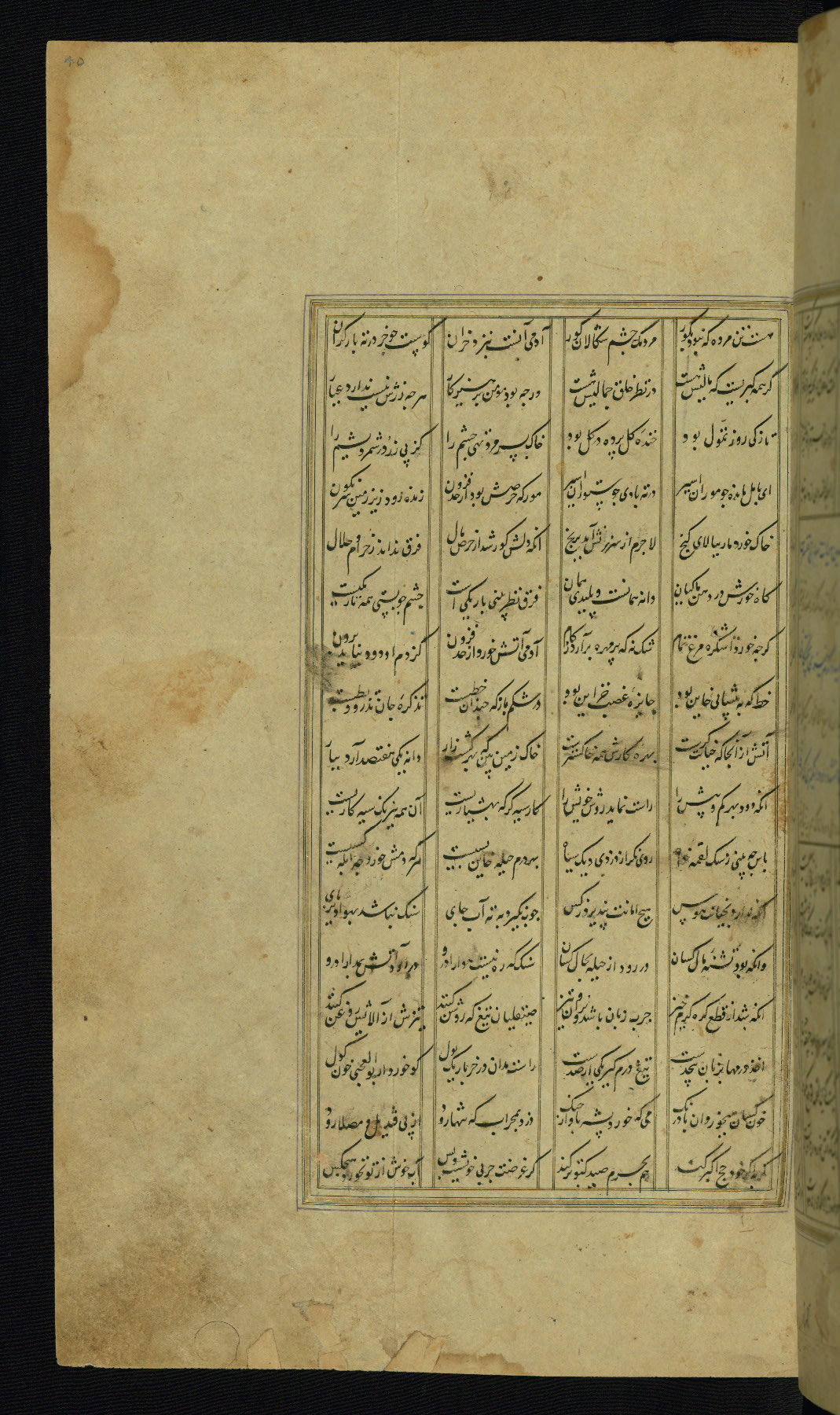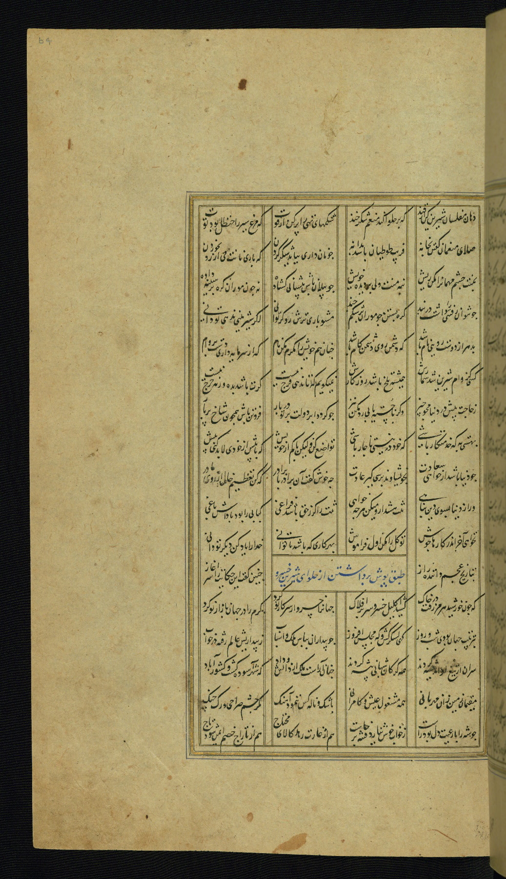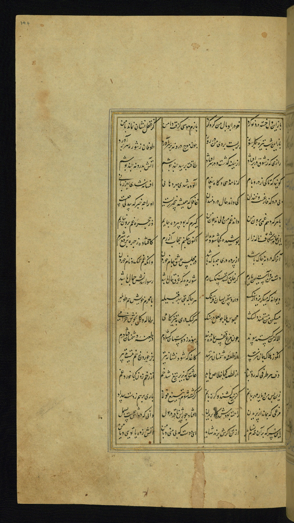 This is an illustrated and illuminated Safavid copy of the Khamsah (quintet) of Amīr Khusraw Dihlavī (d. 725 AH / 1325 CE), written by Pīr Ḥusayn al-Kātib al-Shīrāzī in 935 AH / 1529 CE. The codex opens with a double-page illuminated frontispiece with verses in honor of the poet Mir (Amir) Khusraw (fols. 1b-2a). There are four illuminated incipit pages introducing the individual poems, and thirteen paintings illustrate the text. The lacquer binding, which is not original to the manuscript, has a hunting scene on the upper and lower boards. The lower board is inscribed yā Shāh Najaf (oh, King of Najaf, i.e. ʿAlī) and is dated 1271 AH / 1854 CE.