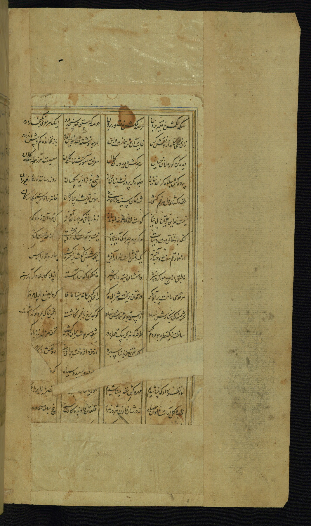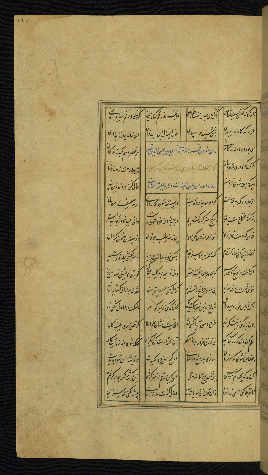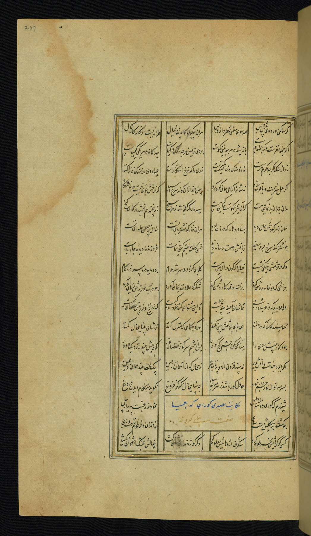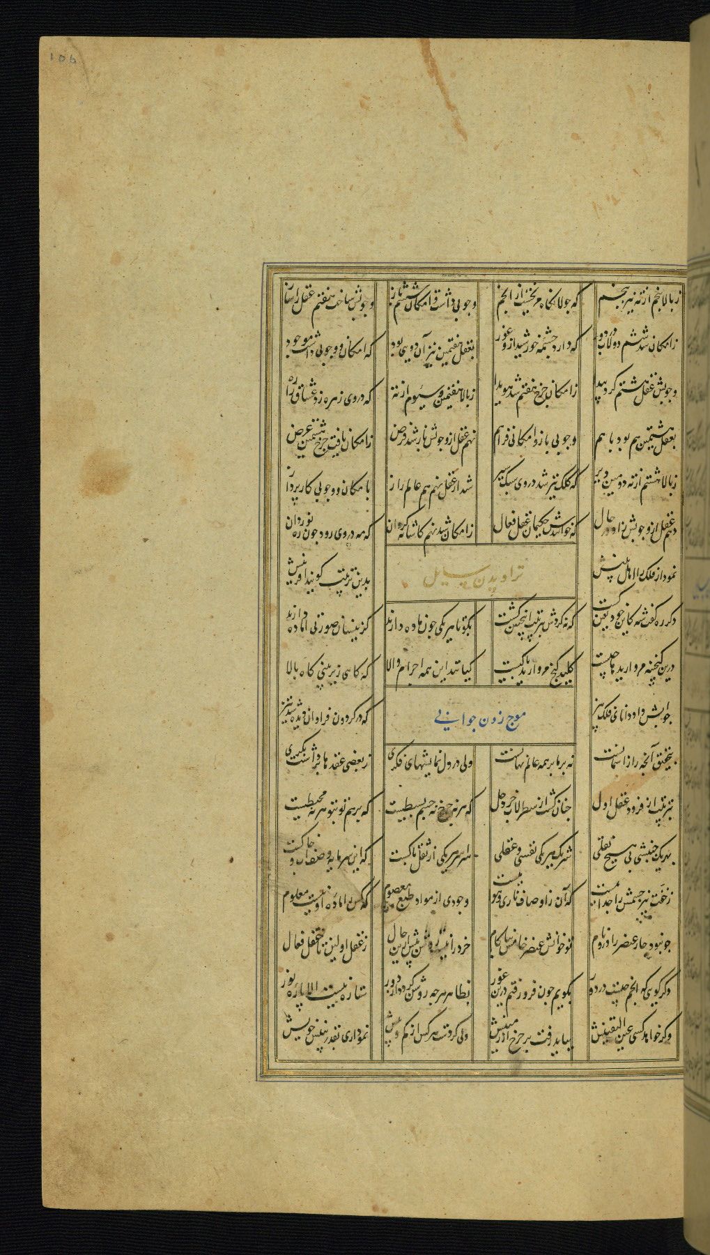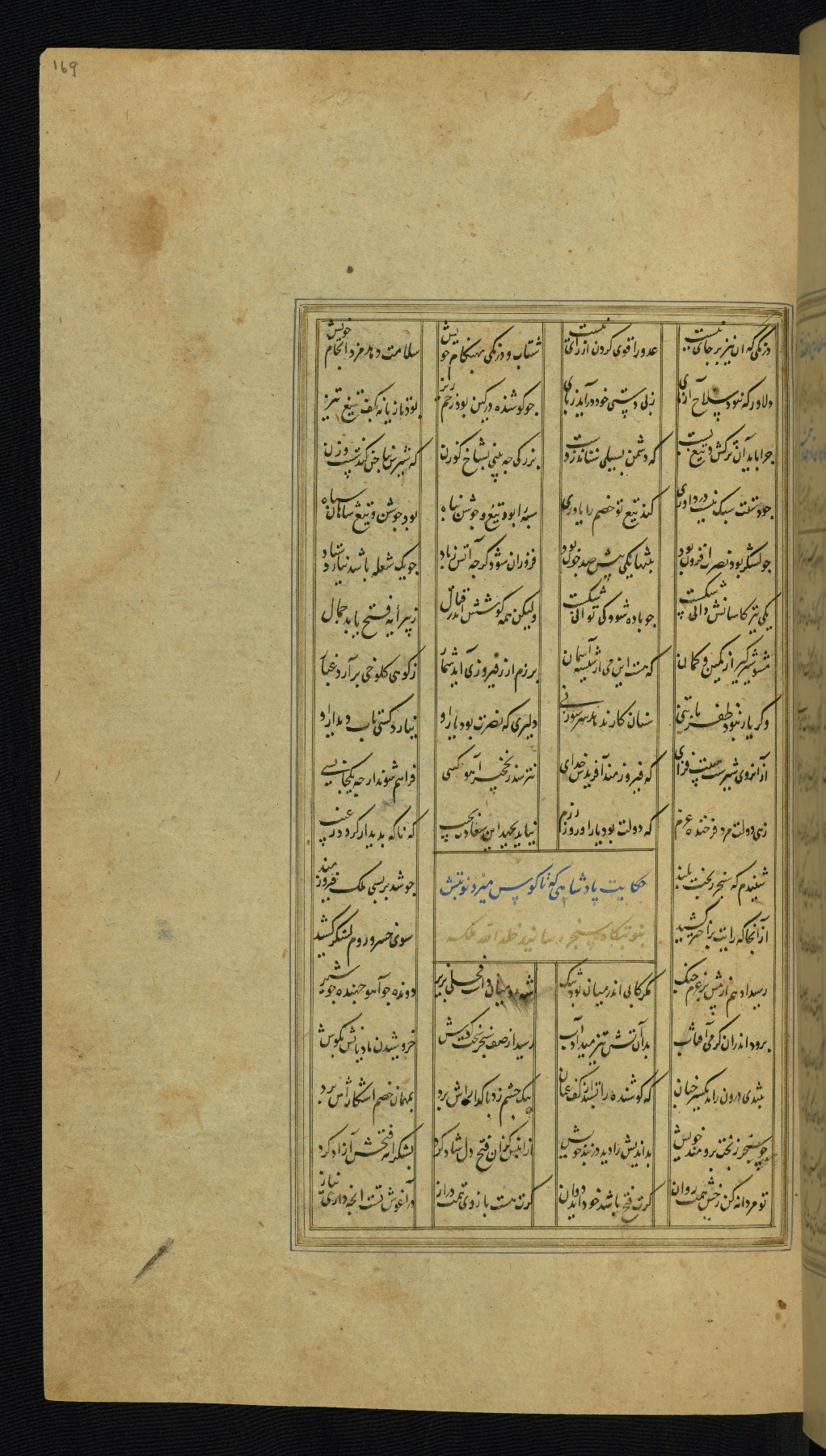 This is an illustrated and illuminated Safavid copy of the Khamsah (quintet) of Amīr Khusraw Dihlavī (d. 725 AH / 1325 CE), written by Pīr Ḥusayn al-Kātib al-Shīrāzī in 935 AH / 1529 CE. The codex opens with a double-page illuminated frontispiece with verses in honor of the poet Mir (Amir) Khusraw (fols. 1b-2a). There are four illuminated incipit pages introducing the individual poems, and thirteen paintings illustrate the text. The lacquer binding, which is not original to the manuscript, has a hunting scene on the upper and lower boards. The lower board is inscribed yā Shāh Najaf (oh, King of Najaf, i.e. ʿAlī) and is dated 1271 AH / 1854 CE.