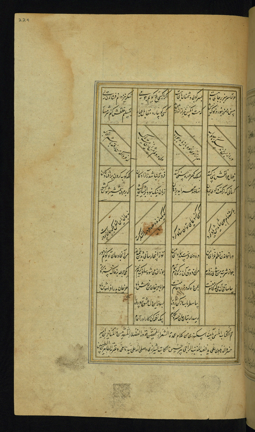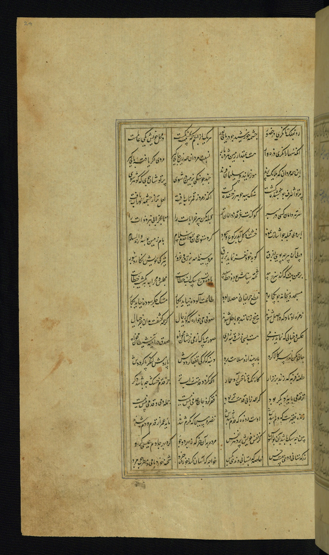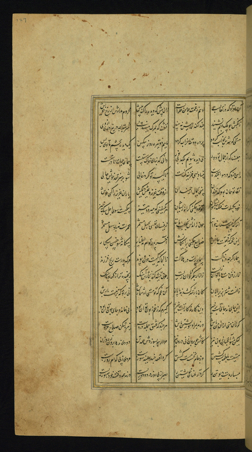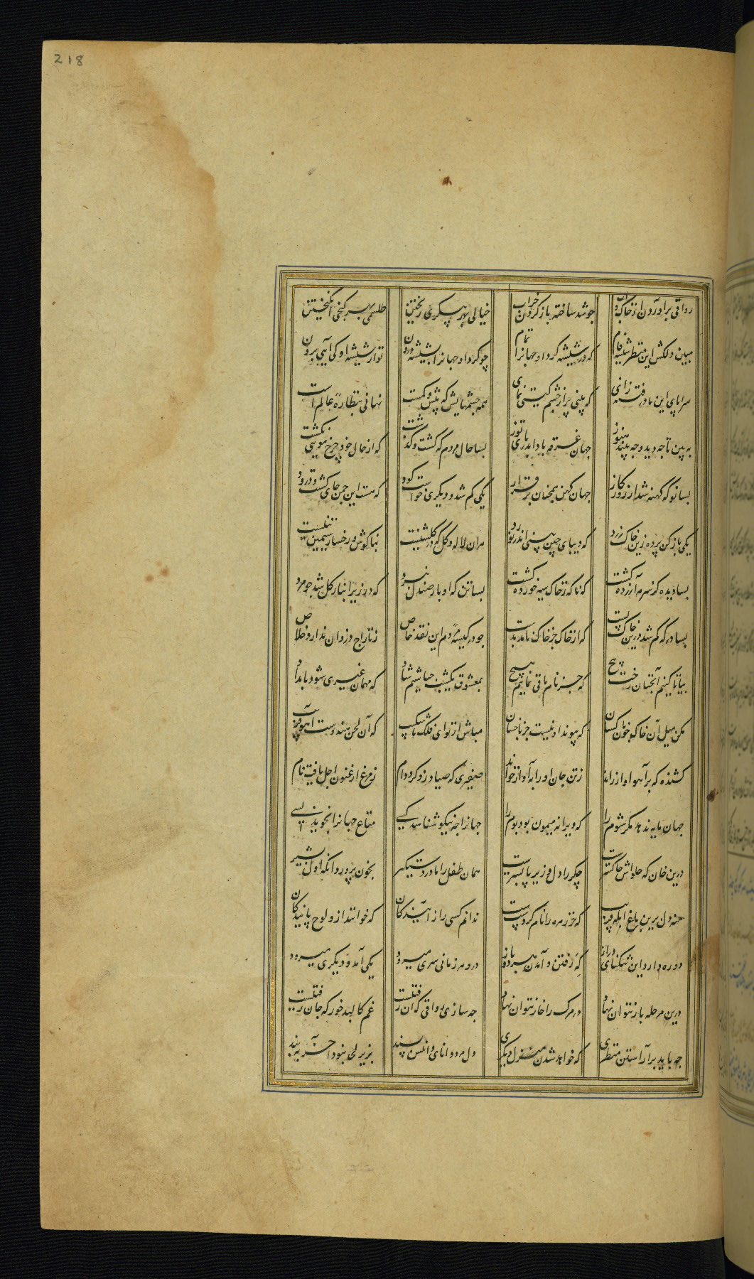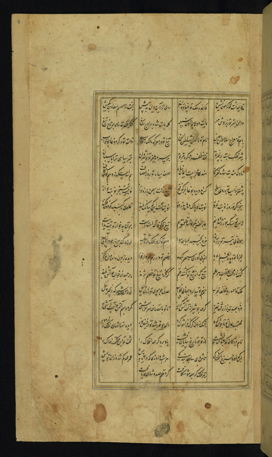 This is an illustrated and illuminated Safavid copy of the Khamsah (quintet) of Amīr Khusraw Dihlavī (d. 725 AH / 1325 CE), written by Pīr Ḥusayn al-Kātib al-Shīrāzī in 935 AH / 1529 CE. The codex opens with a double-page illuminated frontispiece with verses in honor of the poet Mir (Amir) Khusraw (fols. 1b-2a). There are four illuminated incipit pages introducing the individual poems, and thirteen paintings illustrate the text. The lacquer binding, which is not original to the manuscript, has a hunting scene on the upper and lower boards. The lower board is inscribed yā Shāh Najaf (oh, King of Najaf, i.e. ʿAlī) and is dated 1271 AH / 1854 CE.