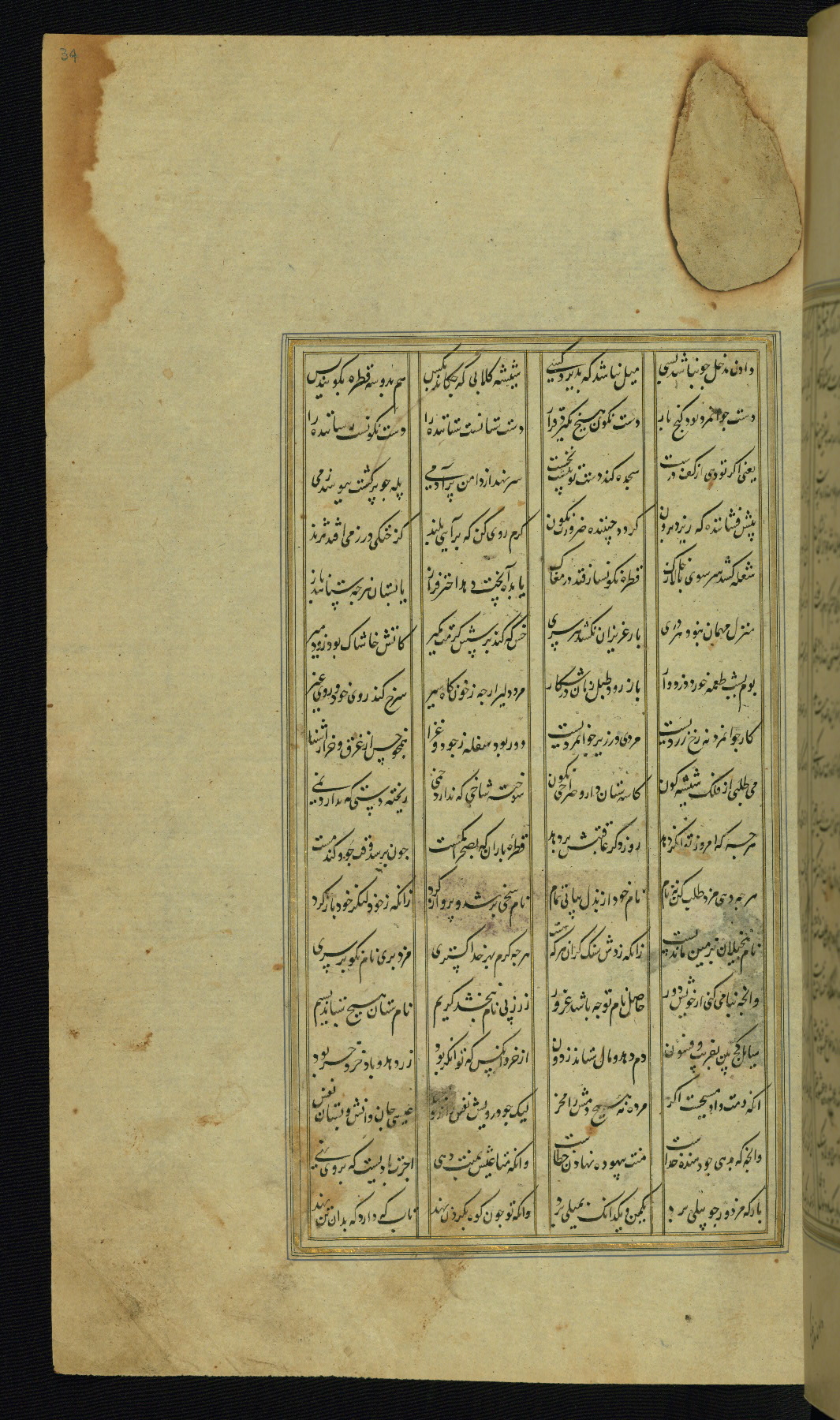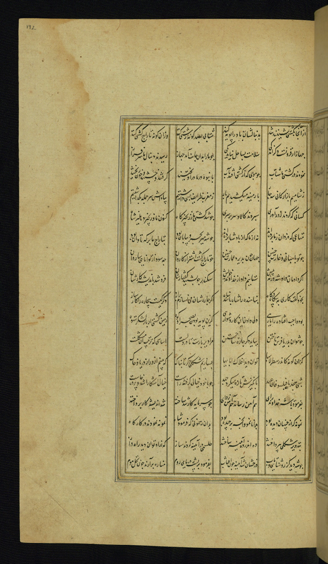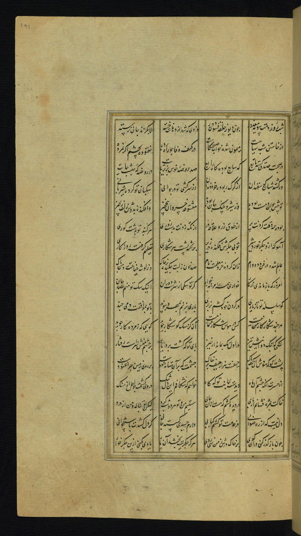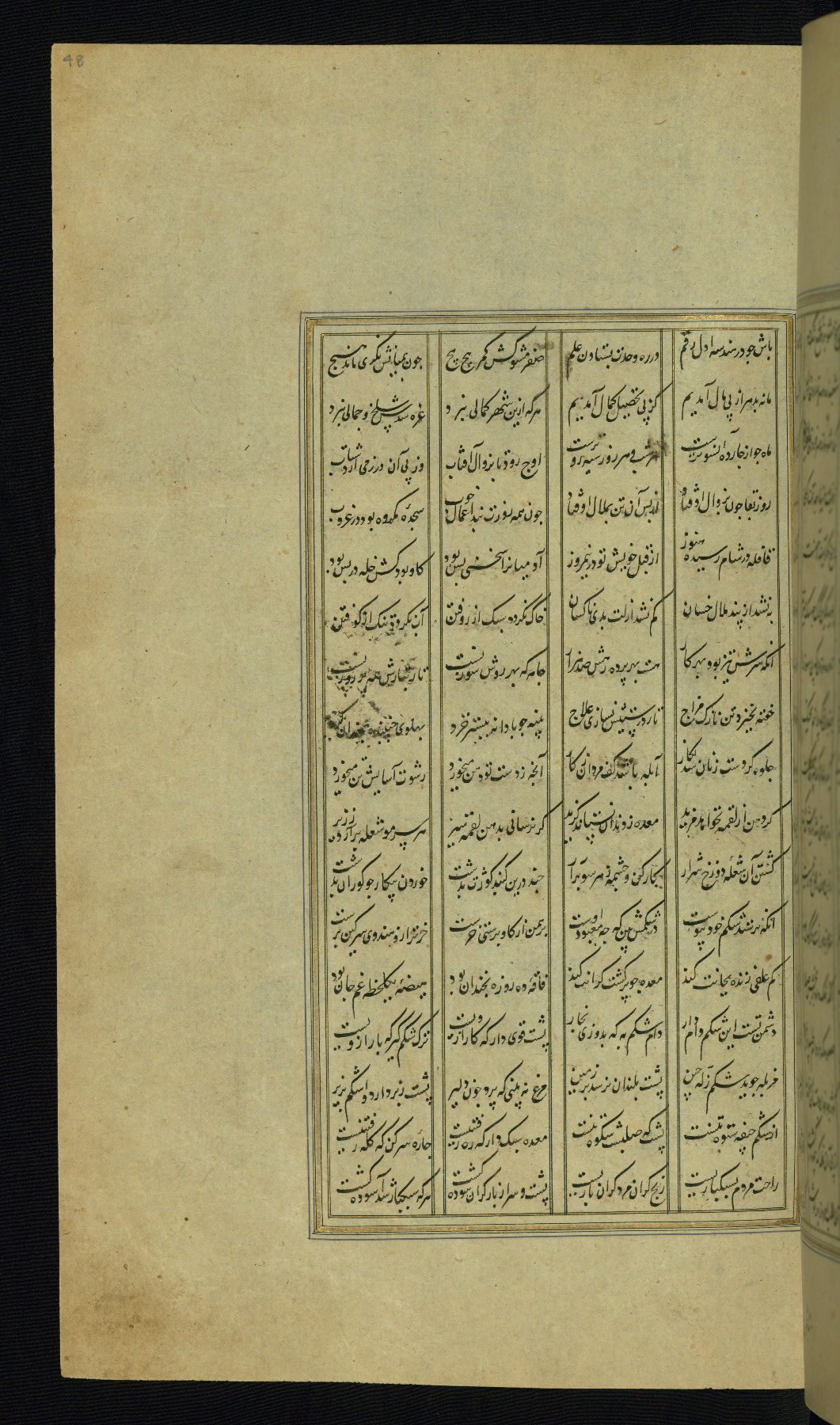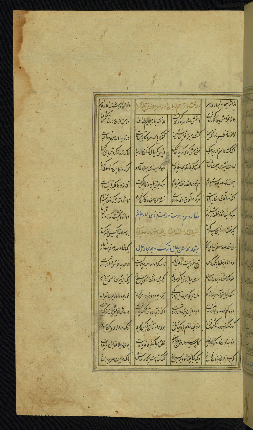 This is an illustrated and illuminated Safavid copy of the Khamsah (quintet) of Amīr Khusraw Dihlavī (d. 725 AH / 1325 CE), written by Pīr Ḥusayn al-Kātib al-Shīrāzī in 935 AH / 1529 CE. The codex opens with a double-page illuminated frontispiece with verses in honor of the poet Mir (Amir) Khusraw (fols. 1b-2a). There are four illuminated incipit pages introducing the individual poems, and thirteen paintings illustrate the text. The lacquer binding, which is not original to the manuscript, has a hunting scene on the upper and lower boards. The lower board is inscribed yā Shāh Najaf (oh, King of Najaf, i.e. ʿAlī) and is dated 1271 AH / 1854 CE.