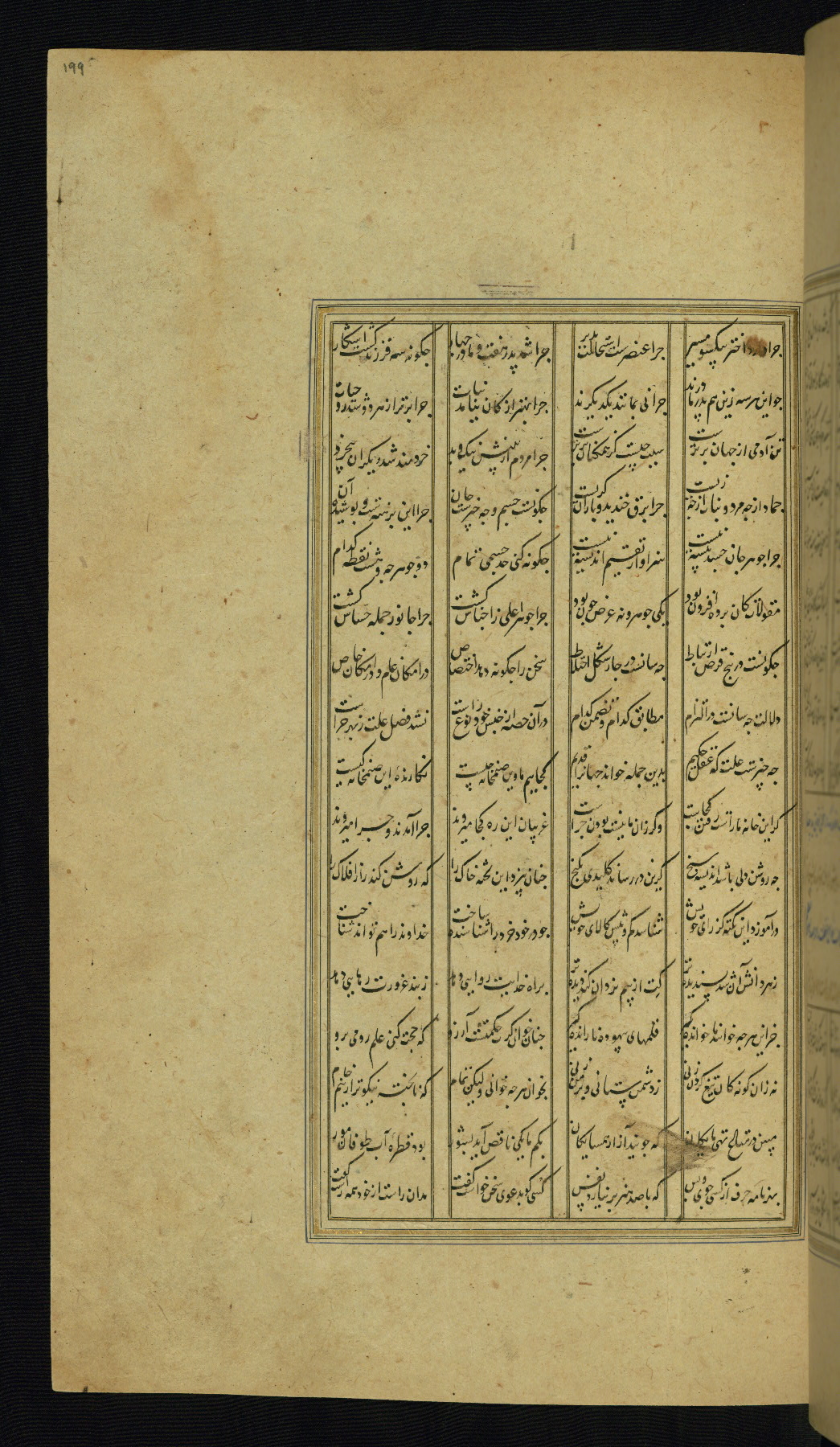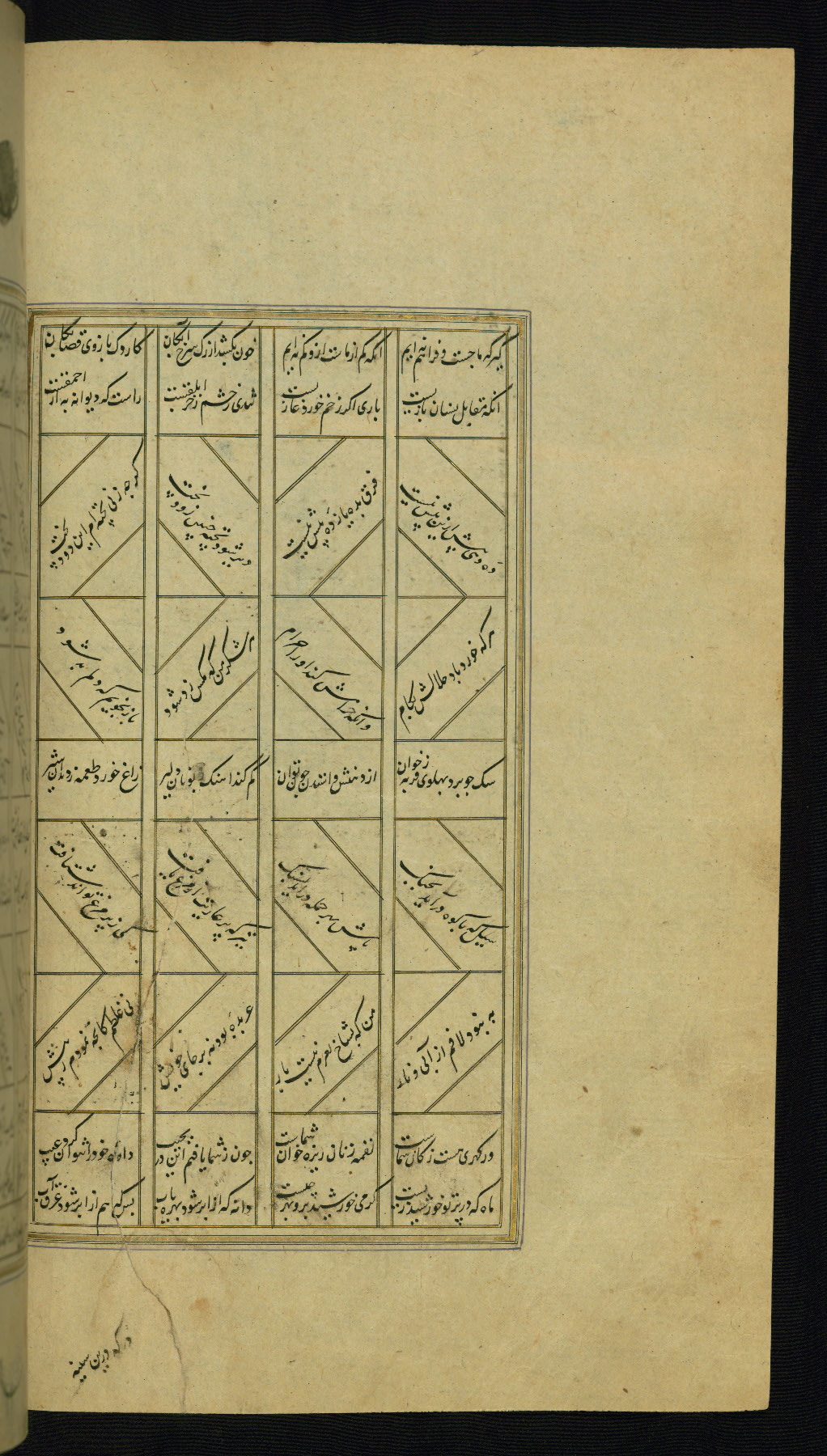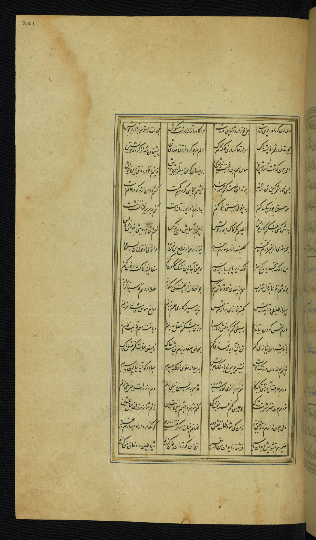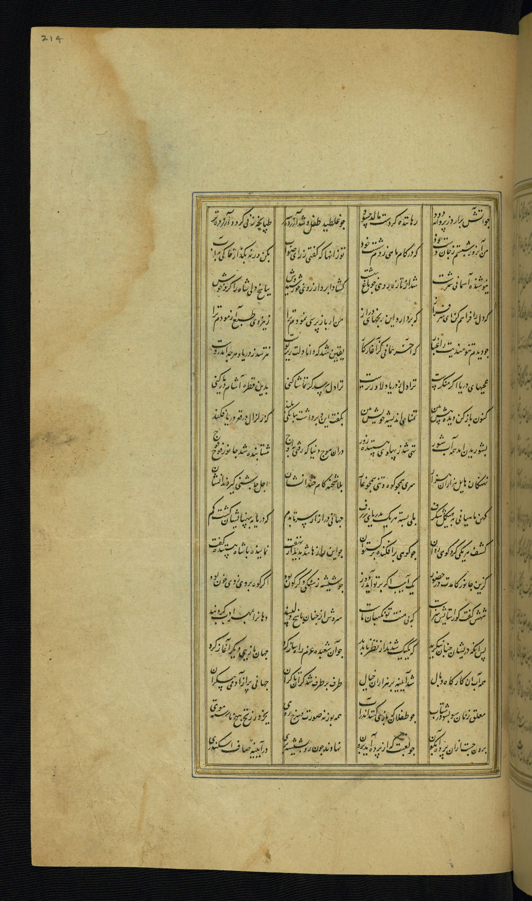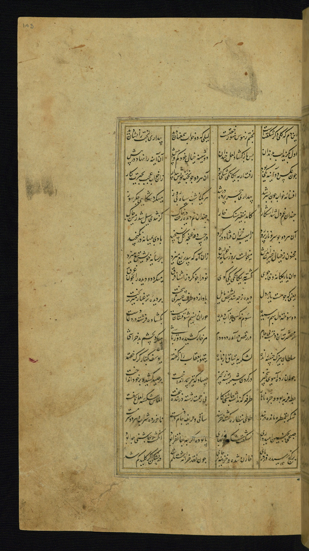 This is an illustrated and illuminated Safavid copy of the Khamsah (quintet) of Amīr Khusraw Dihlavī (d. 725 AH / 1325 CE), written by Pīr Ḥusayn al-Kātib al-Shīrāzī in 935 AH / 1529 CE. The codex opens with a double-page illuminated frontispiece with verses in honor of the poet Mir (Amir) Khusraw (fols. 1b-2a). There are four illuminated incipit pages introducing the individual poems, and thirteen paintings illustrate the text. The lacquer binding, which is not original to the manuscript, has a hunting scene on the upper and lower boards. The lower board is inscribed yā Shāh Najaf (oh, King of Najaf, i.e. ʿAlī) and is dated 1271 AH / 1854 CE.