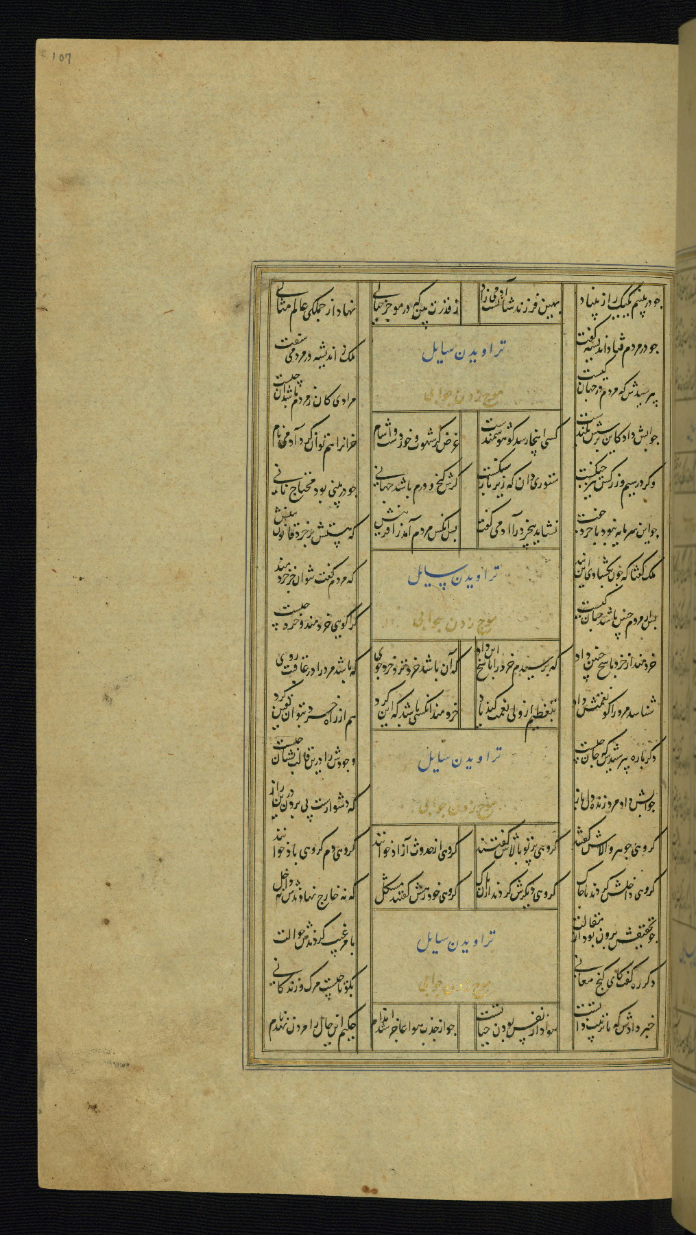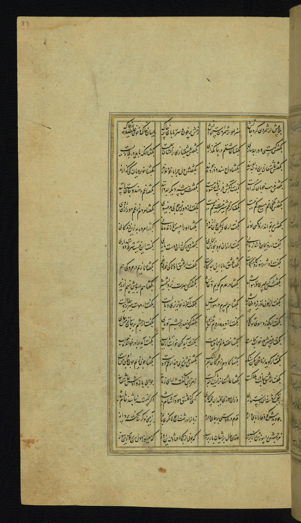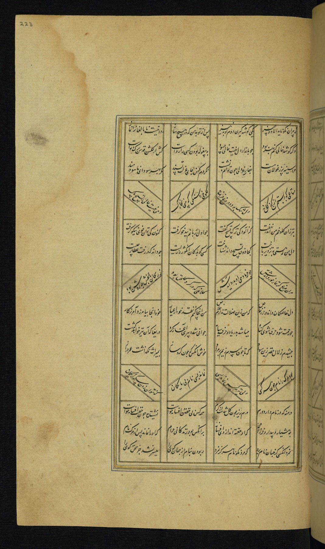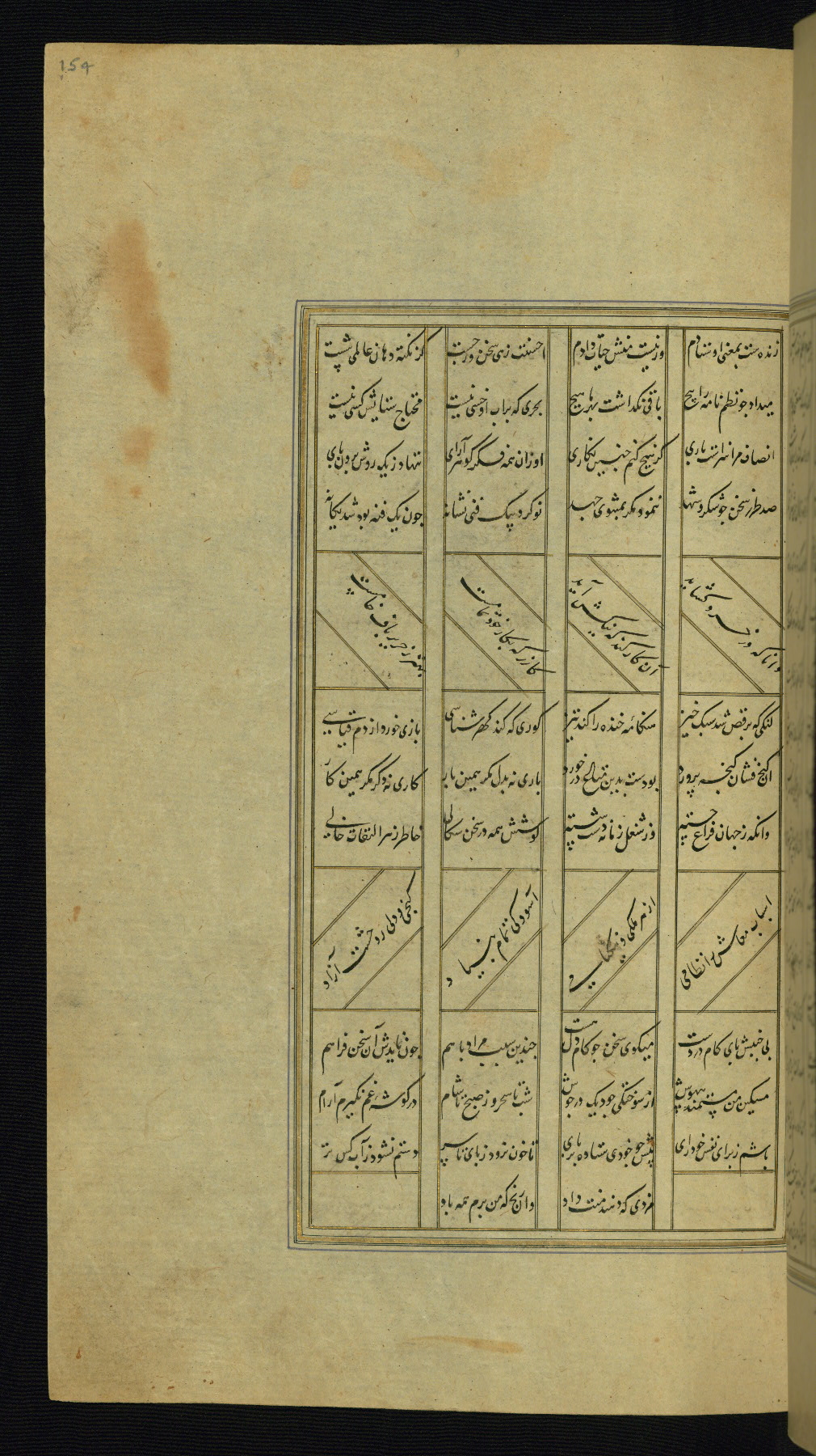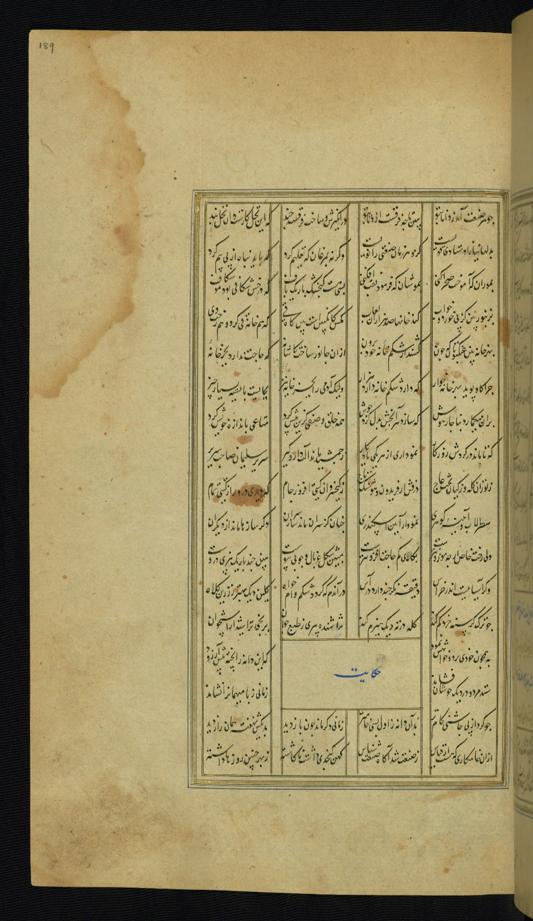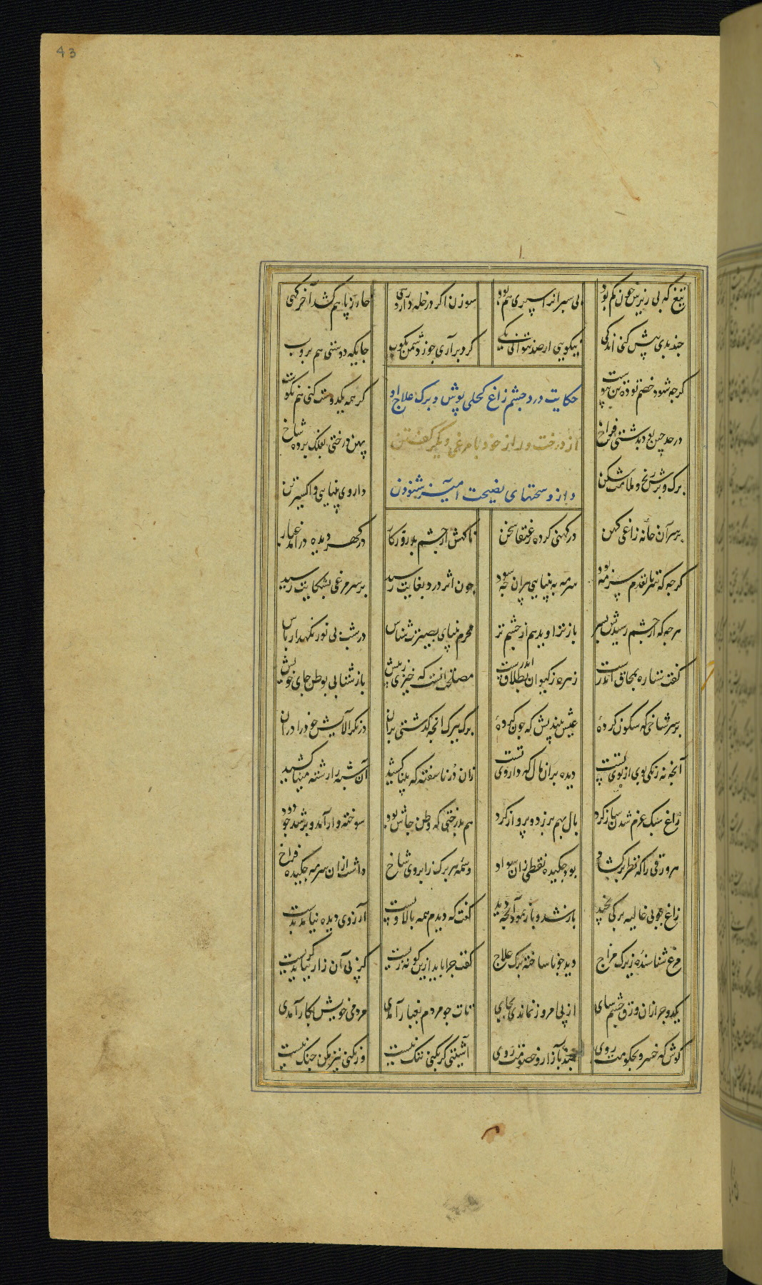 This is an illustrated and illuminated Safavid copy of the Khamsah (quintet) of Amīr Khusraw Dihlavī (d. 725 AH / 1325 CE), written by Pīr Ḥusayn al-Kātib al-Shīrāzī in 935 AH / 1529 CE. The codex opens with a double-page illuminated frontispiece with verses in honor of the poet Mir (Amir) Khusraw (fols. 1b-2a). There are four illuminated incipit pages introducing the individual poems, and thirteen paintings illustrate the text. The lacquer binding, which is not original to the manuscript, has a hunting scene on the upper and lower boards. The lower board is inscribed yā Shāh Najaf (oh, King of Najaf, i.e. ʿAlī) and is dated 1271 AH / 1854 CE.
