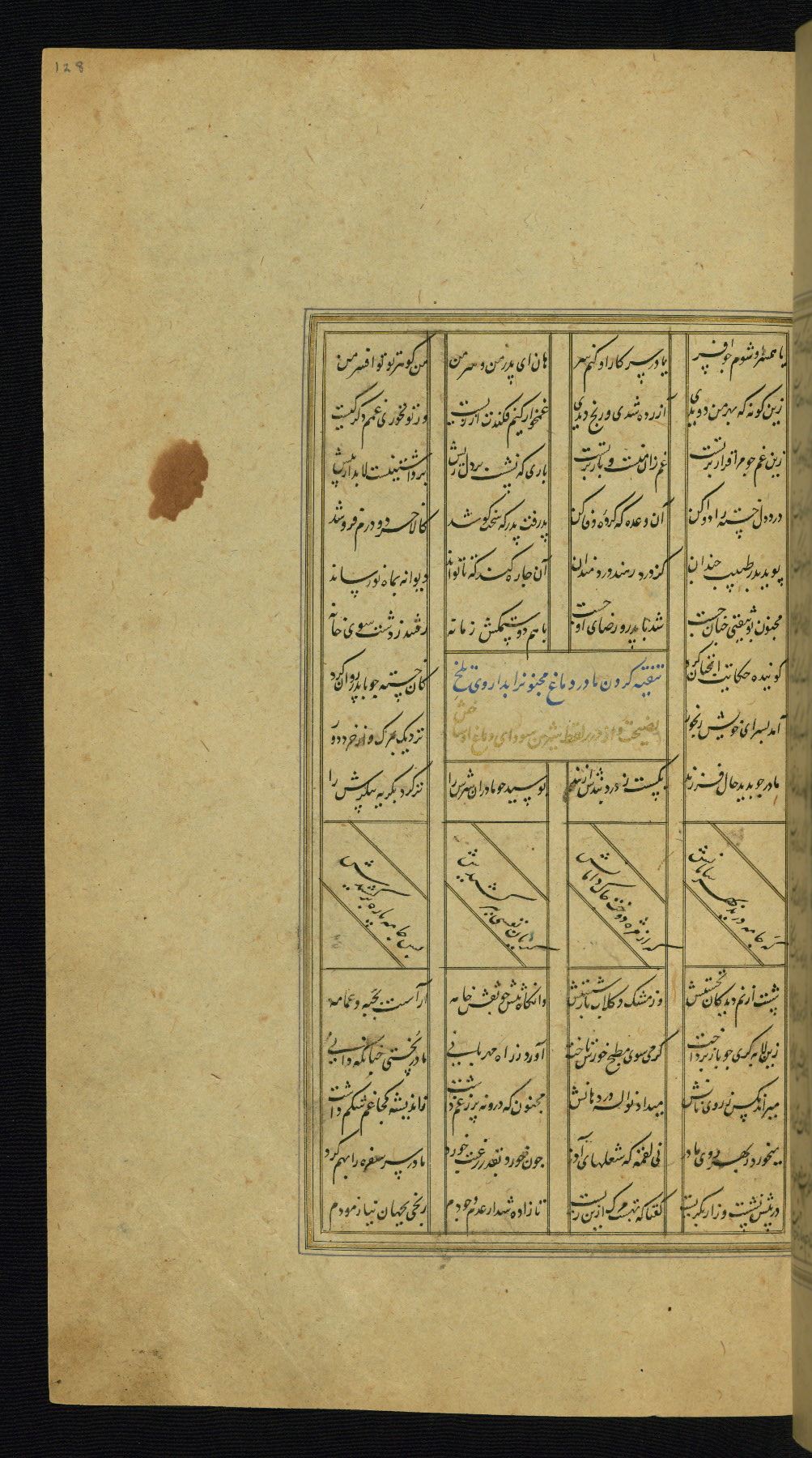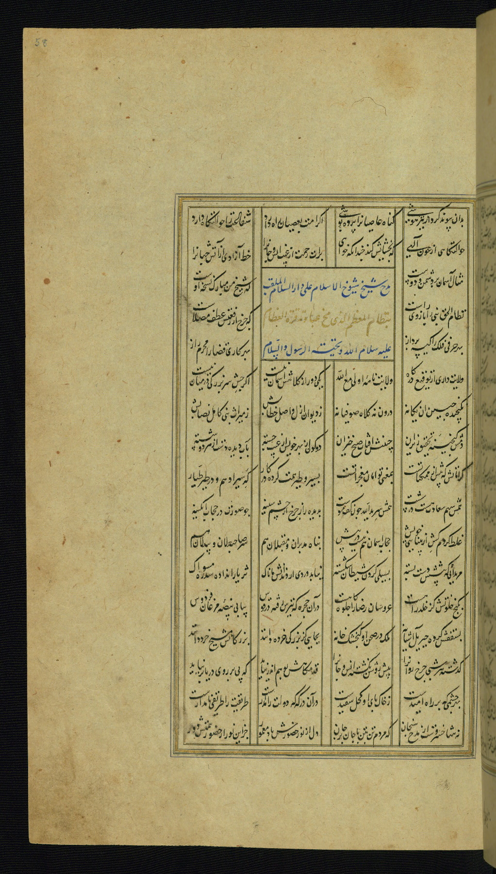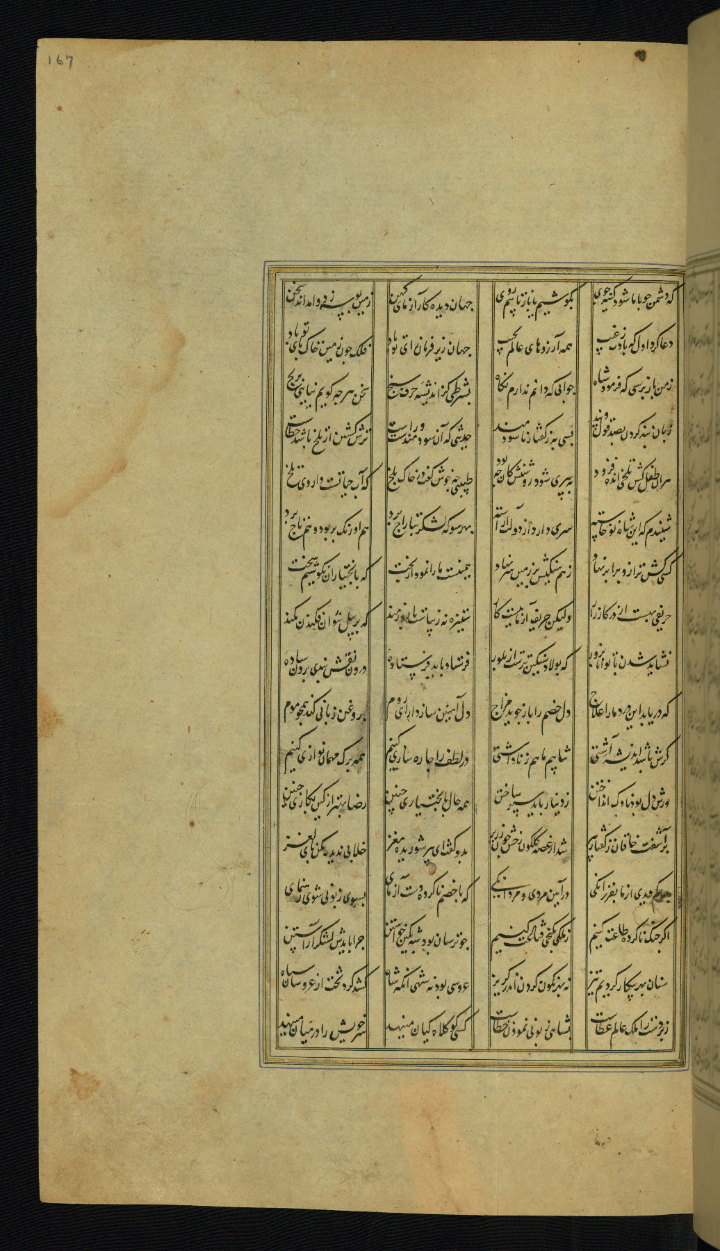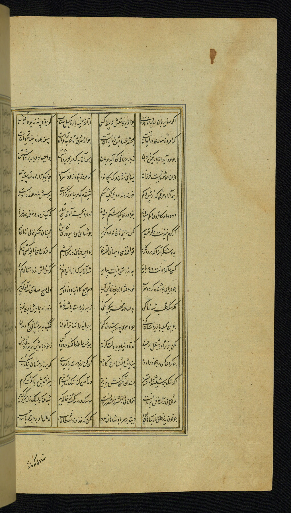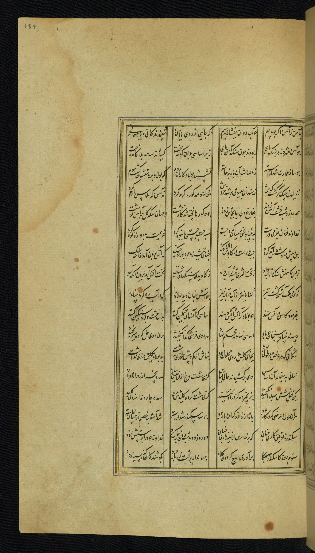 This is an illustrated and illuminated Safavid copy of the Khamsah (quintet) of Amīr Khusraw Dihlavī (d. 725 AH / 1325 CE), written by Pīr Ḥusayn al-Kātib al-Shīrāzī in 935 AH / 1529 CE. The codex opens with a double-page illuminated frontispiece with verses in honor of the poet Mir (Amir) Khusraw (fols. 1b-2a). There are four illuminated incipit pages introducing the individual poems, and thirteen paintings illustrate the text. The lacquer binding, which is not original to the manuscript, has a hunting scene on the upper and lower boards. The lower board is inscribed yā Shāh Najaf (oh, King of Najaf, i.e. ʿAlī) and is dated 1271 AH / 1854 CE.