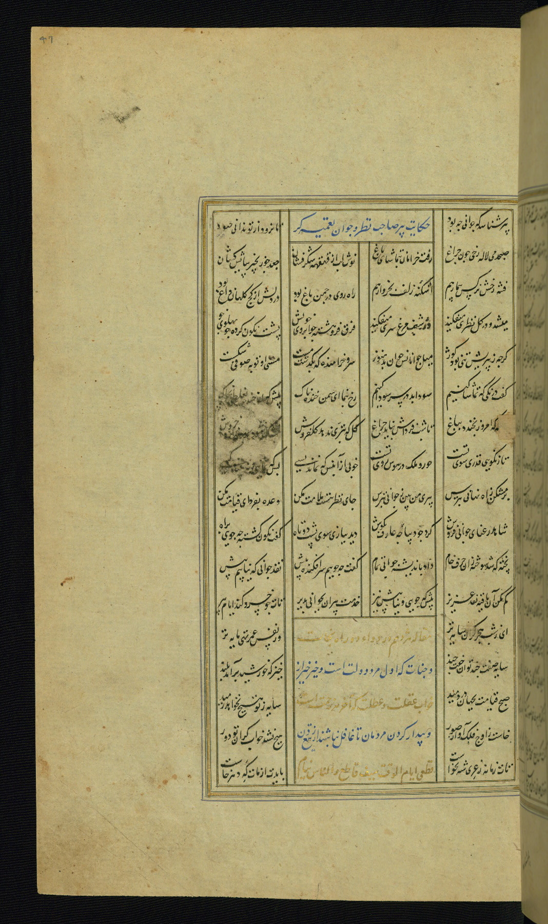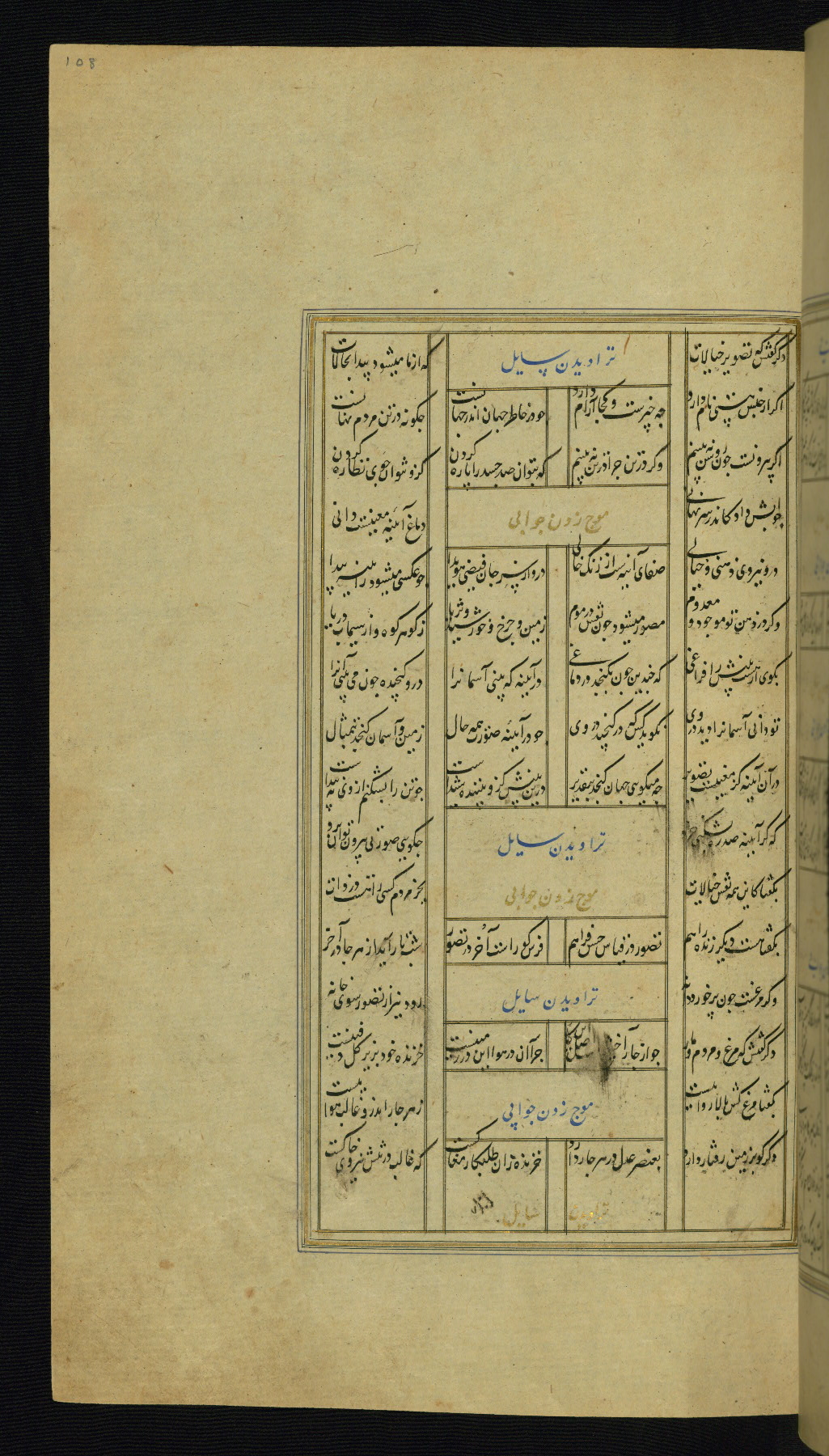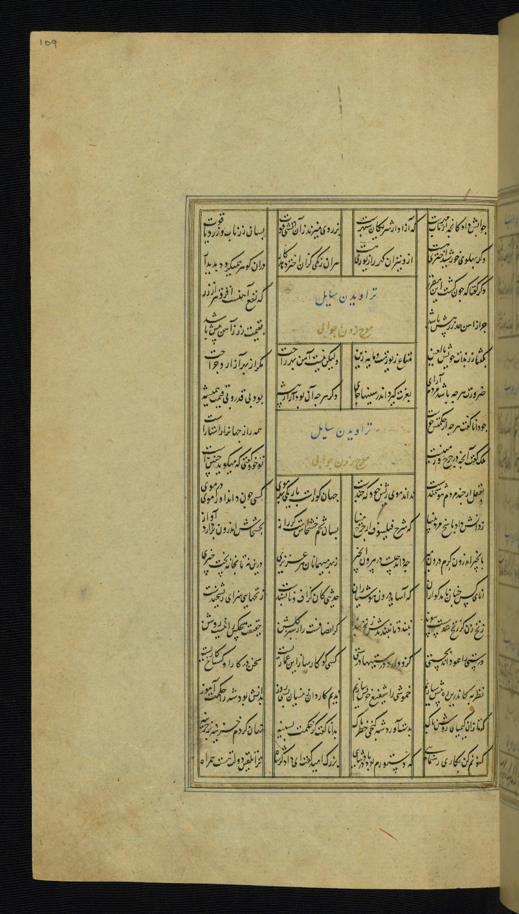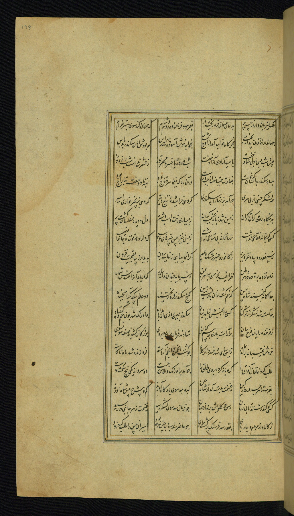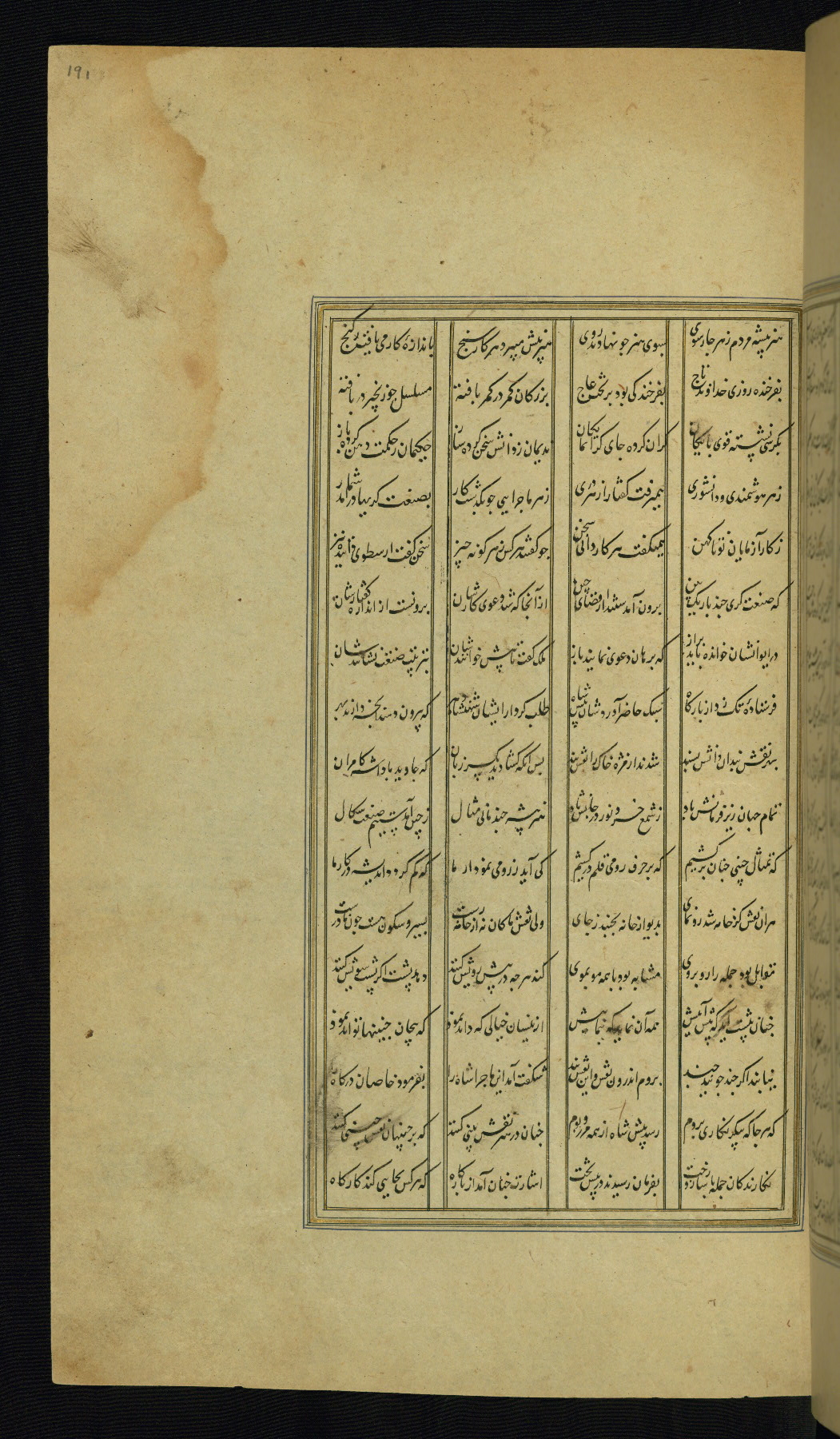 This is an illustrated and illuminated Safavid copy of the Khamsah (quintet) of Amīr Khusraw Dihlavī (d. 725 AH / 1325 CE), written by Pīr Ḥusayn al-Kātib al-Shīrāzī in 935 AH / 1529 CE. The codex opens with a double-page illuminated frontispiece with verses in honor of the poet Mir (Amir) Khusraw (fols. 1b-2a). There are four illuminated incipit pages introducing the individual poems, and thirteen paintings illustrate the text. The lacquer binding, which is not original to the manuscript, has a hunting scene on the upper and lower boards. The lower board is inscribed yā Shāh Najaf (oh, King of Najaf, i.e. ʿAlī) and is dated 1271 AH / 1854 CE.