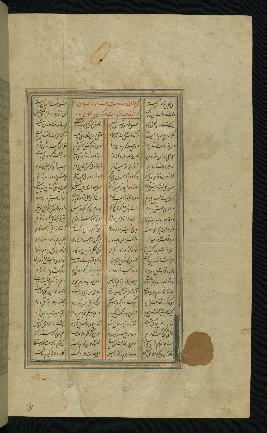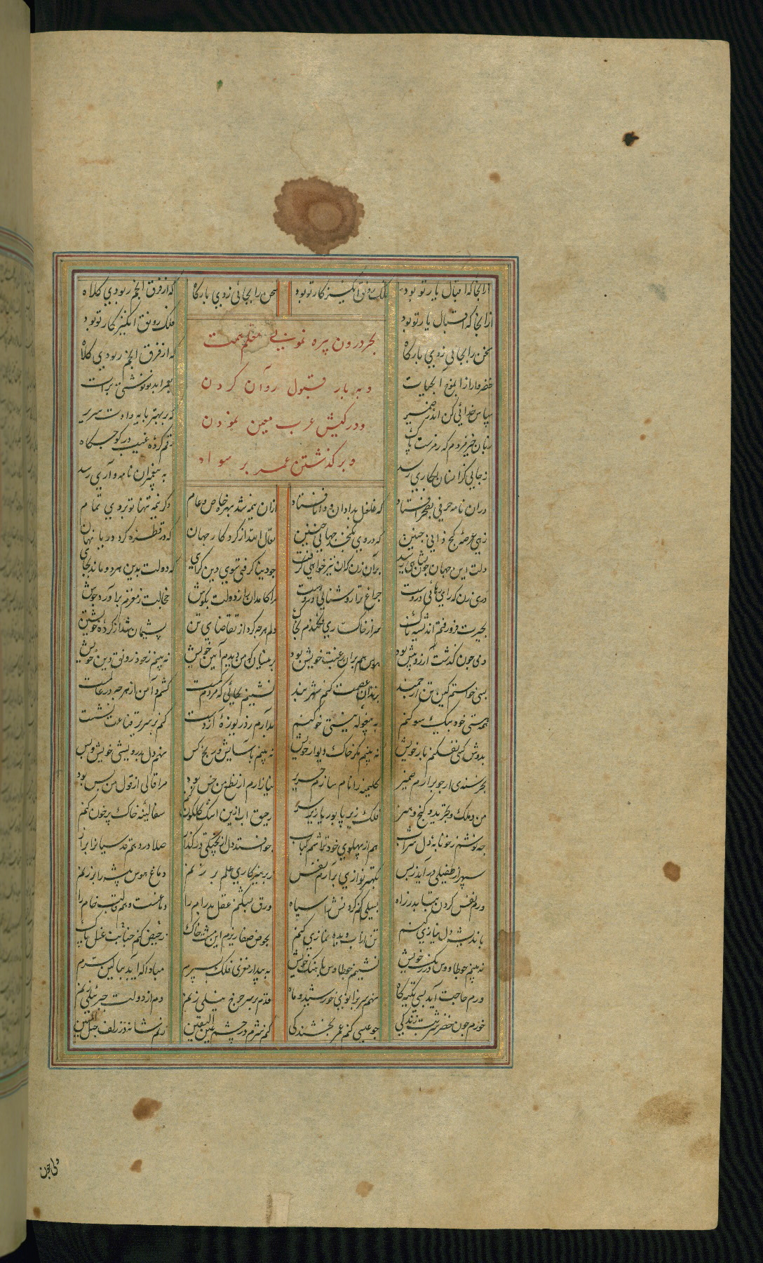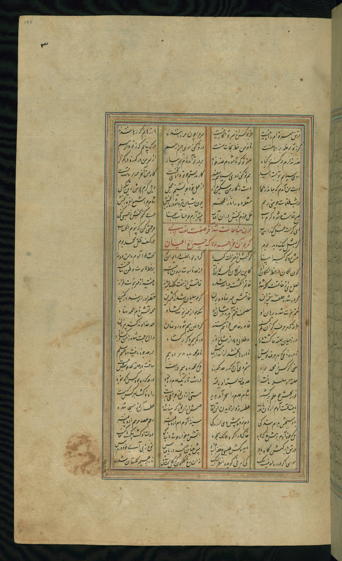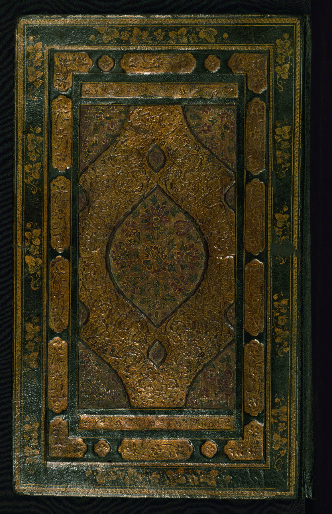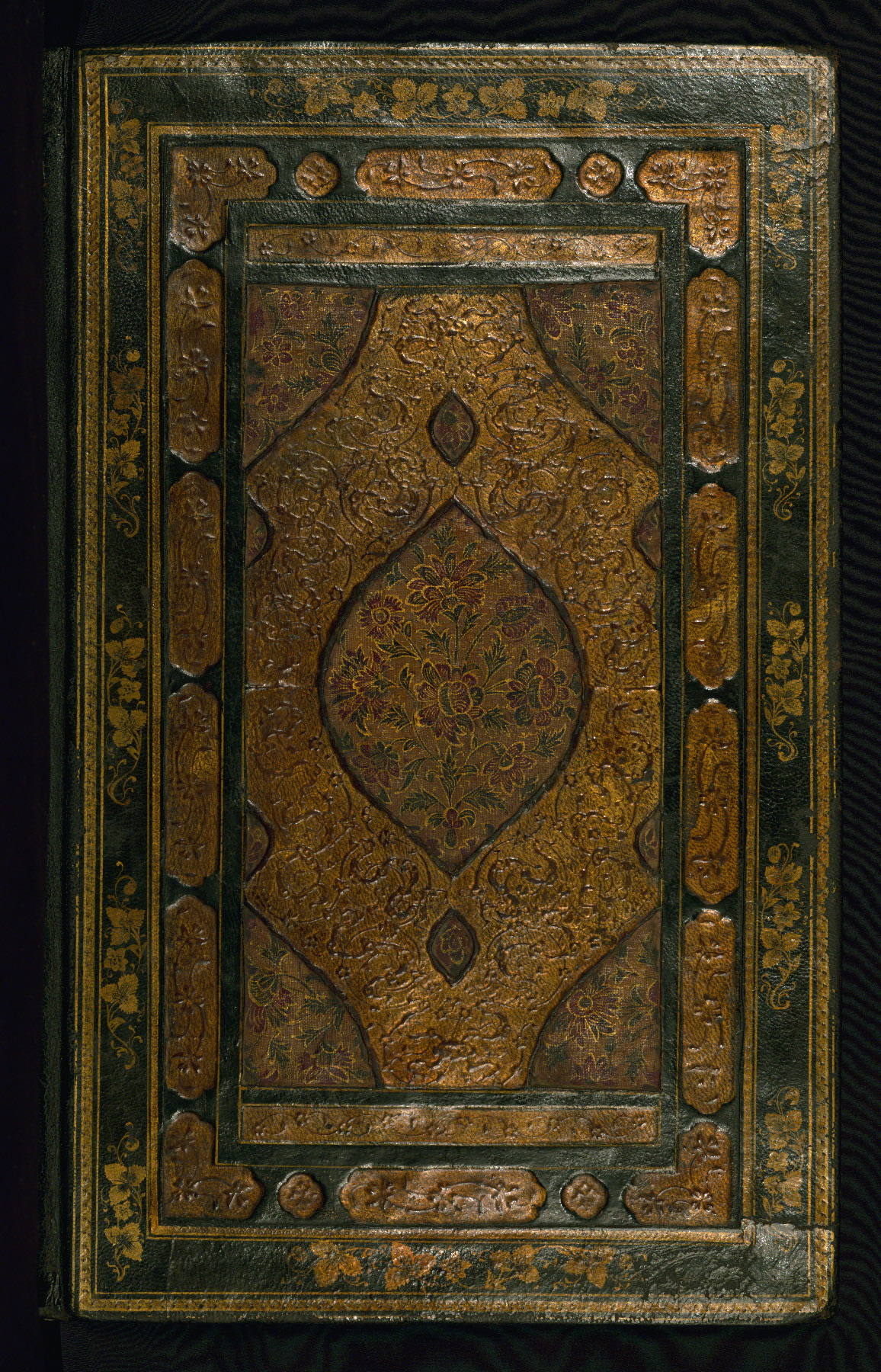 This illuminated and illustrated manuscript contains the Khamsah (quintet) and two historical poems (masnavi), Qirān-i saʿdayn and Nuh sipihr, by Amīr Khusraw Dihlavī (d. 725 AH / 1325 CE). The codex is dated 1017 AH / 1609 CE and was produced in Safavid Iran. All texts are written in black nastaʿlīq script with chapter headings in red. The manuscript opens with an illuminated and illustrated frontispiece of a hunting and court scene in the early Safavid style (fols. 1b-2a). The first text is Khamsah-i Dihlavī (fols. 2b-192a), which is introduced by an illuminated incipit and titlepiece with the title of the first poem of the quintet and the author's name. The second text is Qirān-i saʿdayn, a historical poem (masnavi) about the meeting of Sultan Muʿizz al-Dīn Kayqubād and his father, Nāṣir al-Din Bughrā Khān, on the banks of the Sarjū in Oudh. It is also introduced with an illuminated incipit and titlepiece (fol. 193b). The third text is Nuh sipihr, a historical poem (masnavi) describing the glories of Sultan Quṭb al-Dīn Mubārak Shāh Khaljī’s time, introduced with an illuminated incipit and headpiece (fol. 223b). The dark brown leather binding is original to the manuscript.