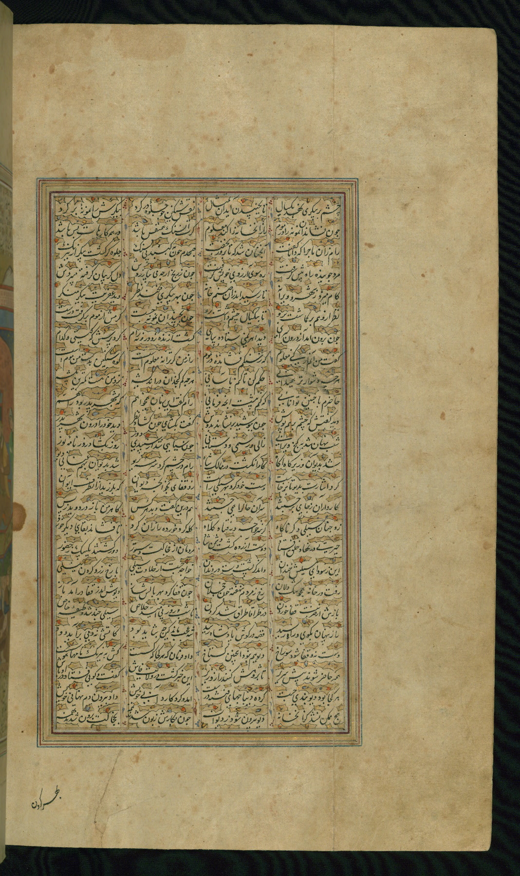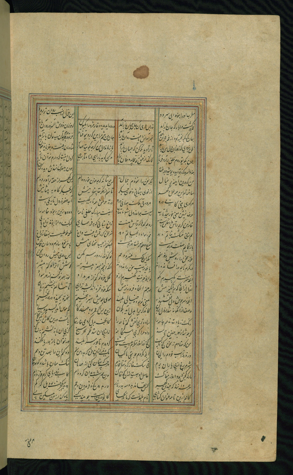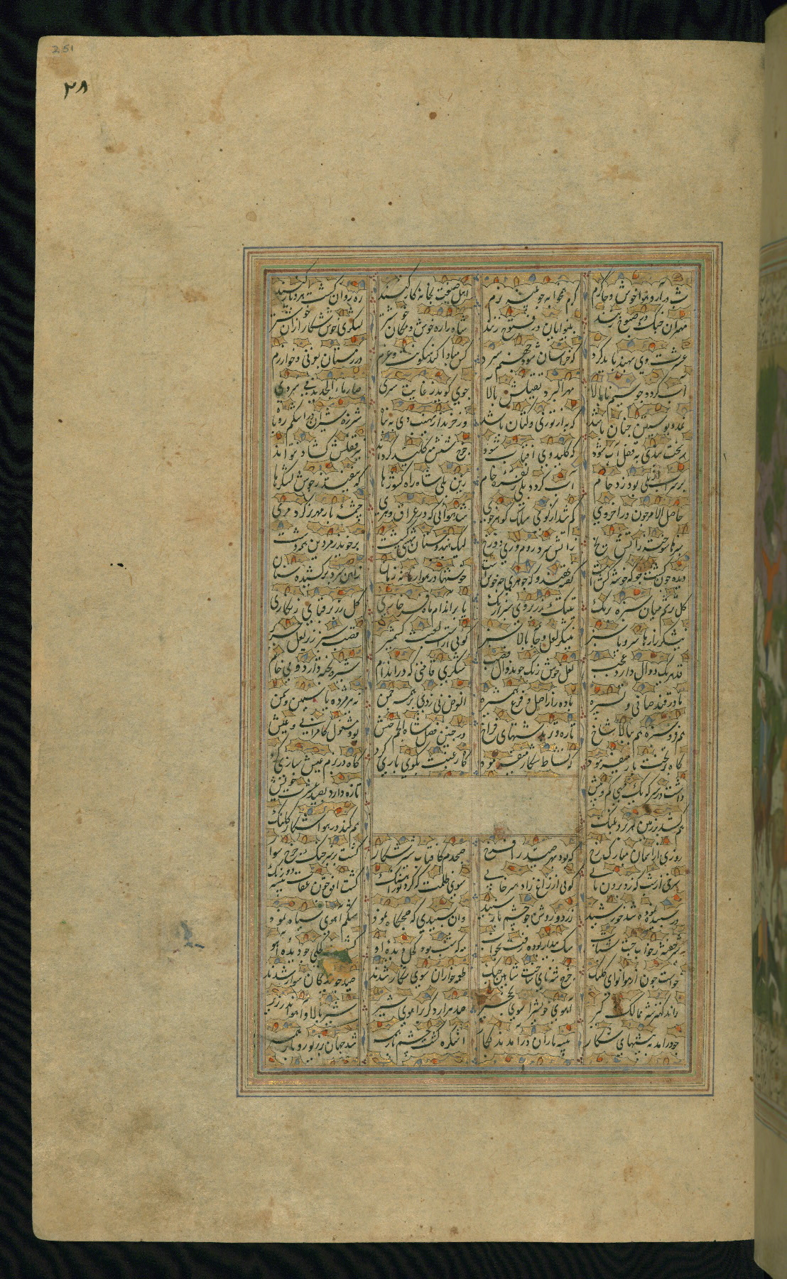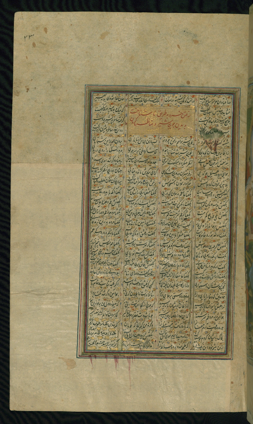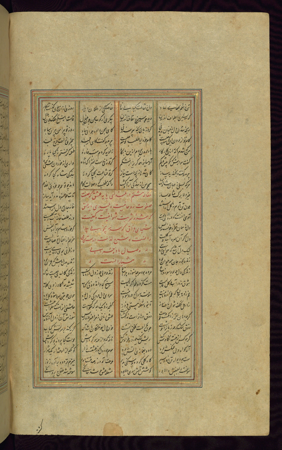 This illuminated and illustrated manuscript contains the Khamsah (quintet) and two historical poems (masnavi), Qirān-i saʿdayn and Nuh sipihr, by Amīr Khusraw Dihlavī (d. 725 AH / 1325 CE). The codex is dated 1017 AH / 1609 CE and was produced in Safavid Iran. All texts are written in black nastaʿlīq script with chapter headings in red. The manuscript opens with an illuminated and illustrated frontispiece of a hunting and court scene in the early Safavid style (fols. 1b-2a). The first text is Khamsah-i Dihlavī (fols. 2b-192a), which is introduced by an illuminated incipit and titlepiece with the title of the first poem of the quintet and the author's name. The second text is Qirān-i saʿdayn, a historical poem (masnavi) about the meeting of Sultan Muʿizz al-Dīn Kayqubād and his father, Nāṣir al-Din Bughrā Khān, on the banks of the Sarjū in Oudh. It is also introduced with an illuminated incipit and titlepiece (fol. 193b). The third text is Nuh sipihr, a historical poem (masnavi) describing the glories of Sultan Quṭb al-Dīn Mubārak Shāh Khaljī’s time, introduced with an illuminated incipit and headpiece (fol. 223b). The dark brown leather binding is original to the manuscript.