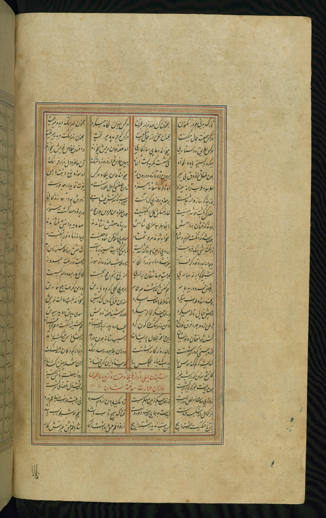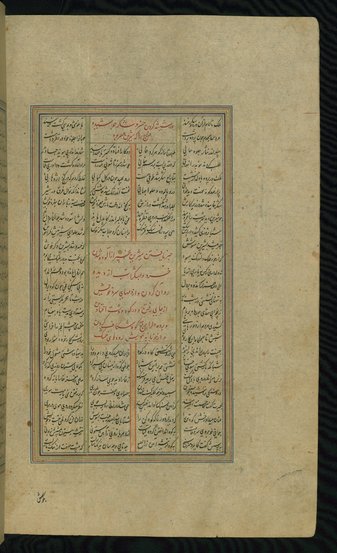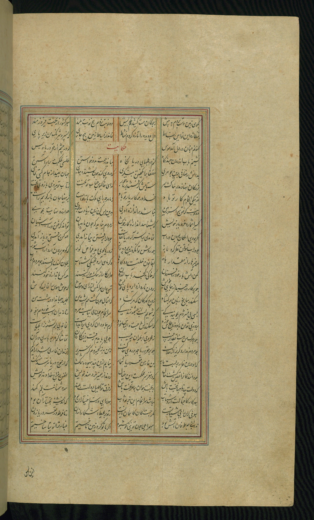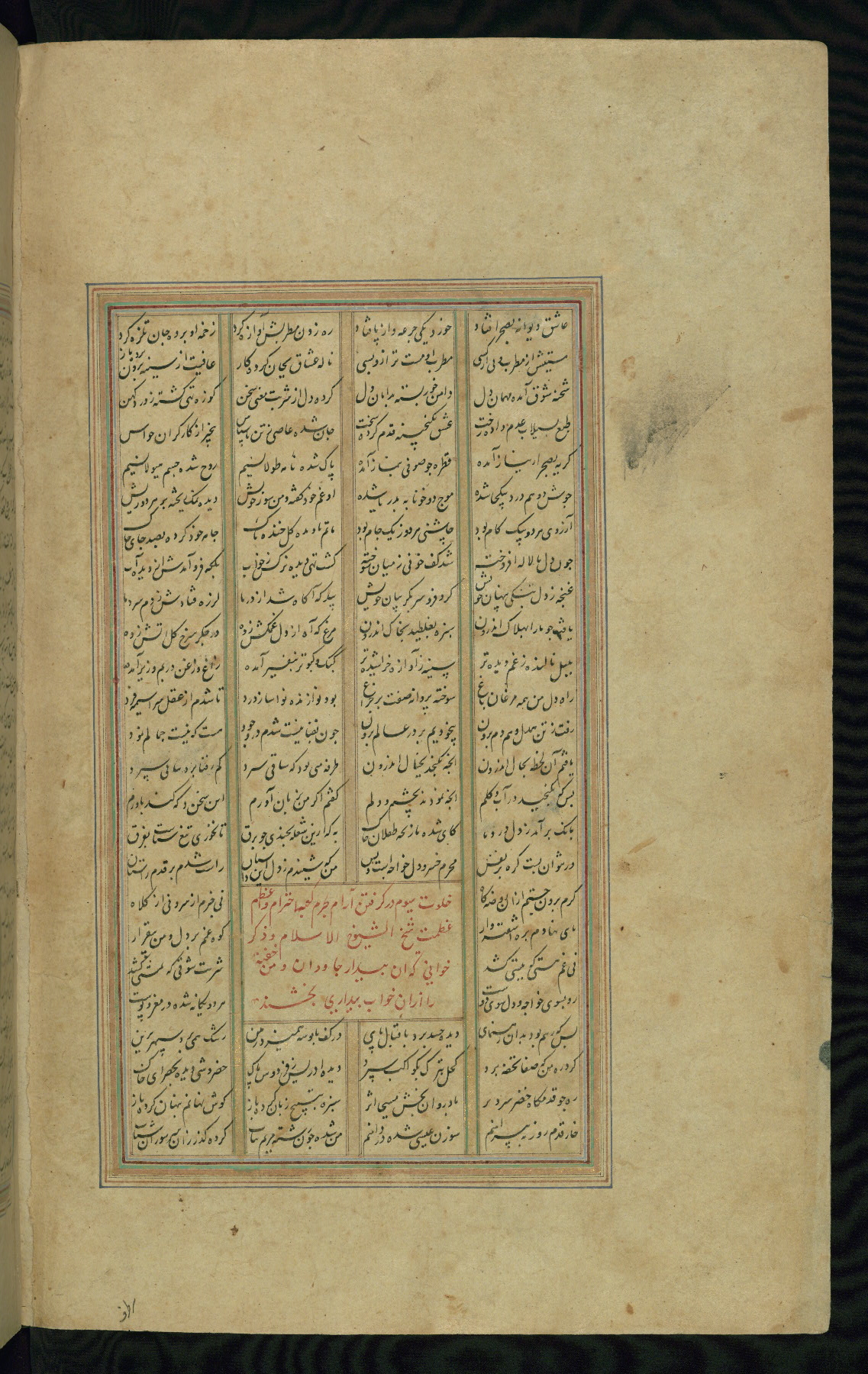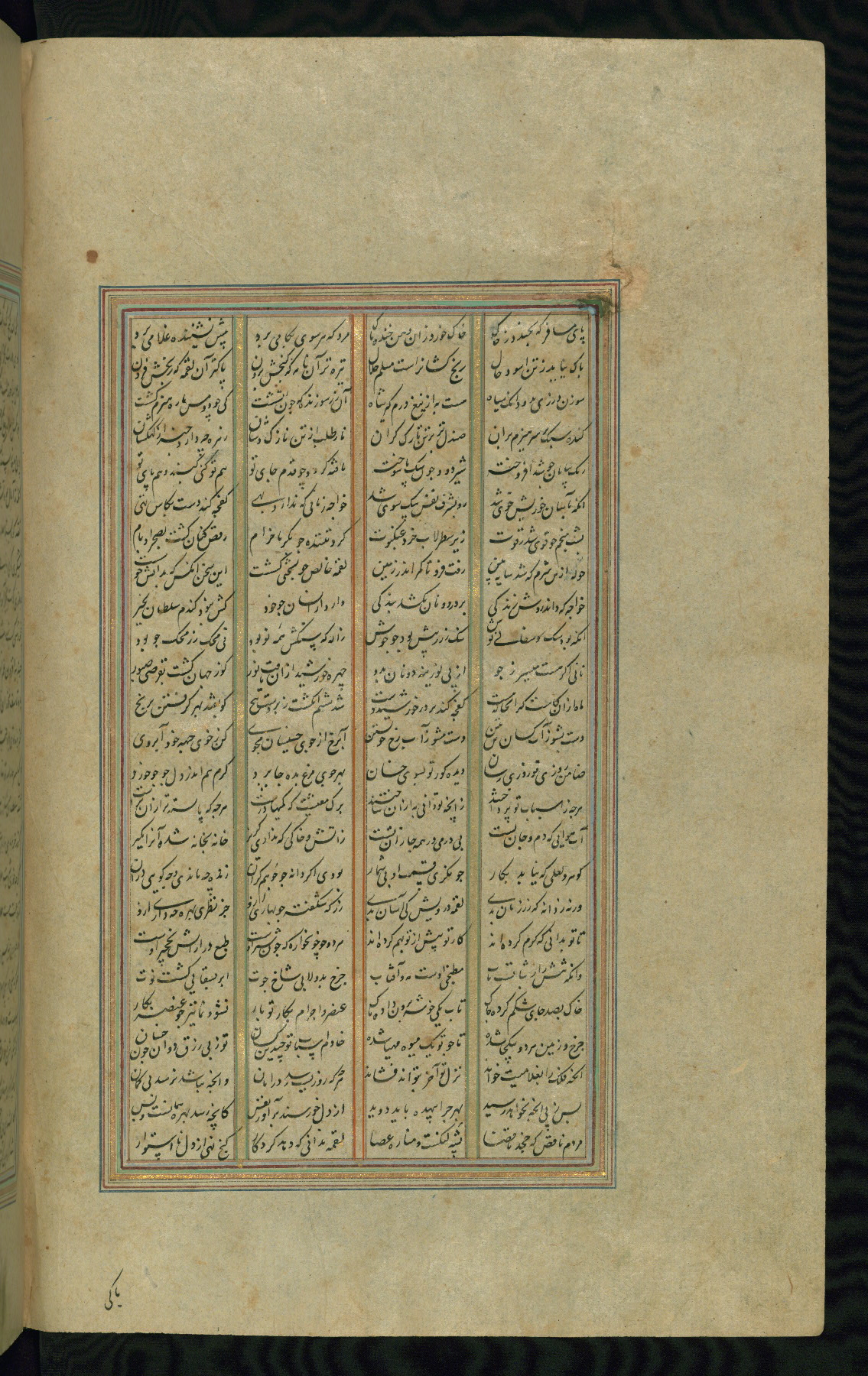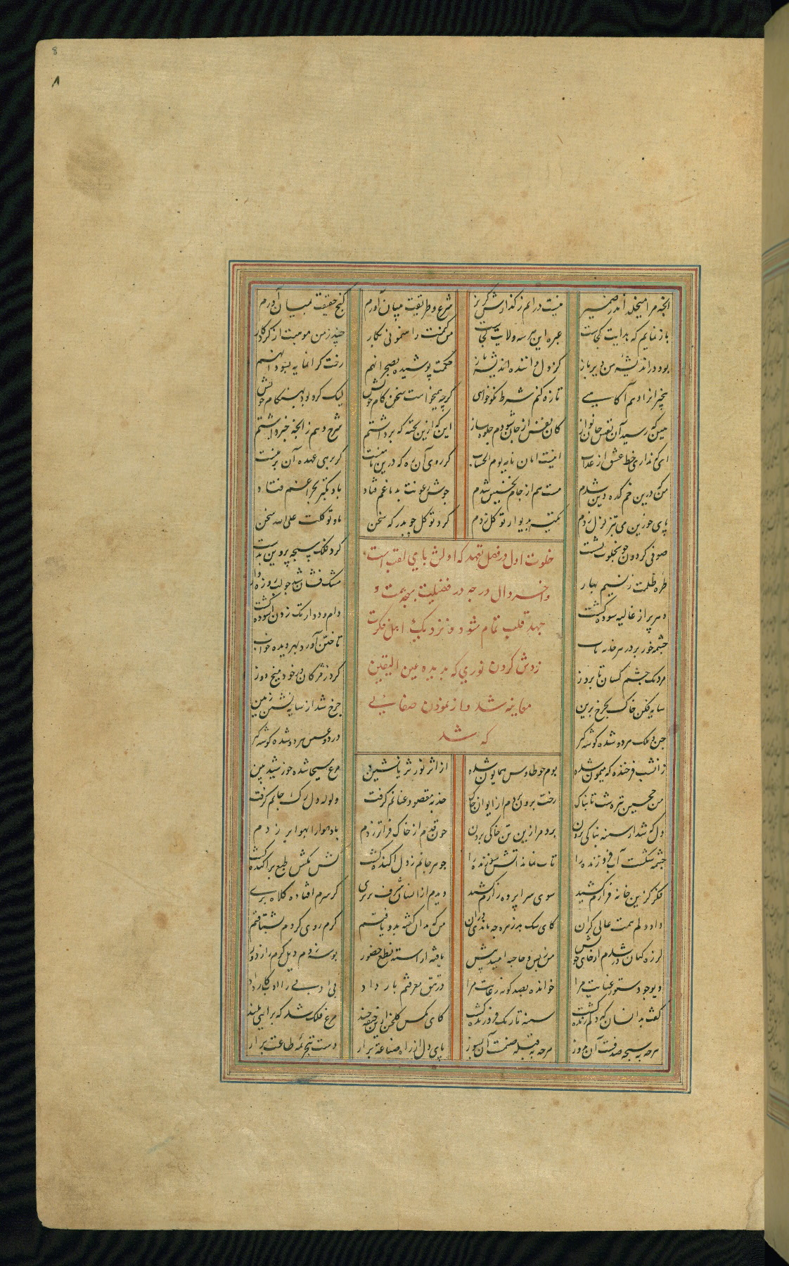 This illuminated and illustrated manuscript contains the Khamsah (quintet) and two historical poems (masnavi), Qirān-i saʿdayn and Nuh sipihr, by Amīr Khusraw Dihlavī (d. 725 AH / 1325 CE). The codex is dated 1017 AH / 1609 CE and was produced in Safavid Iran. All texts are written in black nastaʿlīq script with chapter headings in red. The manuscript opens with an illuminated and illustrated frontispiece of a hunting and court scene in the early Safavid style (fols. 1b-2a). The first text is Khamsah-i Dihlavī (fols. 2b-192a), which is introduced by an illuminated incipit and titlepiece with the title of the first poem of the quintet and the author's name. The second text is Qirān-i saʿdayn, a historical poem (masnavi) about the meeting of Sultan Muʿizz al-Dīn Kayqubād and his father, Nāṣir al-Din Bughrā Khān, on the banks of the Sarjū in Oudh. It is also introduced with an illuminated incipit and titlepiece (fol. 193b). The third text is Nuh sipihr, a historical poem (masnavi) describing the glories of Sultan Quṭb al-Dīn Mubārak Shāh Khaljī’s time, introduced with an illuminated incipit and headpiece (fol. 223b). The dark brown leather binding is original to the manuscript.