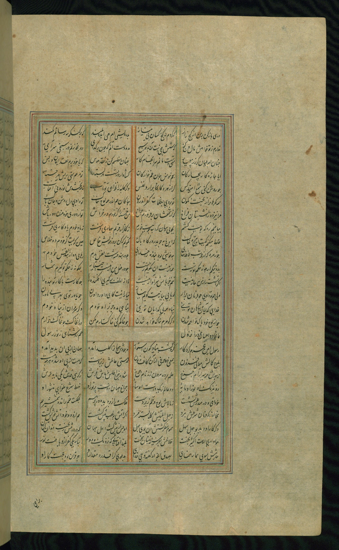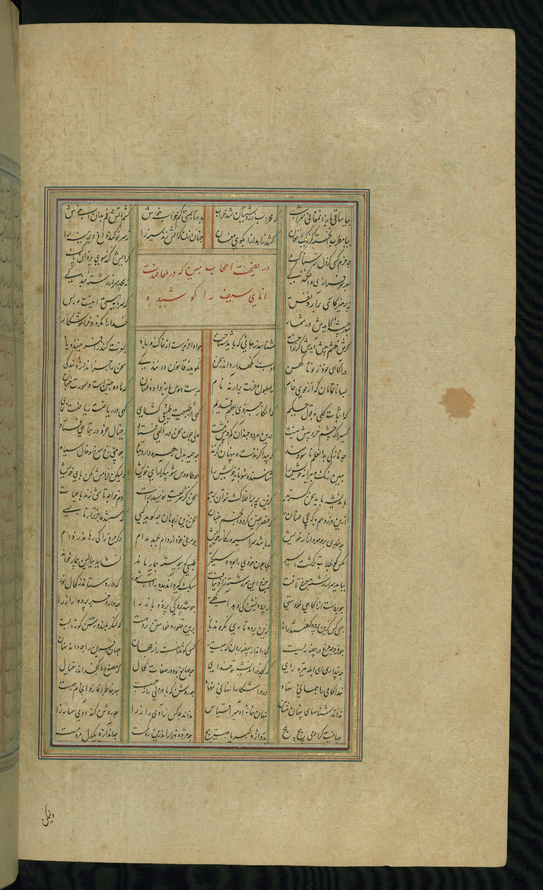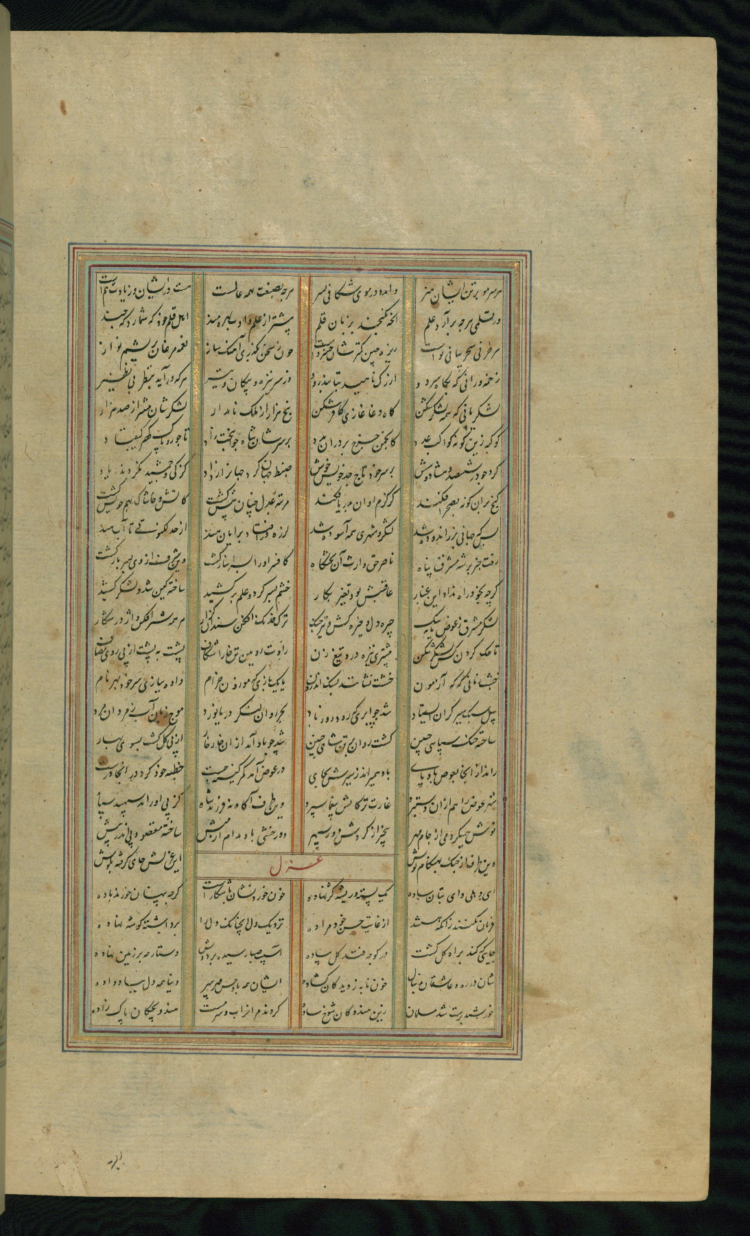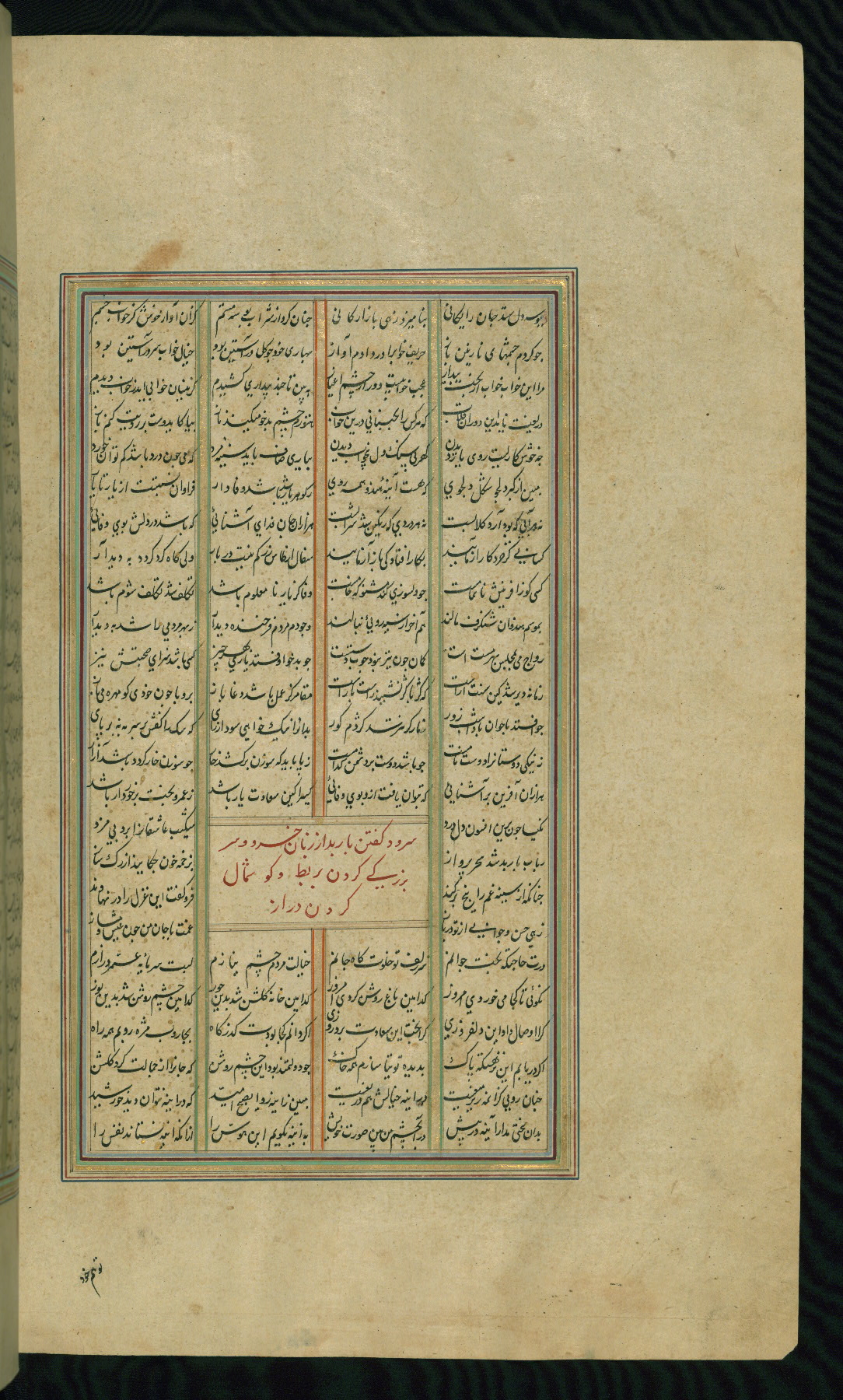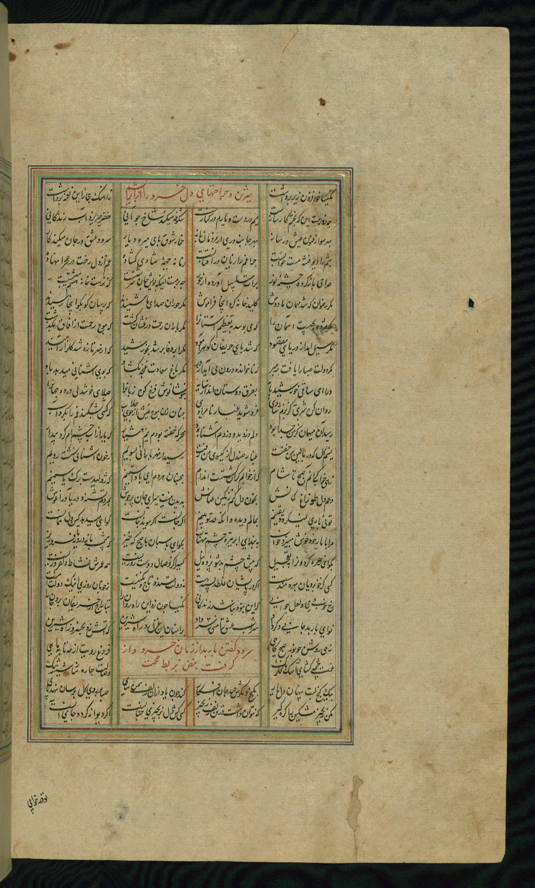 This illuminated and illustrated manuscript contains the Khamsah (quintet) and two historical poems (masnavi), Qirān-i saʿdayn and Nuh sipihr, by Amīr Khusraw Dihlavī (d. 725 AH / 1325 CE). The codex is dated 1017 AH / 1609 CE and was produced in Safavid Iran. All texts are written in black nastaʿlīq script with chapter headings in red. The manuscript opens with an illuminated and illustrated frontispiece of a hunting and court scene in the early Safavid style (fols. 1b-2a). The first text is Khamsah-i Dihlavī (fols. 2b-192a), which is introduced by an illuminated incipit and titlepiece with the title of the first poem of the quintet and the author's name. The second text is Qirān-i saʿdayn, a historical poem (masnavi) about the meeting of Sultan Muʿizz al-Dīn Kayqubād and his father, Nāṣir al-Din Bughrā Khān, on the banks of the Sarjū in Oudh. It is also introduced with an illuminated incipit and titlepiece (fol. 193b). The third text is Nuh sipihr, a historical poem (masnavi) describing the glories of Sultan Quṭb al-Dīn Mubārak Shāh Khaljī’s time, introduced with an illuminated incipit and headpiece (fol. 223b). The dark brown leather binding is original to the manuscript.