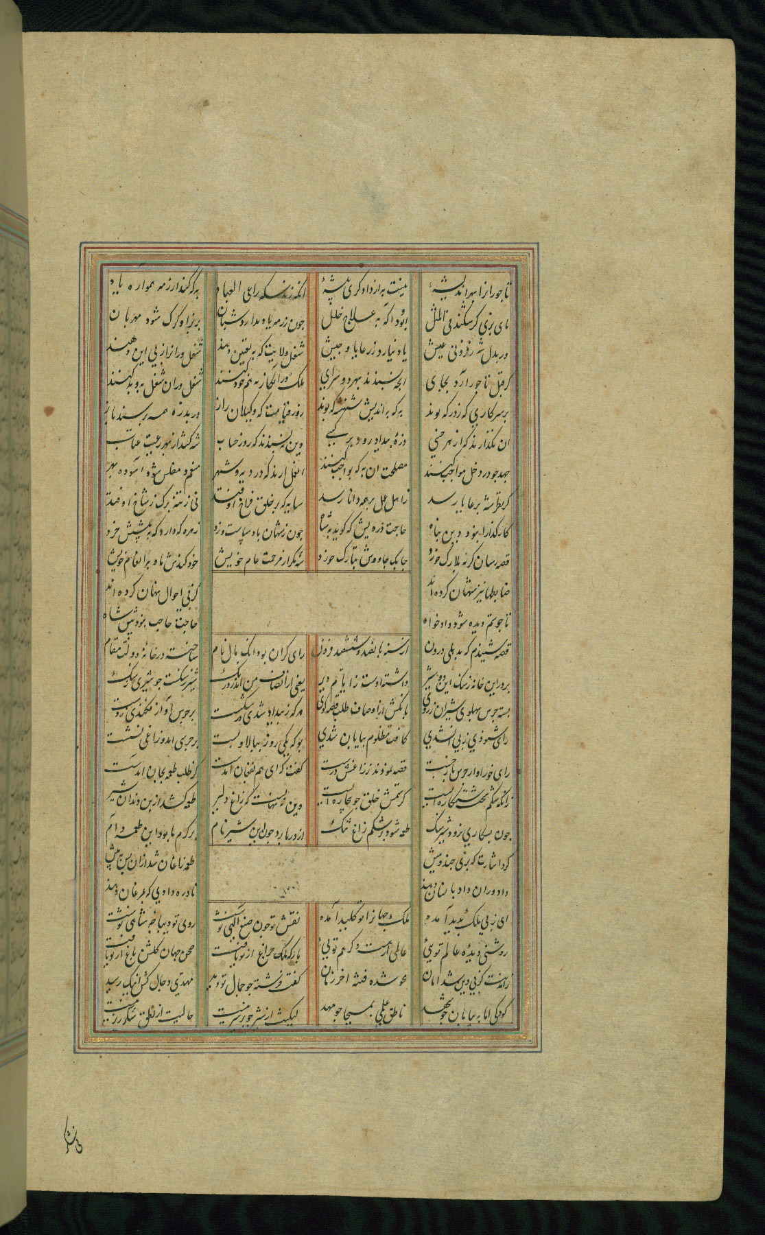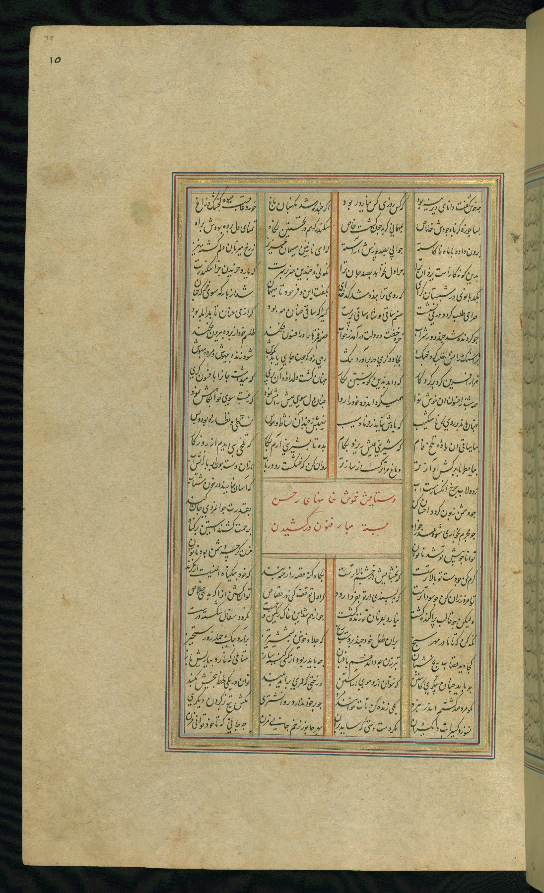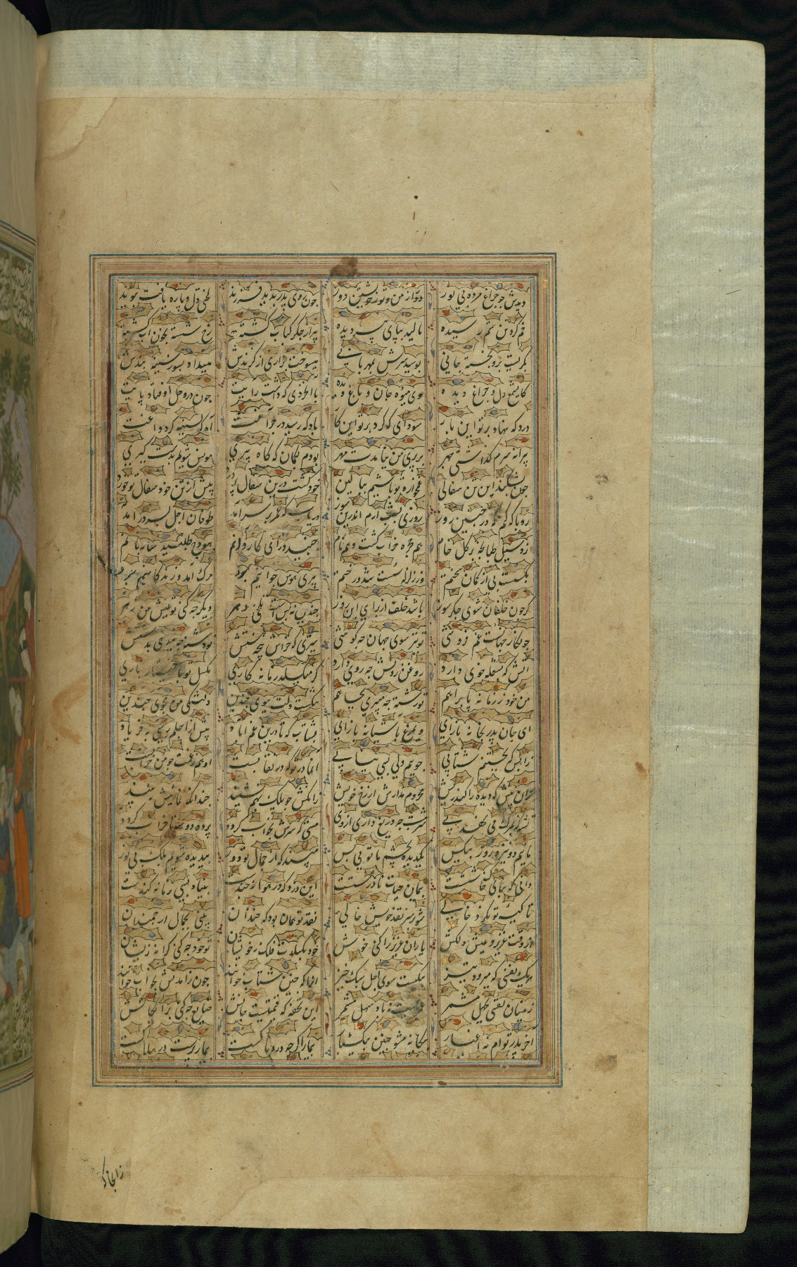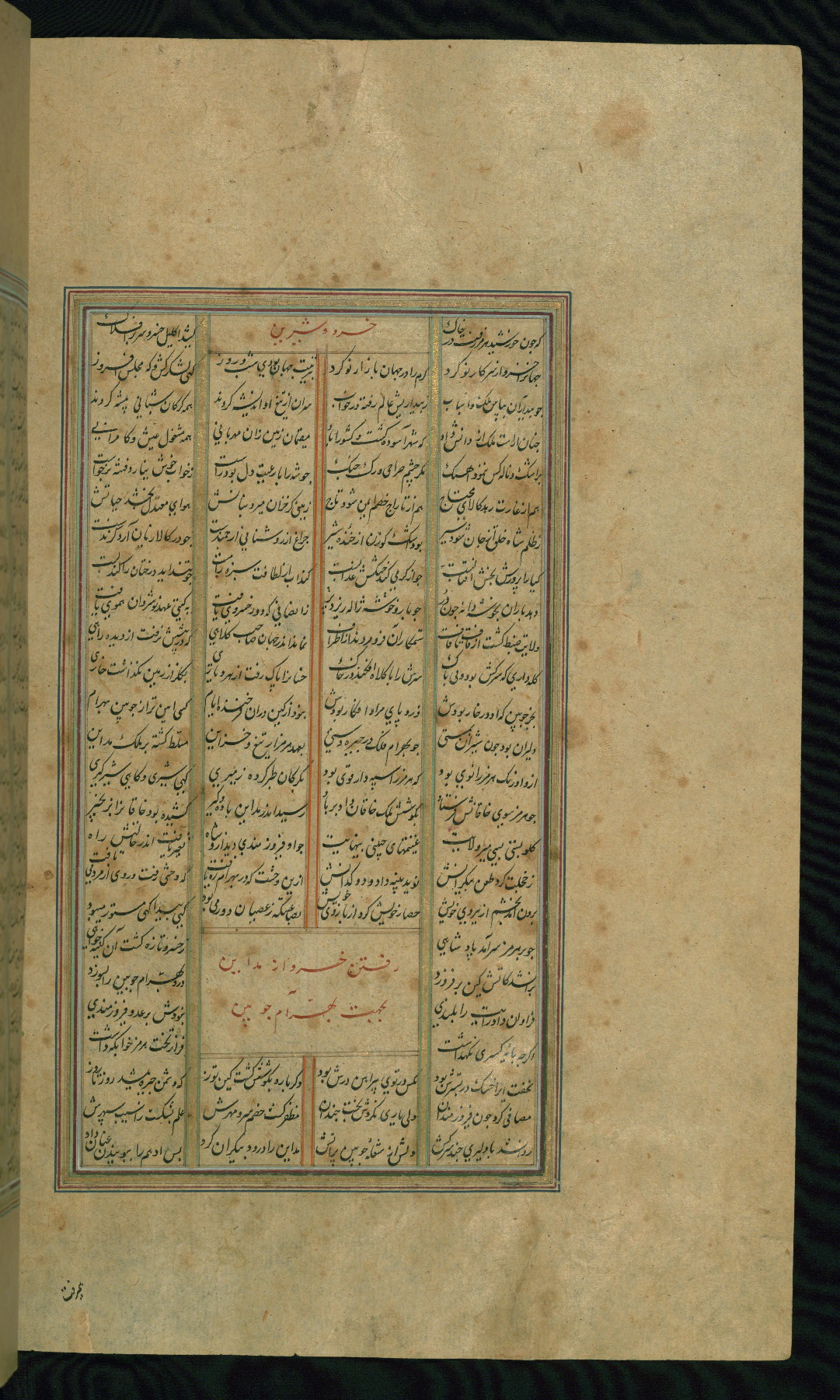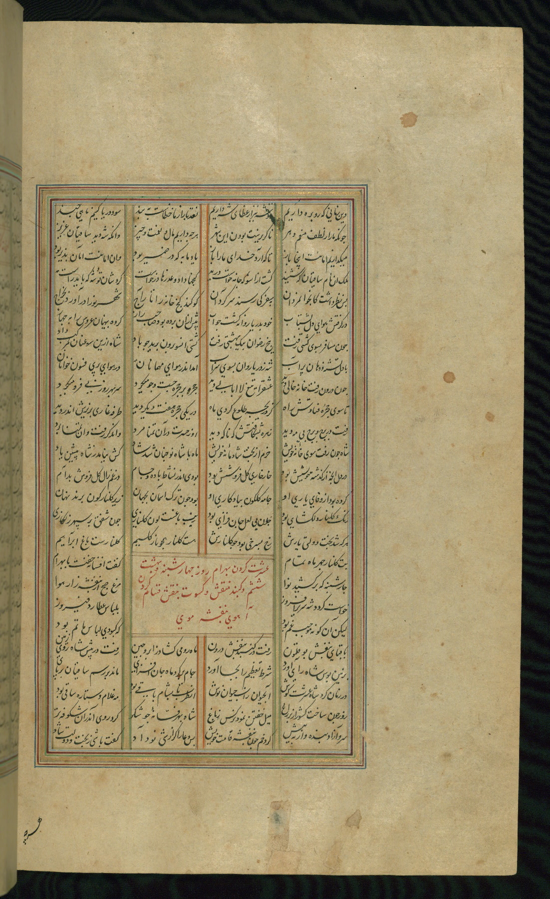This illuminated and illustrated manuscript contains the Khamsah (quintet) and two historical poems (masnavi), Qirān-i saʿdayn and Nuh sipihr, by Amīr Khusraw Dihlavī (d. 725 AH / 1325 CE). The codex is dated 1017 AH / 1609 CE and was produced in Safavid Iran. All texts are written in black nastaʿlīq script with chapter headings in red. The manuscript opens with an illuminated and illustrated frontispiece of a hunting and court scene in the early Safavid style (fols. 1b-2a). The first text is Khamsah-i Dihlavī (fols. 2b-192a), which is introduced by an illuminated incipit and titlepiece with the title of the first poem of the quintet and the author's name. The second text is Qirān-i saʿdayn, a historical poem (masnavi) about the meeting of Sultan Muʿizz al-Dīn Kayqubād and his father, Nāṣir al-Din Bughrā Khān, on the banks of the Sarjū in Oudh. It is also introduced with an illuminated incipit and titlepiece (fol. 193b). The third text is Nuh sipihr, a historical poem (masnavi) describing the glories of Sultan Quṭb al-Dīn Mubārak Shāh Khaljī’s time, introduced with an illuminated incipit and headpiece (fol. 223b). The dark brown leather binding is original to the manuscript.