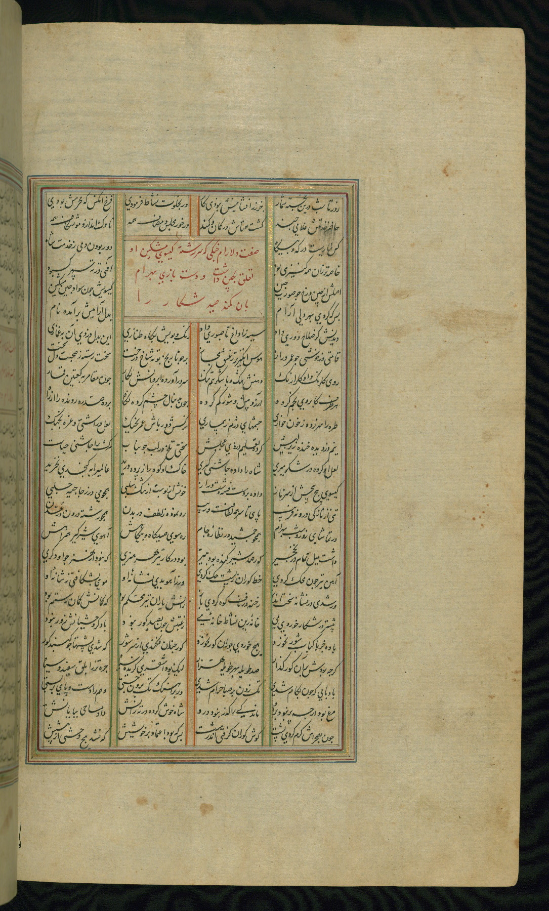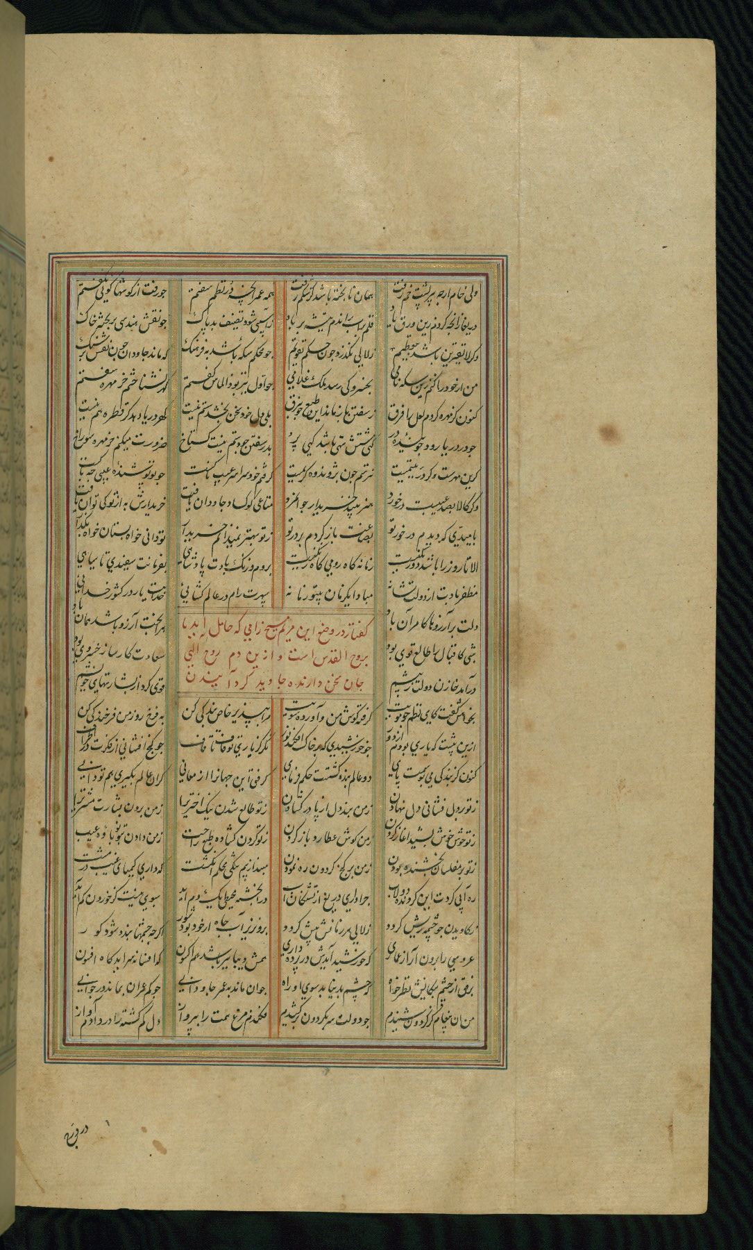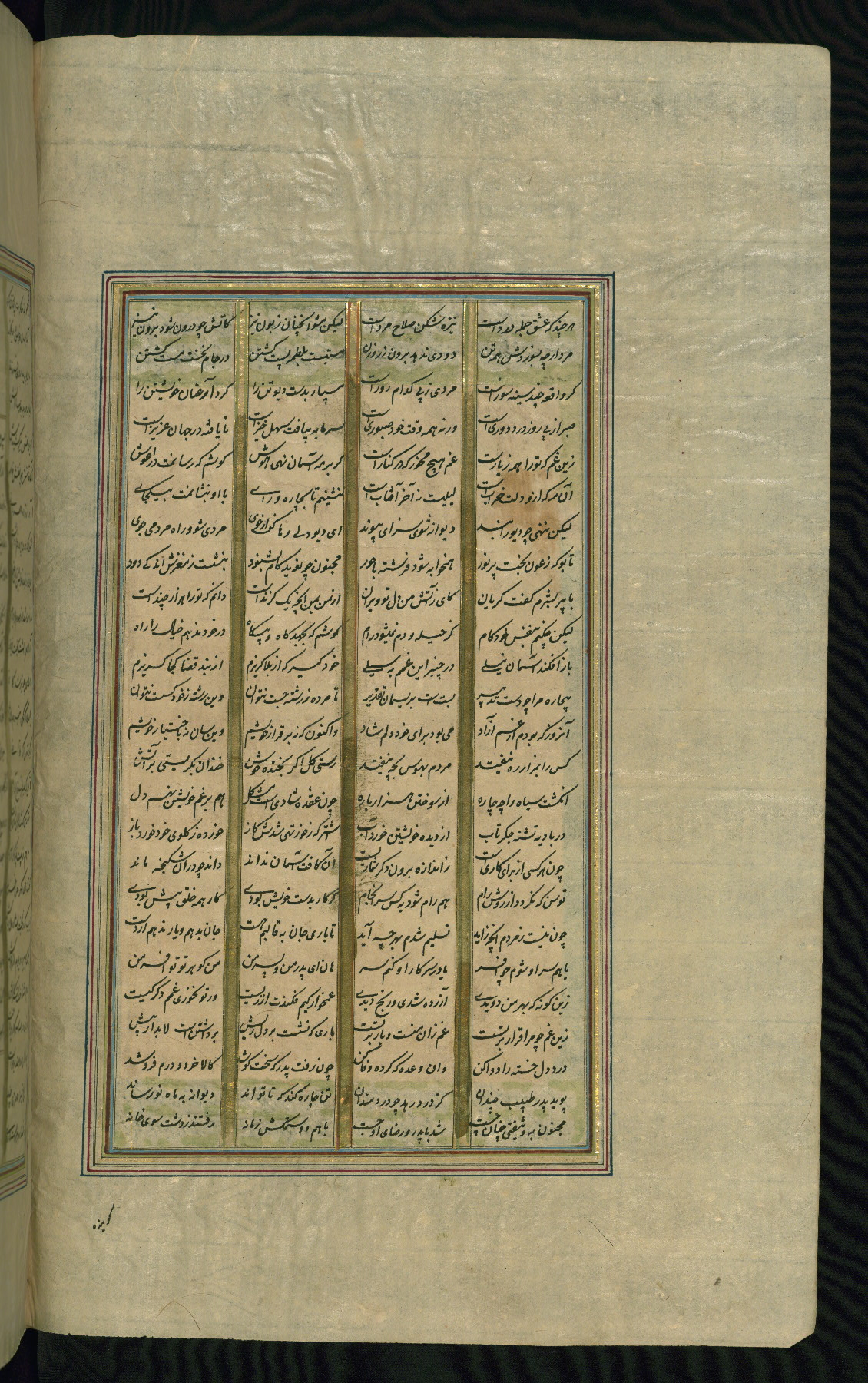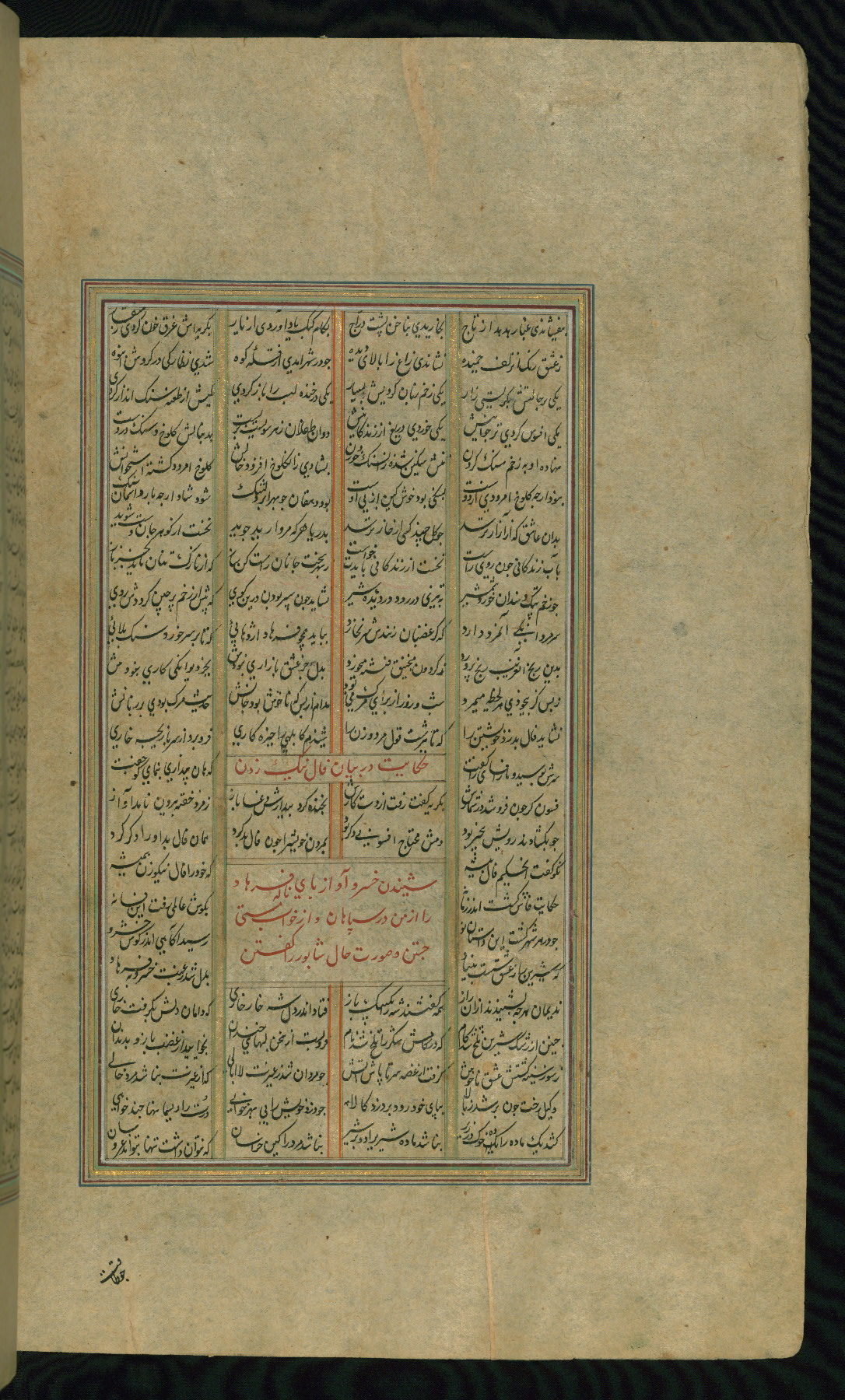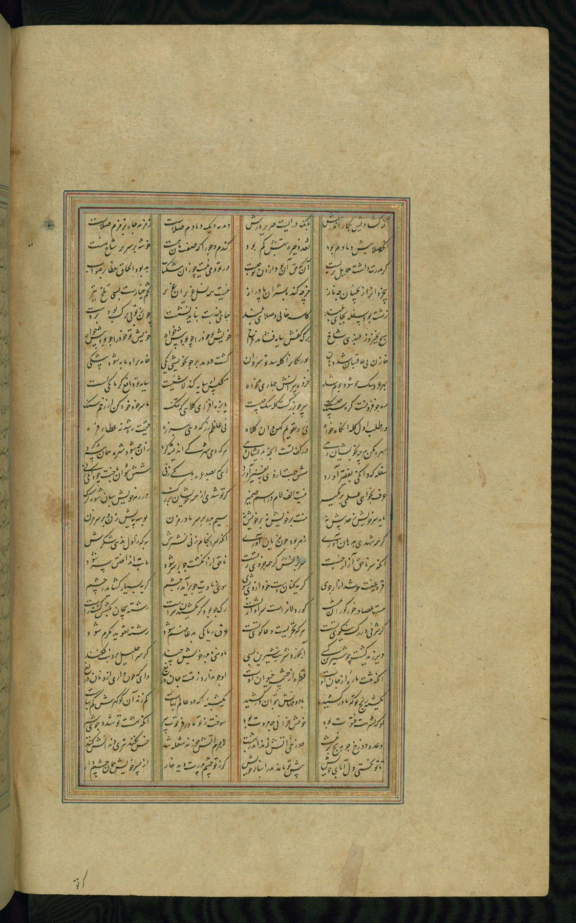 This illuminated and illustrated manuscript contains the Khamsah (quintet) and two historical poems (masnavi), Qirān-i saʿdayn and Nuh sipihr, by Amīr Khusraw Dihlavī (d. 725 AH / 1325 CE). The codex is dated 1017 AH / 1609 CE and was produced in Safavid Iran. All texts are written in black nastaʿlīq script with chapter headings in red. The manuscript opens with an illuminated and illustrated frontispiece of a hunting and court scene in the early Safavid style (fols. 1b-2a). The first text is Khamsah-i Dihlavī (fols. 2b-192a), which is introduced by an illuminated incipit and titlepiece with the title of the first poem of the quintet and the author's name. The second text is Qirān-i saʿdayn, a historical poem (masnavi) about the meeting of Sultan Muʿizz al-Dīn Kayqubād and his father, Nāṣir al-Din Bughrā Khān, on the banks of the Sarjū in Oudh. It is also introduced with an illuminated incipit and titlepiece (fol. 193b). The third text is Nuh sipihr, a historical poem (masnavi) describing the glories of Sultan Quṭb al-Dīn Mubārak Shāh Khaljī’s time, introduced with an illuminated incipit and headpiece (fol. 223b). The dark brown leather binding is original to the manuscript.