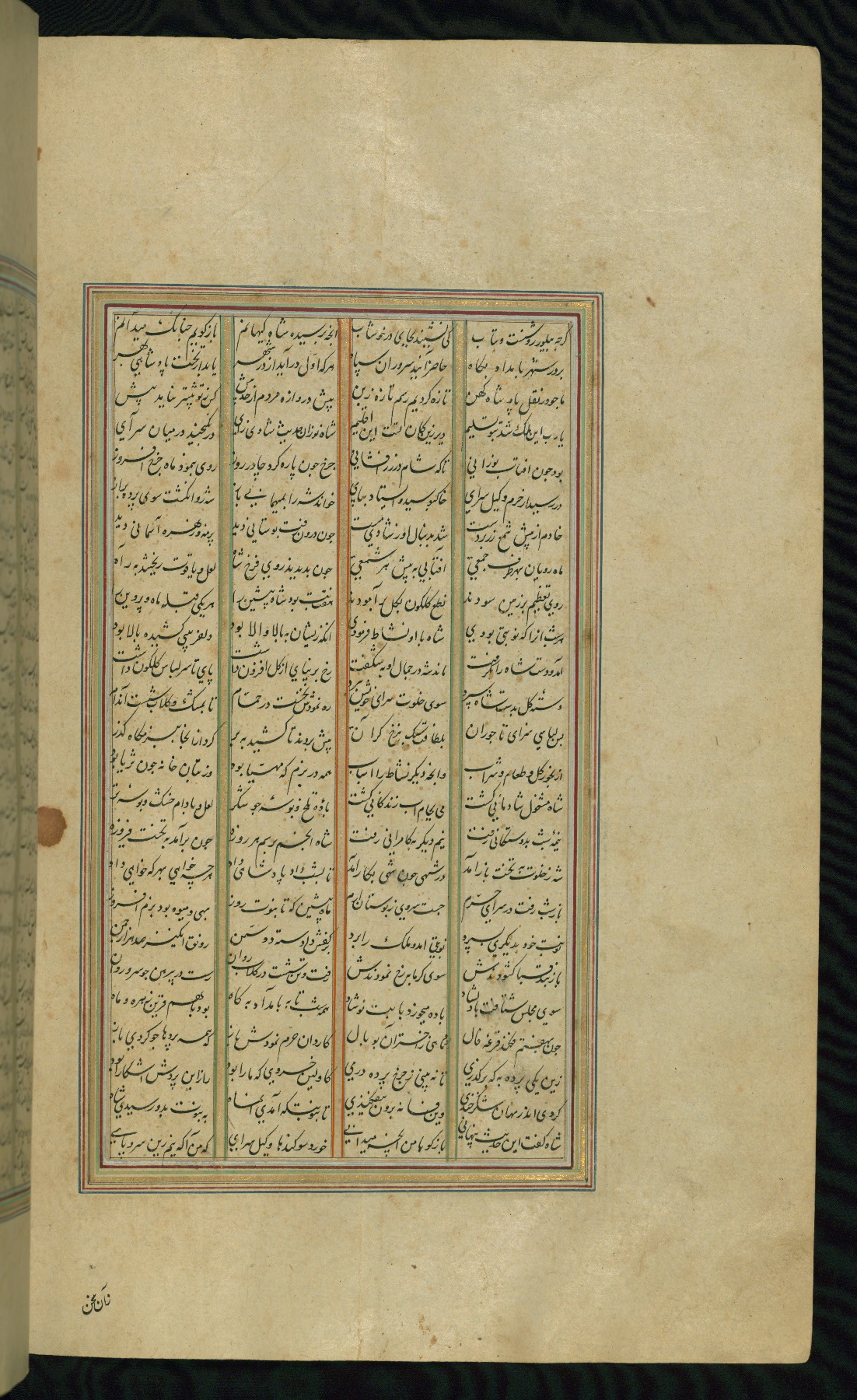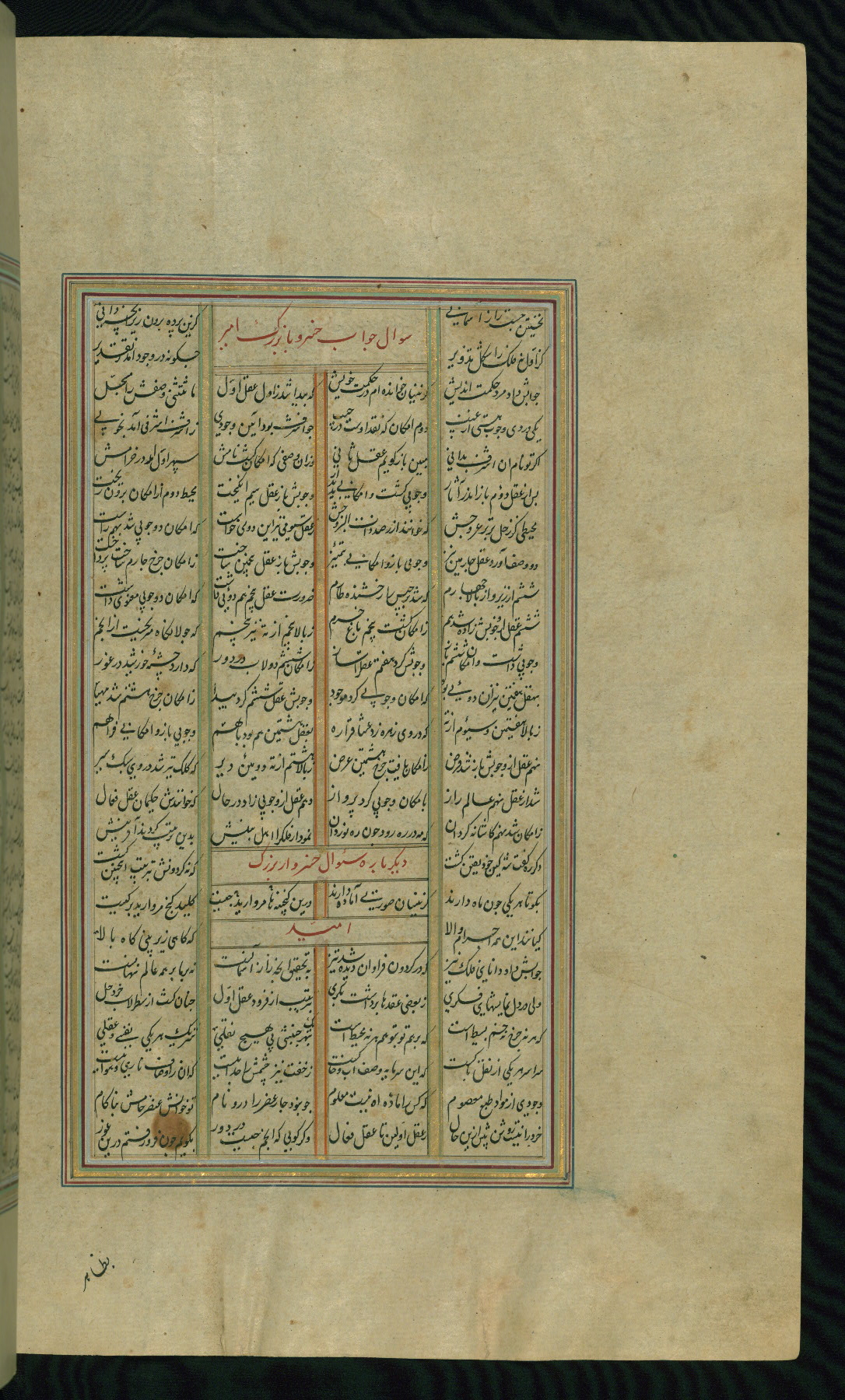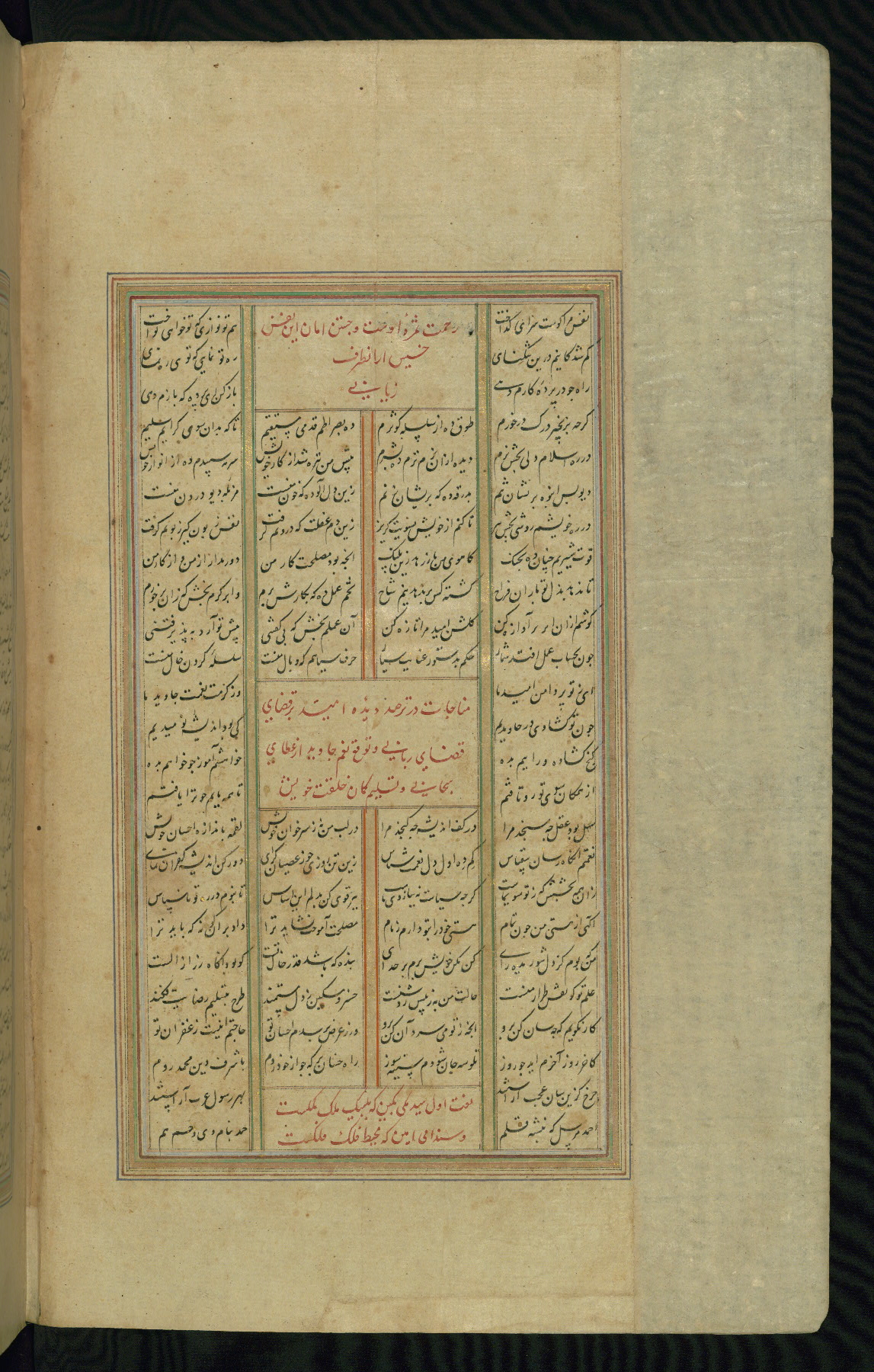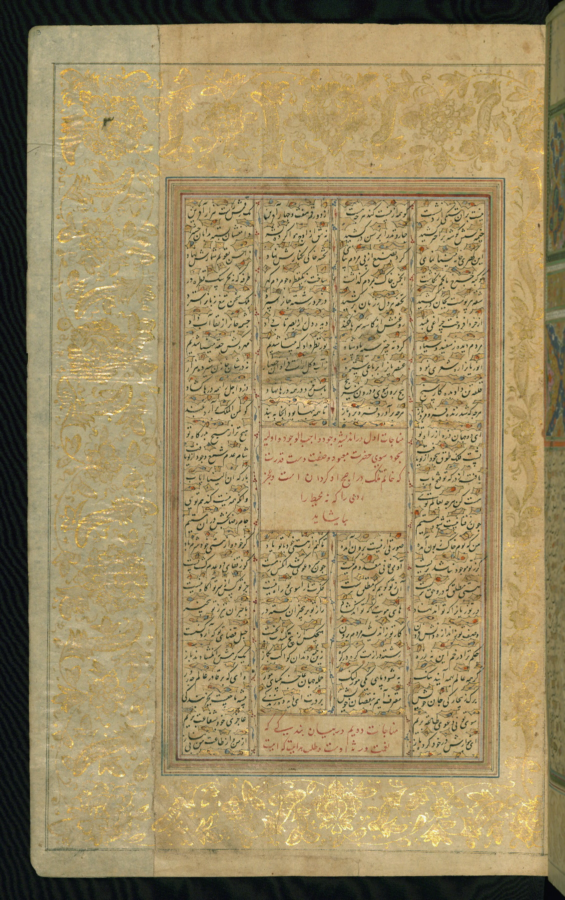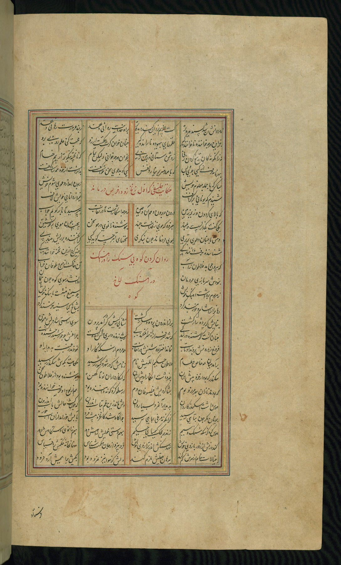 This illuminated and illustrated manuscript contains the Khamsah (quintet) and two historical poems (masnavi), Qirān-i saʿdayn and Nuh sipihr, by Amīr Khusraw Dihlavī (d. 725 AH / 1325 CE). The codex is dated 1017 AH / 1609 CE and was produced in Safavid Iran. All texts are written in black nastaʿlīq script with chapter headings in red. The manuscript opens with an illuminated and illustrated frontispiece of a hunting and court scene in the early Safavid style (fols. 1b-2a). The first text is Khamsah-i Dihlavī (fols. 2b-192a), which is introduced by an illuminated incipit and titlepiece with the title of the first poem of the quintet and the author's name. The second text is Qirān-i saʿdayn, a historical poem (masnavi) about the meeting of Sultan Muʿizz al-Dīn Kayqubād and his father, Nāṣir al-Din Bughrā Khān, on the banks of the Sarjū in Oudh. It is also introduced with an illuminated incipit and titlepiece (fol. 193b). The third text is Nuh sipihr, a historical poem (masnavi) describing the glories of Sultan Quṭb al-Dīn Mubārak Shāh Khaljī’s time, introduced with an illuminated incipit and headpiece (fol. 223b). The dark brown leather binding is original to the manuscript.