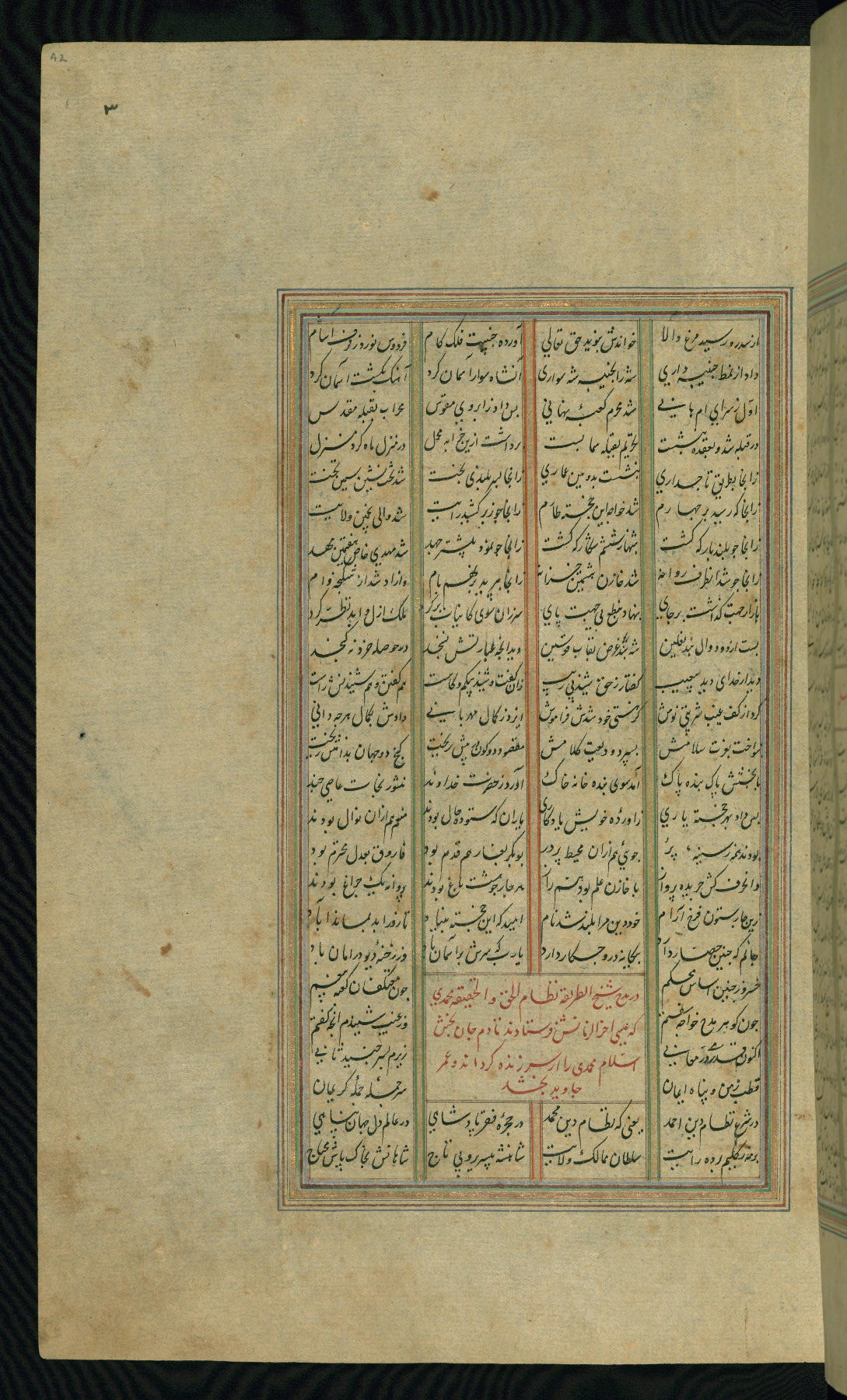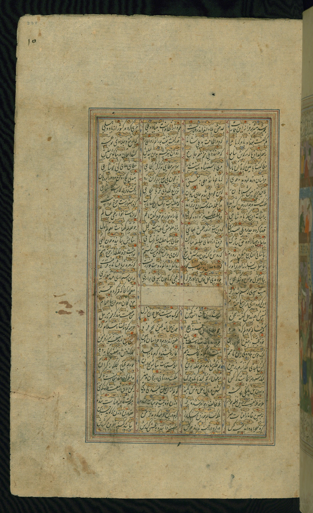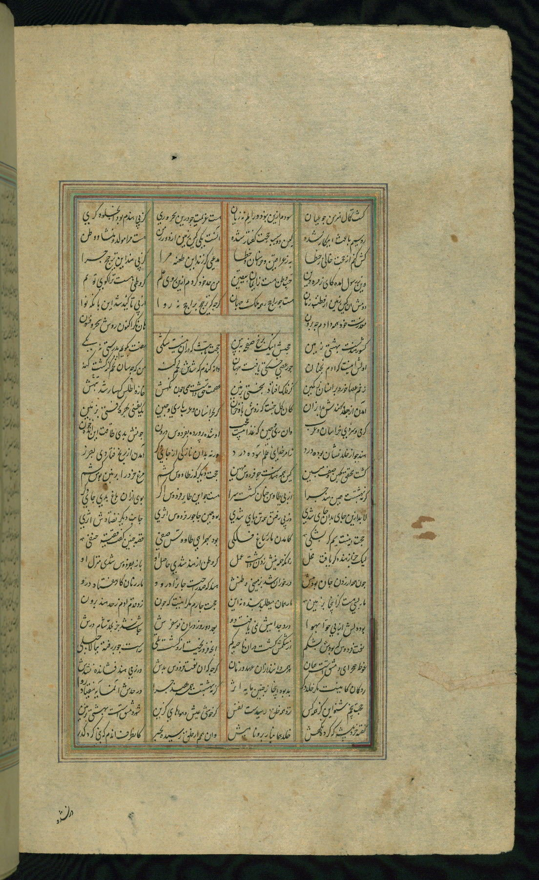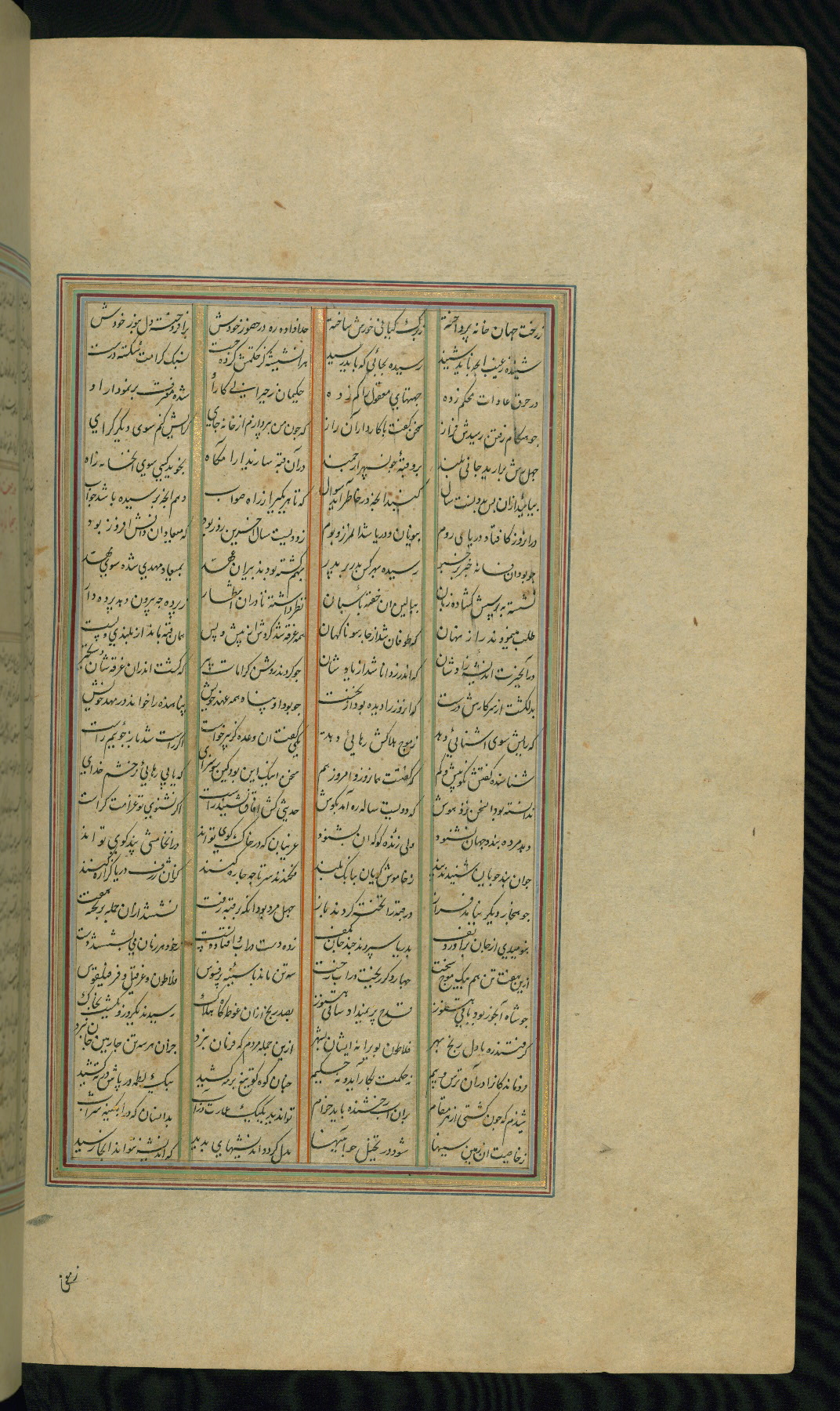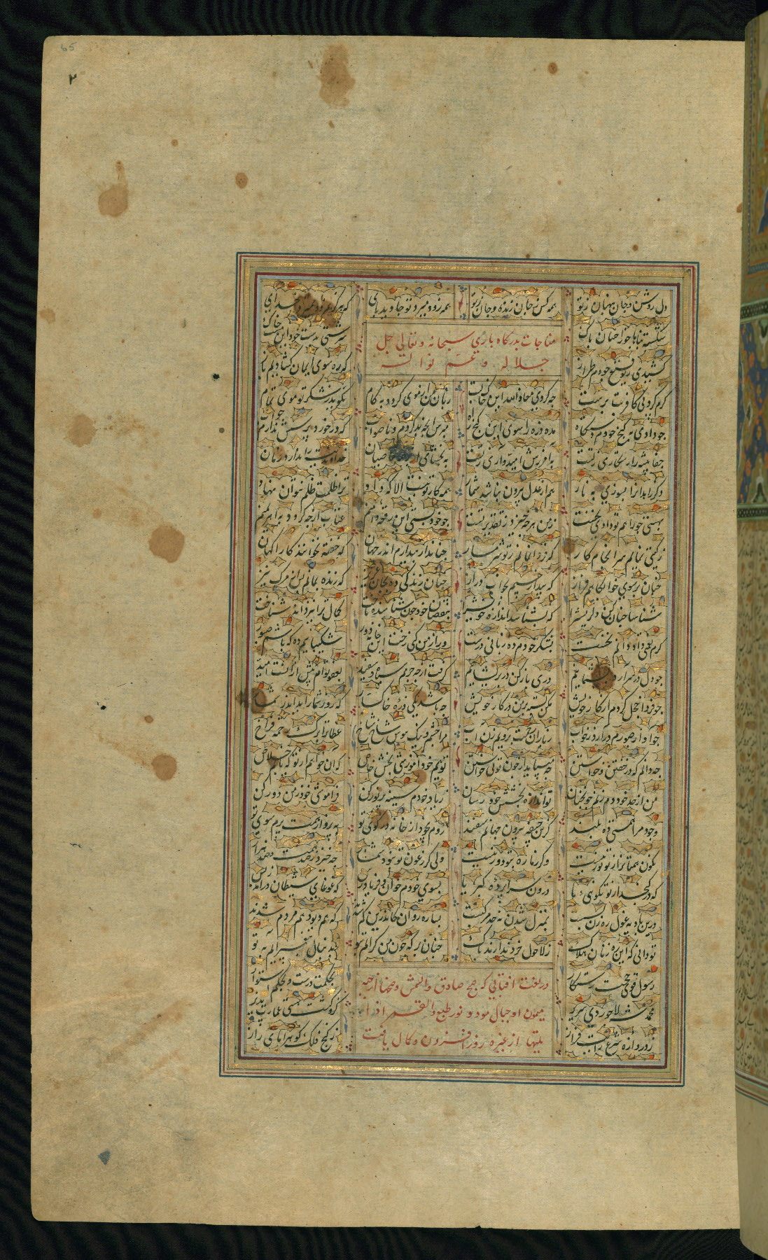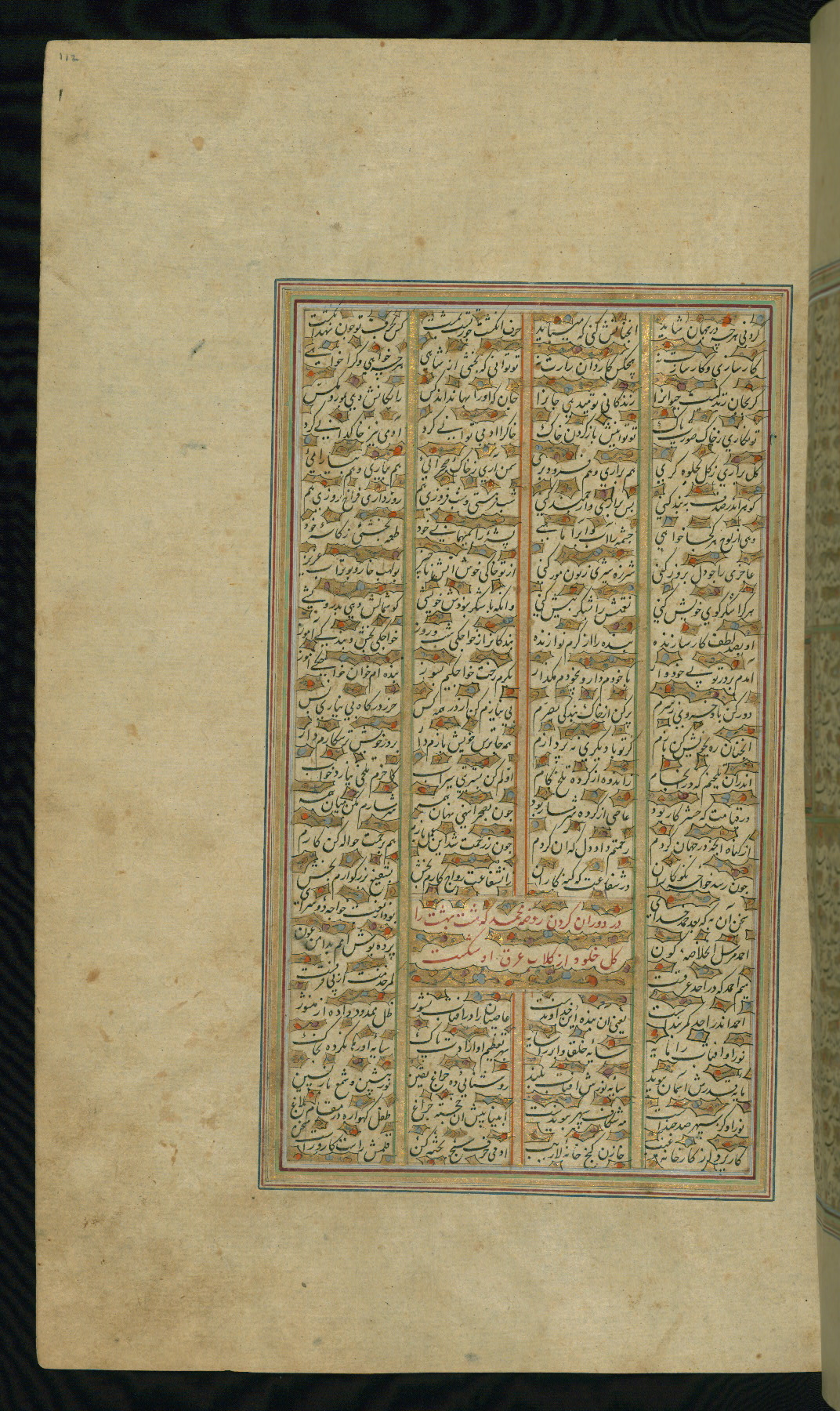 This illuminated and illustrated manuscript contains the Khamsah (quintet) and two historical poems (masnavi), Qirān-i saʿdayn and Nuh sipihr, by Amīr Khusraw Dihlavī (d. 725 AH / 1325 CE). The codex is dated 1017 AH / 1609 CE and was produced in Safavid Iran. All texts are written in black nastaʿlīq script with chapter headings in red. The manuscript opens with an illuminated and illustrated frontispiece of a hunting and court scene in the early Safavid style (fols. 1b-2a). The first text is Khamsah-i Dihlavī (fols. 2b-192a), which is introduced by an illuminated incipit and titlepiece with the title of the first poem of the quintet and the author's name. The second text is Qirān-i saʿdayn, a historical poem (masnavi) about the meeting of Sultan Muʿizz al-Dīn Kayqubād and his father, Nāṣir al-Din Bughrā Khān, on the banks of the Sarjū in Oudh. It is also introduced with an illuminated incipit and titlepiece (fol. 193b). The third text is Nuh sipihr, a historical poem (masnavi) describing the glories of Sultan Quṭb al-Dīn Mubārak Shāh Khaljī’s time, introduced with an illuminated incipit and headpiece (fol. 223b). The dark brown leather binding is original to the manuscript.