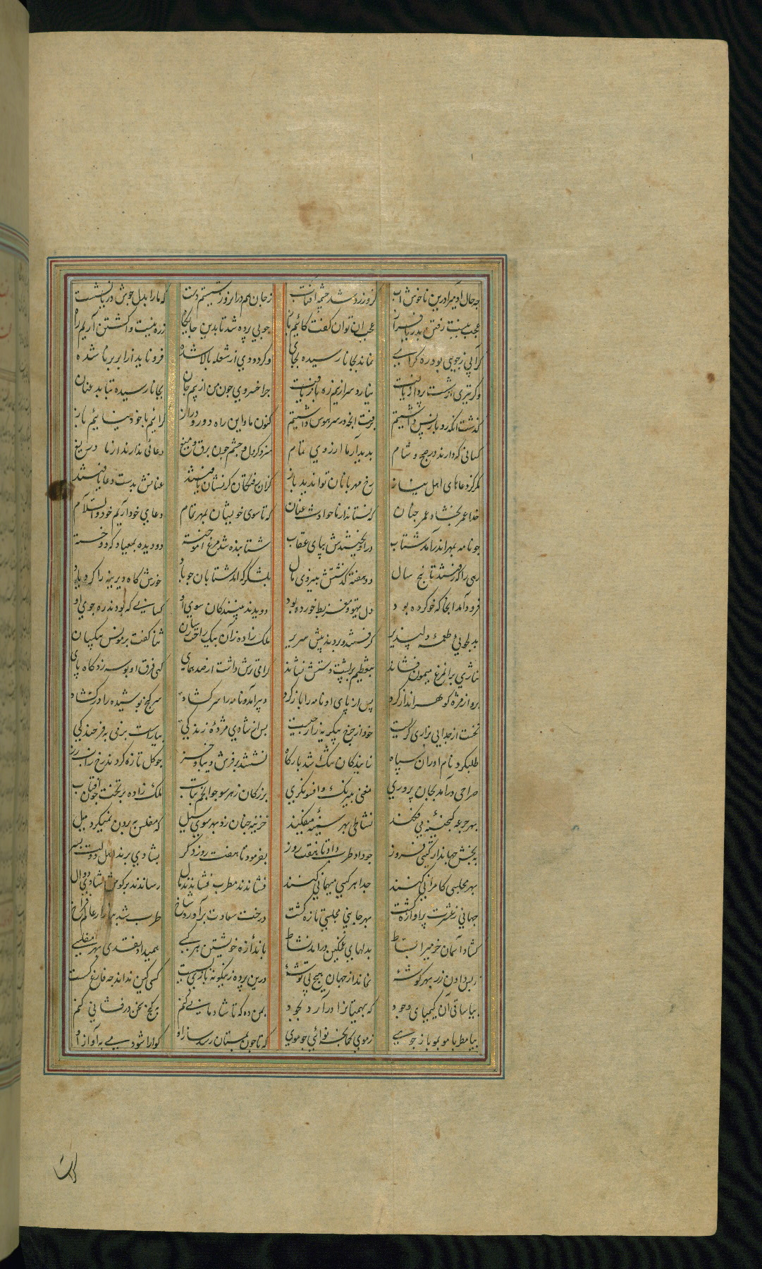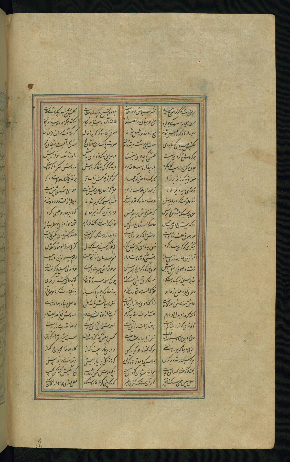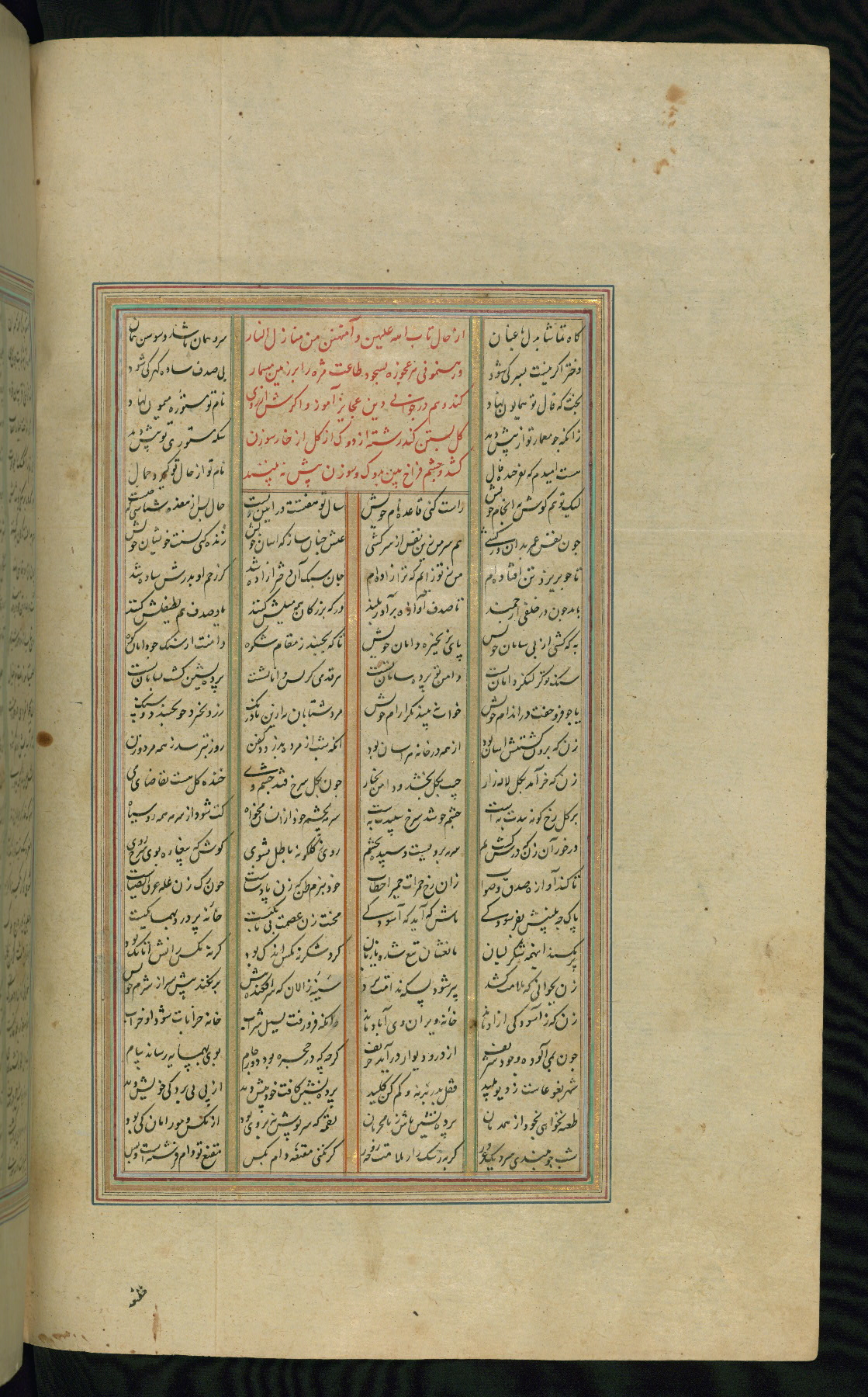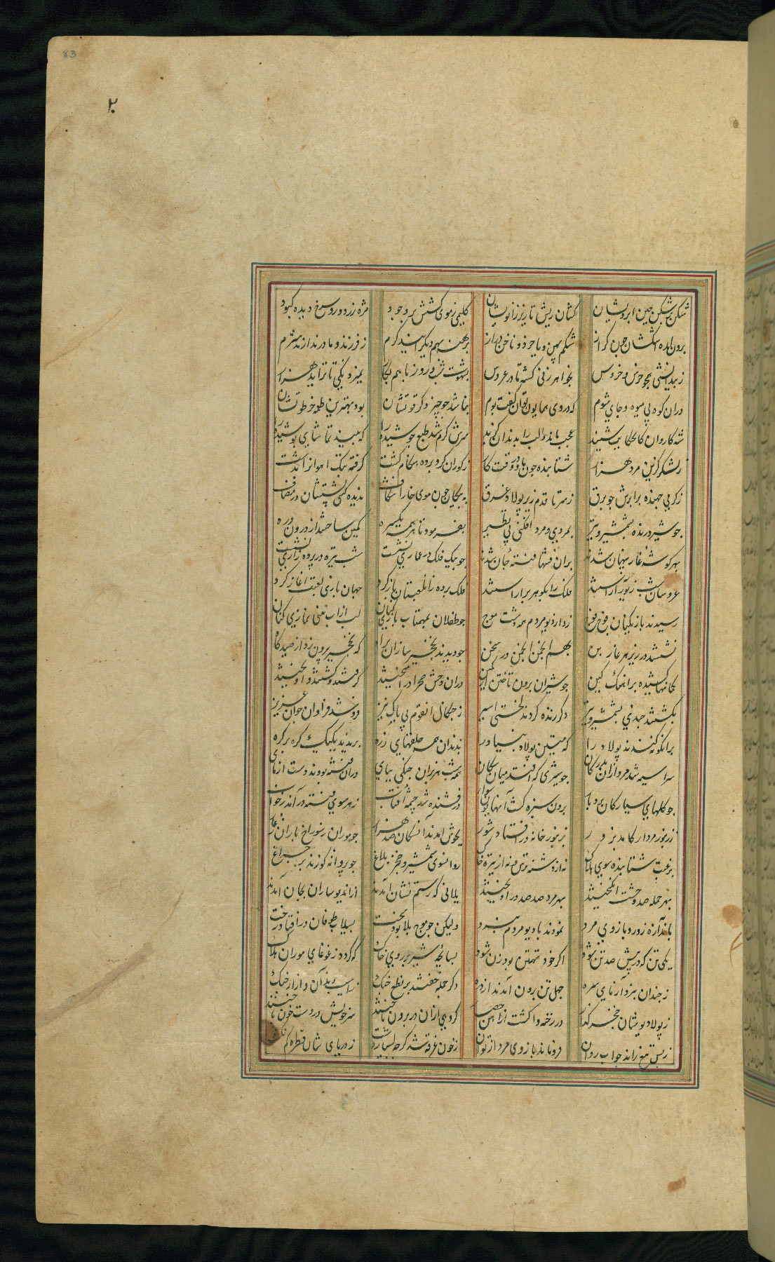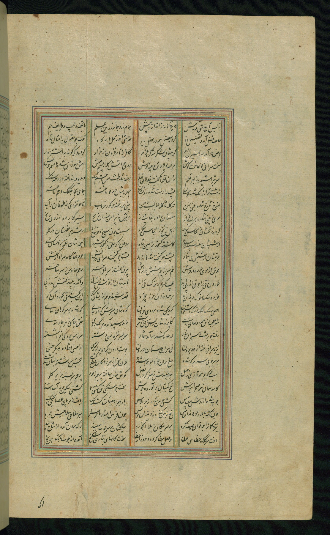 This illuminated and illustrated manuscript contains the Khamsah (quintet) and two historical poems (masnavi), Qirān-i saʿdayn and Nuh sipihr, by Amīr Khusraw Dihlavī (d. 725 AH / 1325 CE). The codex is dated 1017 AH / 1609 CE and was produced in Safavid Iran. All texts are written in black nastaʿlīq script with chapter headings in red. The manuscript opens with an illuminated and illustrated frontispiece of a hunting and court scene in the early Safavid style (fols. 1b-2a). The first text is Khamsah-i Dihlavī (fols. 2b-192a), which is introduced by an illuminated incipit and titlepiece with the title of the first poem of the quintet and the author's name. The second text is Qirān-i saʿdayn, a historical poem (masnavi) about the meeting of Sultan Muʿizz al-Dīn Kayqubād and his father, Nāṣir al-Din Bughrā Khān, on the banks of the Sarjū in Oudh. It is also introduced with an illuminated incipit and titlepiece (fol. 193b). The third text is Nuh sipihr, a historical poem (masnavi) describing the glories of Sultan Quṭb al-Dīn Mubārak Shāh Khaljī’s time, introduced with an illuminated incipit and headpiece (fol. 223b). The dark brown leather binding is original to the manuscript.
