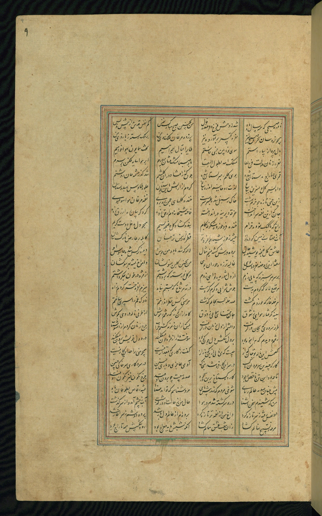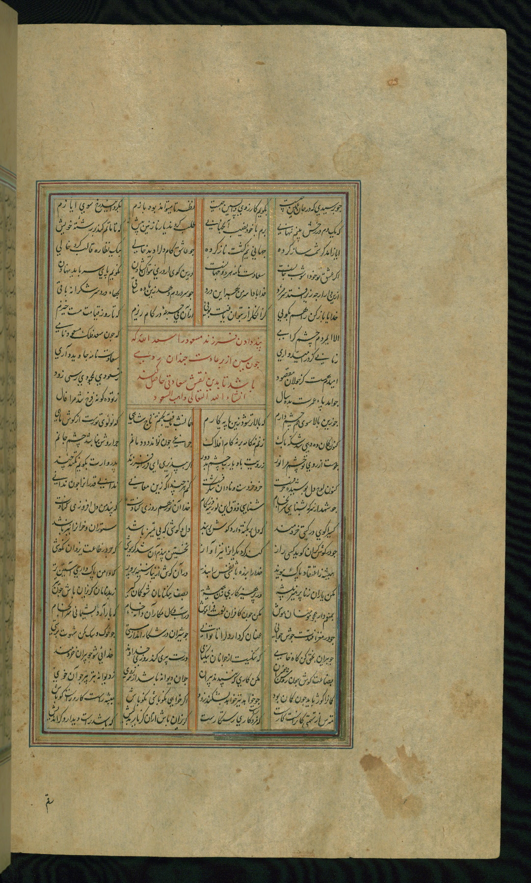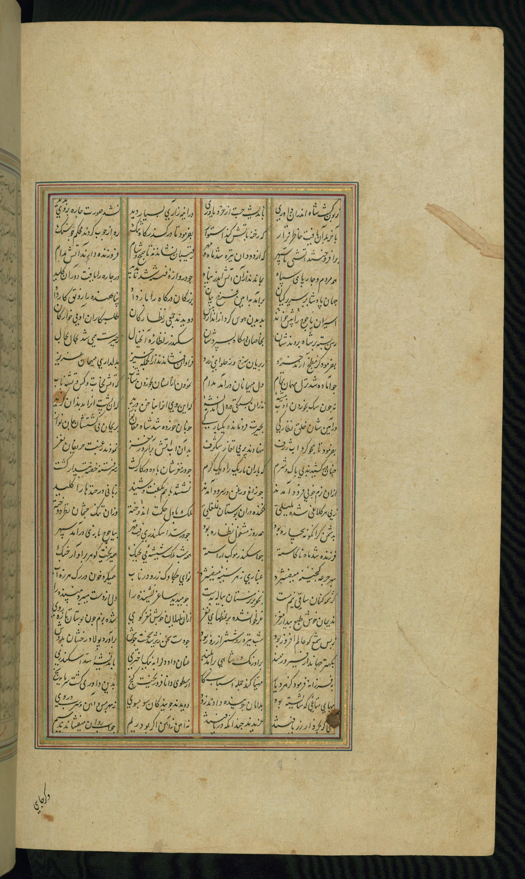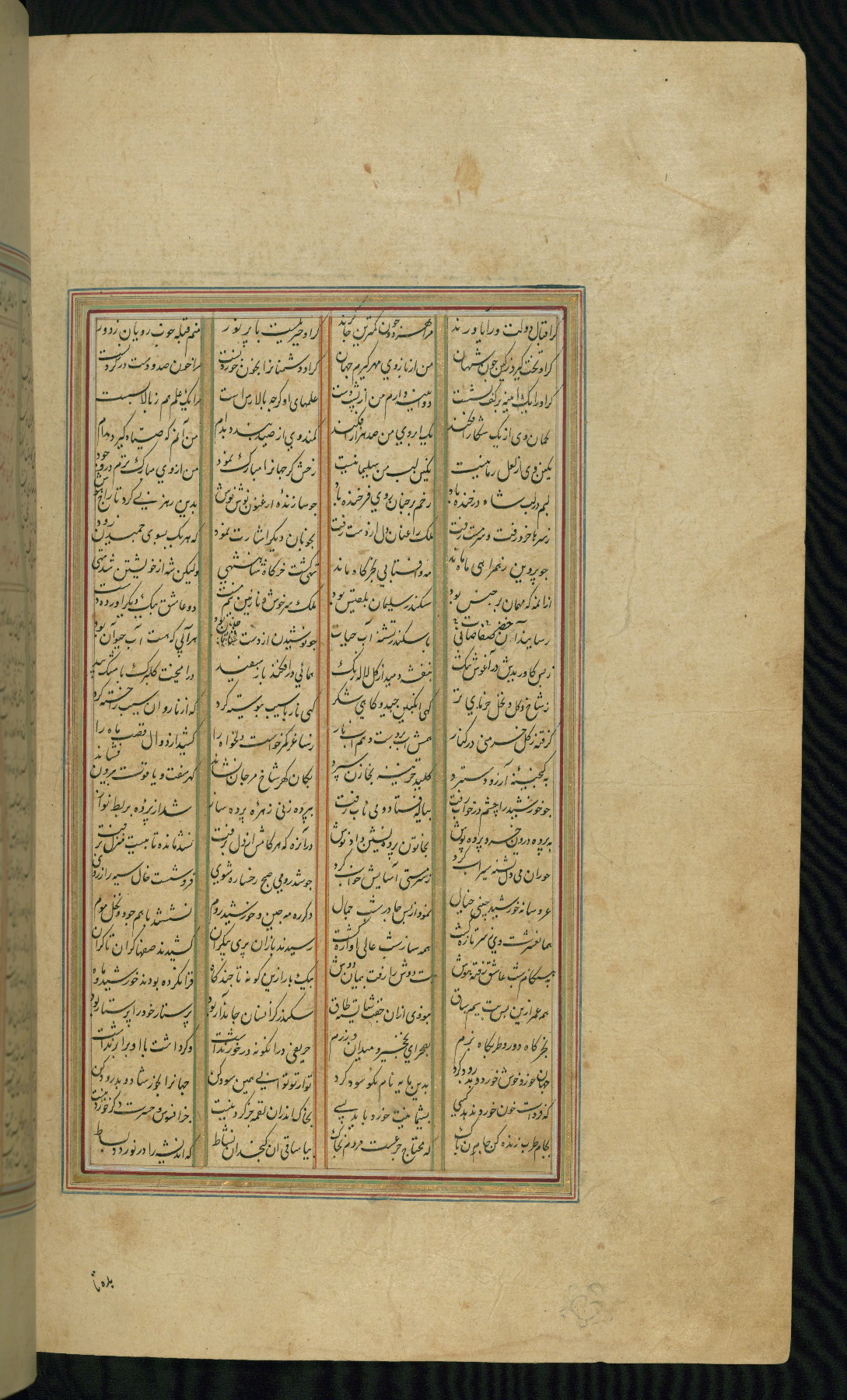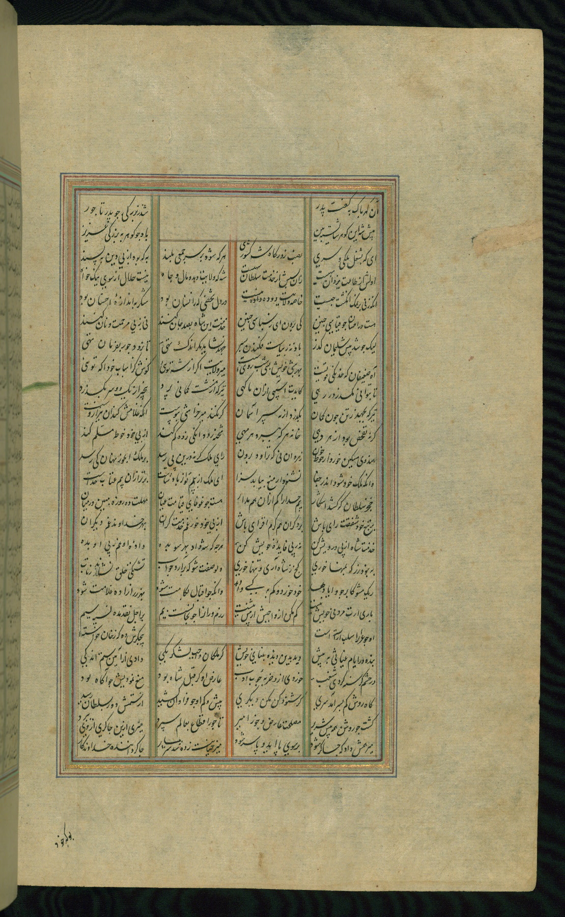 This illuminated and illustrated manuscript contains the Khamsah (quintet) and two historical poems (masnavi), Qirān-i saʿdayn and Nuh sipihr, by Amīr Khusraw Dihlavī (d. 725 AH / 1325 CE). The codex is dated 1017 AH / 1609 CE and was produced in Safavid Iran. All texts are written in black nastaʿlīq script with chapter headings in red. The manuscript opens with an illuminated and illustrated frontispiece of a hunting and court scene in the early Safavid style (fols. 1b-2a). The first text is Khamsah-i Dihlavī (fols. 2b-192a), which is introduced by an illuminated incipit and titlepiece with the title of the first poem of the quintet and the author's name. The second text is Qirān-i saʿdayn, a historical poem (masnavi) about the meeting of Sultan Muʿizz al-Dīn Kayqubād and his father, Nāṣir al-Din Bughrā Khān, on the banks of the Sarjū in Oudh. It is also introduced with an illuminated incipit and titlepiece (fol. 193b). The third text is Nuh sipihr, a historical poem (masnavi) describing the glories of Sultan Quṭb al-Dīn Mubārak Shāh Khaljī’s time, introduced with an illuminated incipit and headpiece (fol. 223b). The dark brown leather binding is original to the manuscript.