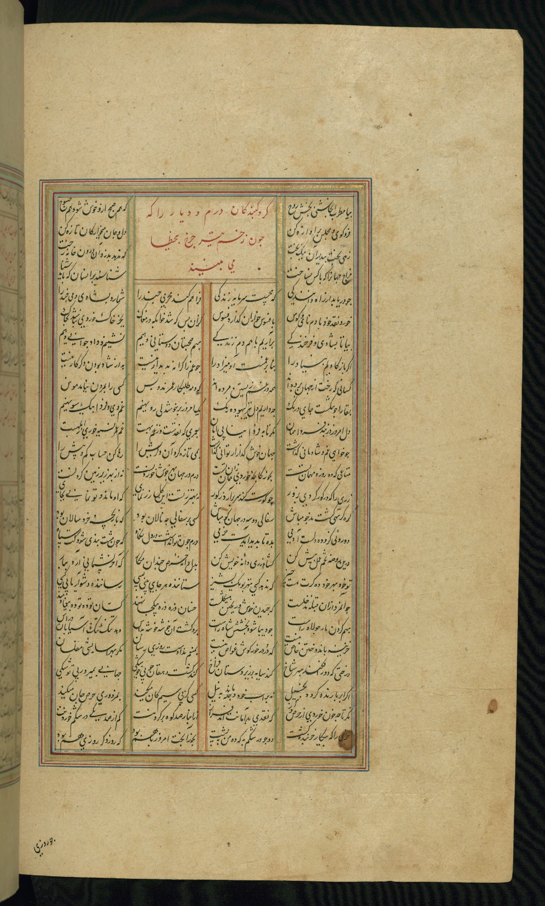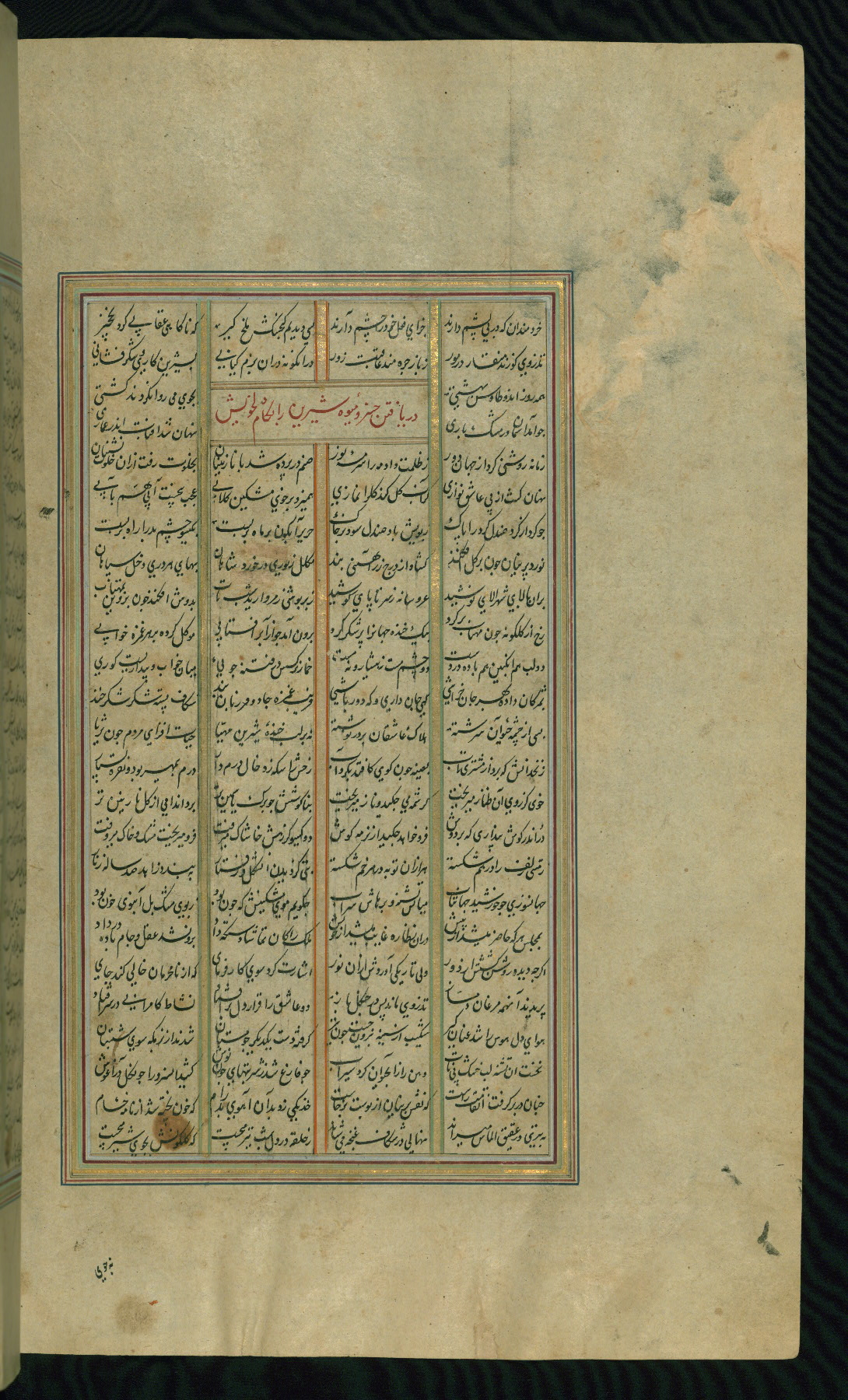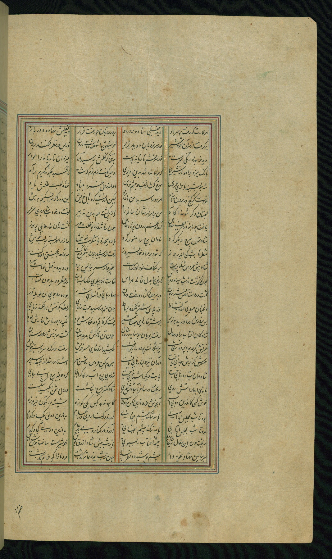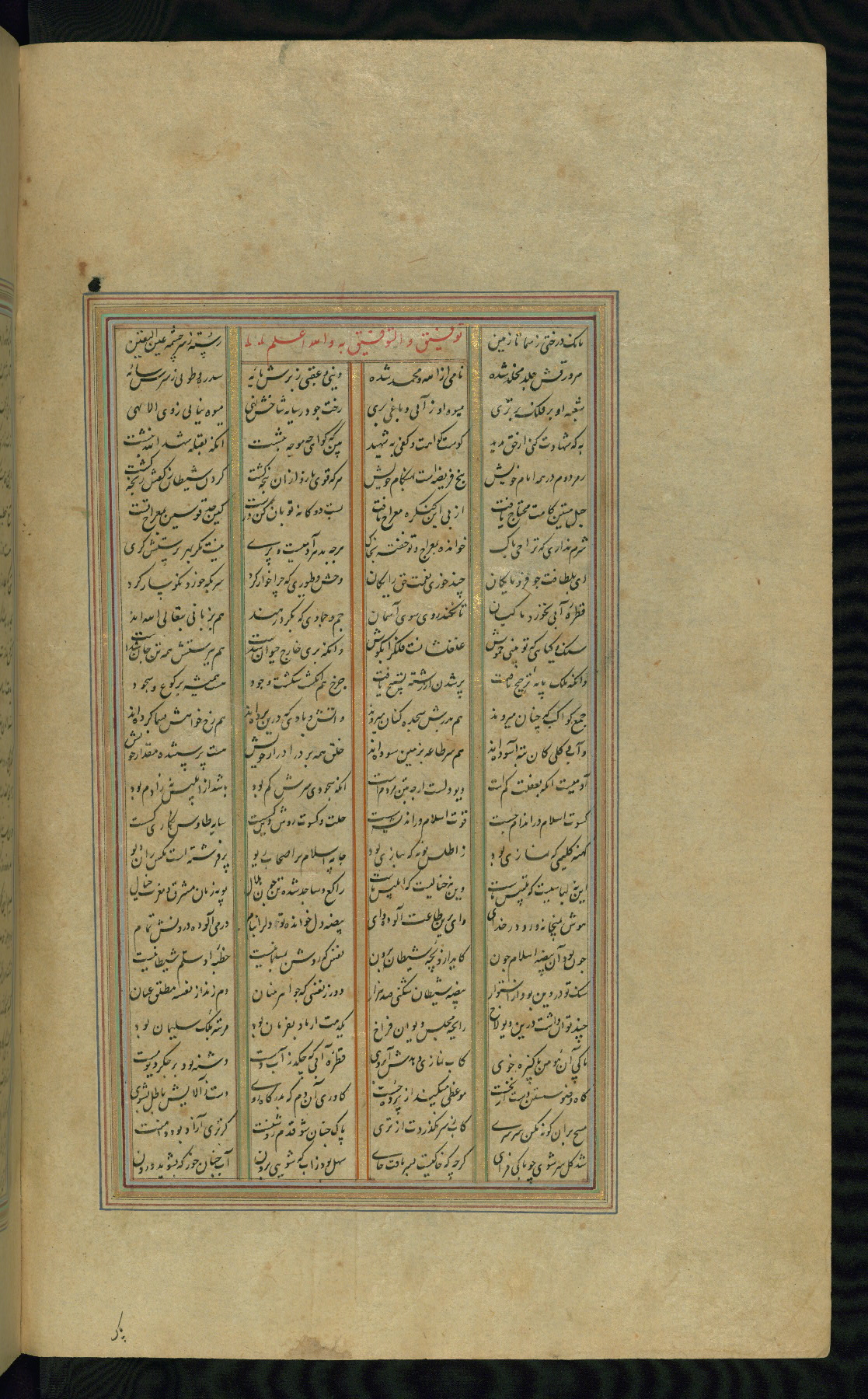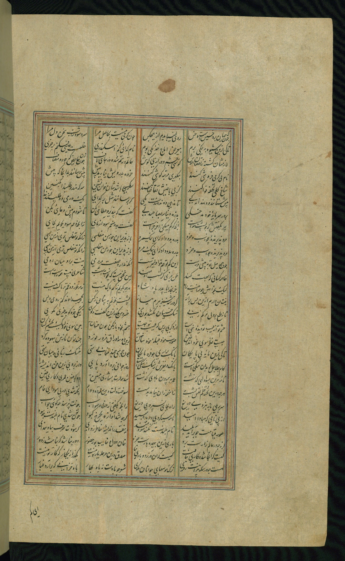 This illuminated and illustrated manuscript contains the Khamsah (quintet) and two historical poems (masnavi), Qirān-i saʿdayn and Nuh sipihr, by Amīr Khusraw Dihlavī (d. 725 AH / 1325 CE). The codex is dated 1017 AH / 1609 CE and was produced in Safavid Iran. All texts are written in black nastaʿlīq script with chapter headings in red. The manuscript opens with an illuminated and illustrated frontispiece of a hunting and court scene in the early Safavid style (fols. 1b-2a). The first text is Khamsah-i Dihlavī (fols. 2b-192a), which is introduced by an illuminated incipit and titlepiece with the title of the first poem of the quintet and the author's name. The second text is Qirān-i saʿdayn, a historical poem (masnavi) about the meeting of Sultan Muʿizz al-Dīn Kayqubād and his father, Nāṣir al-Din Bughrā Khān, on the banks of the Sarjū in Oudh. It is also introduced with an illuminated incipit and titlepiece (fol. 193b). The third text is Nuh sipihr, a historical poem (masnavi) describing the glories of Sultan Quṭb al-Dīn Mubārak Shāh Khaljī’s time, introduced with an illuminated incipit and headpiece (fol. 223b). The dark brown leather binding is original to the manuscript.