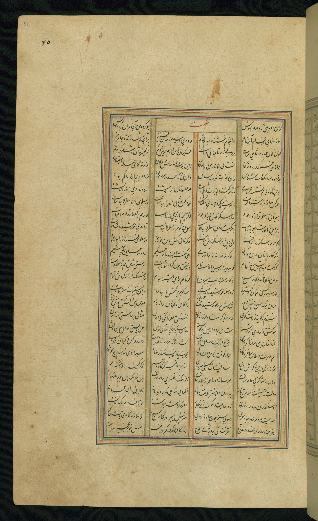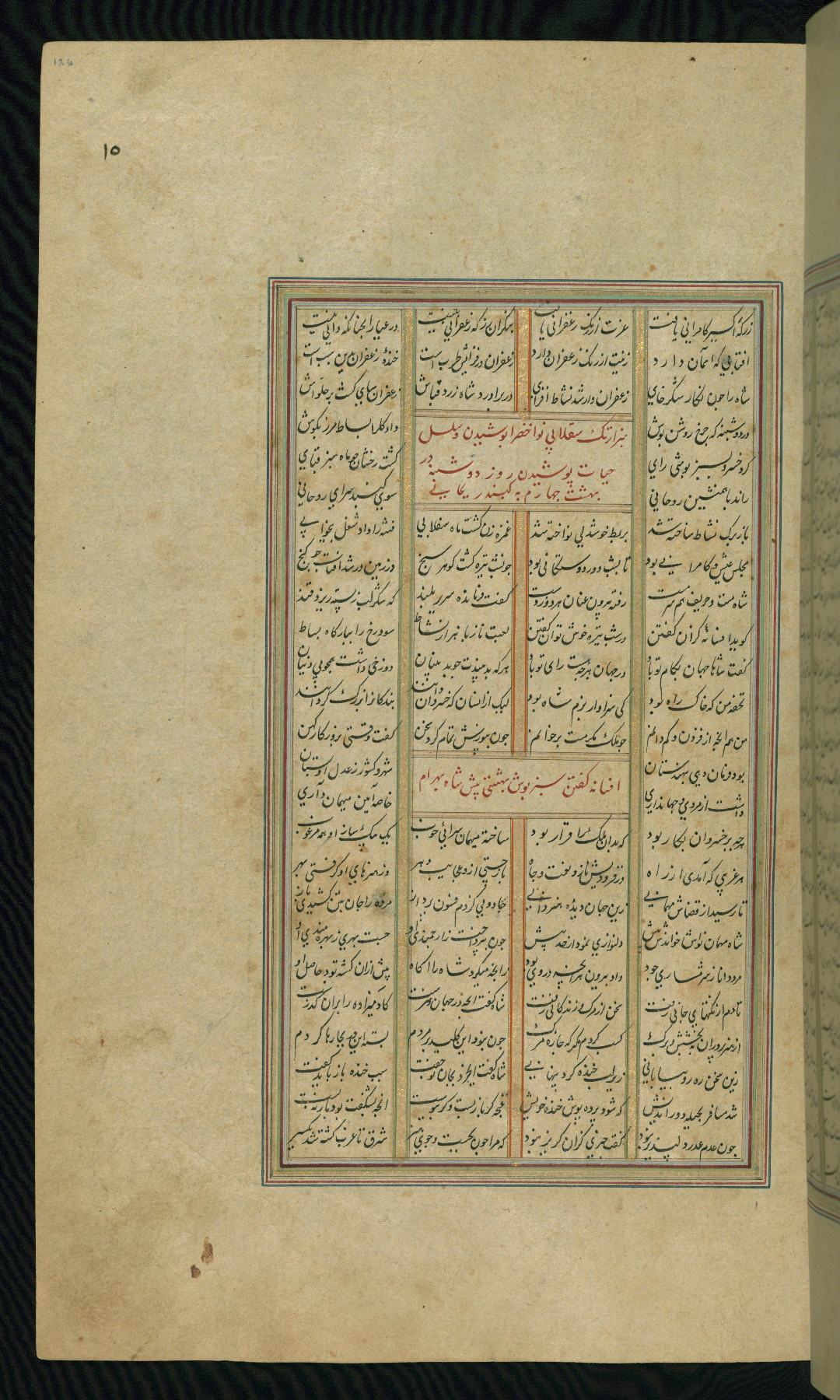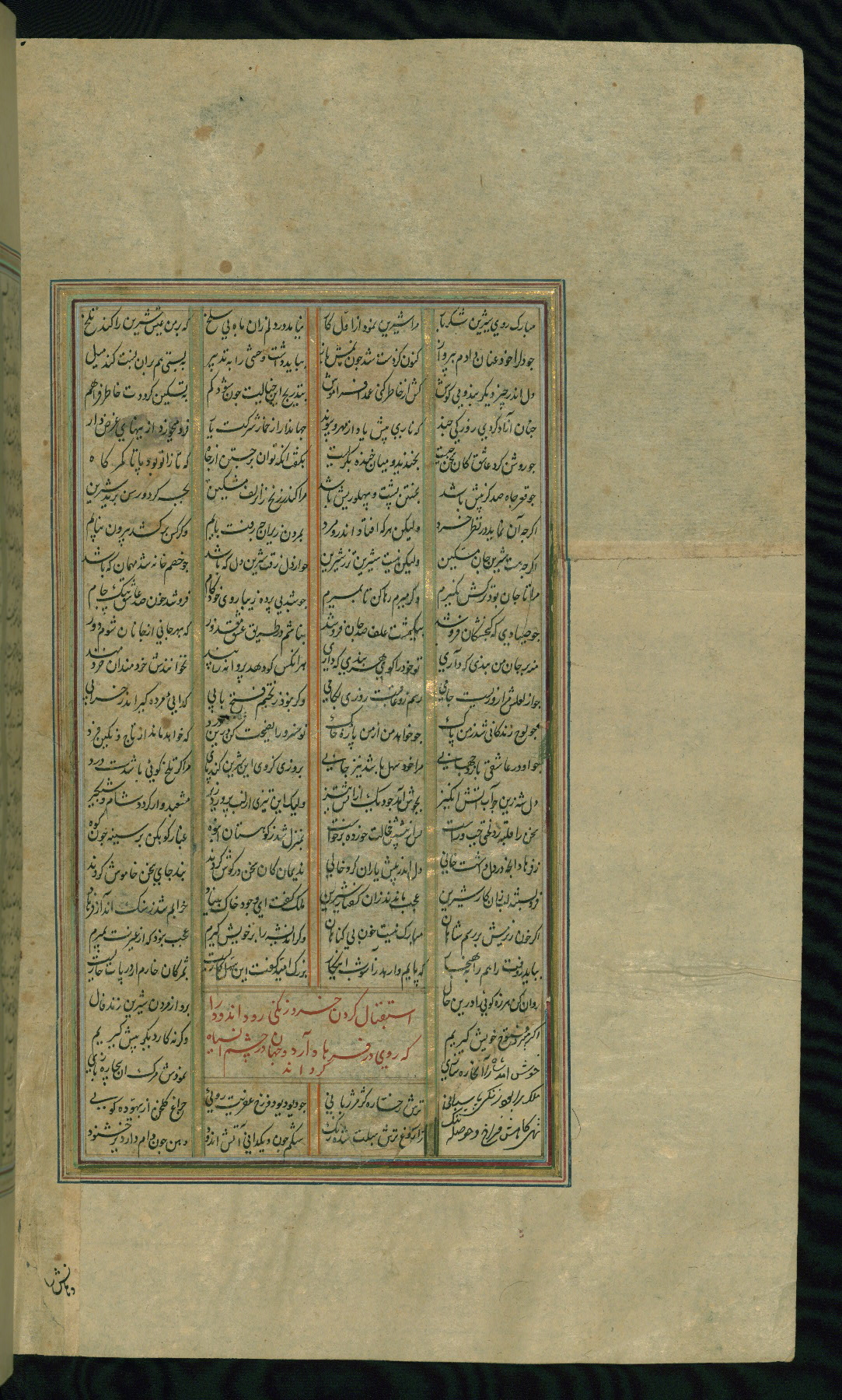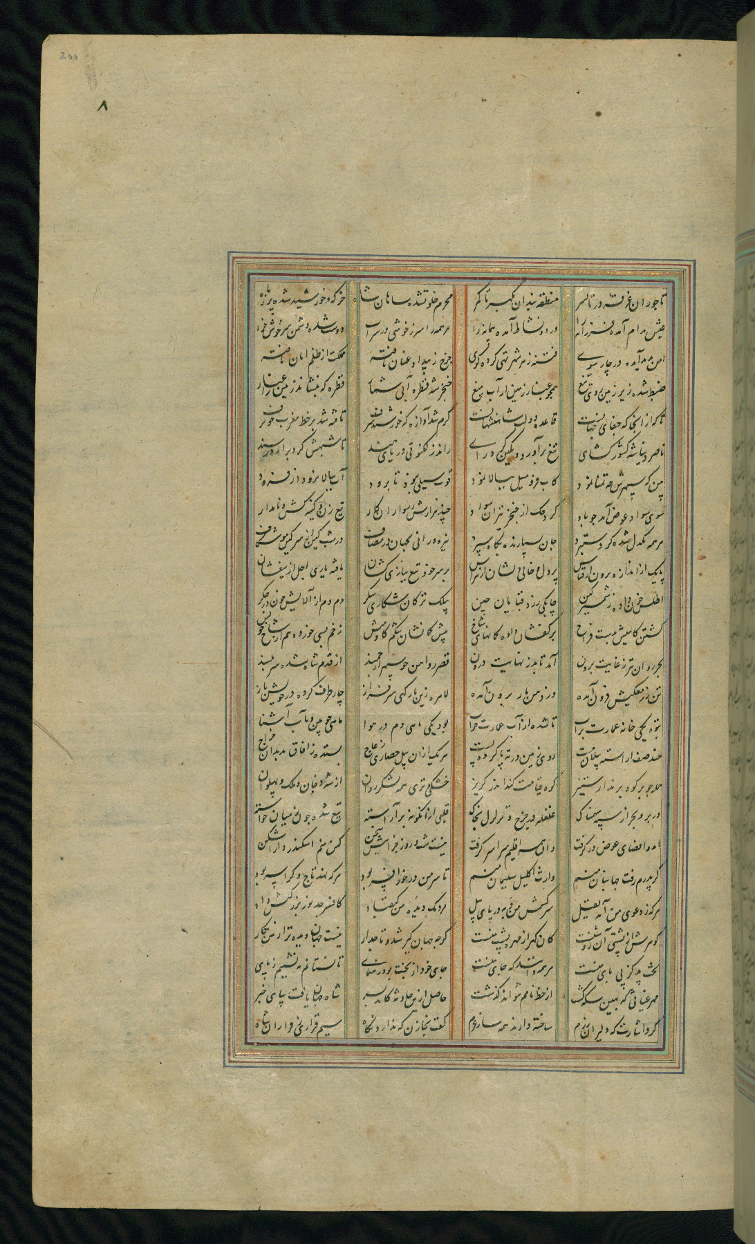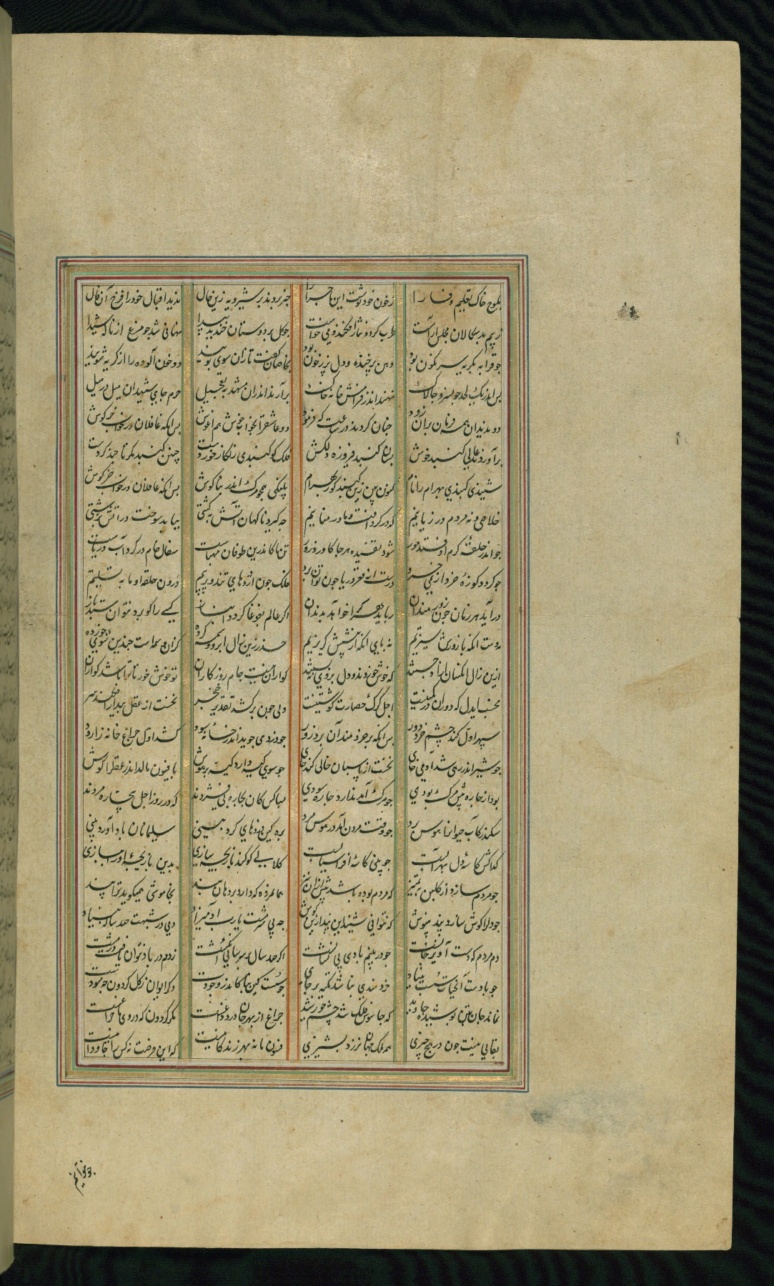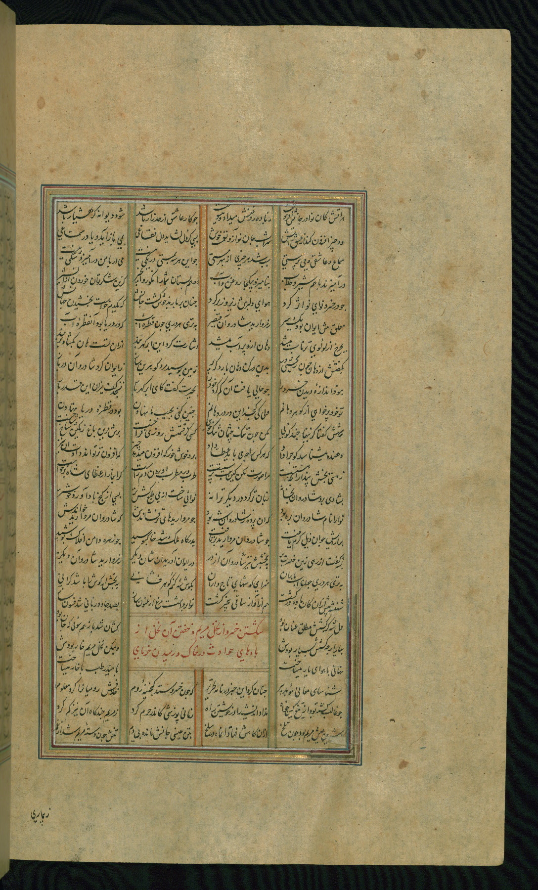 This illuminated and illustrated manuscript contains the Khamsah (quintet) and two historical poems (masnavi), Qirān-i saʿdayn and Nuh sipihr, by Amīr Khusraw Dihlavī (d. 725 AH / 1325 CE). The codex is dated 1017 AH / 1609 CE and was produced in Safavid Iran. All texts are written in black nastaʿlīq script with chapter headings in red. The manuscript opens with an illuminated and illustrated frontispiece of a hunting and court scene in the early Safavid style (fols. 1b-2a). The first text is Khamsah-i Dihlavī (fols. 2b-192a), which is introduced by an illuminated incipit and titlepiece with the title of the first poem of the quintet and the author's name. The second text is Qirān-i saʿdayn, a historical poem (masnavi) about the meeting of Sultan Muʿizz al-Dīn Kayqubād and his father, Nāṣir al-Din Bughrā Khān, on the banks of the Sarjū in Oudh. It is also introduced with an illuminated incipit and titlepiece (fol. 193b). The third text is Nuh sipihr, a historical poem (masnavi) describing the glories of Sultan Quṭb al-Dīn Mubārak Shāh Khaljī’s time, introduced with an illuminated incipit and headpiece (fol. 223b). The dark brown leather binding is original to the manuscript.