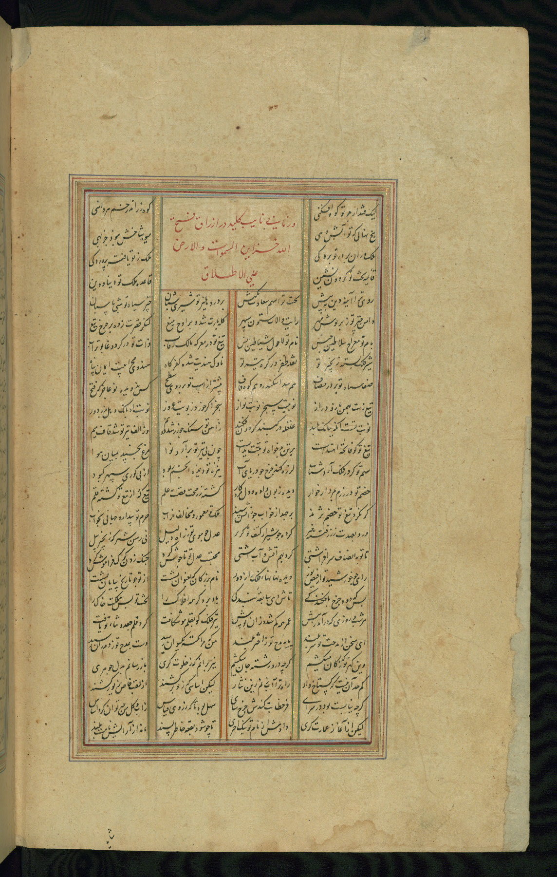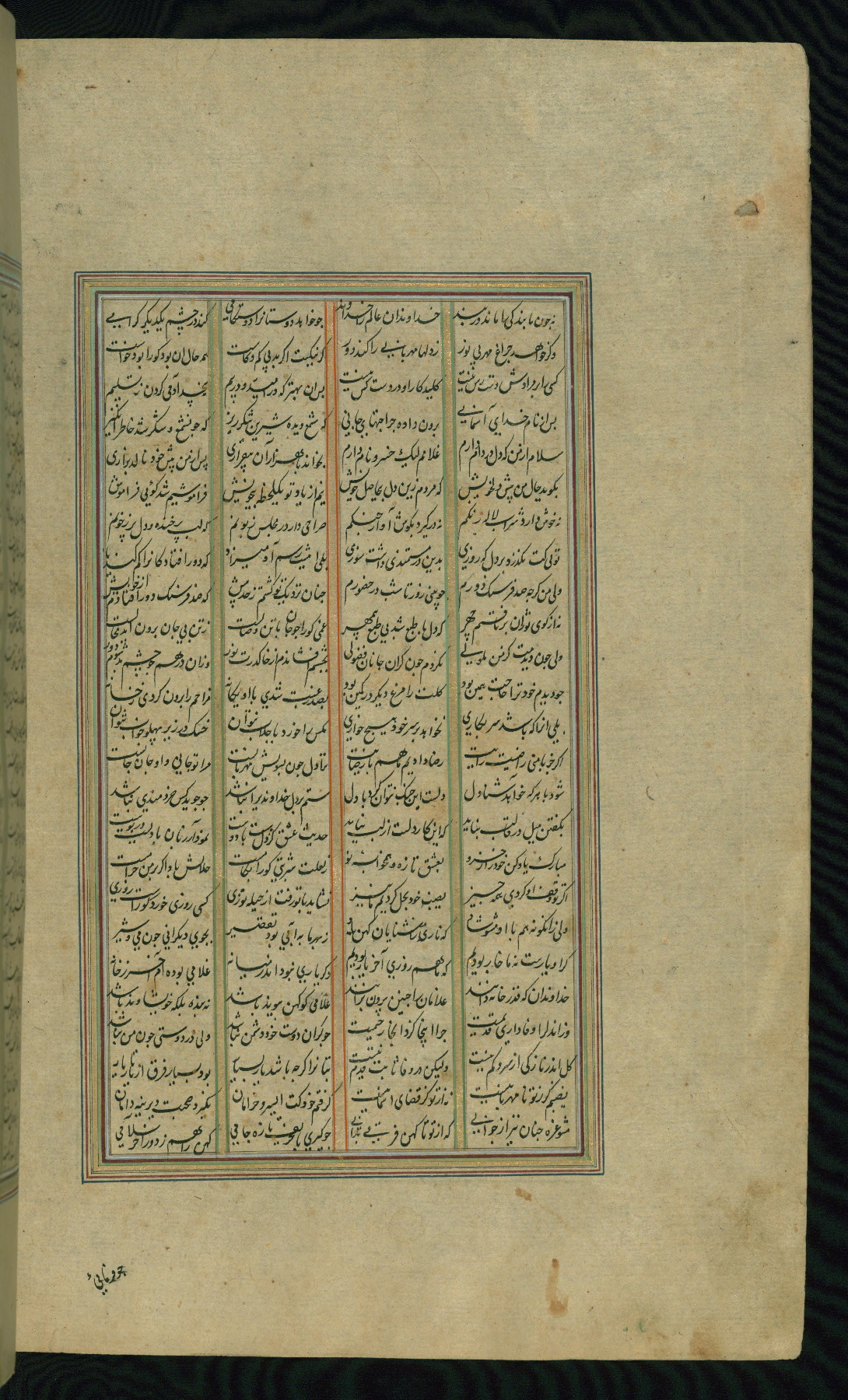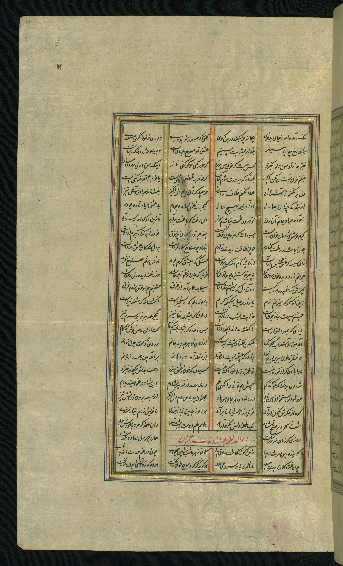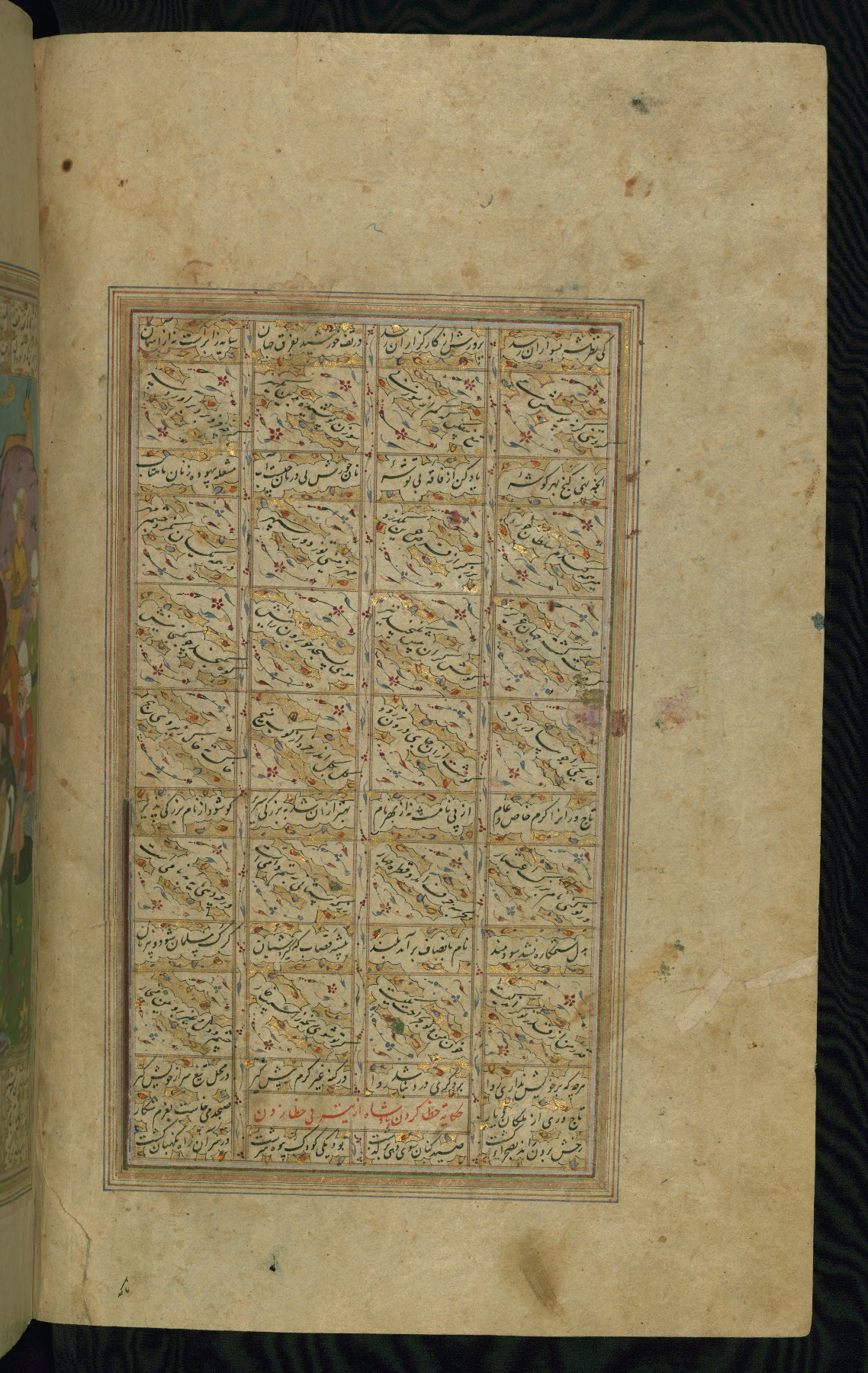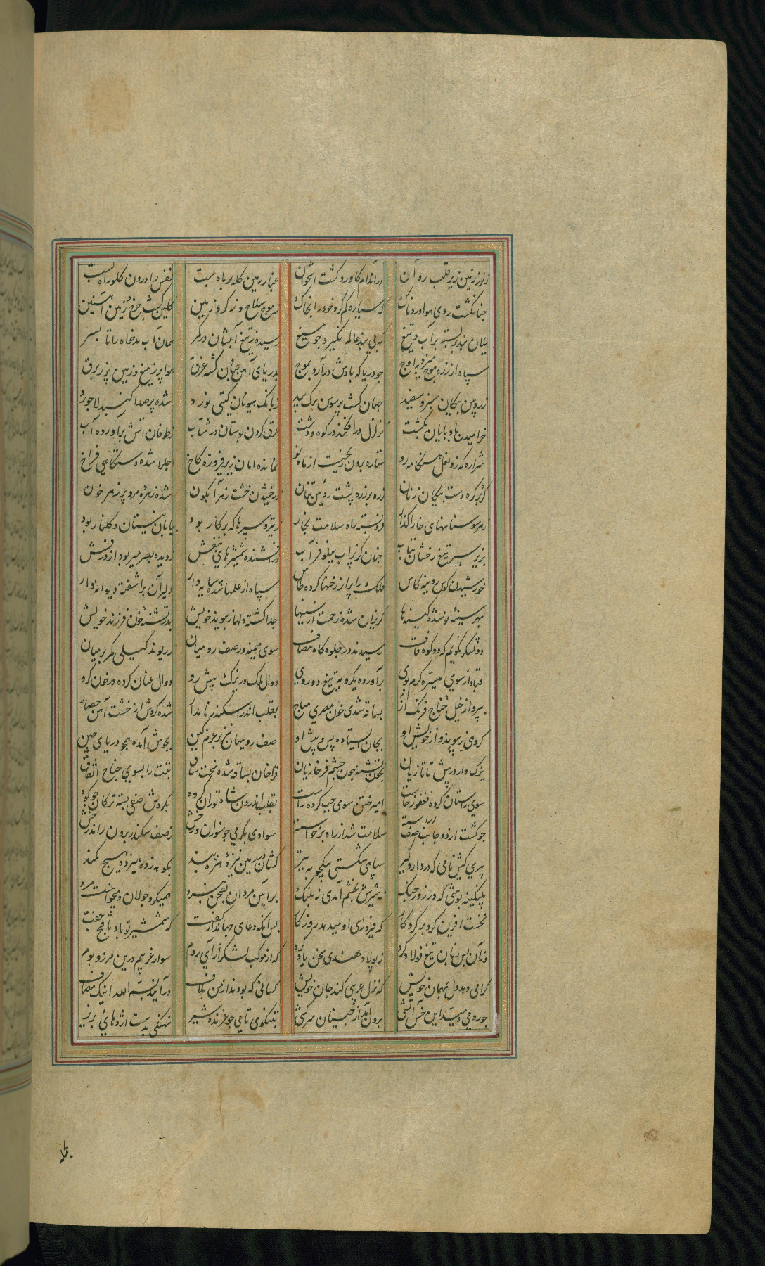 This illuminated and illustrated manuscript contains the Khamsah (quintet) and two historical poems (masnavi), Qirān-i saʿdayn and Nuh sipihr, by Amīr Khusraw Dihlavī (d. 725 AH / 1325 CE). The codex is dated 1017 AH / 1609 CE and was produced in Safavid Iran. All texts are written in black nastaʿlīq script with chapter headings in red. The manuscript opens with an illuminated and illustrated frontispiece of a hunting and court scene in the early Safavid style (fols. 1b-2a). The first text is Khamsah-i Dihlavī (fols. 2b-192a), which is introduced by an illuminated incipit and titlepiece with the title of the first poem of the quintet and the author's name. The second text is Qirān-i saʿdayn, a historical poem (masnavi) about the meeting of Sultan Muʿizz al-Dīn Kayqubād and his father, Nāṣir al-Din Bughrā Khān, on the banks of the Sarjū in Oudh. It is also introduced with an illuminated incipit and titlepiece (fol. 193b). The third text is Nuh sipihr, a historical poem (masnavi) describing the glories of Sultan Quṭb al-Dīn Mubārak Shāh Khaljī’s time, introduced with an illuminated incipit and headpiece (fol. 223b). The dark brown leather binding is original to the manuscript.