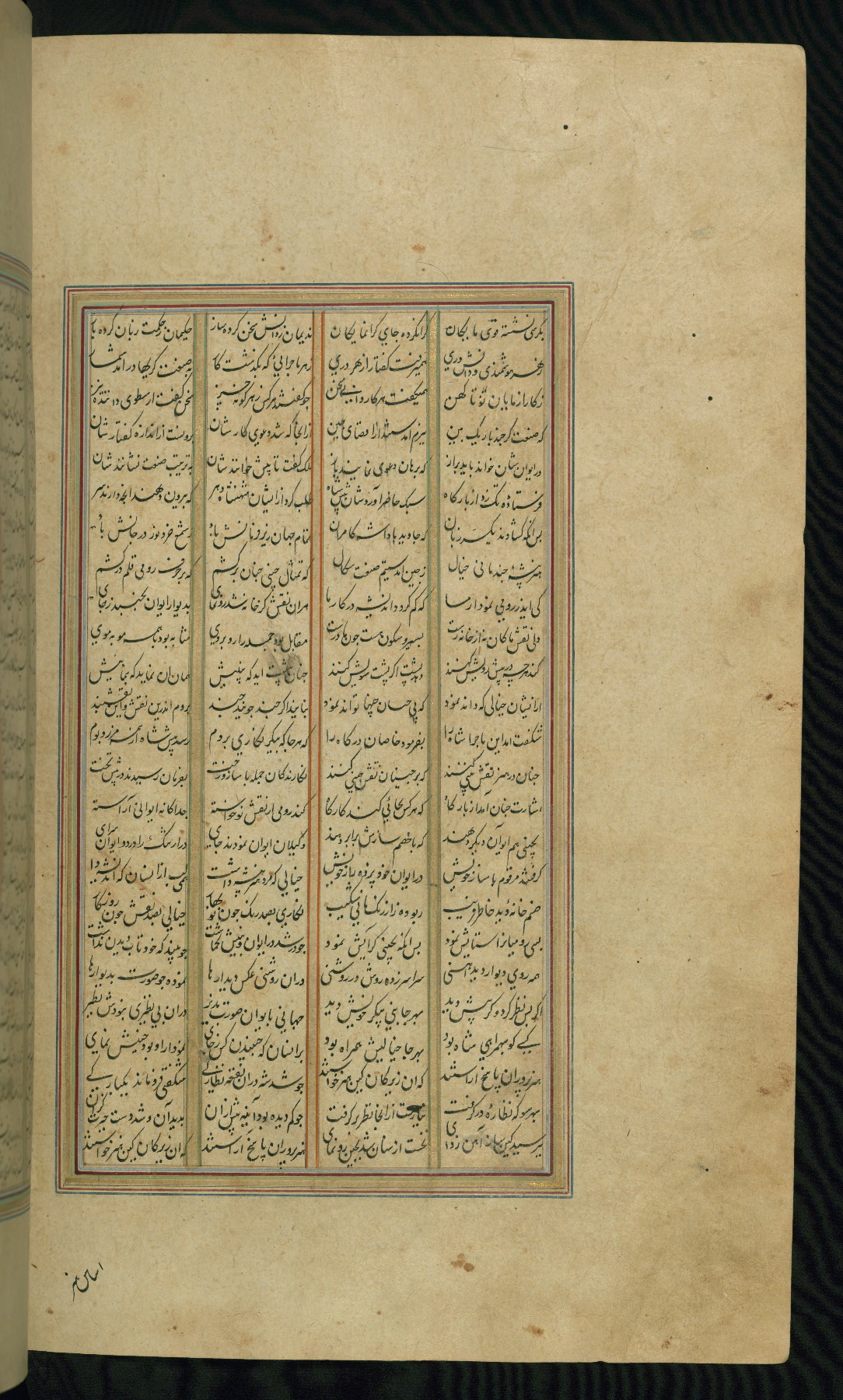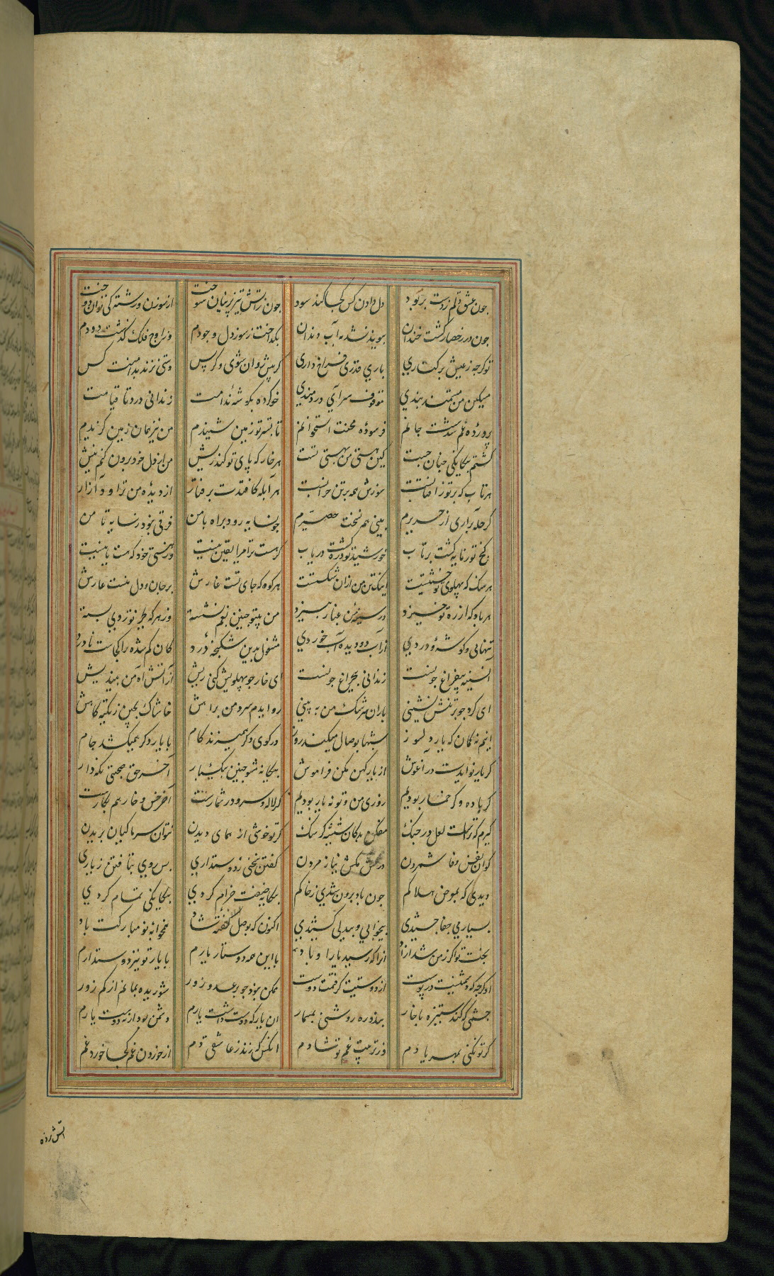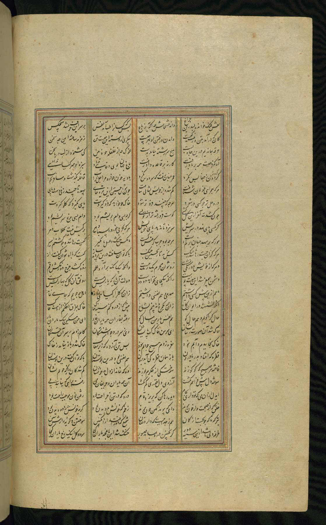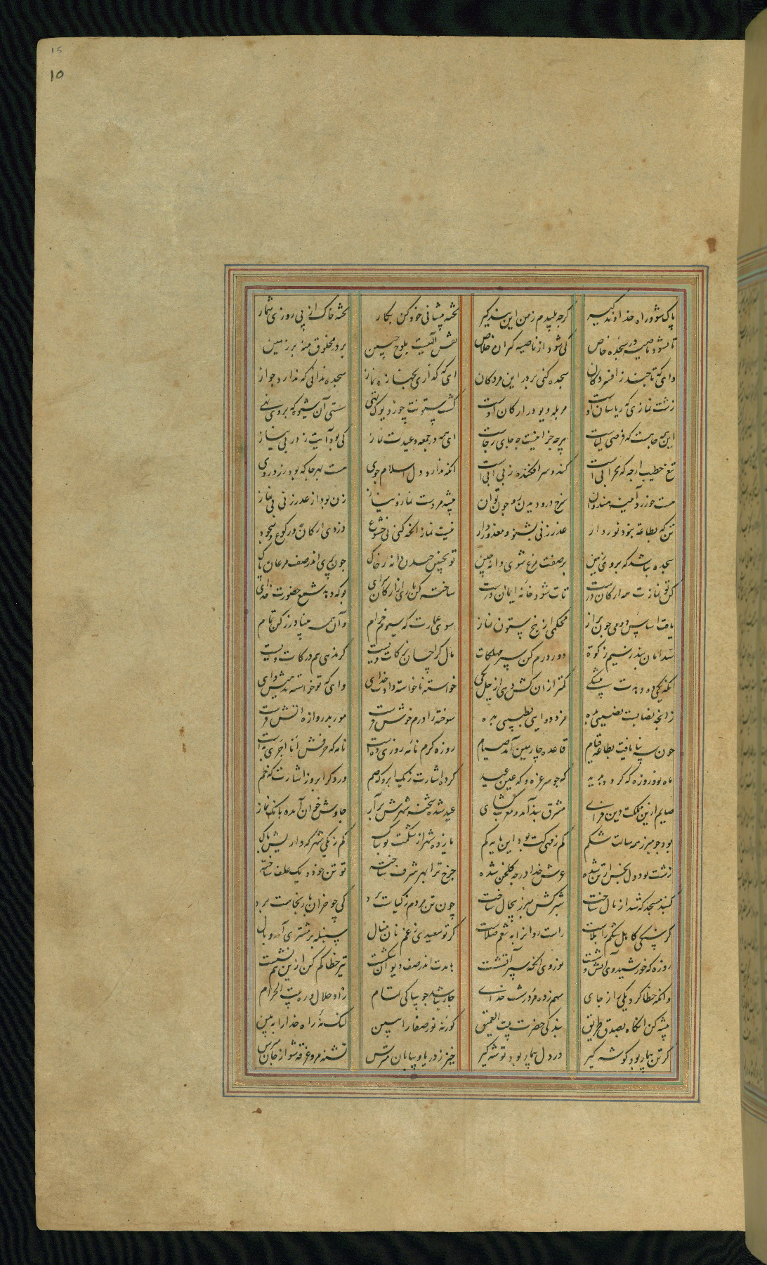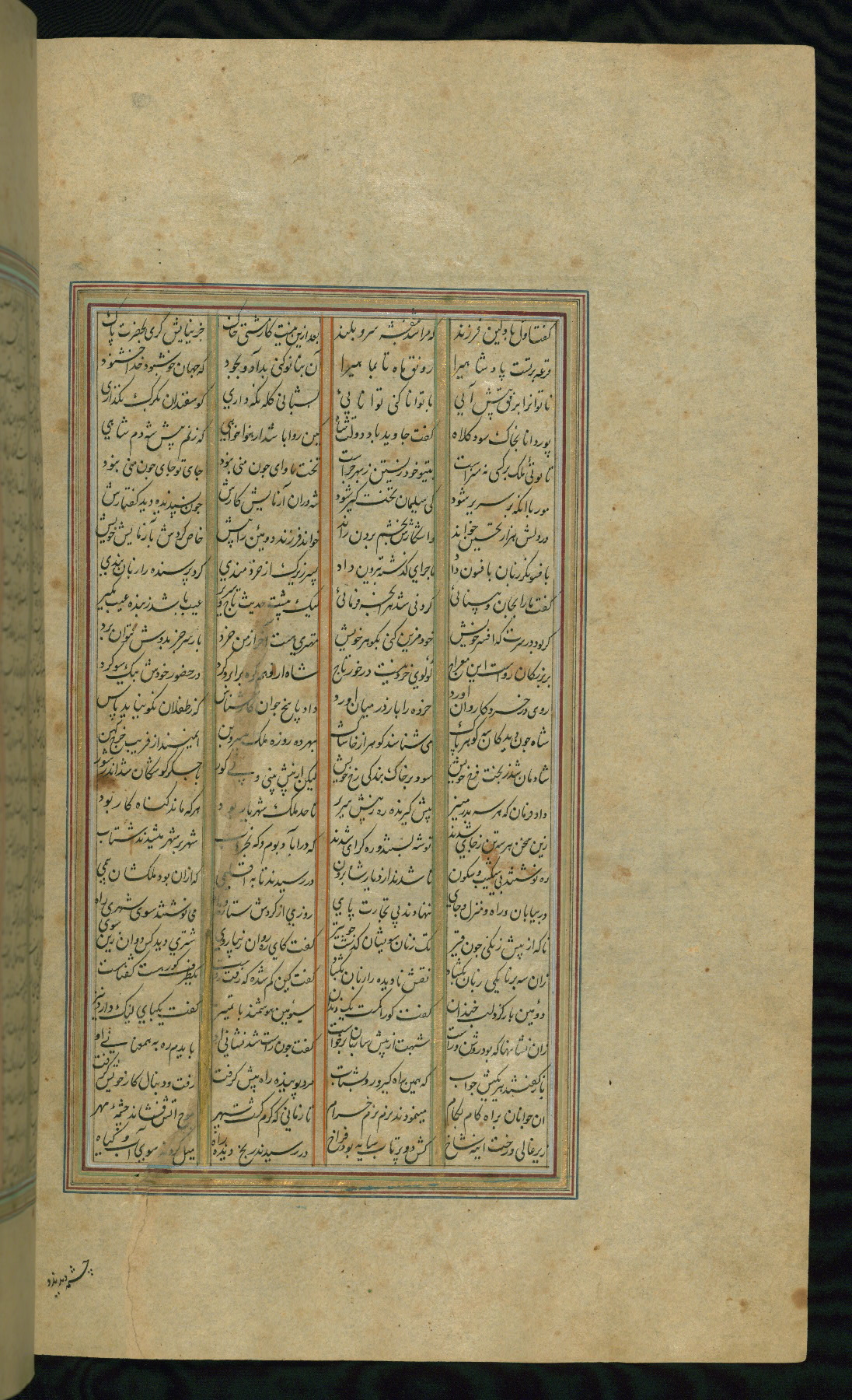 This illuminated and illustrated manuscript contains the Khamsah (quintet) and two historical poems (masnavi), Qirān-i saʿdayn and Nuh sipihr, by Amīr Khusraw Dihlavī (d. 725 AH / 1325 CE). The codex is dated 1017 AH / 1609 CE and was produced in Safavid Iran. All texts are written in black nastaʿlīq script with chapter headings in red. The manuscript opens with an illuminated and illustrated frontispiece of a hunting and court scene in the early Safavid style (fols. 1b-2a). The first text is Khamsah-i Dihlavī (fols. 2b-192a), which is introduced by an illuminated incipit and titlepiece with the title of the first poem of the quintet and the author's name. The second text is Qirān-i saʿdayn, a historical poem (masnavi) about the meeting of Sultan Muʿizz al-Dīn Kayqubād and his father, Nāṣir al-Din Bughrā Khān, on the banks of the Sarjū in Oudh. It is also introduced with an illuminated incipit and titlepiece (fol. 193b). The third text is Nuh sipihr, a historical poem (masnavi) describing the glories of Sultan Quṭb al-Dīn Mubārak Shāh Khaljī’s time, introduced with an illuminated incipit and headpiece (fol. 223b). The dark brown leather binding is original to the manuscript.