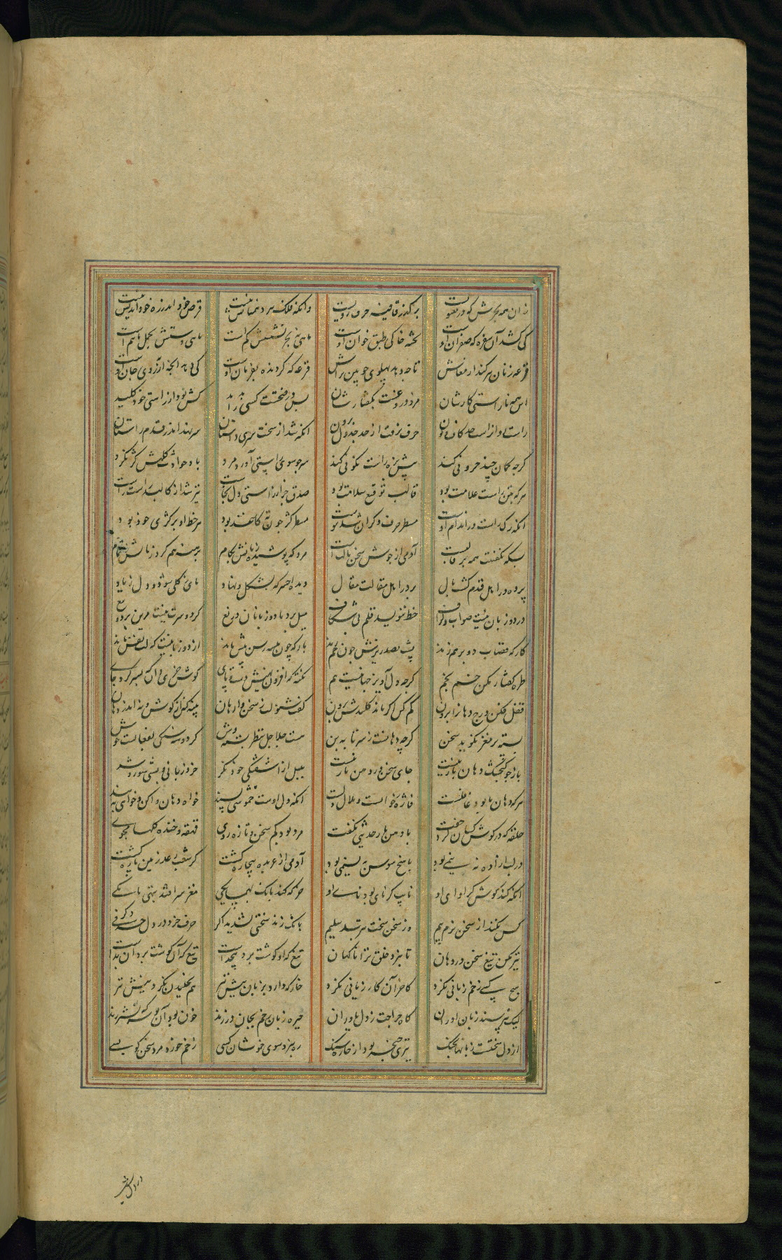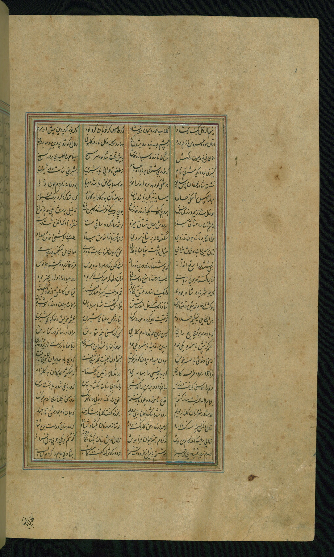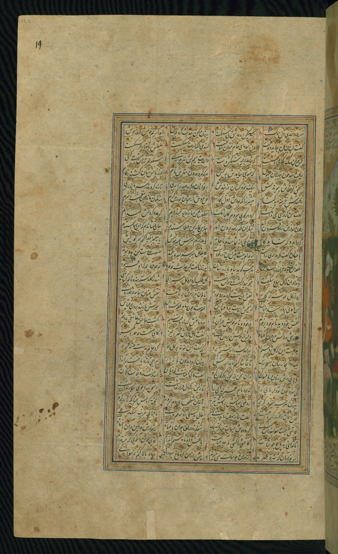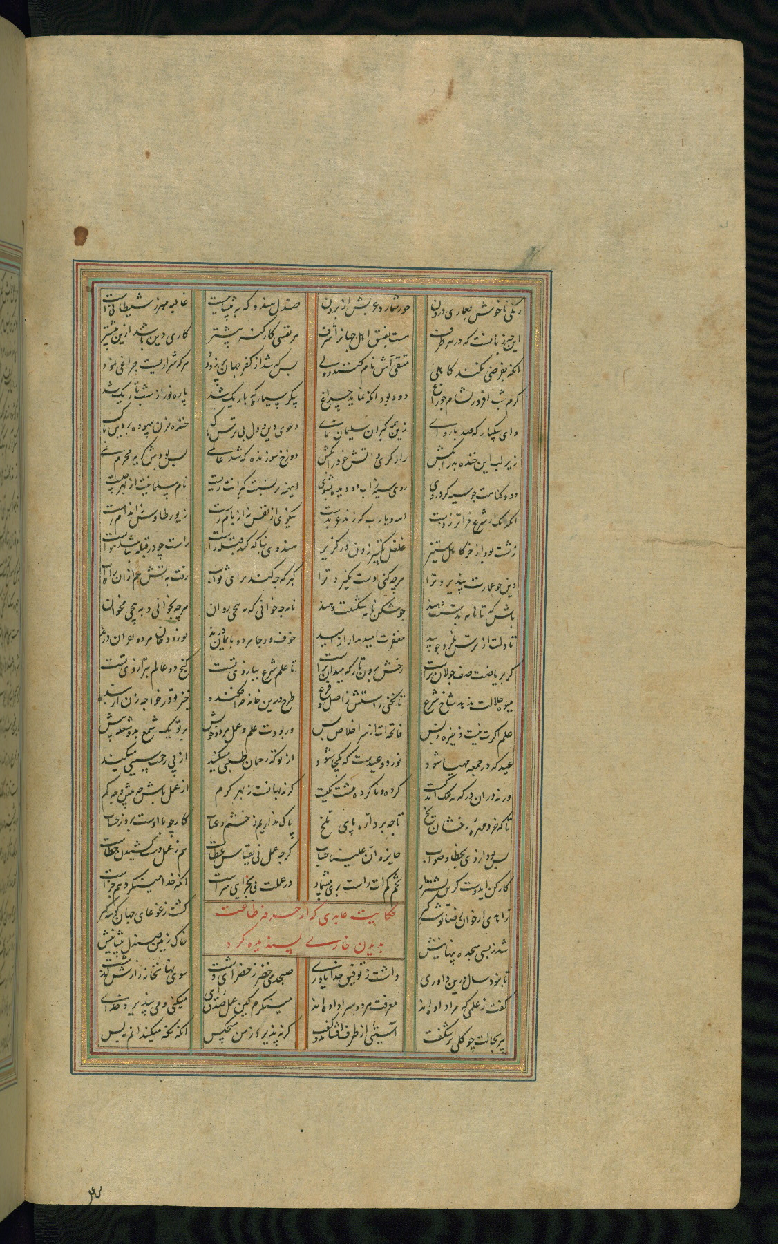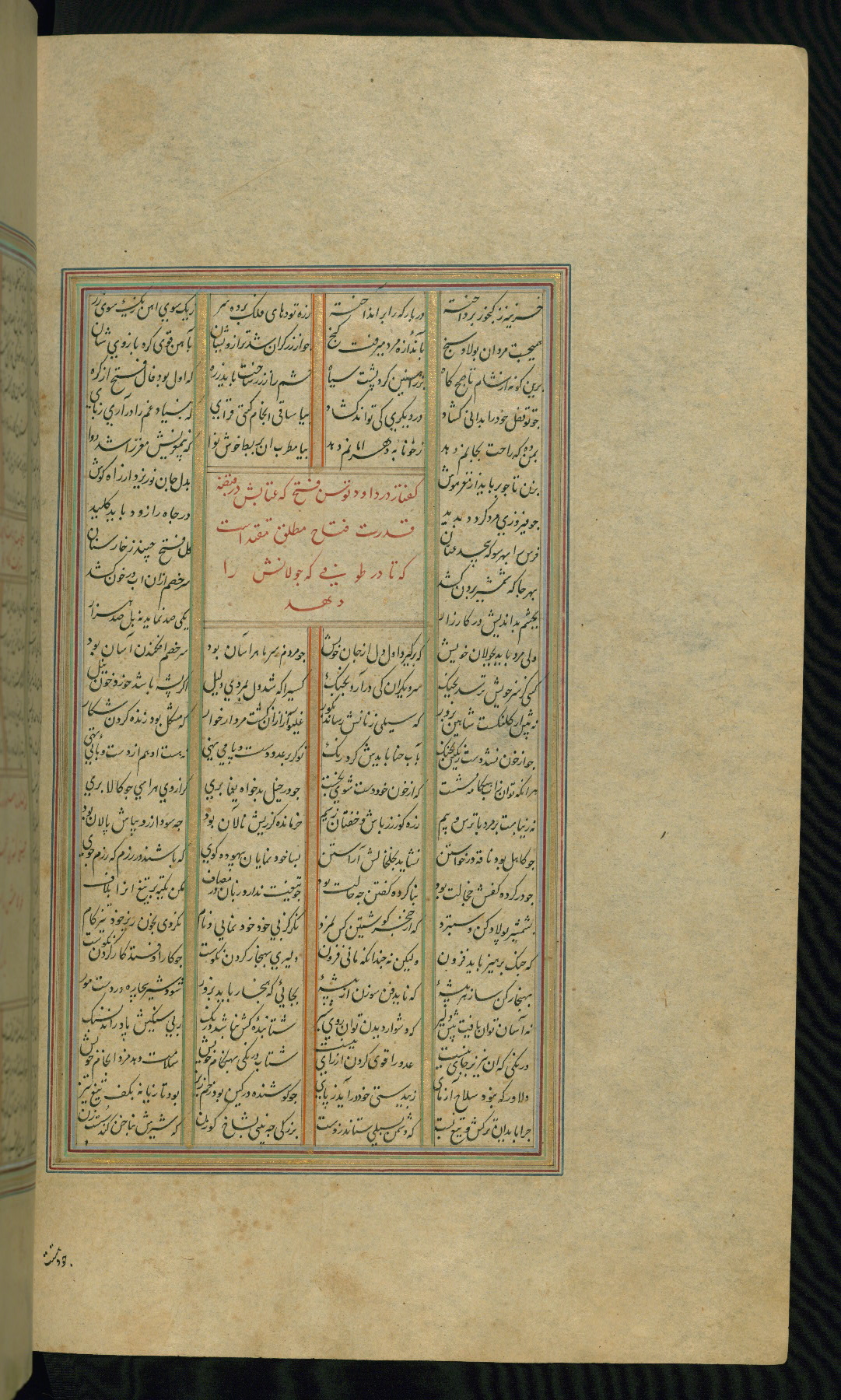 This illuminated and illustrated manuscript contains the Khamsah (quintet) and two historical poems (masnavi), Qirān-i saʿdayn and Nuh sipihr, by Amīr Khusraw Dihlavī (d. 725 AH / 1325 CE). The codex is dated 1017 AH / 1609 CE and was produced in Safavid Iran. All texts are written in black nastaʿlīq script with chapter headings in red. The manuscript opens with an illuminated and illustrated frontispiece of a hunting and court scene in the early Safavid style (fols. 1b-2a). The first text is Khamsah-i Dihlavī (fols. 2b-192a), which is introduced by an illuminated incipit and titlepiece with the title of the first poem of the quintet and the author's name. The second text is Qirān-i saʿdayn, a historical poem (masnavi) about the meeting of Sultan Muʿizz al-Dīn Kayqubād and his father, Nāṣir al-Din Bughrā Khān, on the banks of the Sarjū in Oudh. It is also introduced with an illuminated incipit and titlepiece (fol. 193b). The third text is Nuh sipihr, a historical poem (masnavi) describing the glories of Sultan Quṭb al-Dīn Mubārak Shāh Khaljī’s time, introduced with an illuminated incipit and headpiece (fol. 223b). The dark brown leather binding is original to the manuscript.