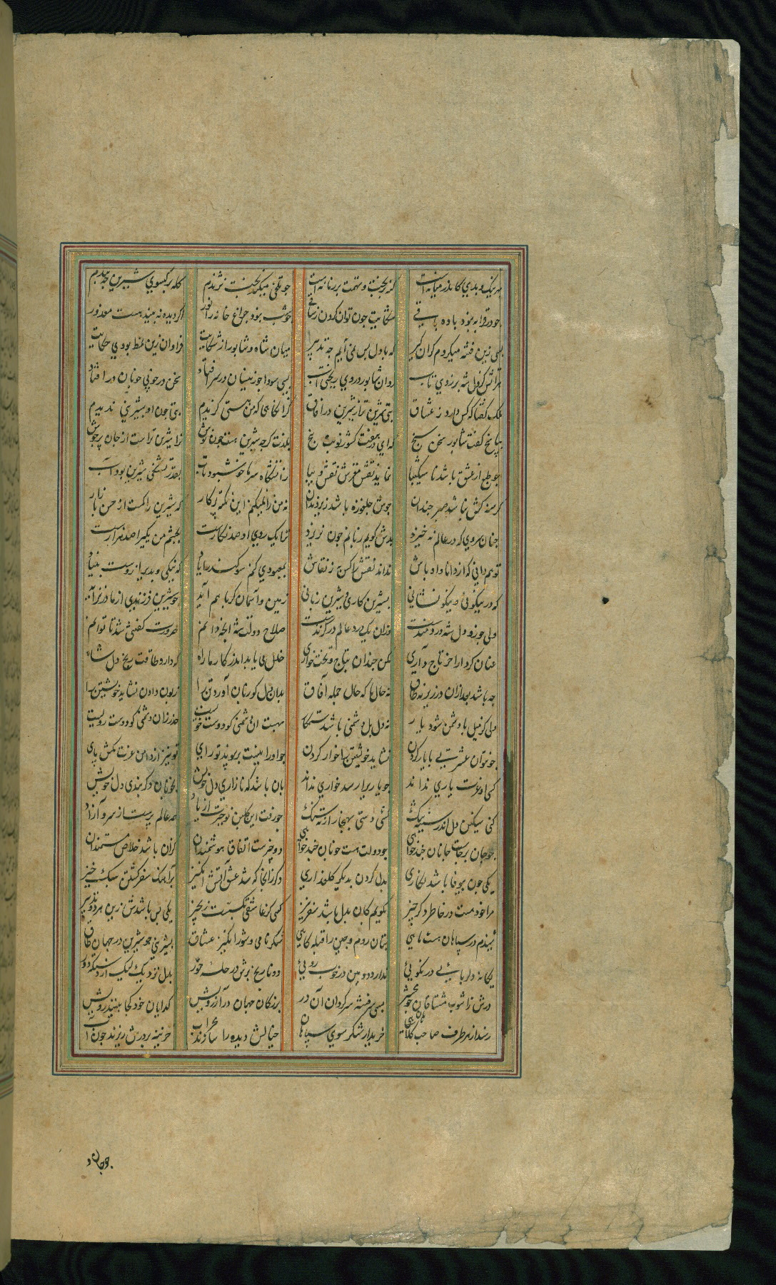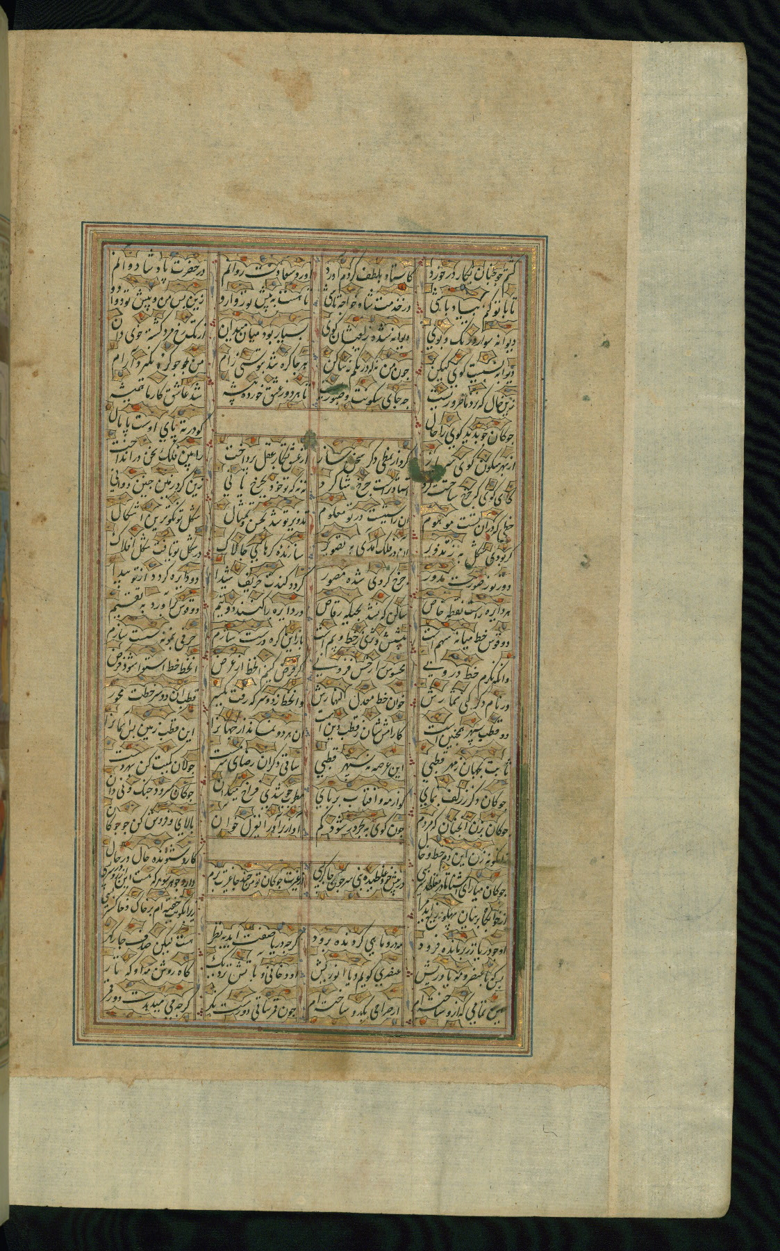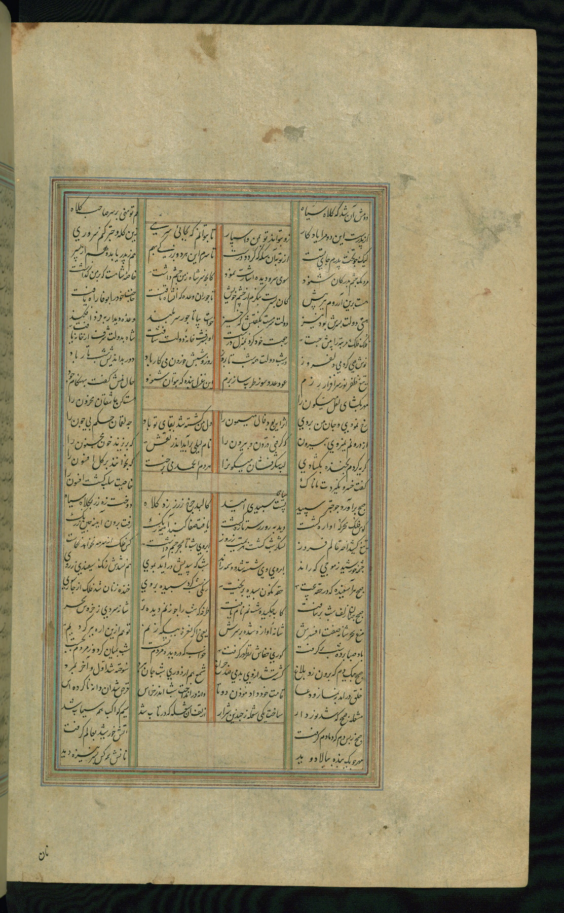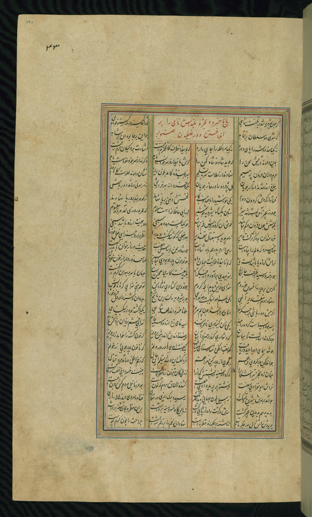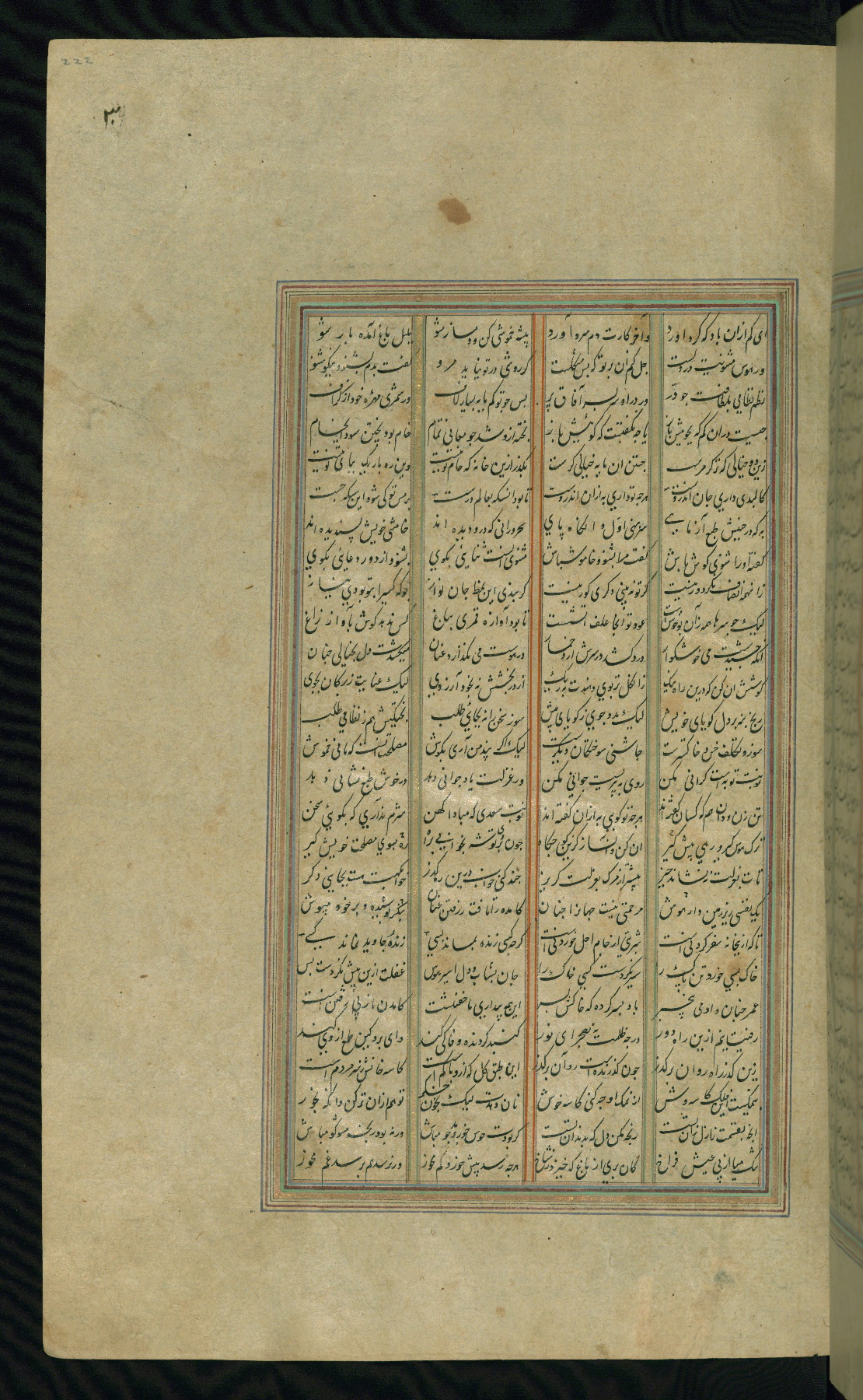 This illuminated and illustrated manuscript contains the Khamsah (quintet) and two historical poems (masnavi), Qirān-i saʿdayn and Nuh sipihr, by Amīr Khusraw Dihlavī (d. 725 AH / 1325 CE). The codex is dated 1017 AH / 1609 CE and was produced in Safavid Iran. All texts are written in black nastaʿlīq script with chapter headings in red. The manuscript opens with an illuminated and illustrated frontispiece of a hunting and court scene in the early Safavid style (fols. 1b-2a). The first text is Khamsah-i Dihlavī (fols. 2b-192a), which is introduced by an illuminated incipit and titlepiece with the title of the first poem of the quintet and the author's name. The second text is Qirān-i saʿdayn, a historical poem (masnavi) about the meeting of Sultan Muʿizz al-Dīn Kayqubād and his father, Nāṣir al-Din Bughrā Khān, on the banks of the Sarjū in Oudh. It is also introduced with an illuminated incipit and titlepiece (fol. 193b). The third text is Nuh sipihr, a historical poem (masnavi) describing the glories of Sultan Quṭb al-Dīn Mubārak Shāh Khaljī’s time, introduced with an illuminated incipit and headpiece (fol. 223b). The dark brown leather binding is original to the manuscript.