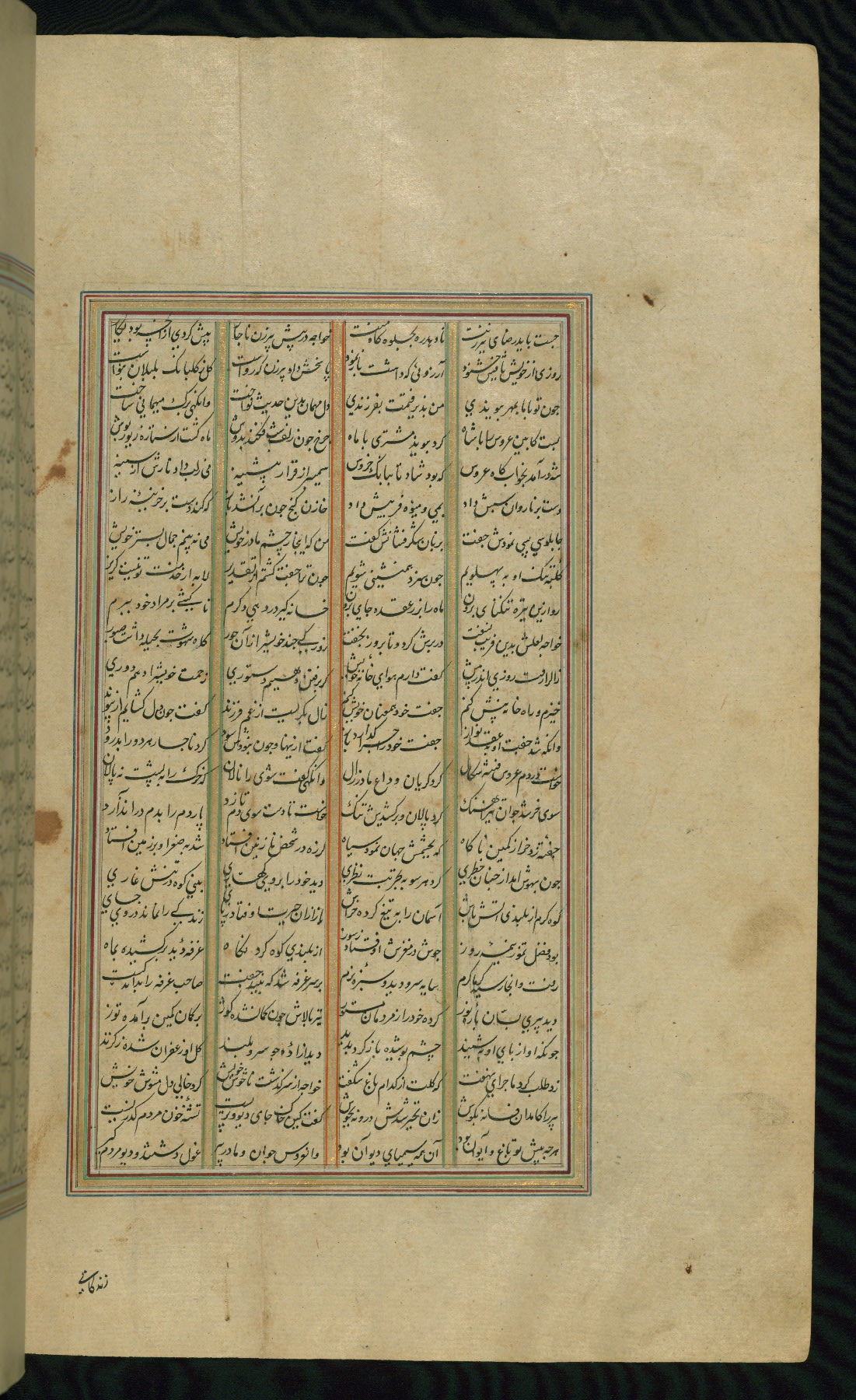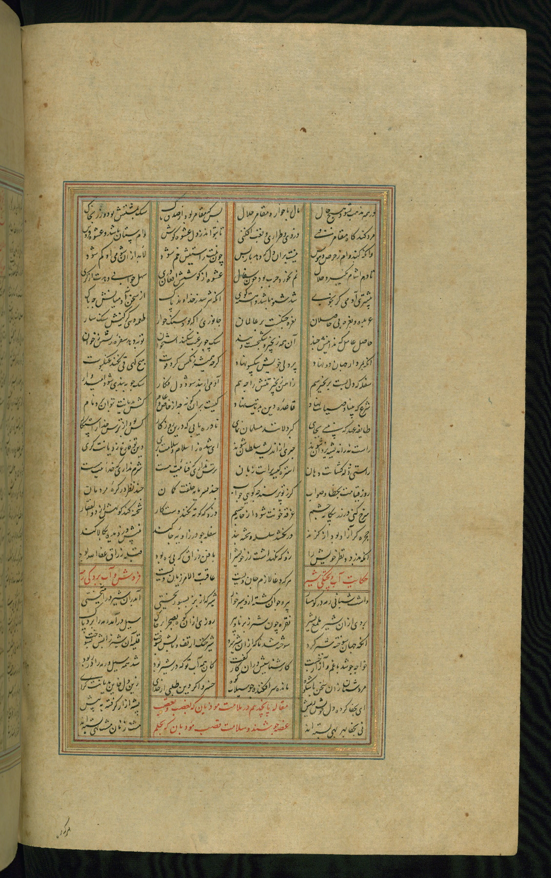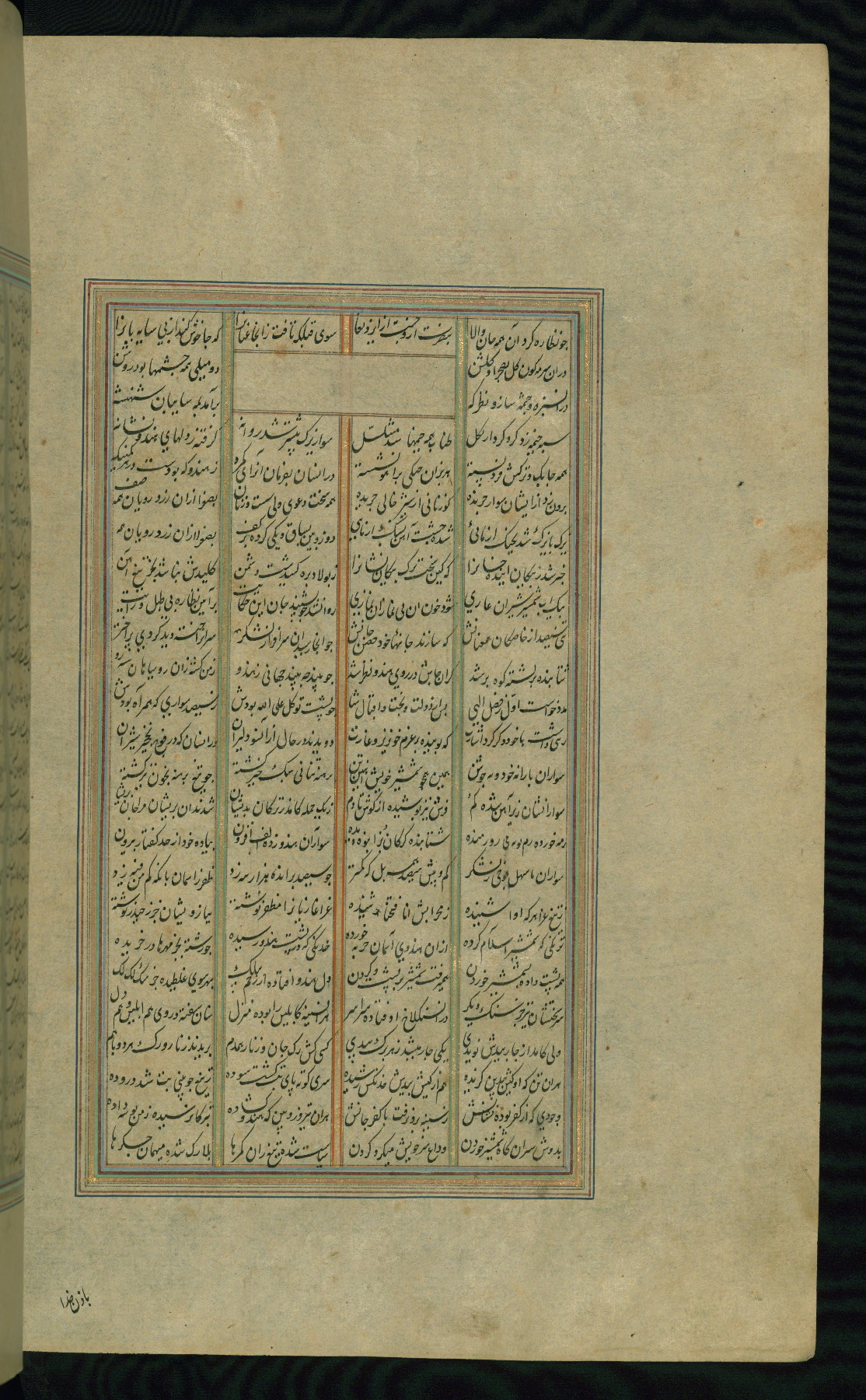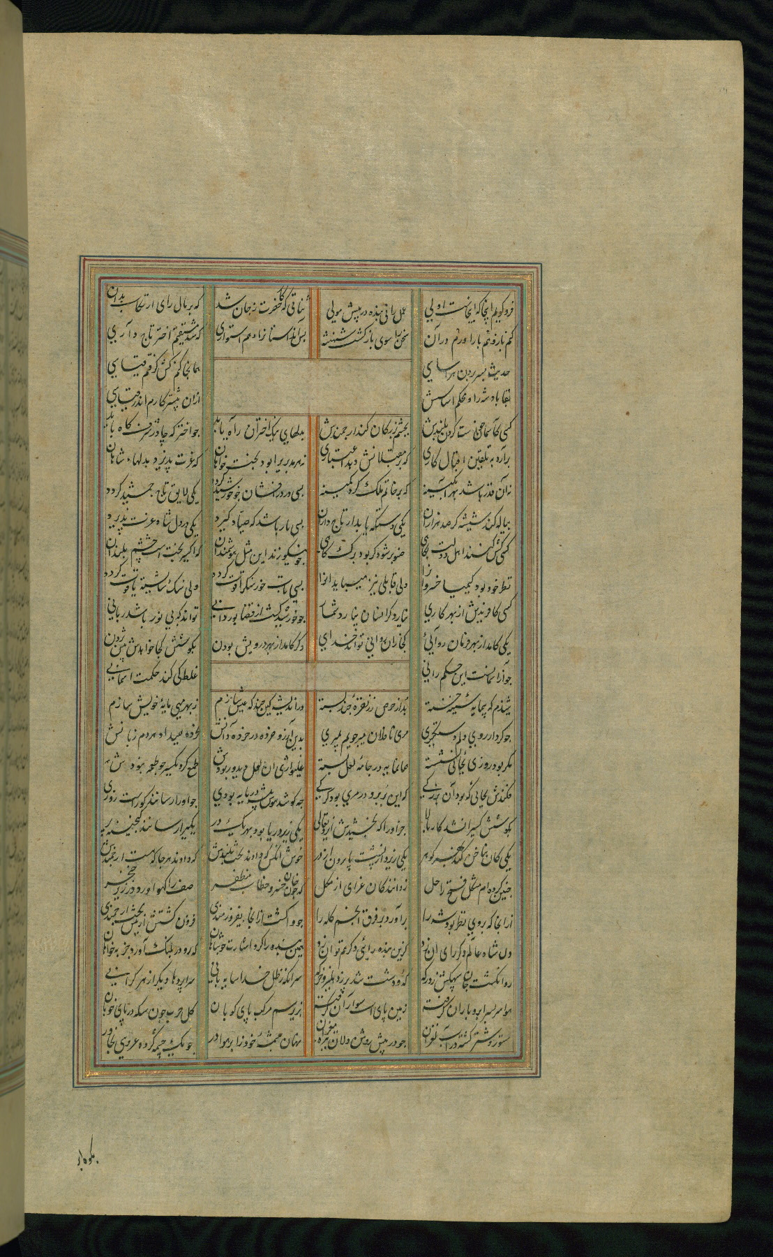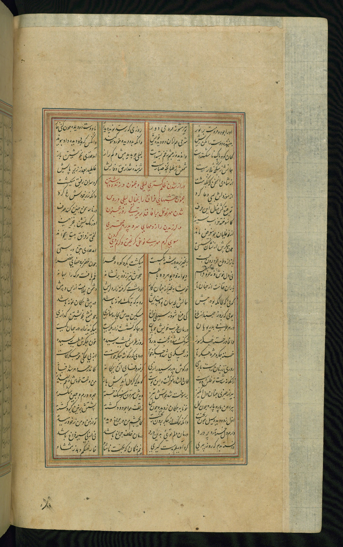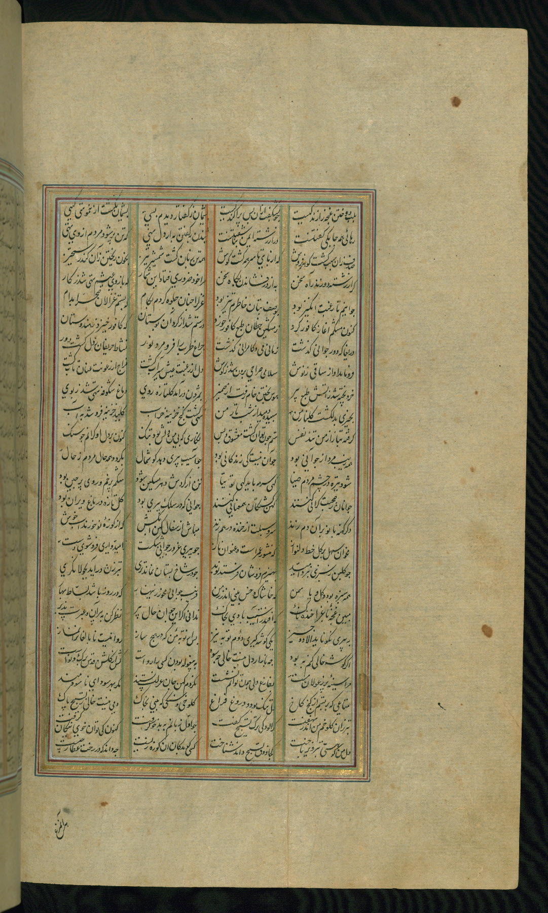 This illuminated and illustrated manuscript contains the Khamsah (quintet) and two historical poems (masnavi), Qirān-i saʿdayn and Nuh sipihr, by Amīr Khusraw Dihlavī (d. 725 AH / 1325 CE). The codex is dated 1017 AH / 1609 CE and was produced in Safavid Iran. All texts are written in black nastaʿlīq script with chapter headings in red. The manuscript opens with an illuminated and illustrated frontispiece of a hunting and court scene in the early Safavid style (fols. 1b-2a). The first text is Khamsah-i Dihlavī (fols. 2b-192a), which is introduced by an illuminated incipit and titlepiece with the title of the first poem of the quintet and the author's name. The second text is Qirān-i saʿdayn, a historical poem (masnavi) about the meeting of Sultan Muʿizz al-Dīn Kayqubād and his father, Nāṣir al-Din Bughrā Khān, on the banks of the Sarjū in Oudh. It is also introduced with an illuminated incipit and titlepiece (fol. 193b). The third text is Nuh sipihr, a historical poem (masnavi) describing the glories of Sultan Quṭb al-Dīn Mubārak Shāh Khaljī’s time, introduced with an illuminated incipit and headpiece (fol. 223b). The dark brown leather binding is original to the manuscript.