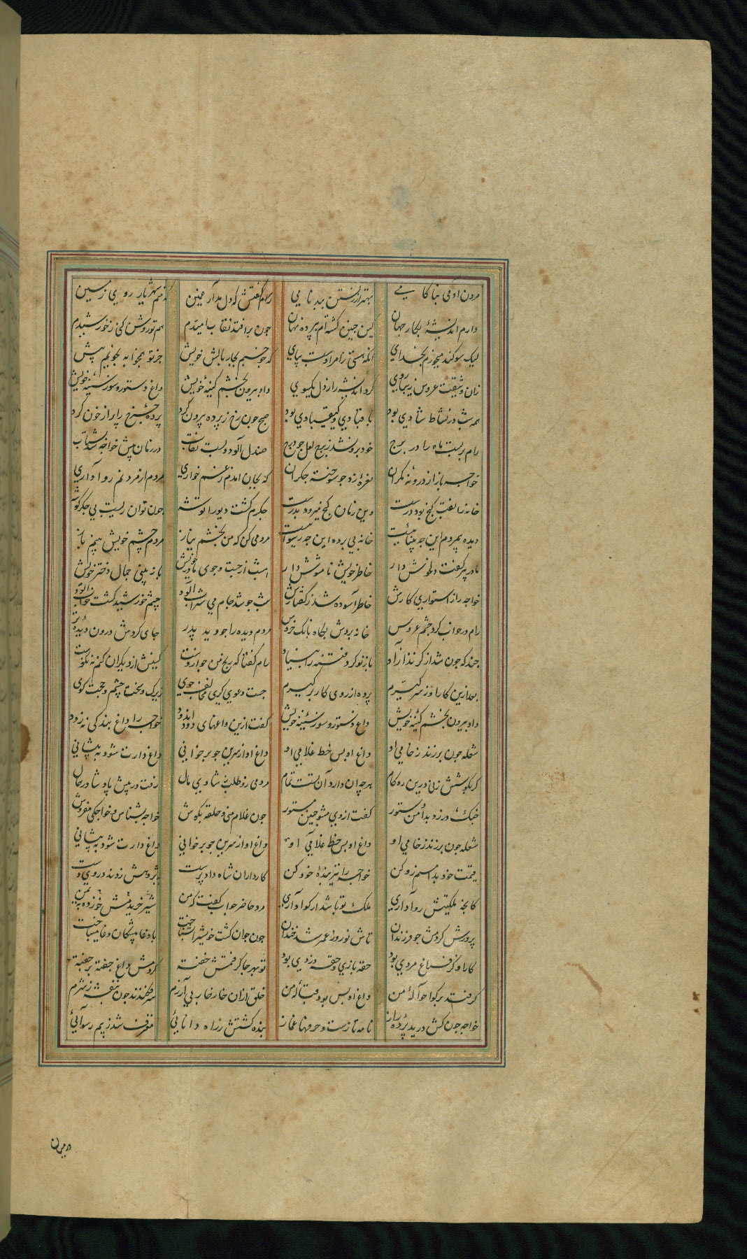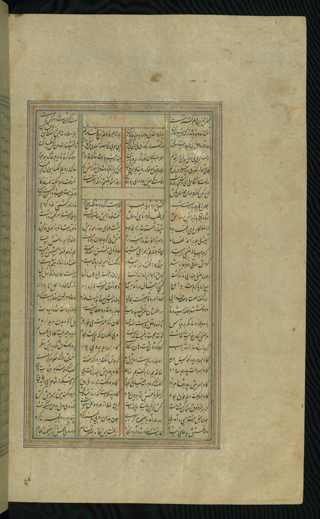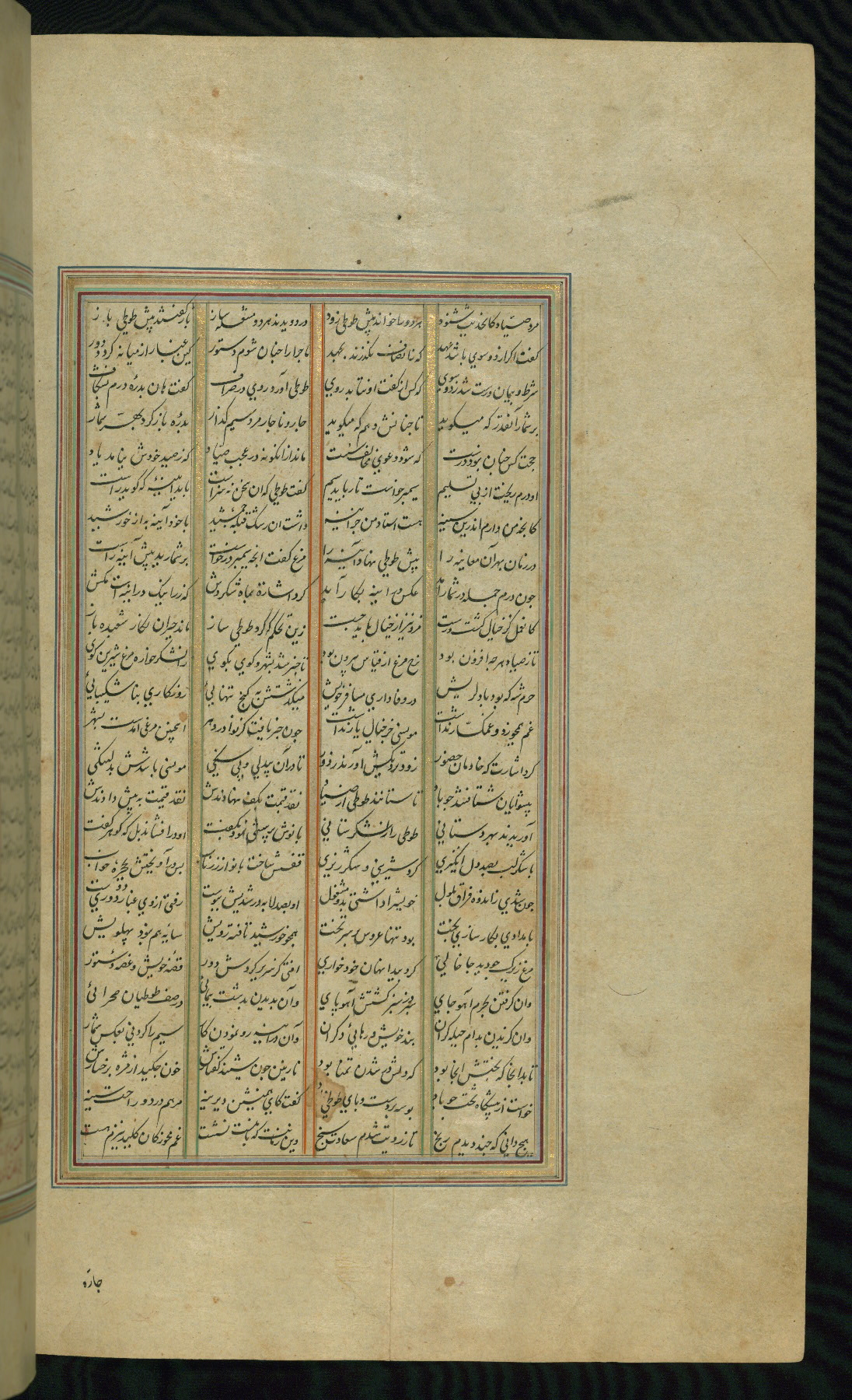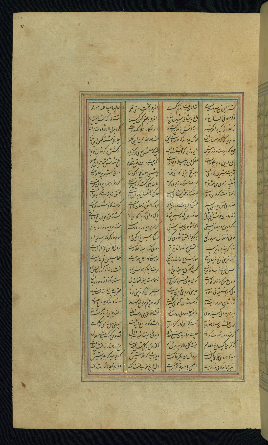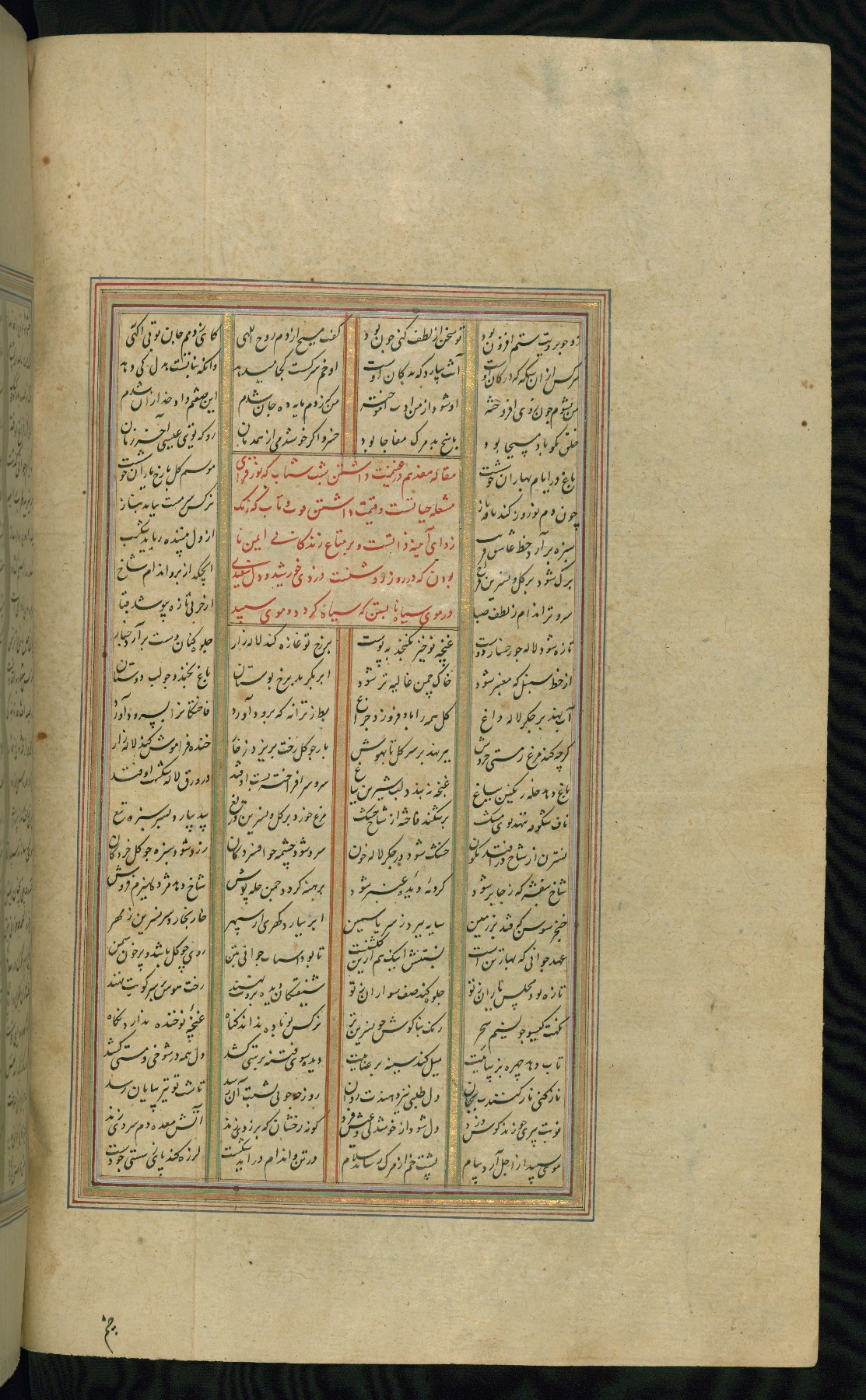 This illuminated and illustrated manuscript contains the Khamsah (quintet) and two historical poems (masnavi), Qirān-i saʿdayn and Nuh sipihr, by Amīr Khusraw Dihlavī (d. 725 AH / 1325 CE). The codex is dated 1017 AH / 1609 CE and was produced in Safavid Iran. All texts are written in black nastaʿlīq script with chapter headings in red. The manuscript opens with an illuminated and illustrated frontispiece of a hunting and court scene in the early Safavid style (fols. 1b-2a). The first text is Khamsah-i Dihlavī (fols. 2b-192a), which is introduced by an illuminated incipit and titlepiece with the title of the first poem of the quintet and the author's name. The second text is Qirān-i saʿdayn, a historical poem (masnavi) about the meeting of Sultan Muʿizz al-Dīn Kayqubād and his father, Nāṣir al-Din Bughrā Khān, on the banks of the Sarjū in Oudh. It is also introduced with an illuminated incipit and titlepiece (fol. 193b). The third text is Nuh sipihr, a historical poem (masnavi) describing the glories of Sultan Quṭb al-Dīn Mubārak Shāh Khaljī’s time, introduced with an illuminated incipit and headpiece (fol. 223b). The dark brown leather binding is original to the manuscript.