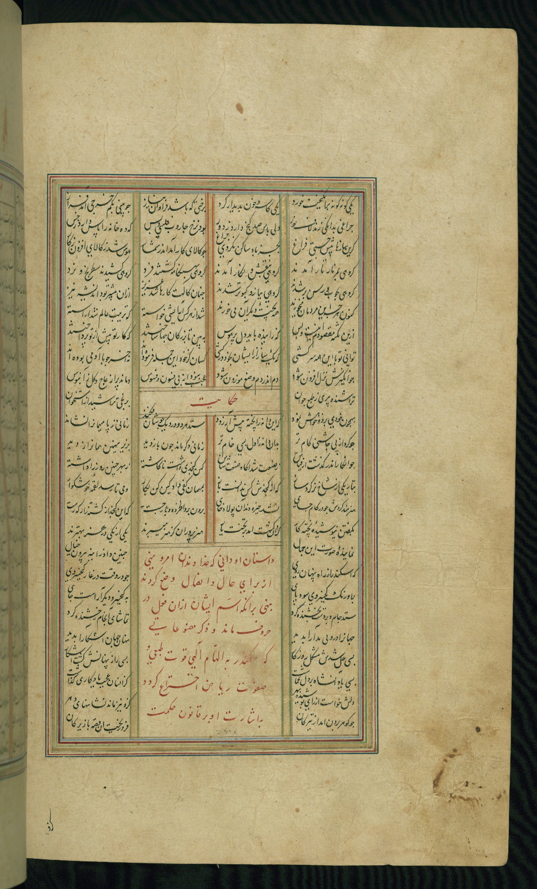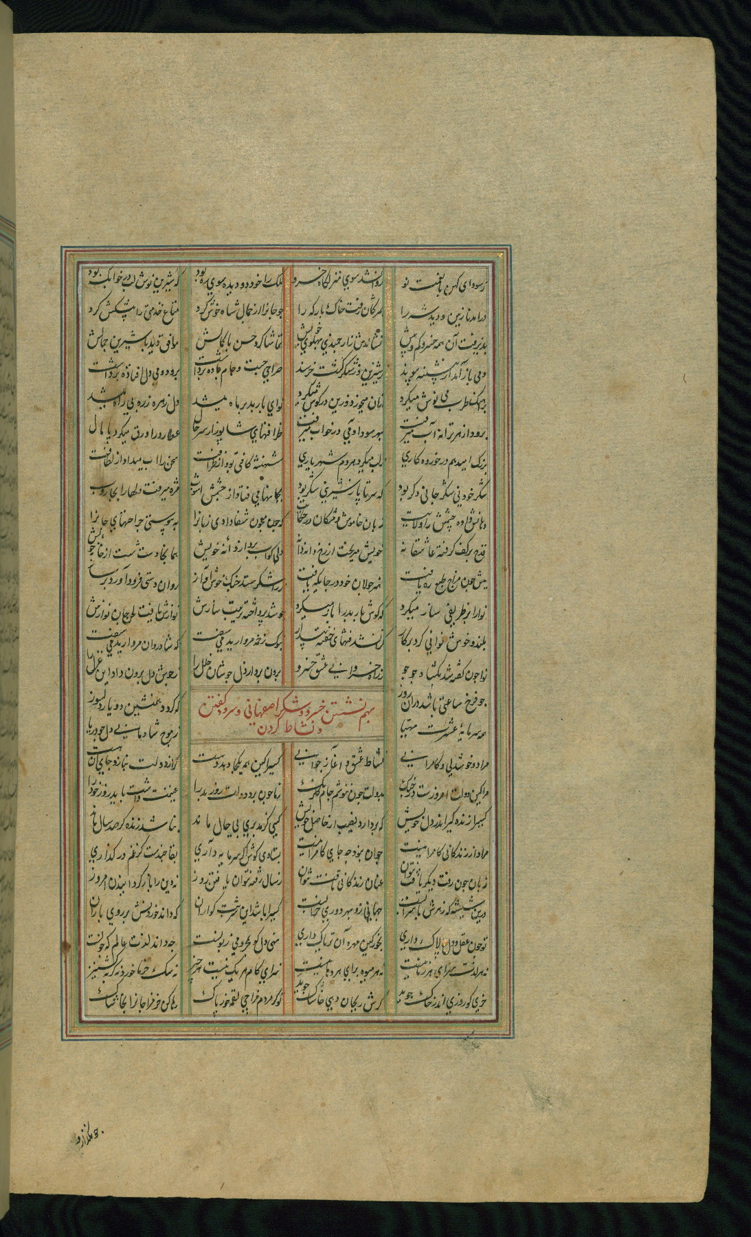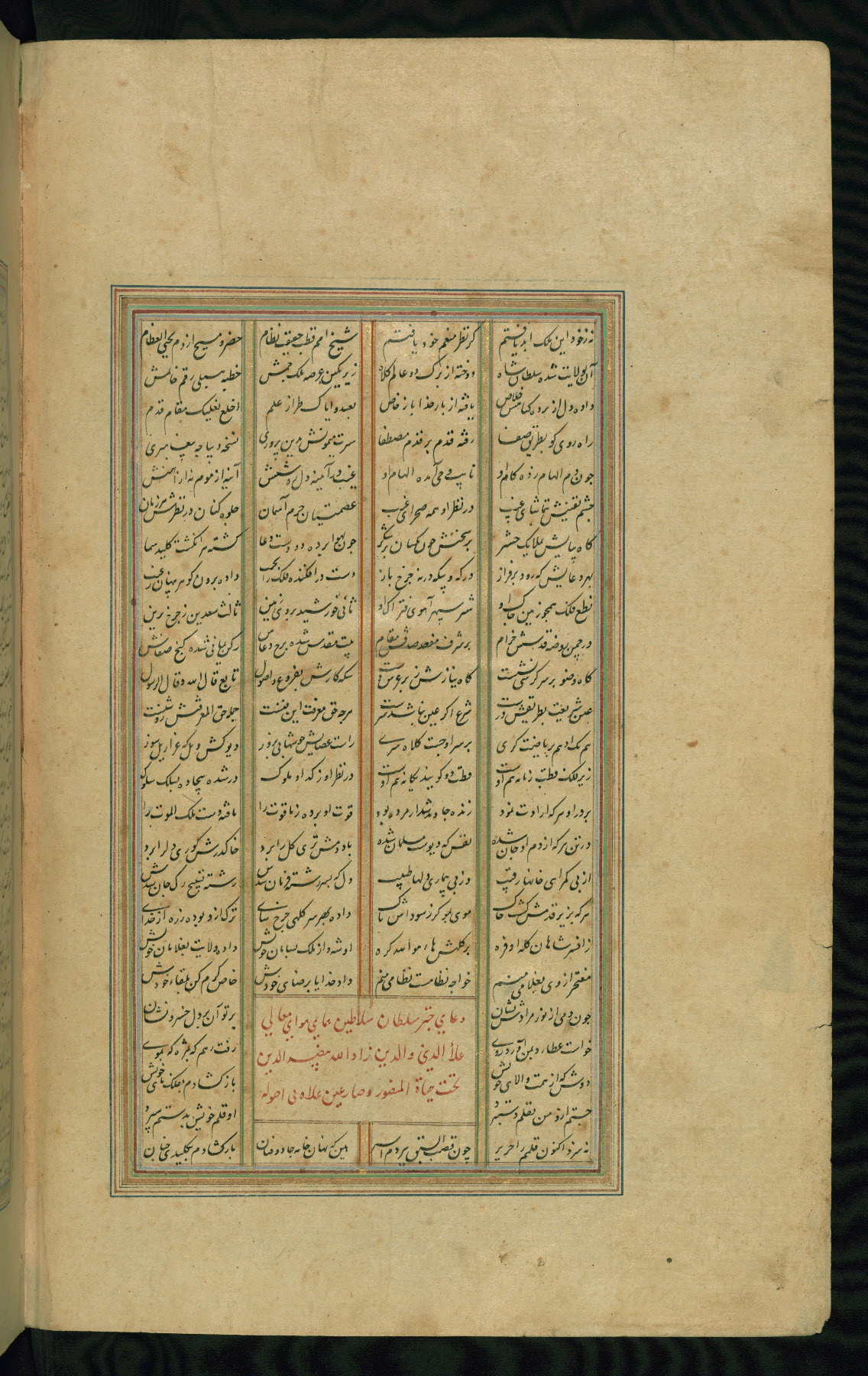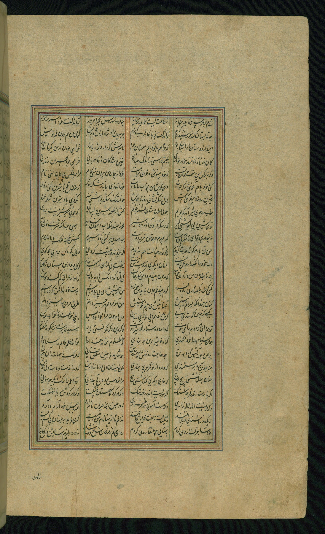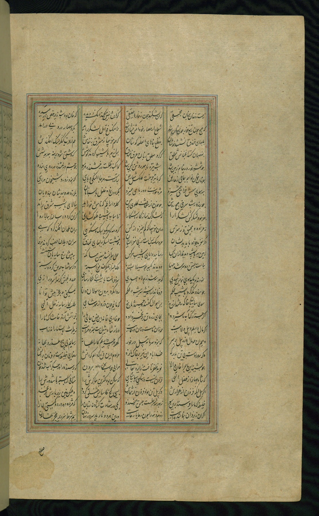 This illuminated and illustrated manuscript contains the Khamsah (quintet) and two historical poems (masnavi), Qirān-i saʿdayn and Nuh sipihr, by Amīr Khusraw Dihlavī (d. 725 AH / 1325 CE). The codex is dated 1017 AH / 1609 CE and was produced in Safavid Iran. All texts are written in black nastaʿlīq script with chapter headings in red. The manuscript opens with an illuminated and illustrated frontispiece of a hunting and court scene in the early Safavid style (fols. 1b-2a). The first text is Khamsah-i Dihlavī (fols. 2b-192a), which is introduced by an illuminated incipit and titlepiece with the title of the first poem of the quintet and the author's name. The second text is Qirān-i saʿdayn, a historical poem (masnavi) about the meeting of Sultan Muʿizz al-Dīn Kayqubād and his father, Nāṣir al-Din Bughrā Khān, on the banks of the Sarjū in Oudh. It is also introduced with an illuminated incipit and titlepiece (fol. 193b). The third text is Nuh sipihr, a historical poem (masnavi) describing the glories of Sultan Quṭb al-Dīn Mubārak Shāh Khaljī’s time, introduced with an illuminated incipit and headpiece (fol. 223b). The dark brown leather binding is original to the manuscript.