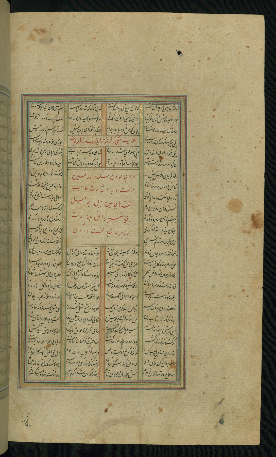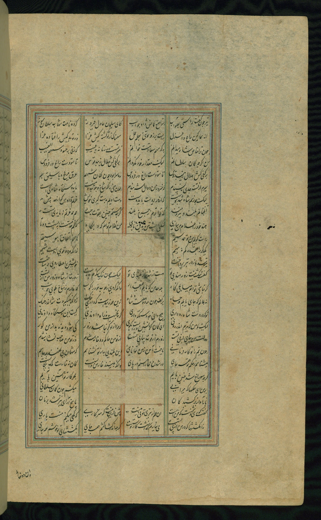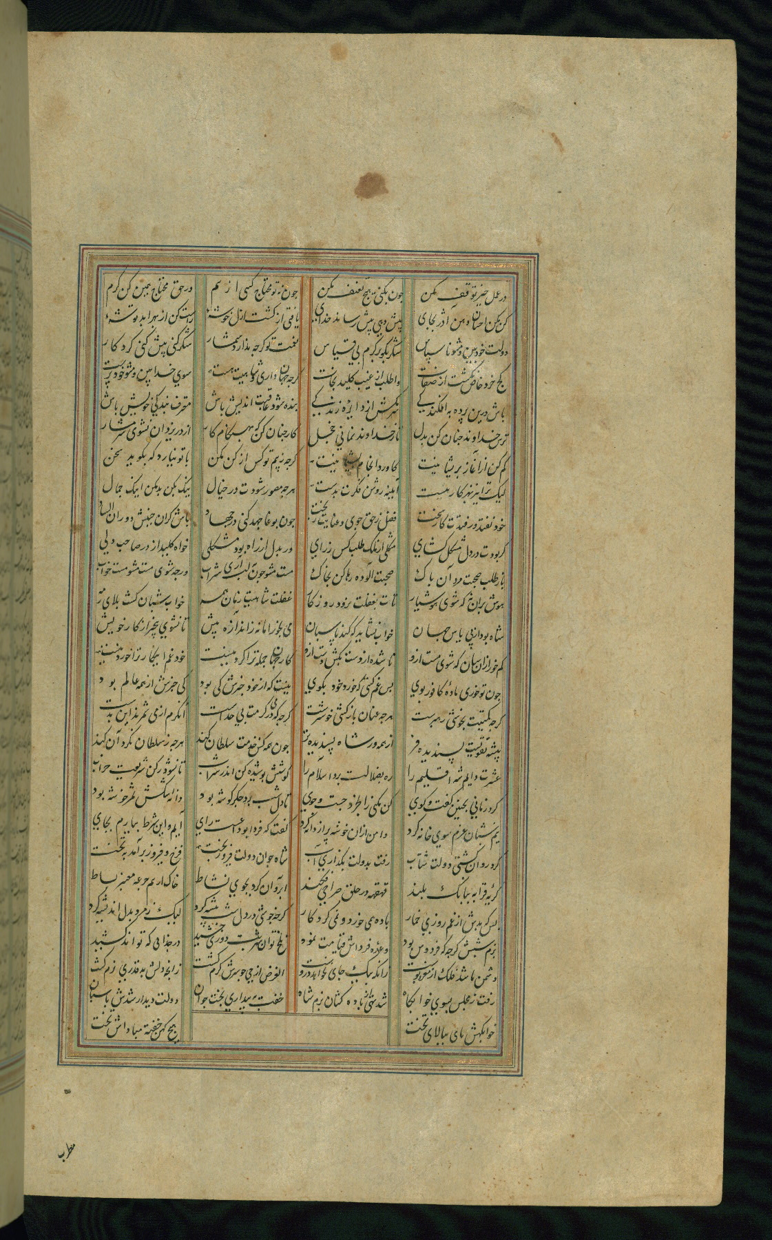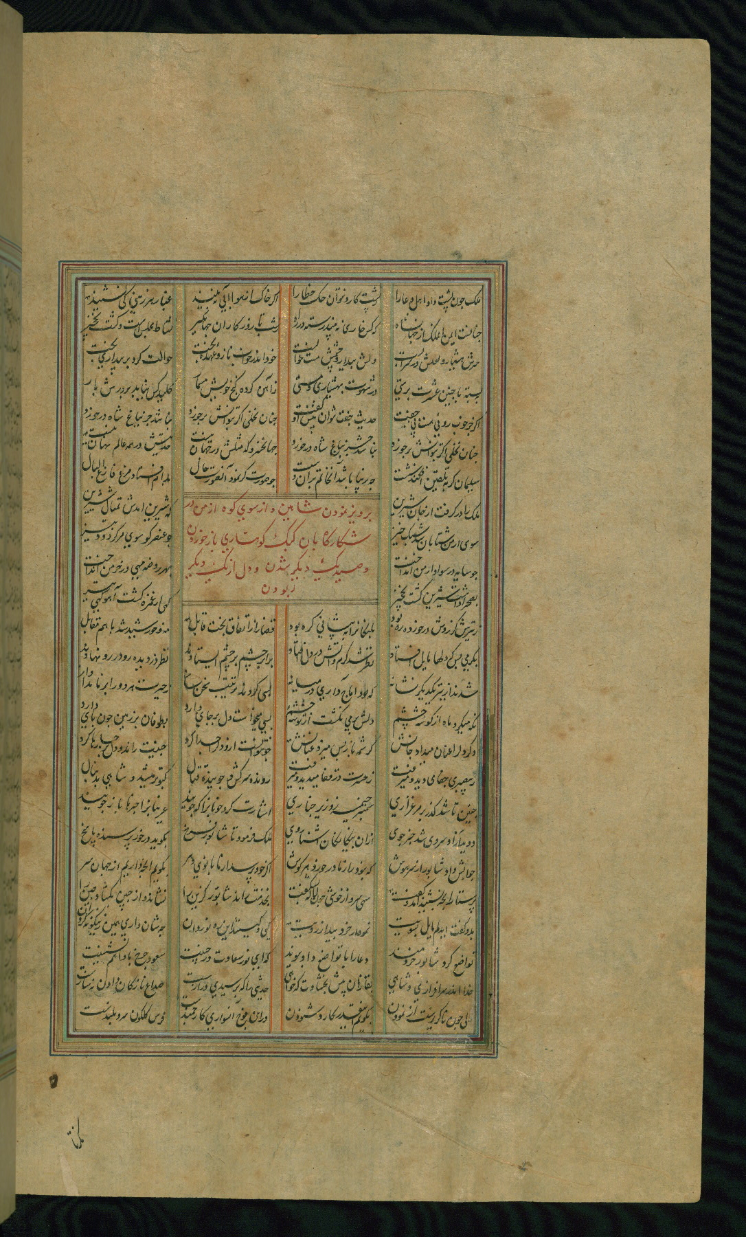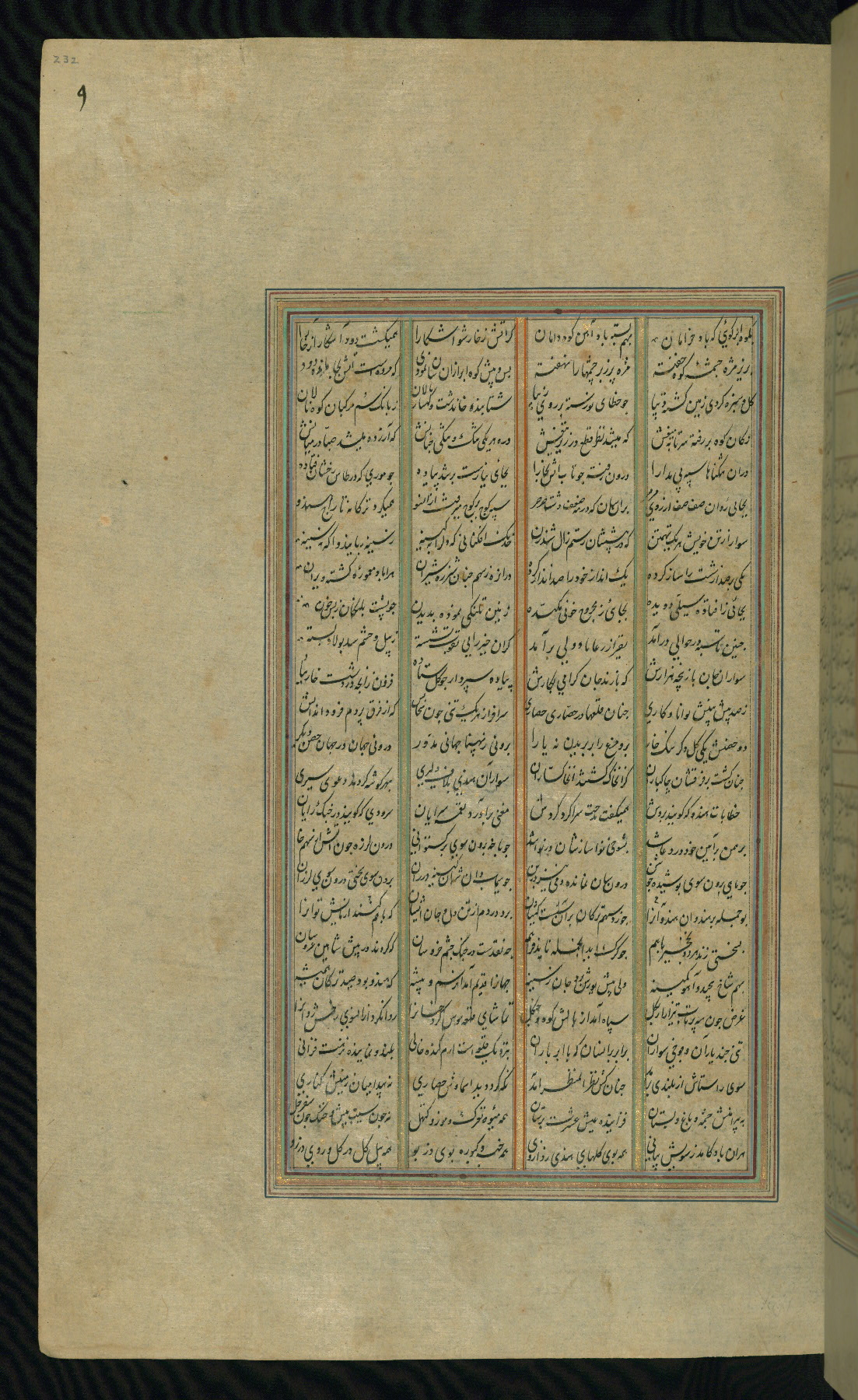 This illuminated and illustrated manuscript contains the Khamsah (quintet) and two historical poems (masnavi), Qirān-i saʿdayn and Nuh sipihr, by Amīr Khusraw Dihlavī (d. 725 AH / 1325 CE). The codex is dated 1017 AH / 1609 CE and was produced in Safavid Iran. All texts are written in black nastaʿlīq script with chapter headings in red. The manuscript opens with an illuminated and illustrated frontispiece of a hunting and court scene in the early Safavid style (fols. 1b-2a). The first text is Khamsah-i Dihlavī (fols. 2b-192a), which is introduced by an illuminated incipit and titlepiece with the title of the first poem of the quintet and the author's name. The second text is Qirān-i saʿdayn, a historical poem (masnavi) about the meeting of Sultan Muʿizz al-Dīn Kayqubād and his father, Nāṣir al-Din Bughrā Khān, on the banks of the Sarjū in Oudh. It is also introduced with an illuminated incipit and titlepiece (fol. 193b). The third text is Nuh sipihr, a historical poem (masnavi) describing the glories of Sultan Quṭb al-Dīn Mubārak Shāh Khaljī’s time, introduced with an illuminated incipit and headpiece (fol. 223b). The dark brown leather binding is original to the manuscript.