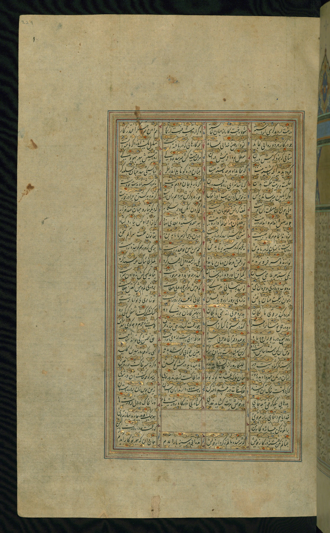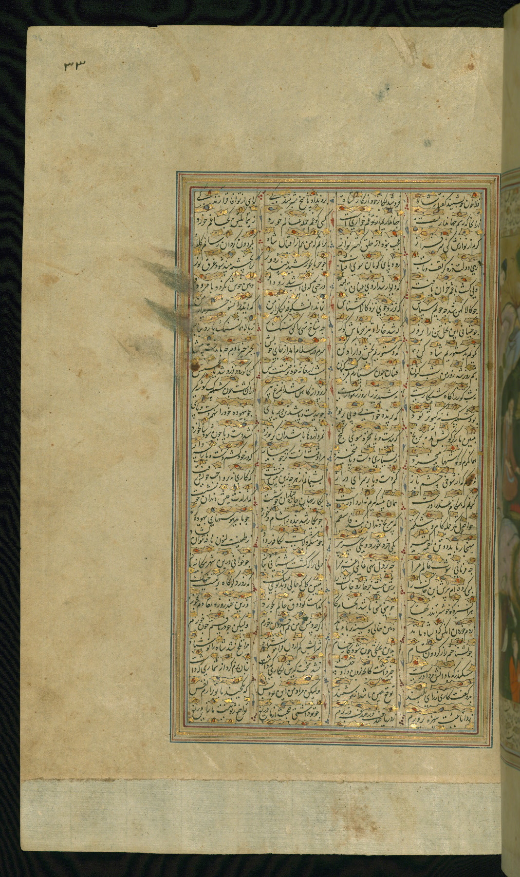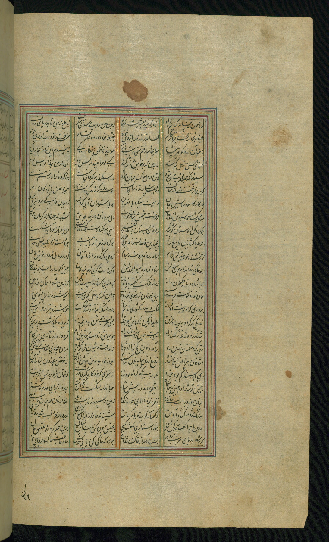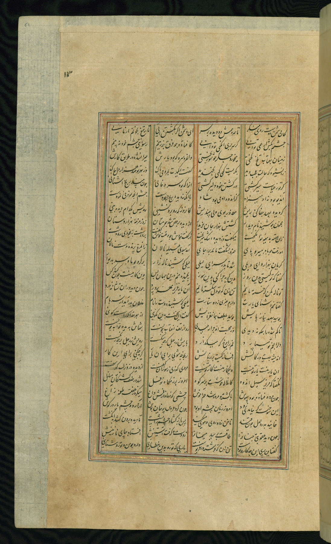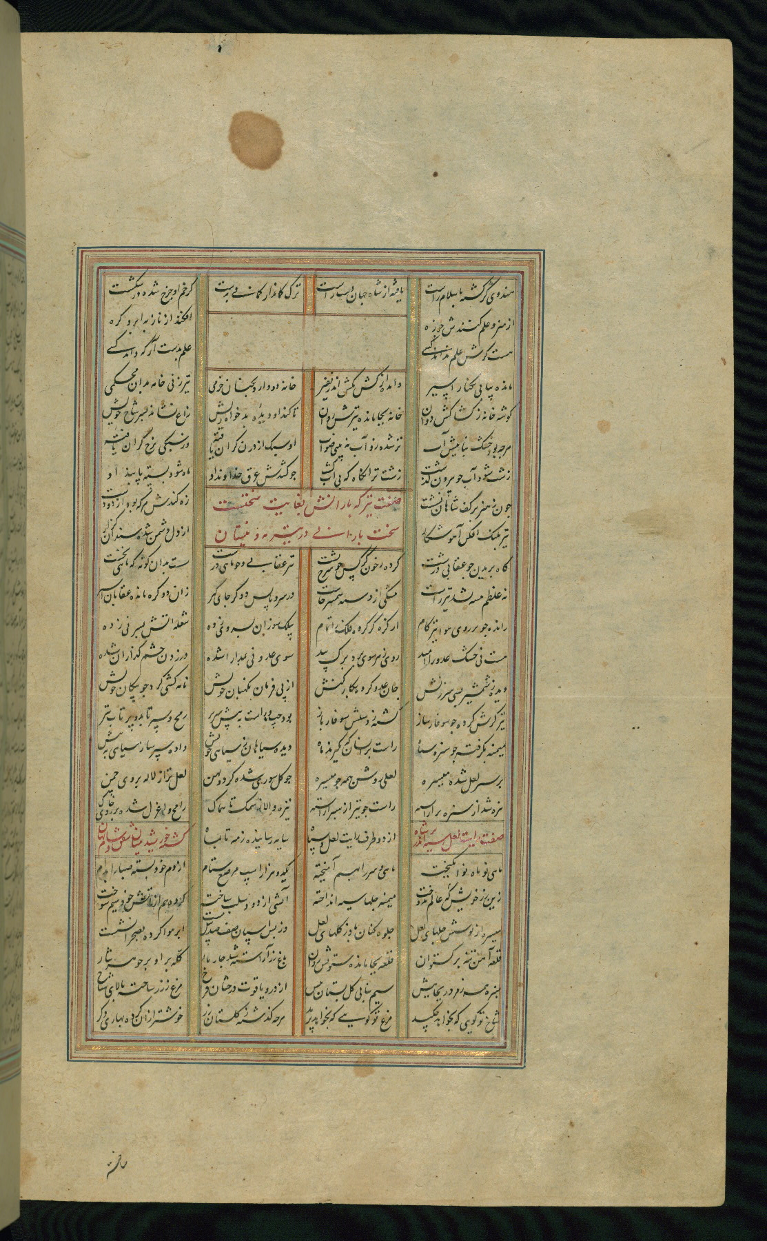 This illuminated and illustrated manuscript contains the Khamsah (quintet) and two historical poems (masnavi), Qirān-i saʿdayn and Nuh sipihr, by Amīr Khusraw Dihlavī (d. 725 AH / 1325 CE). The codex is dated 1017 AH / 1609 CE and was produced in Safavid Iran. All texts are written in black nastaʿlīq script with chapter headings in red. The manuscript opens with an illuminated and illustrated frontispiece of a hunting and court scene in the early Safavid style (fols. 1b-2a). The first text is Khamsah-i Dihlavī (fols. 2b-192a), which is introduced by an illuminated incipit and titlepiece with the title of the first poem of the quintet and the author's name. The second text is Qirān-i saʿdayn, a historical poem (masnavi) about the meeting of Sultan Muʿizz al-Dīn Kayqubād and his father, Nāṣir al-Din Bughrā Khān, on the banks of the Sarjū in Oudh. It is also introduced with an illuminated incipit and titlepiece (fol. 193b). The third text is Nuh sipihr, a historical poem (masnavi) describing the glories of Sultan Quṭb al-Dīn Mubārak Shāh Khaljī’s time, introduced with an illuminated incipit and headpiece (fol. 223b). The dark brown leather binding is original to the manuscript.