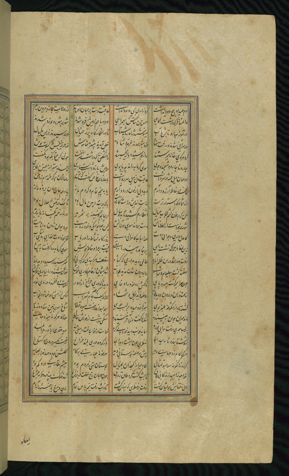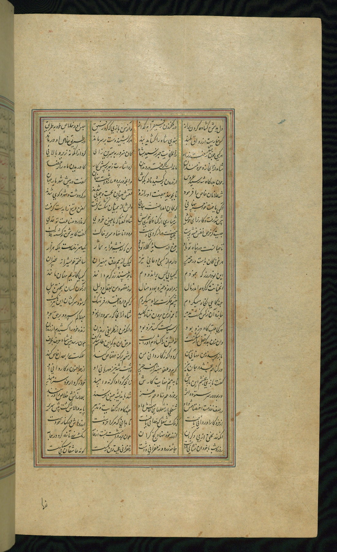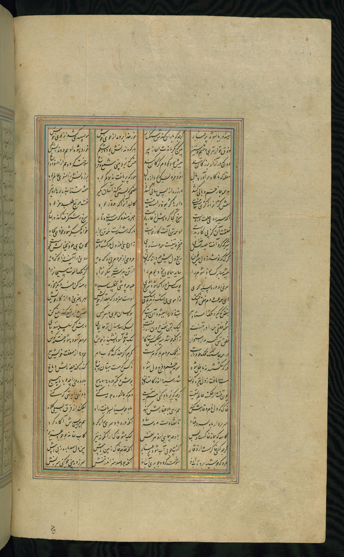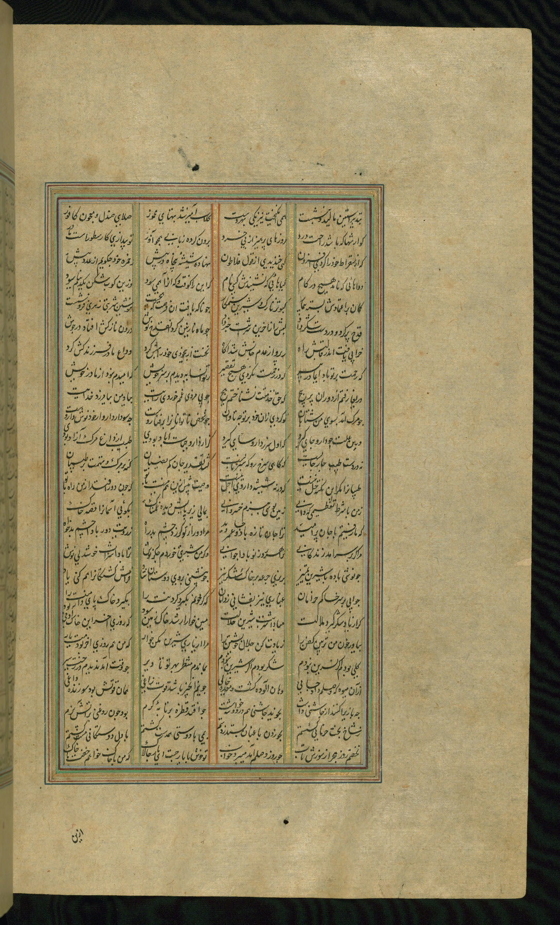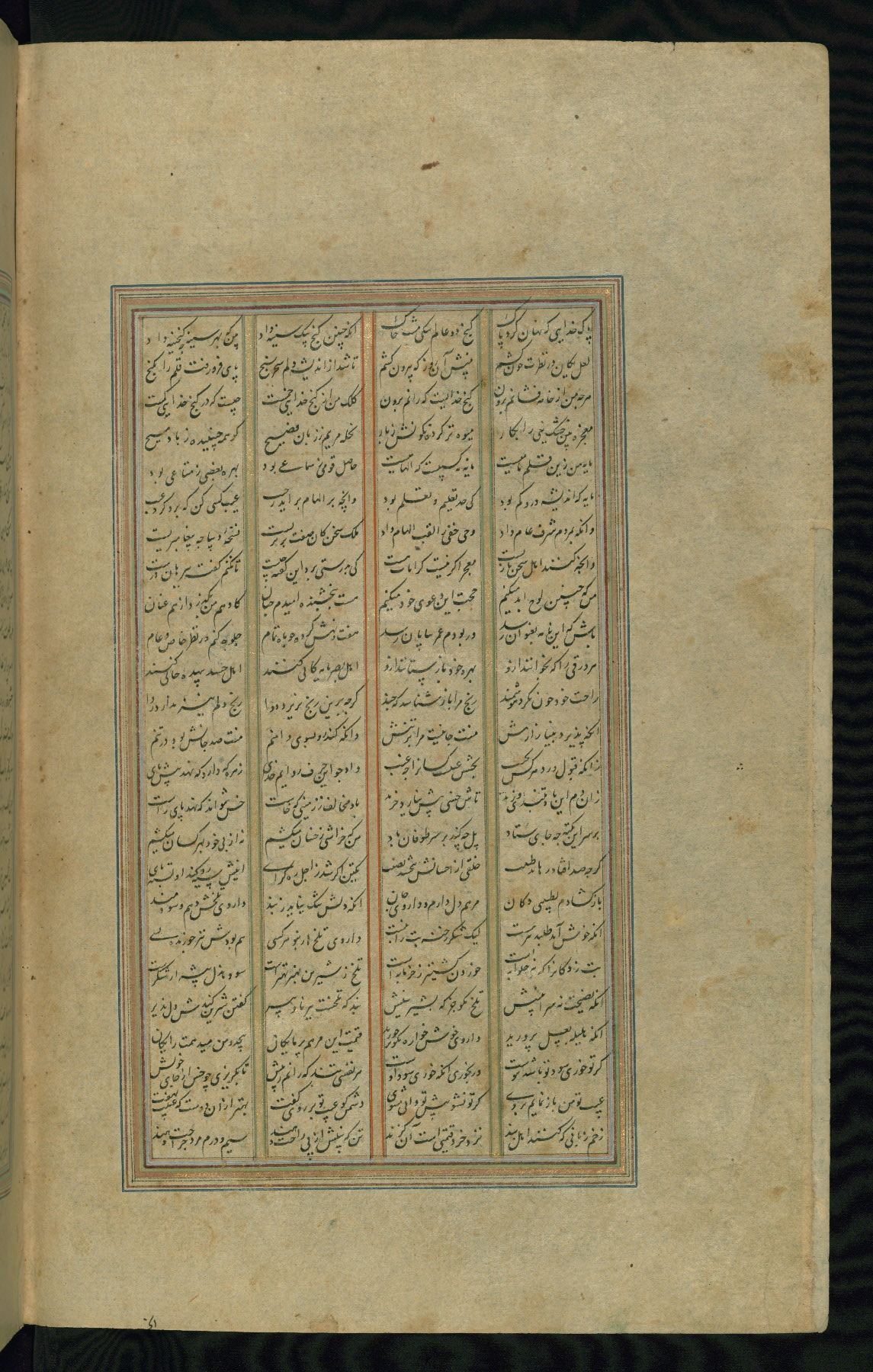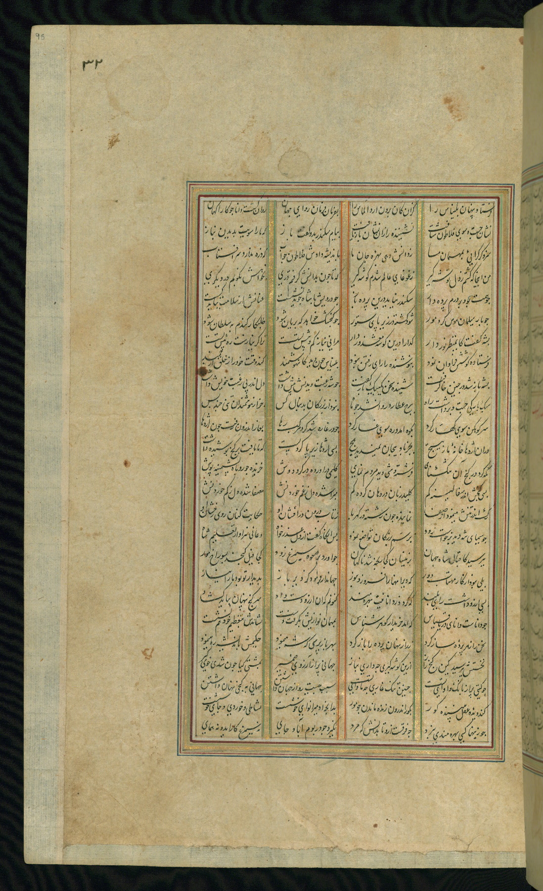 This illuminated and illustrated manuscript contains the Khamsah (quintet) and two historical poems (masnavi), Qirān-i saʿdayn and Nuh sipihr, by Amīr Khusraw Dihlavī (d. 725 AH / 1325 CE). The codex is dated 1017 AH / 1609 CE and was produced in Safavid Iran. All texts are written in black nastaʿlīq script with chapter headings in red. The manuscript opens with an illuminated and illustrated frontispiece of a hunting and court scene in the early Safavid style (fols. 1b-2a). The first text is Khamsah-i Dihlavī (fols. 2b-192a), which is introduced by an illuminated incipit and titlepiece with the title of the first poem of the quintet and the author's name. The second text is Qirān-i saʿdayn, a historical poem (masnavi) about the meeting of Sultan Muʿizz al-Dīn Kayqubād and his father, Nāṣir al-Din Bughrā Khān, on the banks of the Sarjū in Oudh. It is also introduced with an illuminated incipit and titlepiece (fol. 193b). The third text is Nuh sipihr, a historical poem (masnavi) describing the glories of Sultan Quṭb al-Dīn Mubārak Shāh Khaljī’s time, introduced with an illuminated incipit and headpiece (fol. 223b). The dark brown leather binding is original to the manuscript.
