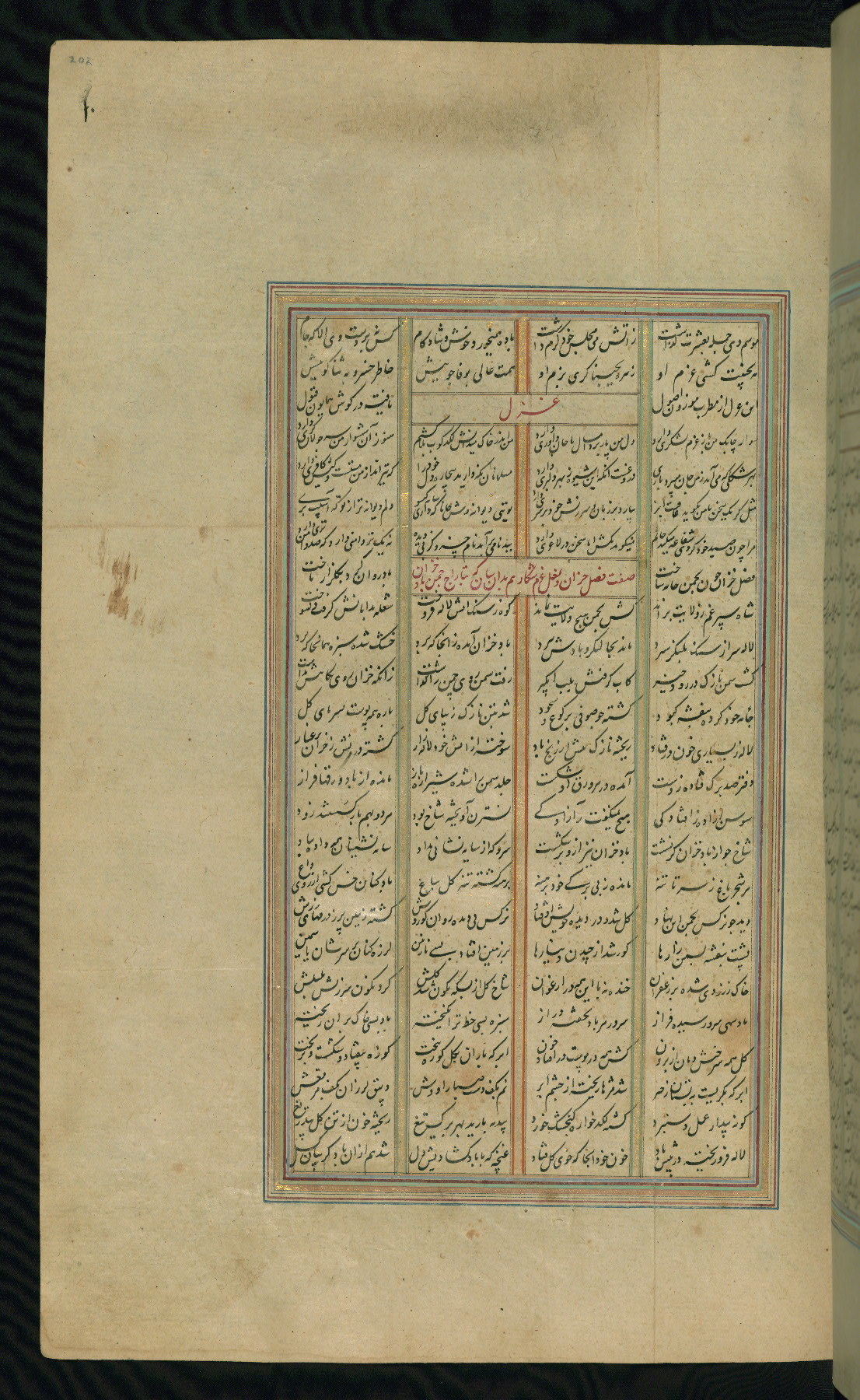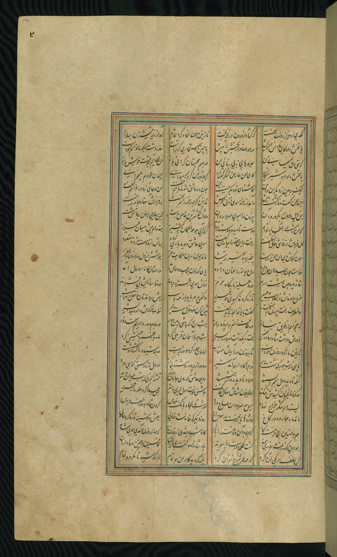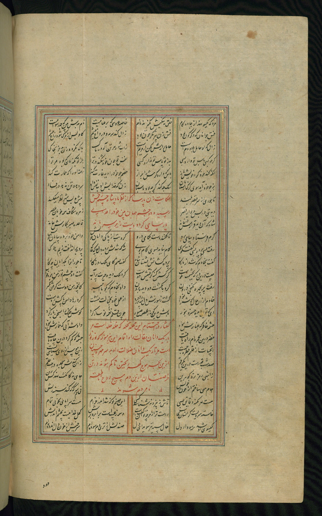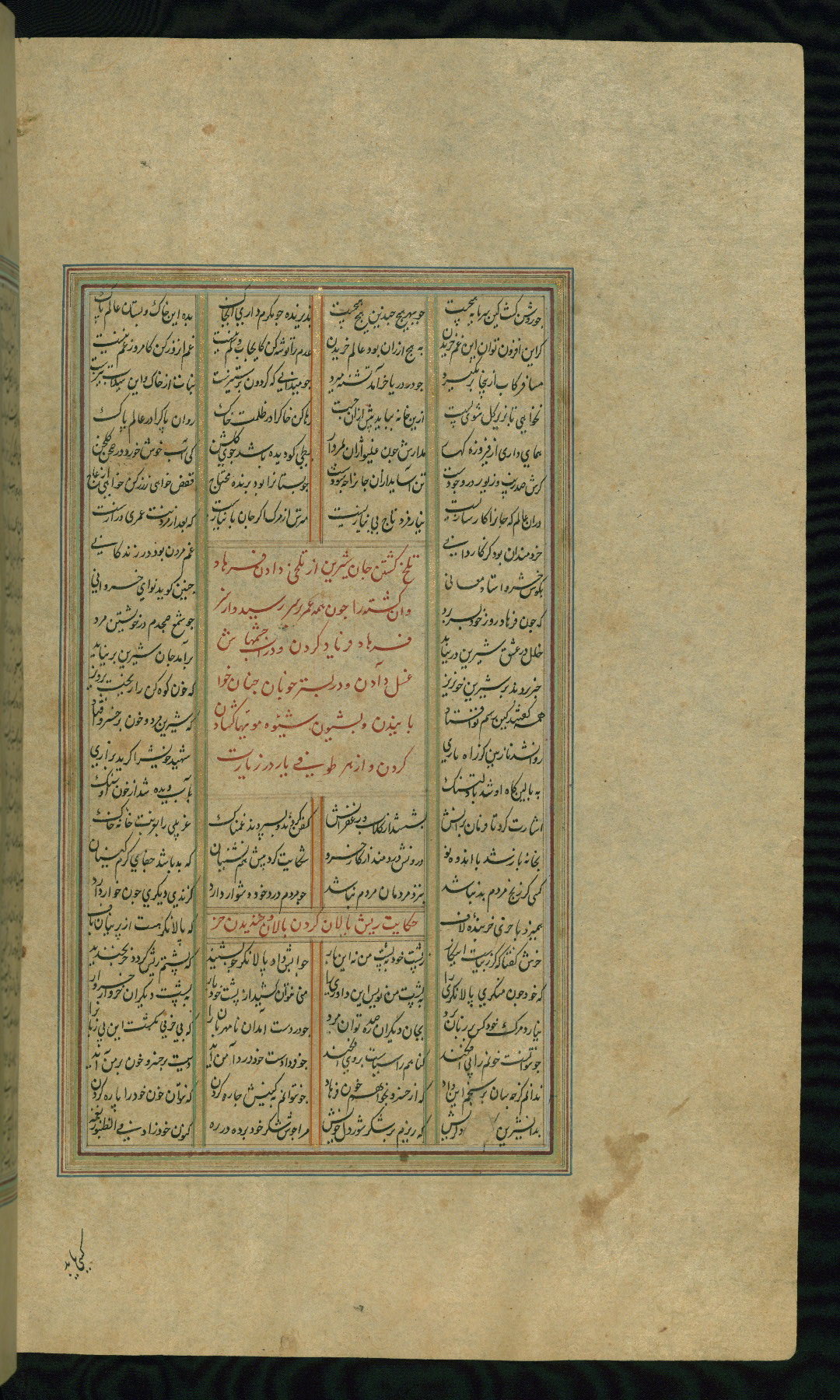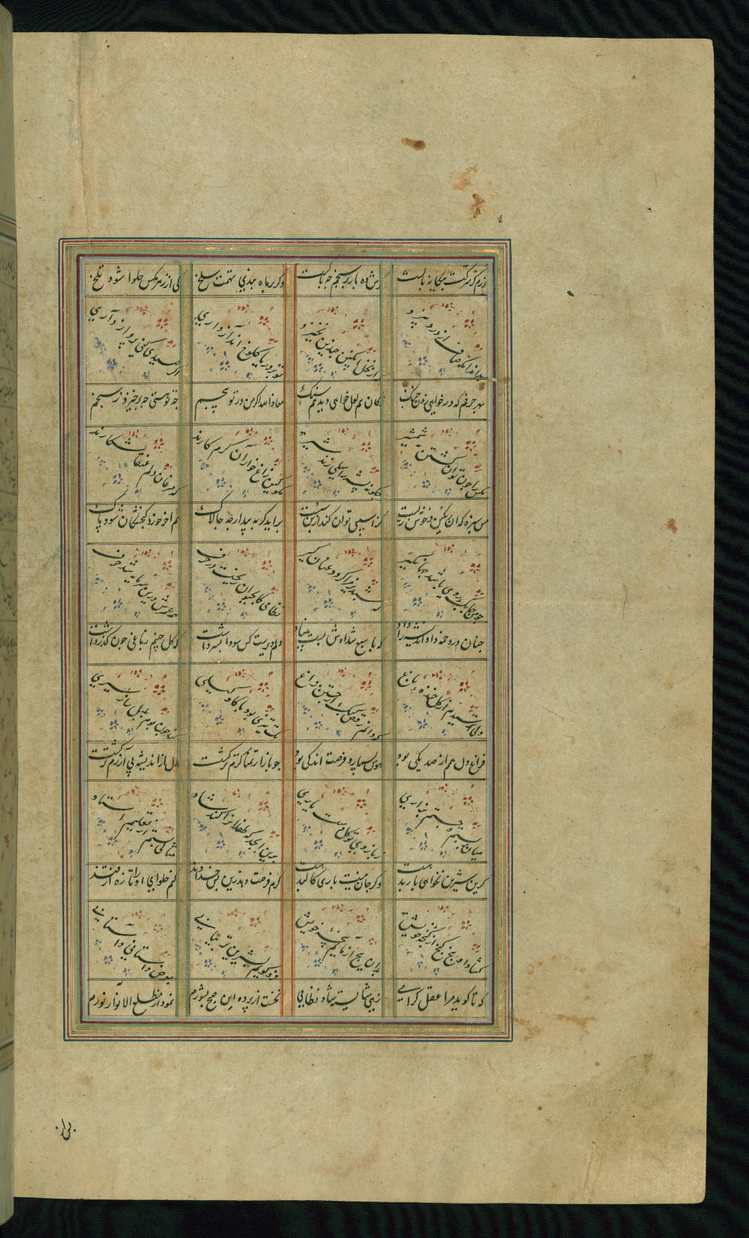 This illuminated and illustrated manuscript contains the Khamsah (quintet) and two historical poems (masnavi), Qirān-i saʿdayn and Nuh sipihr, by Amīr Khusraw Dihlavī (d. 725 AH / 1325 CE). The codex is dated 1017 AH / 1609 CE and was produced in Safavid Iran. All texts are written in black nastaʿlīq script with chapter headings in red. The manuscript opens with an illuminated and illustrated frontispiece of a hunting and court scene in the early Safavid style (fols. 1b-2a). The first text is Khamsah-i Dihlavī (fols. 2b-192a), which is introduced by an illuminated incipit and titlepiece with the title of the first poem of the quintet and the author's name. The second text is Qirān-i saʿdayn, a historical poem (masnavi) about the meeting of Sultan Muʿizz al-Dīn Kayqubād and his father, Nāṣir al-Din Bughrā Khān, on the banks of the Sarjū in Oudh. It is also introduced with an illuminated incipit and titlepiece (fol. 193b). The third text is Nuh sipihr, a historical poem (masnavi) describing the glories of Sultan Quṭb al-Dīn Mubārak Shāh Khaljī’s time, introduced with an illuminated incipit and headpiece (fol. 223b). The dark brown leather binding is original to the manuscript.