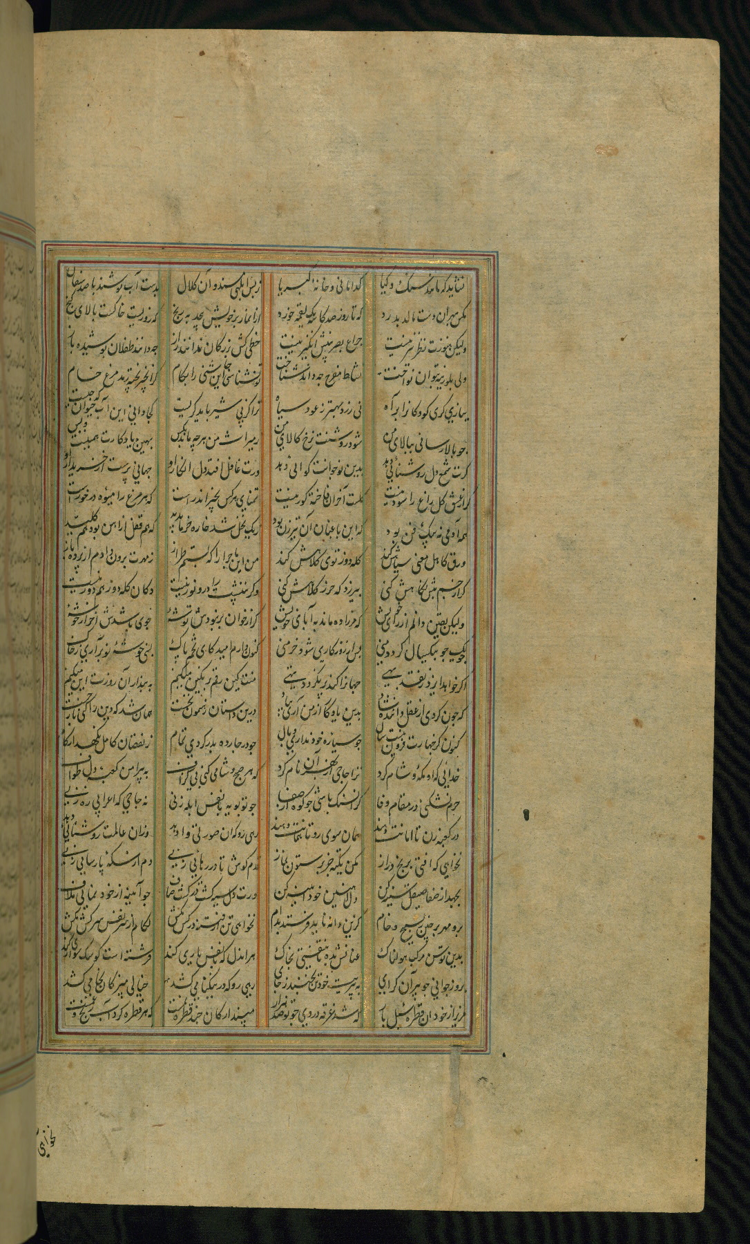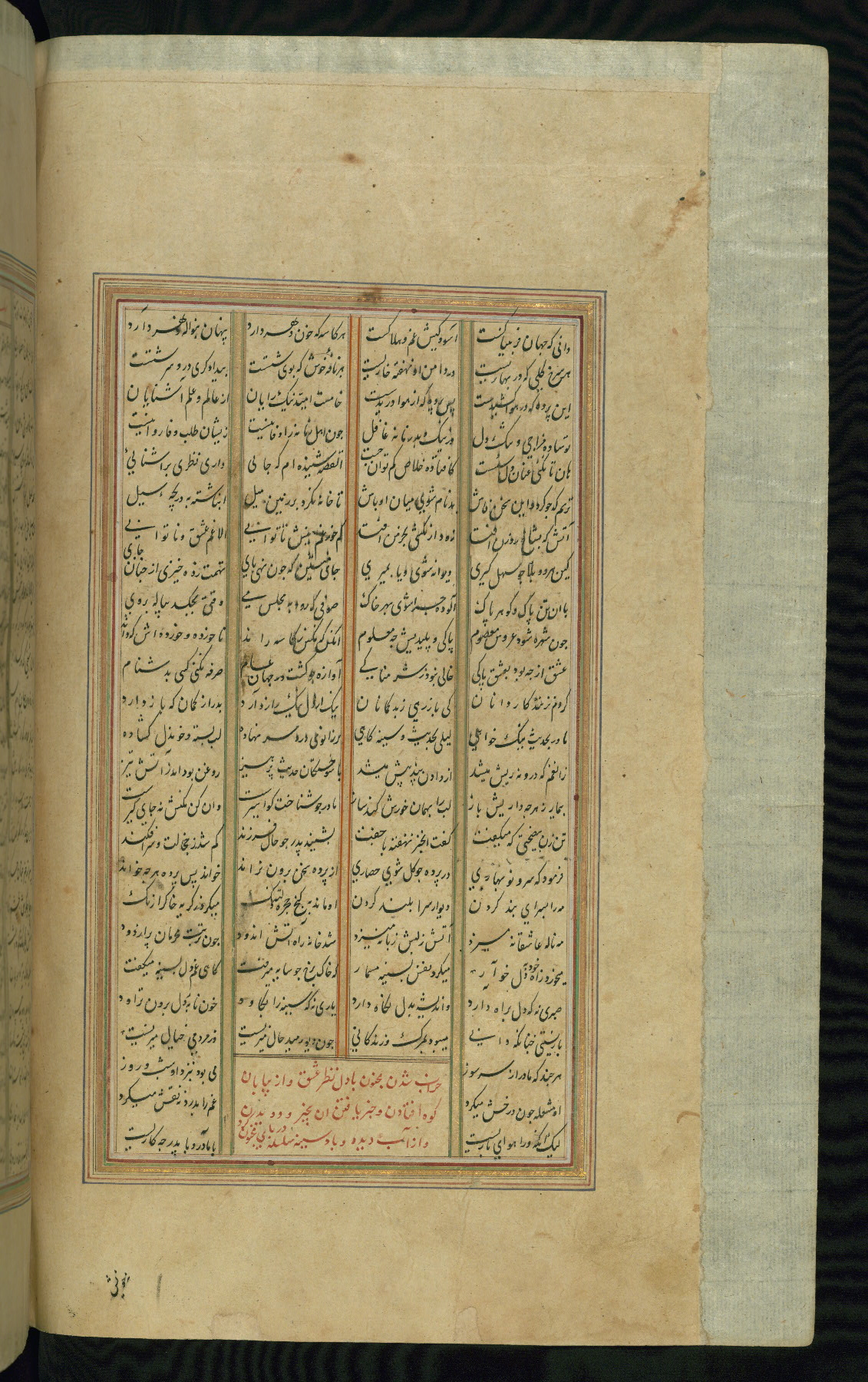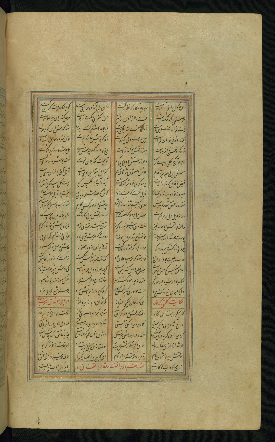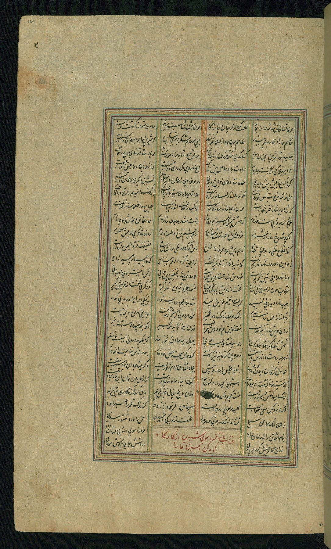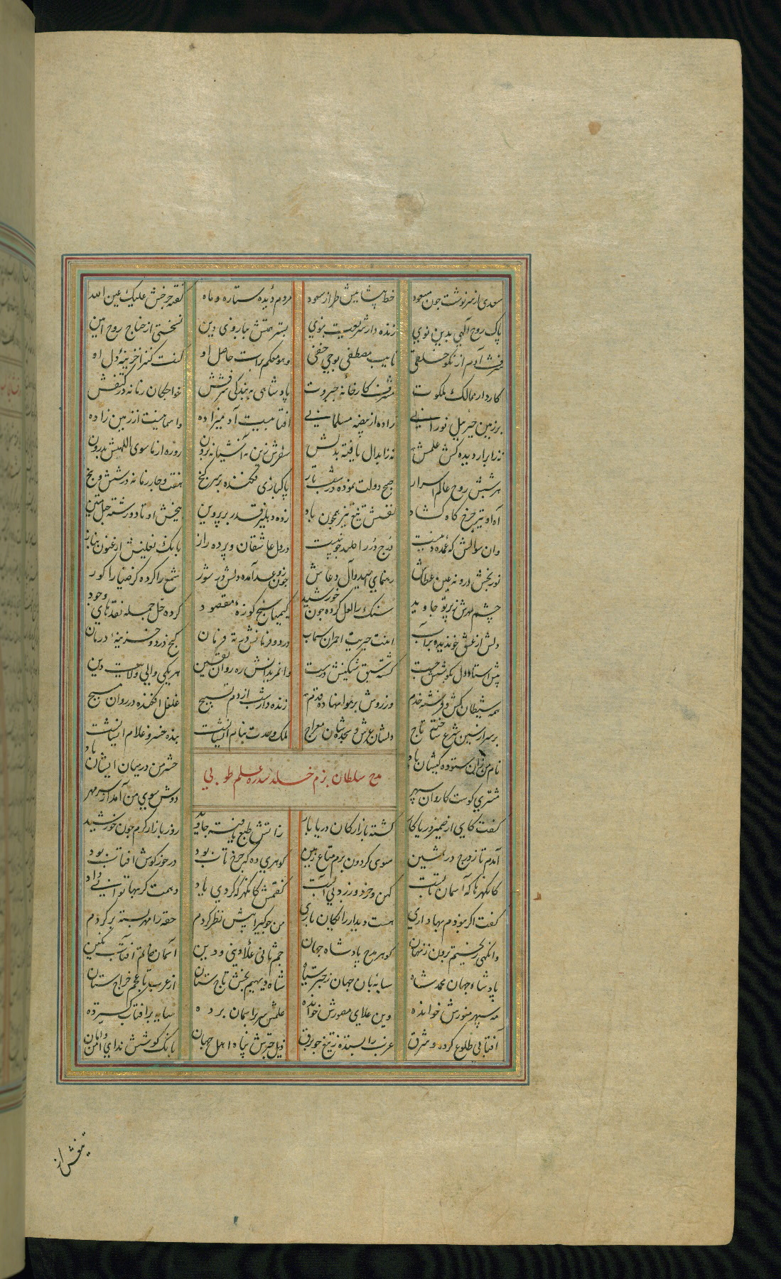 This illuminated and illustrated manuscript contains the Khamsah (quintet) and two historical poems (masnavi), Qirān-i saʿdayn and Nuh sipihr, by Amīr Khusraw Dihlavī (d. 725 AH / 1325 CE). The codex is dated 1017 AH / 1609 CE and was produced in Safavid Iran. All texts are written in black nastaʿlīq script with chapter headings in red. The manuscript opens with an illuminated and illustrated frontispiece of a hunting and court scene in the early Safavid style (fols. 1b-2a). The first text is Khamsah-i Dihlavī (fols. 2b-192a), which is introduced by an illuminated incipit and titlepiece with the title of the first poem of the quintet and the author's name. The second text is Qirān-i saʿdayn, a historical poem (masnavi) about the meeting of Sultan Muʿizz al-Dīn Kayqubād and his father, Nāṣir al-Din Bughrā Khān, on the banks of the Sarjū in Oudh. It is also introduced with an illuminated incipit and titlepiece (fol. 193b). The third text is Nuh sipihr, a historical poem (masnavi) describing the glories of Sultan Quṭb al-Dīn Mubārak Shāh Khaljī’s time, introduced with an illuminated incipit and headpiece (fol. 223b). The dark brown leather binding is original to the manuscript.