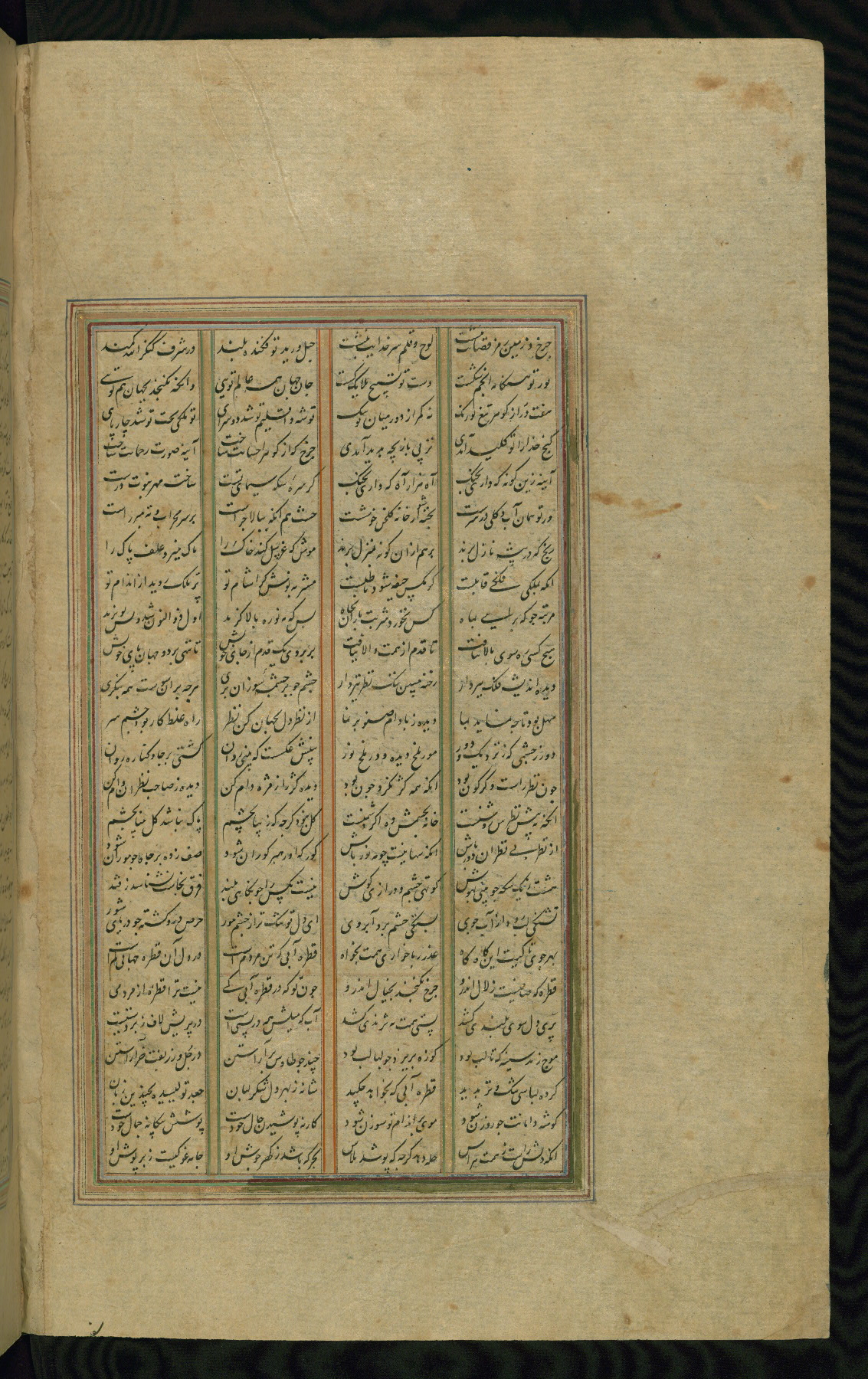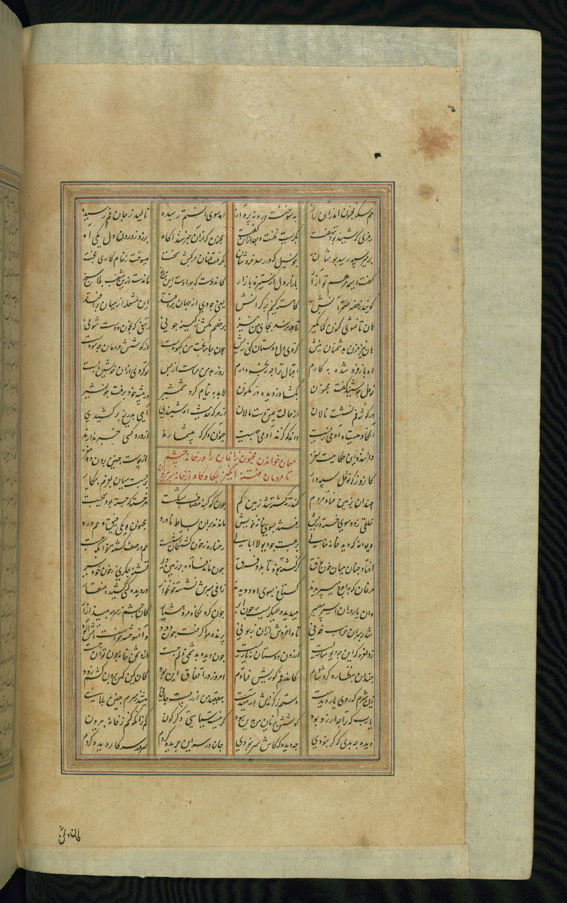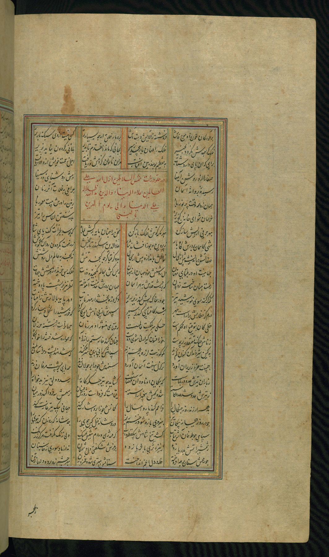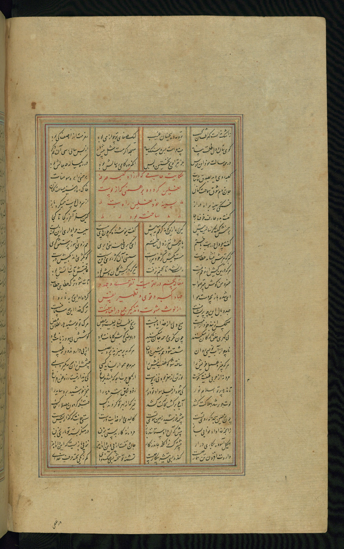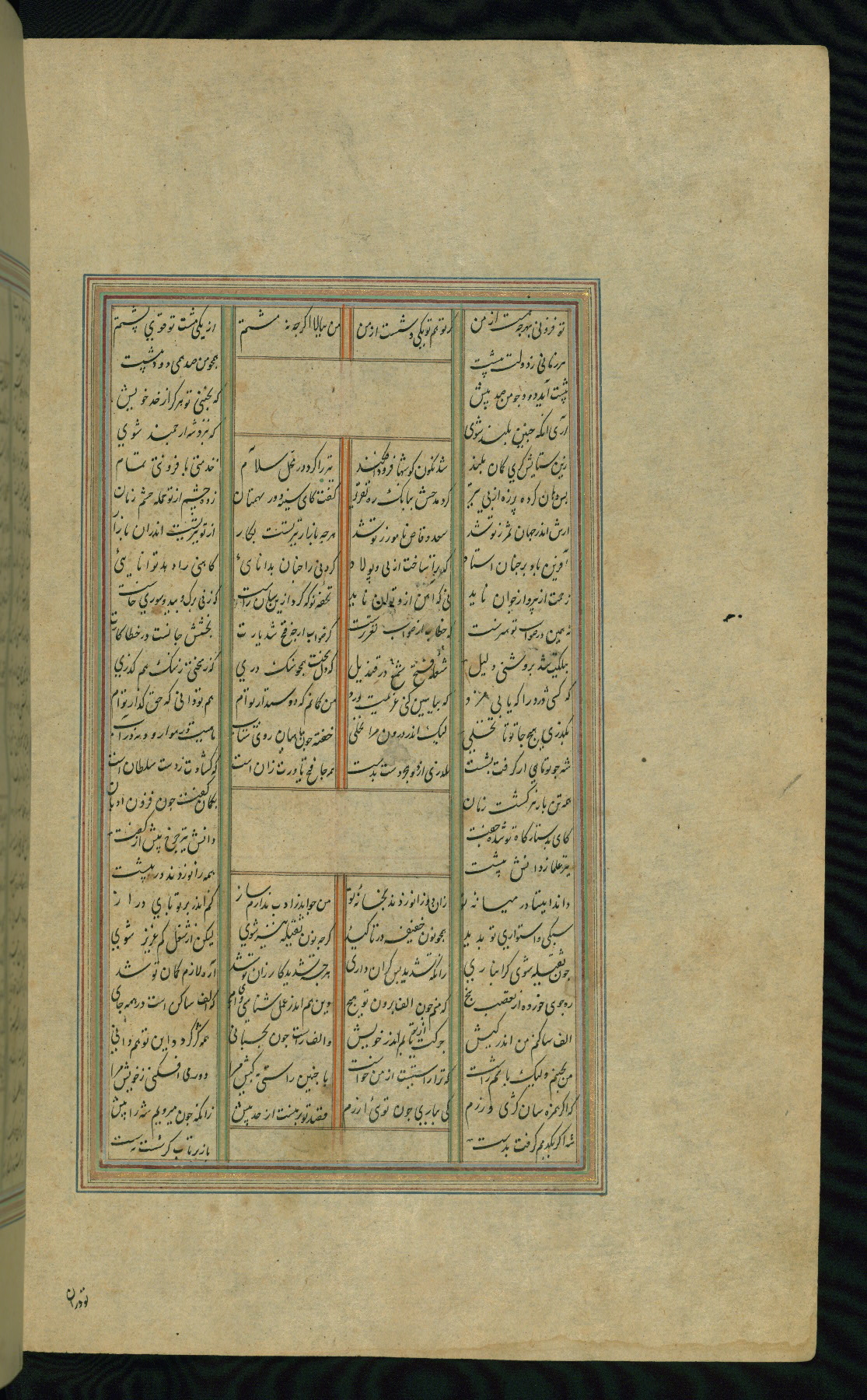 This illuminated and illustrated manuscript contains the Khamsah (quintet) and two historical poems (masnavi), Qirān-i saʿdayn and Nuh sipihr, by Amīr Khusraw Dihlavī (d. 725 AH / 1325 CE). The codex is dated 1017 AH / 1609 CE and was produced in Safavid Iran. All texts are written in black nastaʿlīq script with chapter headings in red. The manuscript opens with an illuminated and illustrated frontispiece of a hunting and court scene in the early Safavid style (fols. 1b-2a). The first text is Khamsah-i Dihlavī (fols. 2b-192a), which is introduced by an illuminated incipit and titlepiece with the title of the first poem of the quintet and the author's name. The second text is Qirān-i saʿdayn, a historical poem (masnavi) about the meeting of Sultan Muʿizz al-Dīn Kayqubād and his father, Nāṣir al-Din Bughrā Khān, on the banks of the Sarjū in Oudh. It is also introduced with an illuminated incipit and titlepiece (fol. 193b). The third text is Nuh sipihr, a historical poem (masnavi) describing the glories of Sultan Quṭb al-Dīn Mubārak Shāh Khaljī’s time, introduced with an illuminated incipit and headpiece (fol. 223b). The dark brown leather binding is original to the manuscript.