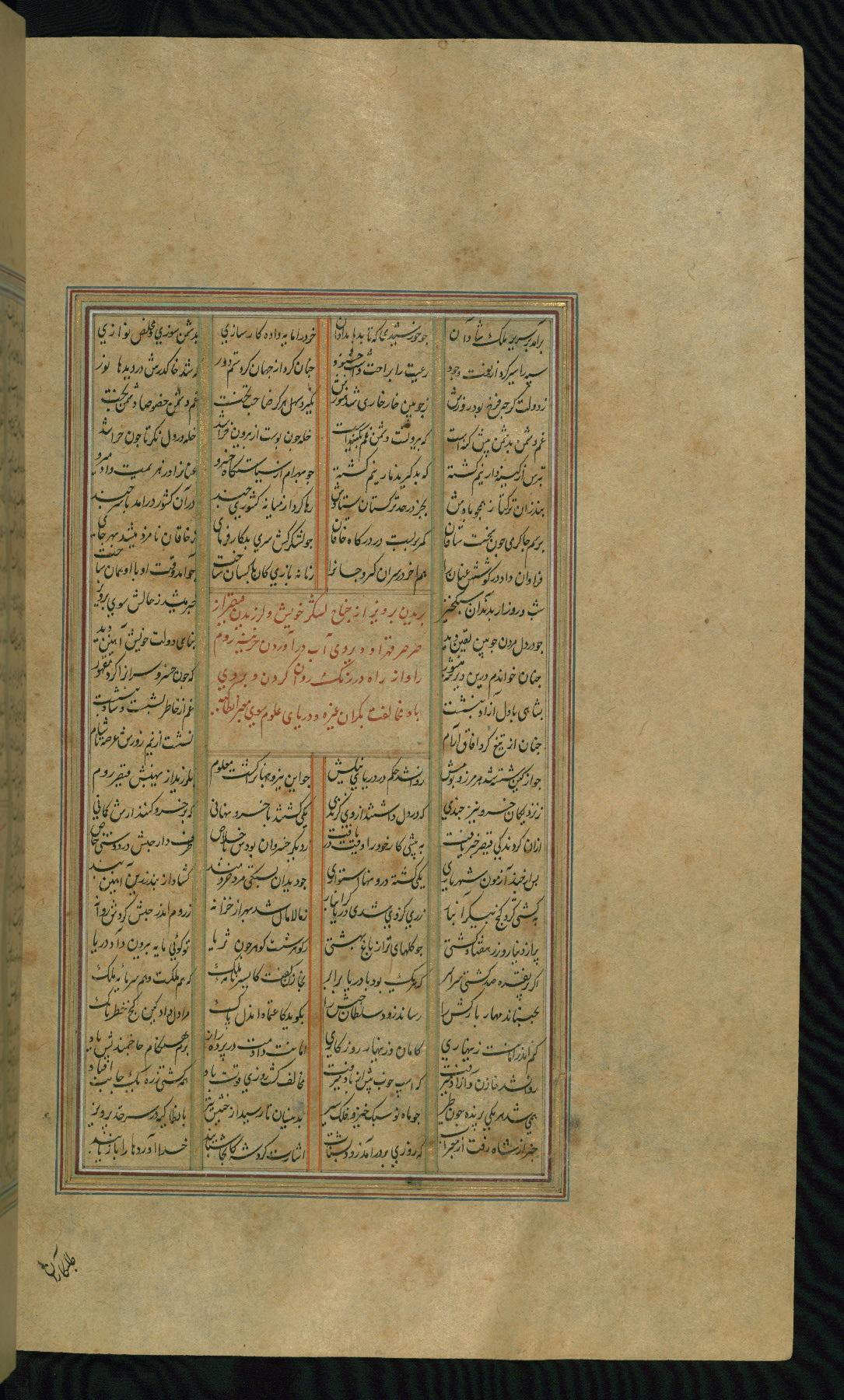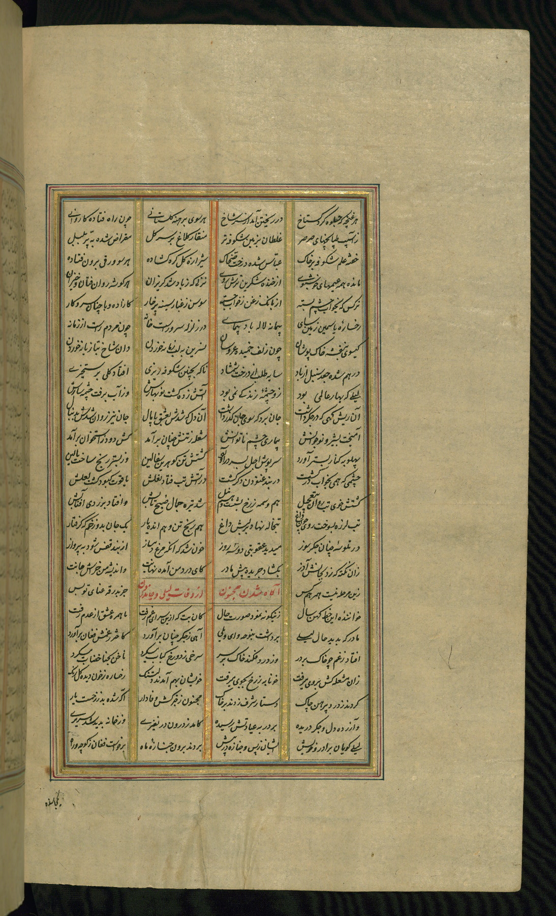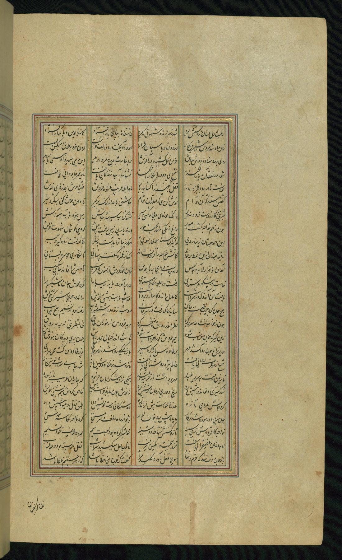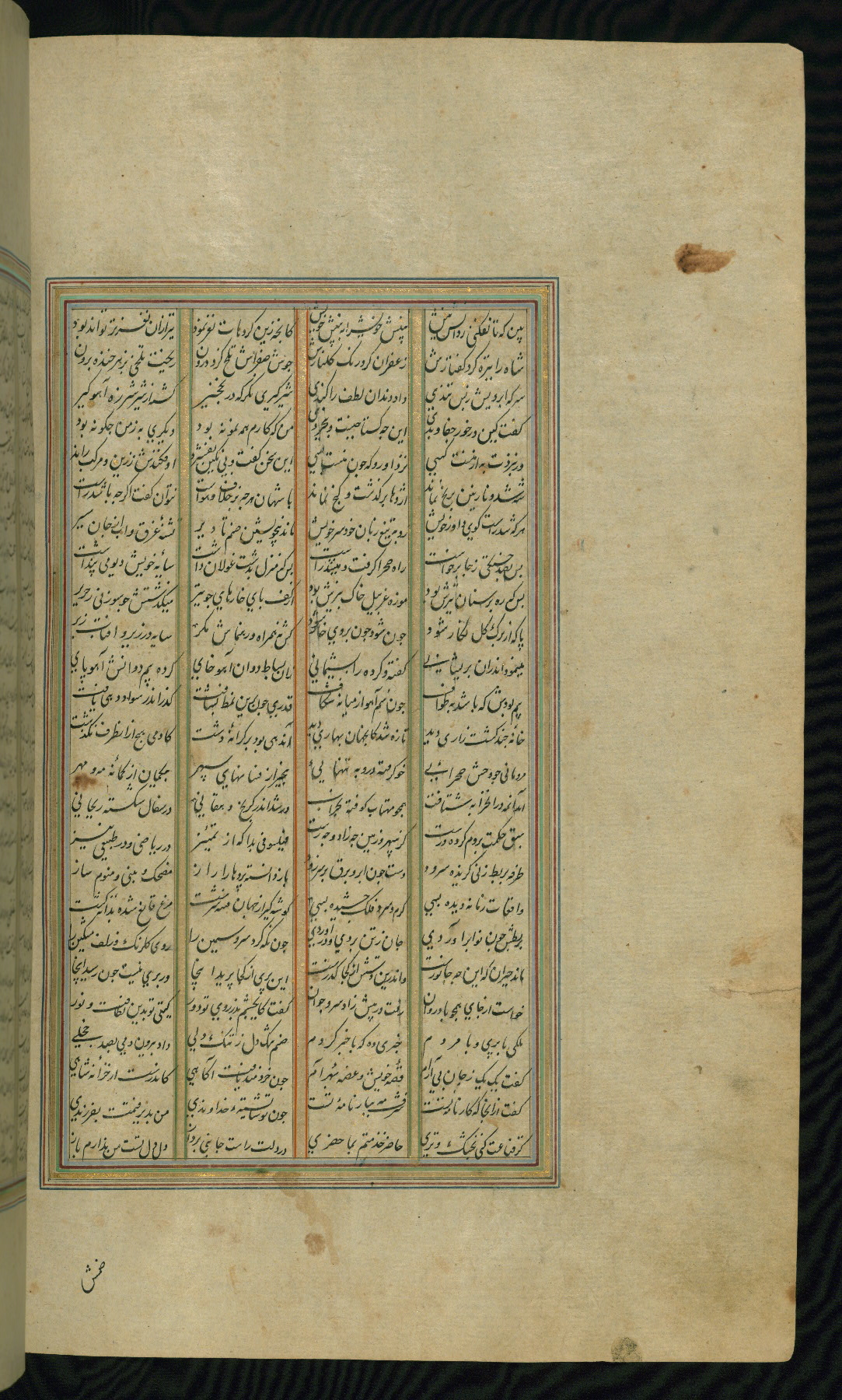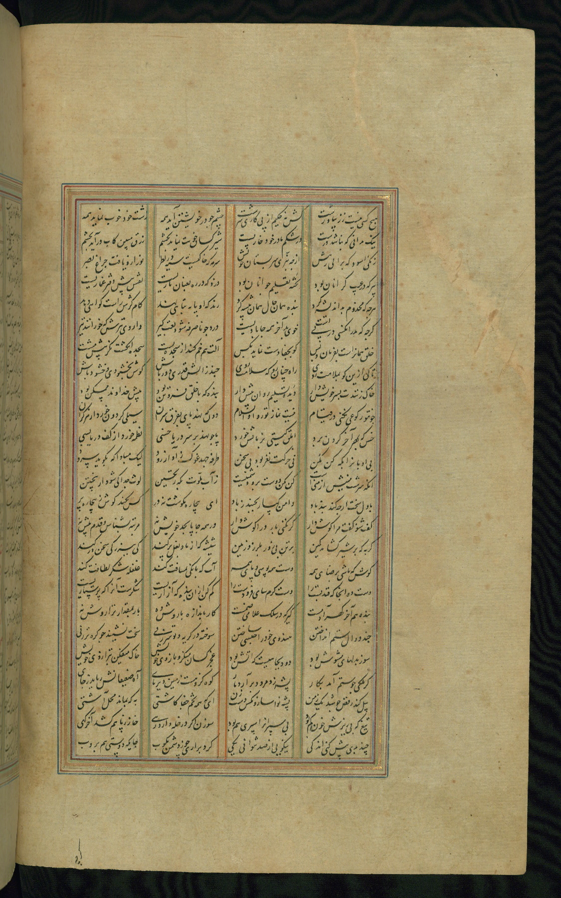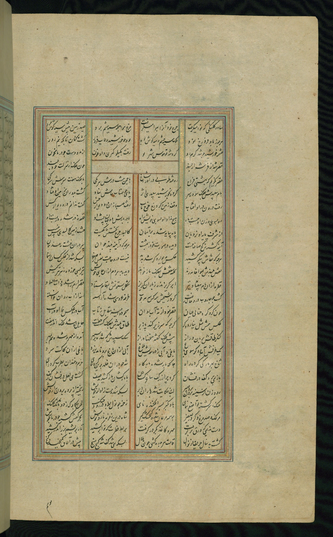 This illuminated and illustrated manuscript contains the Khamsah (quintet) and two historical poems (masnavi), Qirān-i saʿdayn and Nuh sipihr, by Amīr Khusraw Dihlavī (d. 725 AH / 1325 CE). The codex is dated 1017 AH / 1609 CE and was produced in Safavid Iran. All texts are written in black nastaʿlīq script with chapter headings in red. The manuscript opens with an illuminated and illustrated frontispiece of a hunting and court scene in the early Safavid style (fols. 1b-2a). The first text is Khamsah-i Dihlavī (fols. 2b-192a), which is introduced by an illuminated incipit and titlepiece with the title of the first poem of the quintet and the author's name. The second text is Qirān-i saʿdayn, a historical poem (masnavi) about the meeting of Sultan Muʿizz al-Dīn Kayqubād and his father, Nāṣir al-Din Bughrā Khān, on the banks of the Sarjū in Oudh. It is also introduced with an illuminated incipit and titlepiece (fol. 193b). The third text is Nuh sipihr, a historical poem (masnavi) describing the glories of Sultan Quṭb al-Dīn Mubārak Shāh Khaljī’s time, introduced with an illuminated incipit and headpiece (fol. 223b). The dark brown leather binding is original to the manuscript.