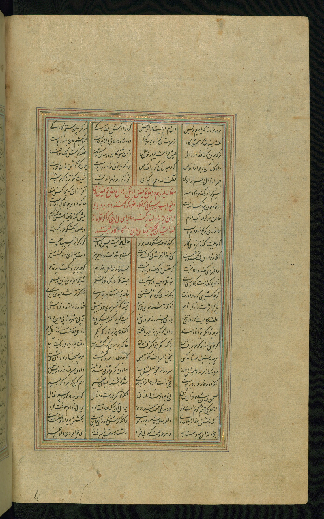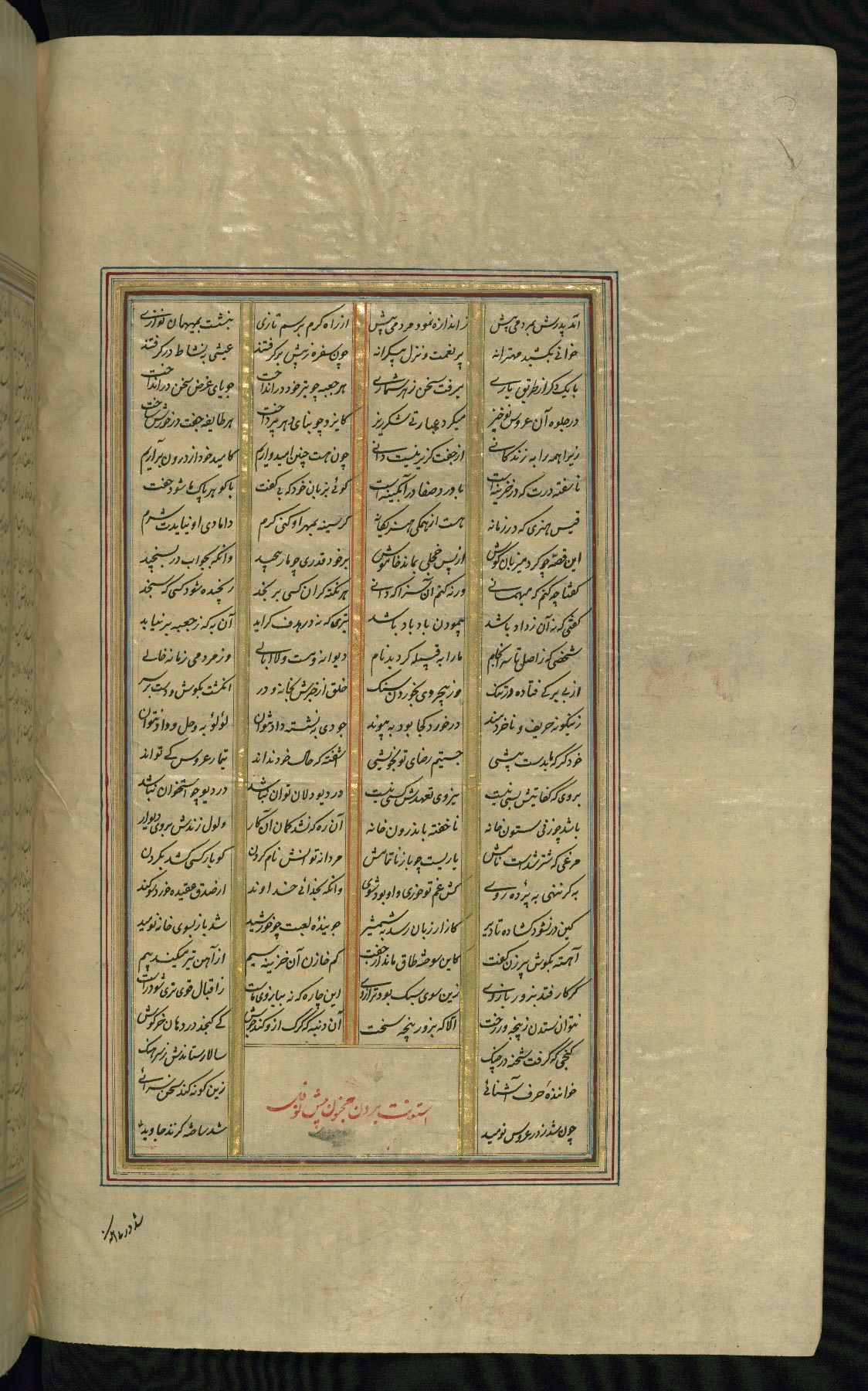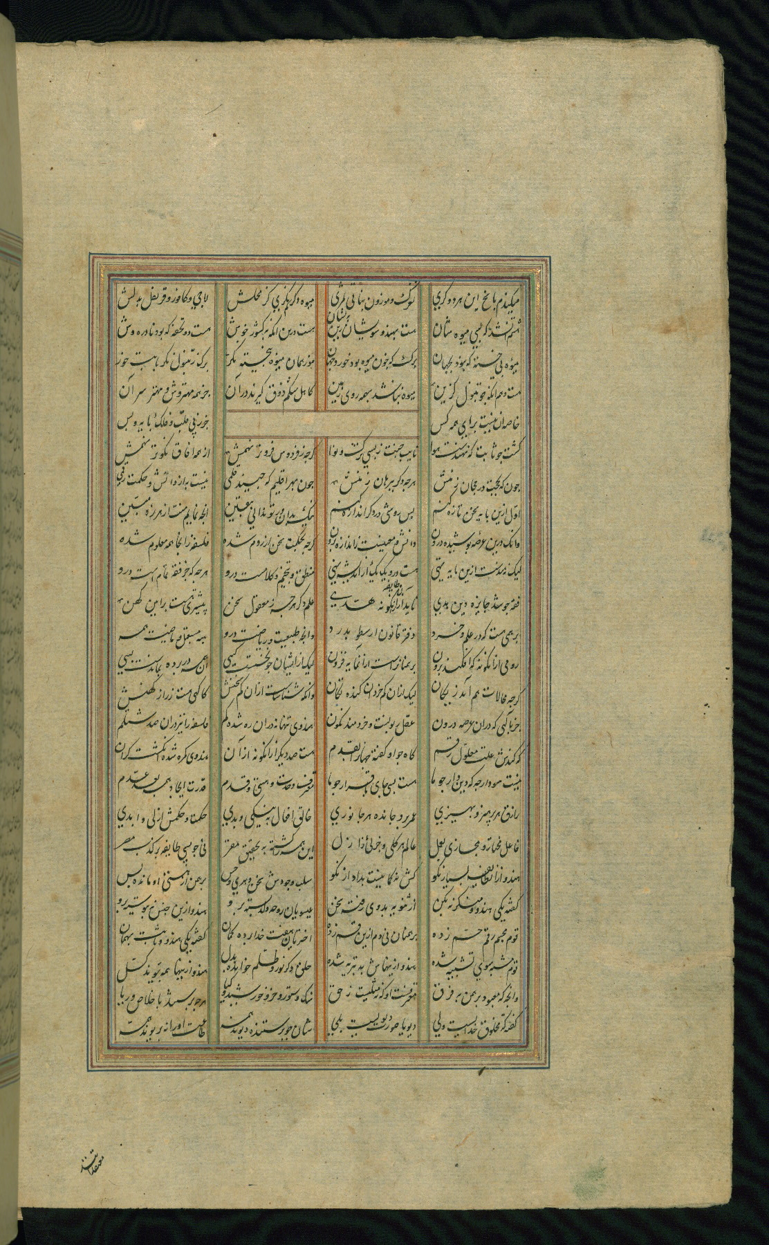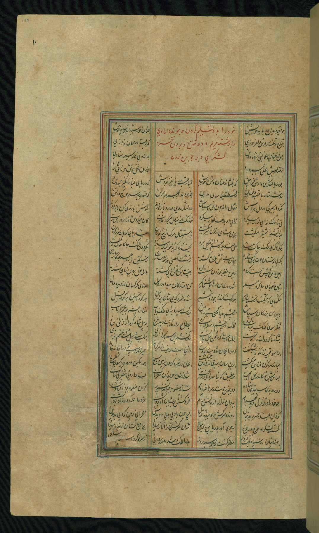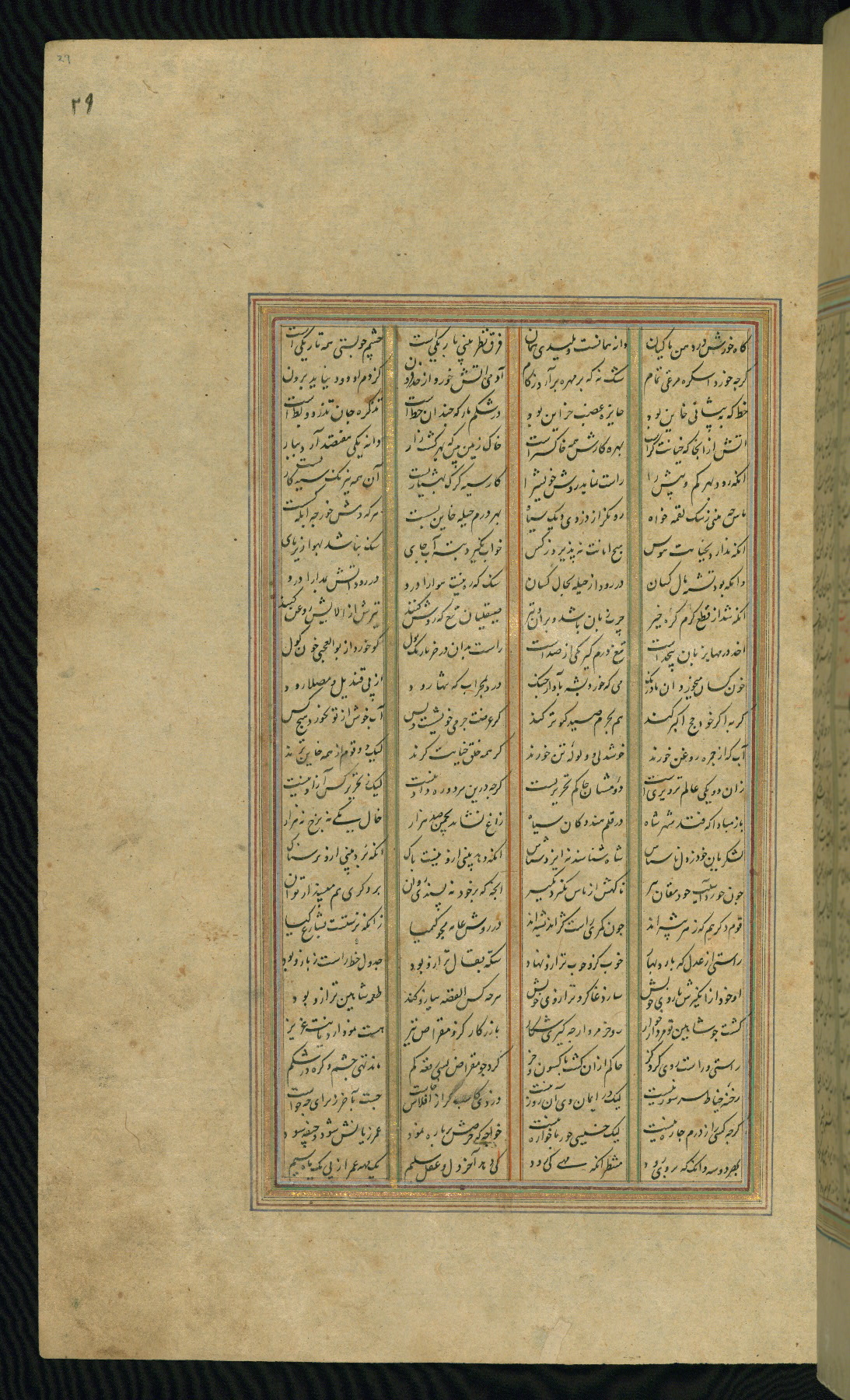 This illuminated and illustrated manuscript contains the Khamsah (quintet) and two historical poems (masnavi), Qirān-i saʿdayn and Nuh sipihr, by Amīr Khusraw Dihlavī (d. 725 AH / 1325 CE). The codex is dated 1017 AH / 1609 CE and was produced in Safavid Iran. All texts are written in black nastaʿlīq script with chapter headings in red. The manuscript opens with an illuminated and illustrated frontispiece of a hunting and court scene in the early Safavid style (fols. 1b-2a). The first text is Khamsah-i Dihlavī (fols. 2b-192a), which is introduced by an illuminated incipit and titlepiece with the title of the first poem of the quintet and the author's name. The second text is Qirān-i saʿdayn, a historical poem (masnavi) about the meeting of Sultan Muʿizz al-Dīn Kayqubād and his father, Nāṣir al-Din Bughrā Khān, on the banks of the Sarjū in Oudh. It is also introduced with an illuminated incipit and titlepiece (fol. 193b). The third text is Nuh sipihr, a historical poem (masnavi) describing the glories of Sultan Quṭb al-Dīn Mubārak Shāh Khaljī’s time, introduced with an illuminated incipit and headpiece (fol. 223b). The dark brown leather binding is original to the manuscript.
