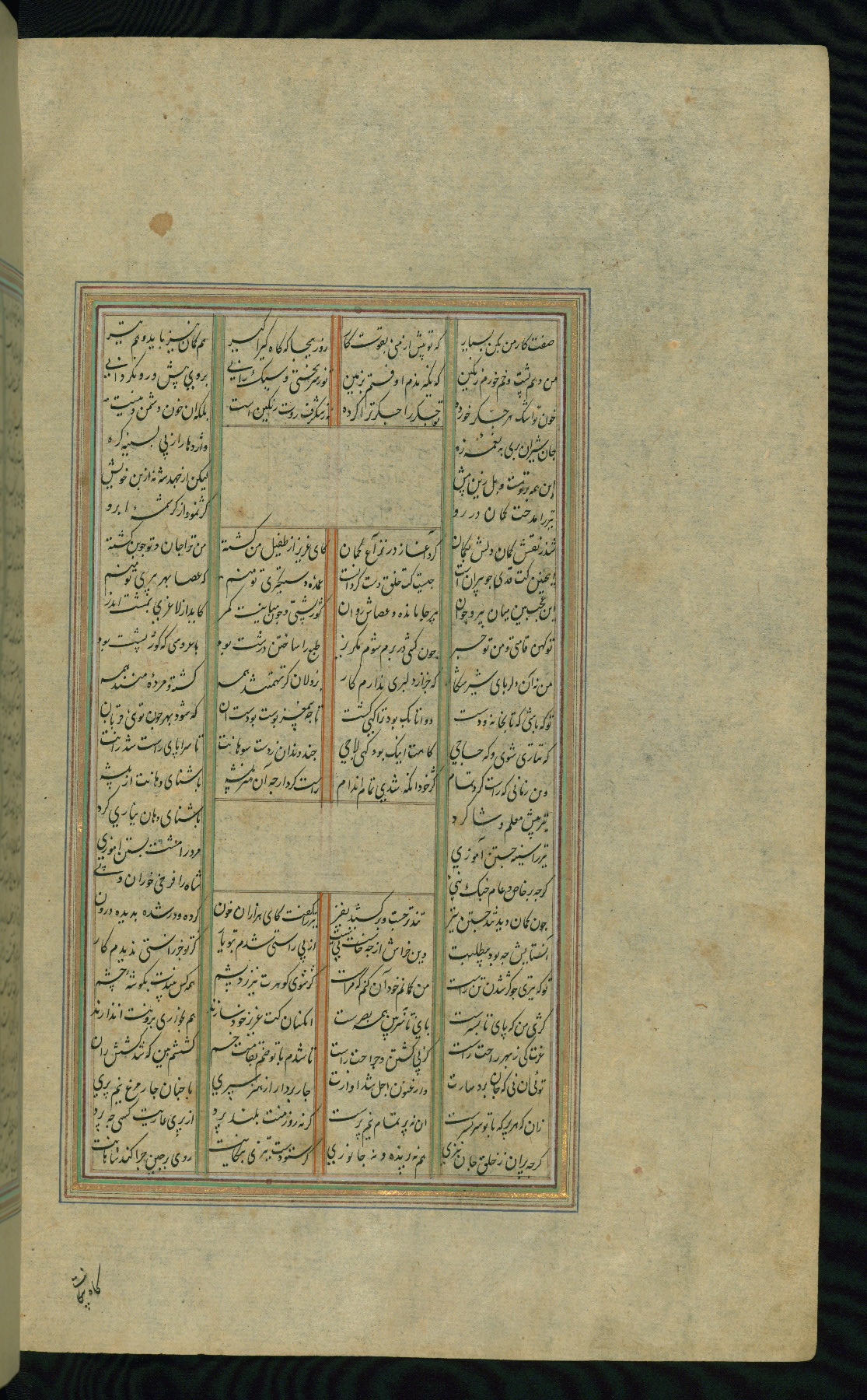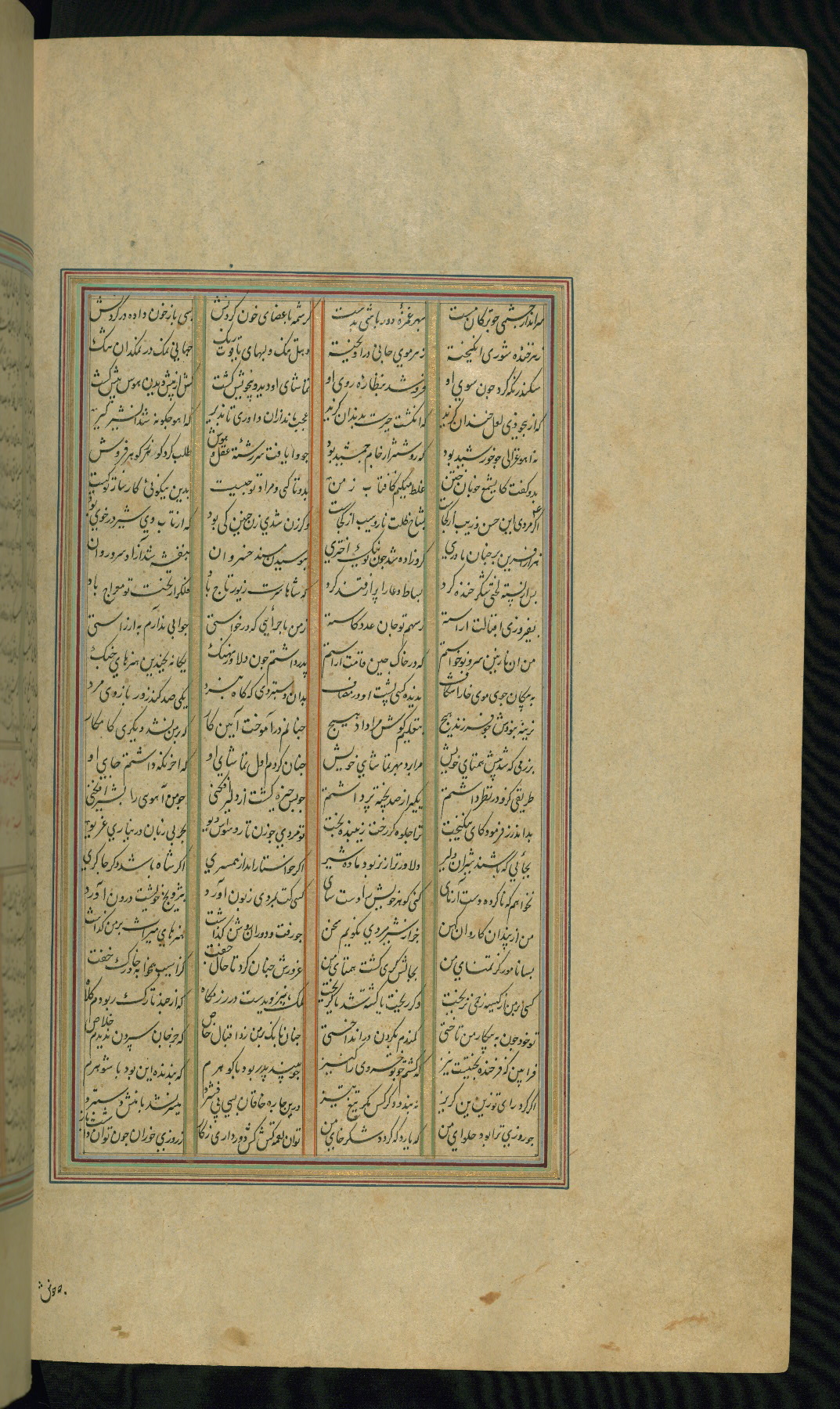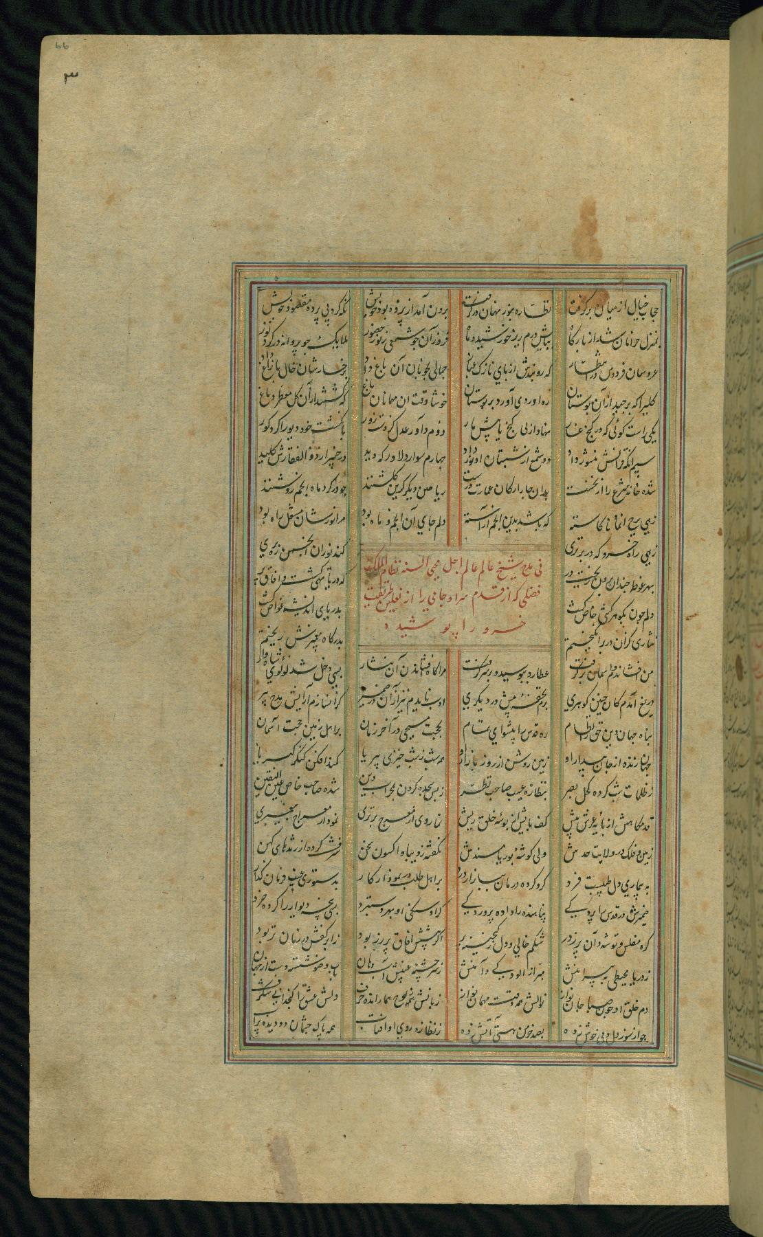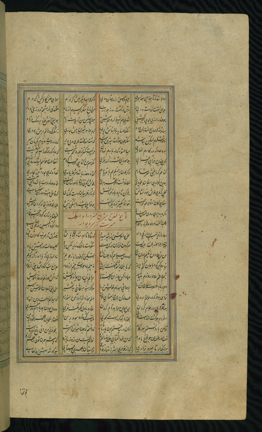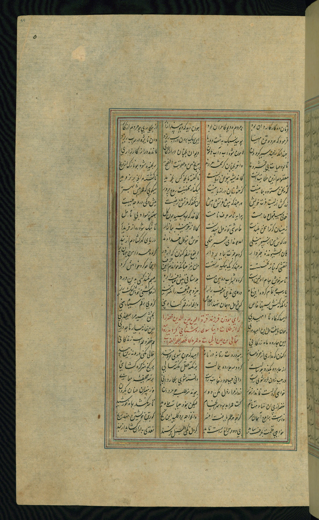 This illuminated and illustrated manuscript contains the Khamsah (quintet) and two historical poems (masnavi), Qirān-i saʿdayn and Nuh sipihr, by Amīr Khusraw Dihlavī (d. 725 AH / 1325 CE). The codex is dated 1017 AH / 1609 CE and was produced in Safavid Iran. All texts are written in black nastaʿlīq script with chapter headings in red. The manuscript opens with an illuminated and illustrated frontispiece of a hunting and court scene in the early Safavid style (fols. 1b-2a). The first text is Khamsah-i Dihlavī (fols. 2b-192a), which is introduced by an illuminated incipit and titlepiece with the title of the first poem of the quintet and the author's name. The second text is Qirān-i saʿdayn, a historical poem (masnavi) about the meeting of Sultan Muʿizz al-Dīn Kayqubād and his father, Nāṣir al-Din Bughrā Khān, on the banks of the Sarjū in Oudh. It is also introduced with an illuminated incipit and titlepiece (fol. 193b). The third text is Nuh sipihr, a historical poem (masnavi) describing the glories of Sultan Quṭb al-Dīn Mubārak Shāh Khaljī’s time, introduced with an illuminated incipit and headpiece (fol. 223b). The dark brown leather binding is original to the manuscript.
