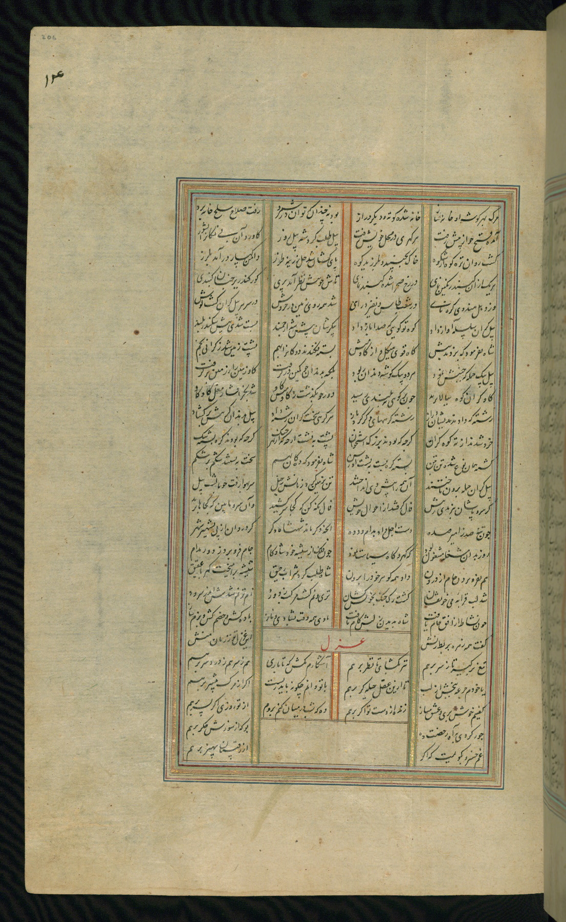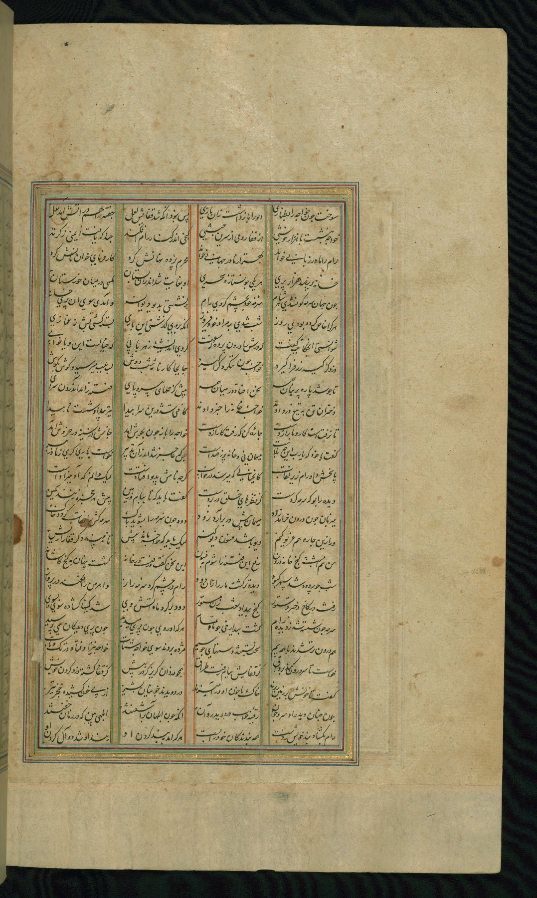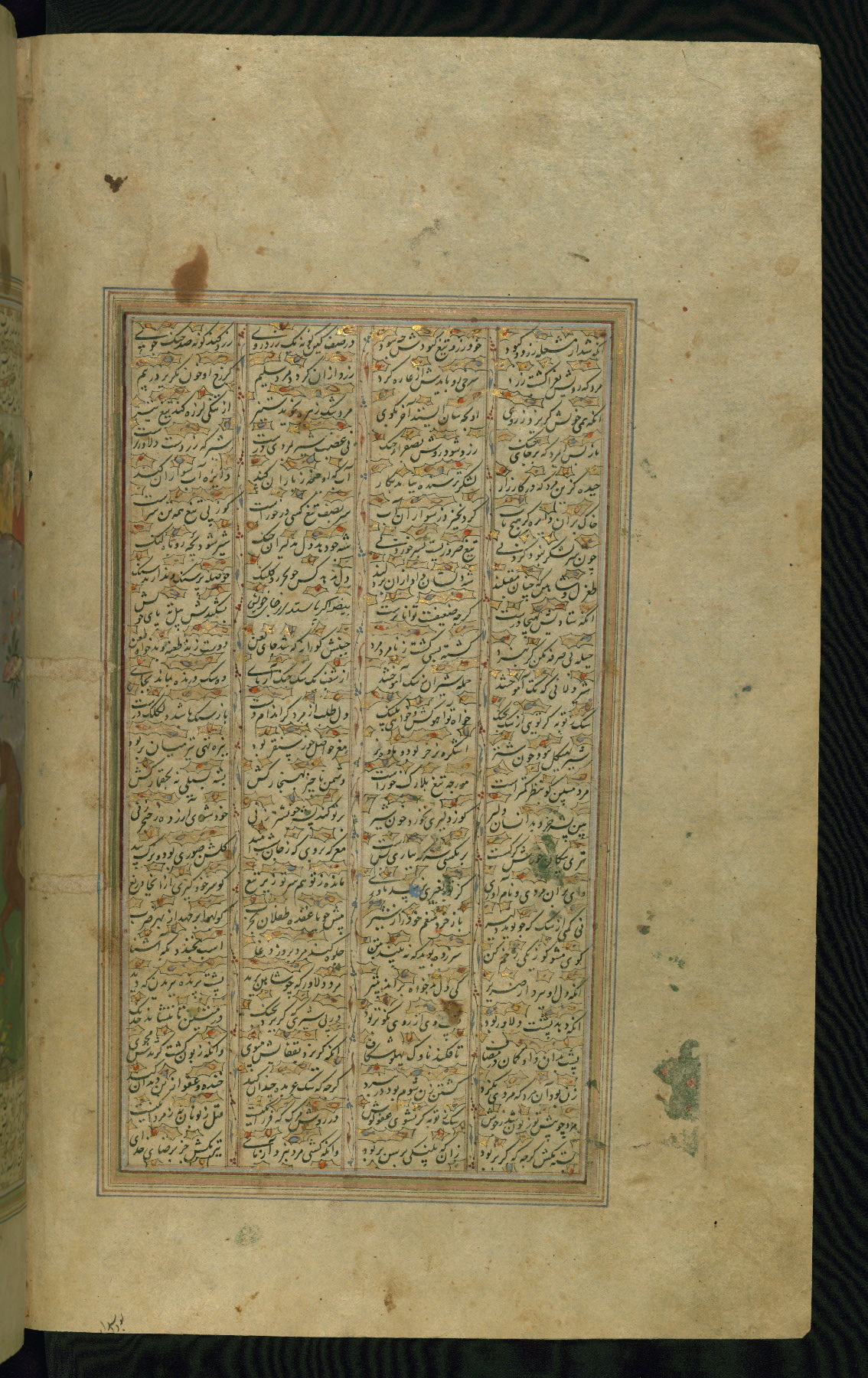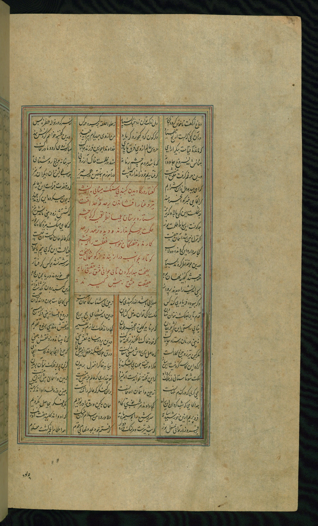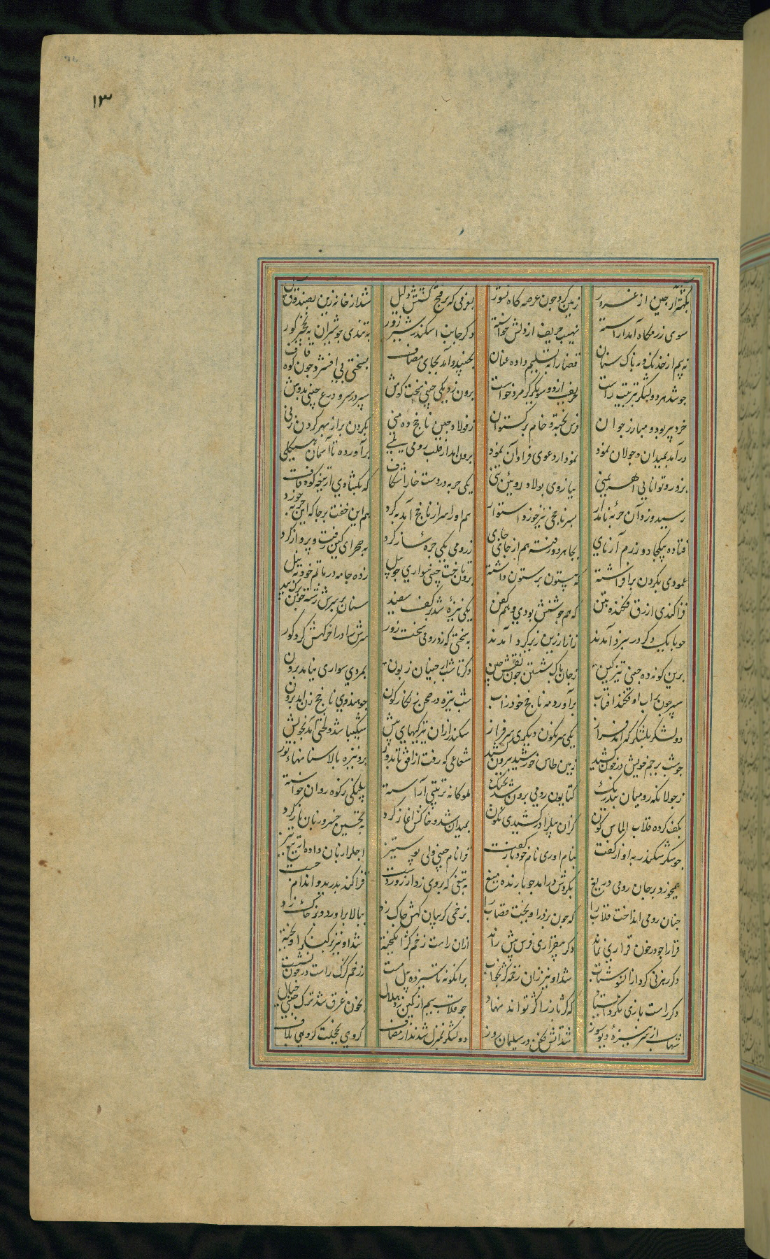 This illuminated and illustrated manuscript contains the Khamsah (quintet) and two historical poems (masnavi), Qirān-i saʿdayn and Nuh sipihr, by Amīr Khusraw Dihlavī (d. 725 AH / 1325 CE). The codex is dated 1017 AH / 1609 CE and was produced in Safavid Iran. All texts are written in black nastaʿlīq script with chapter headings in red. The manuscript opens with an illuminated and illustrated frontispiece of a hunting and court scene in the early Safavid style (fols. 1b-2a). The first text is Khamsah-i Dihlavī (fols. 2b-192a), which is introduced by an illuminated incipit and titlepiece with the title of the first poem of the quintet and the author's name. The second text is Qirān-i saʿdayn, a historical poem (masnavi) about the meeting of Sultan Muʿizz al-Dīn Kayqubād and his father, Nāṣir al-Din Bughrā Khān, on the banks of the Sarjū in Oudh. It is also introduced with an illuminated incipit and titlepiece (fol. 193b). The third text is Nuh sipihr, a historical poem (masnavi) describing the glories of Sultan Quṭb al-Dīn Mubārak Shāh Khaljī’s time, introduced with an illuminated incipit and headpiece (fol. 223b). The dark brown leather binding is original to the manuscript.