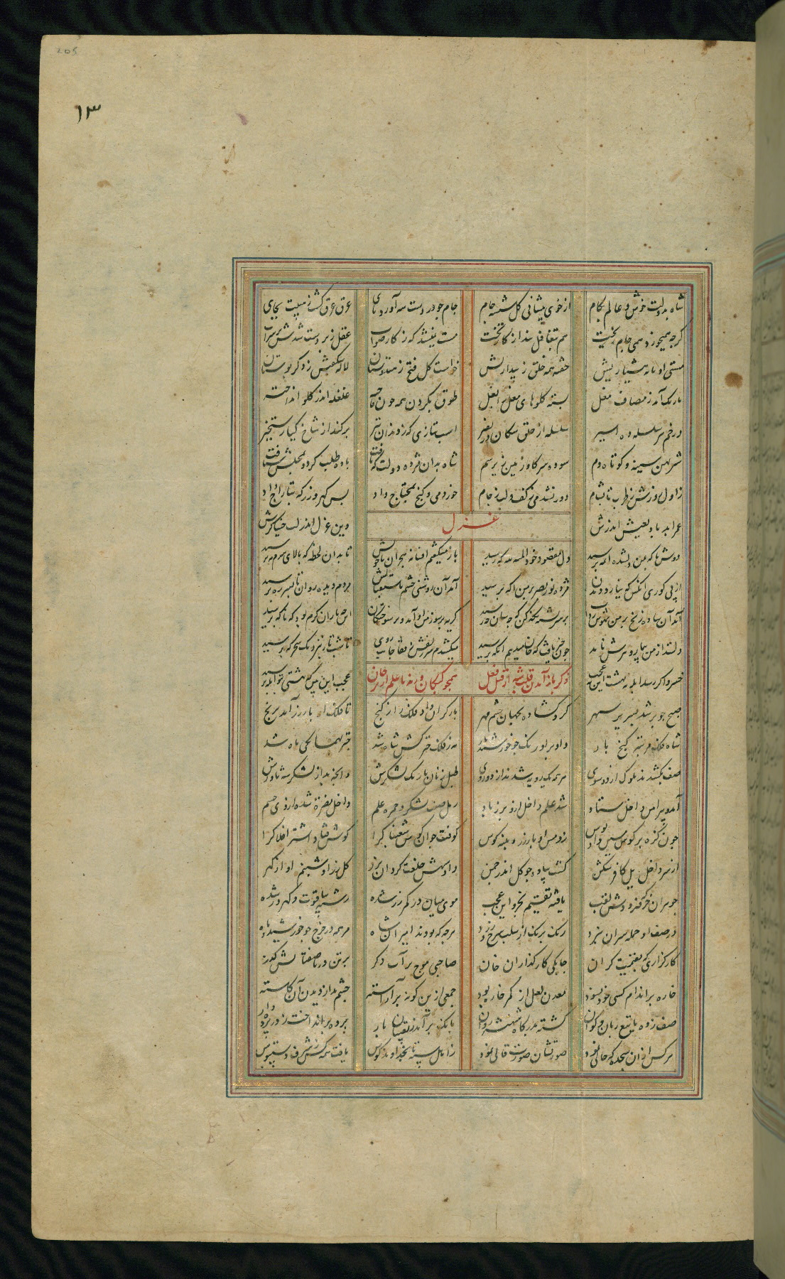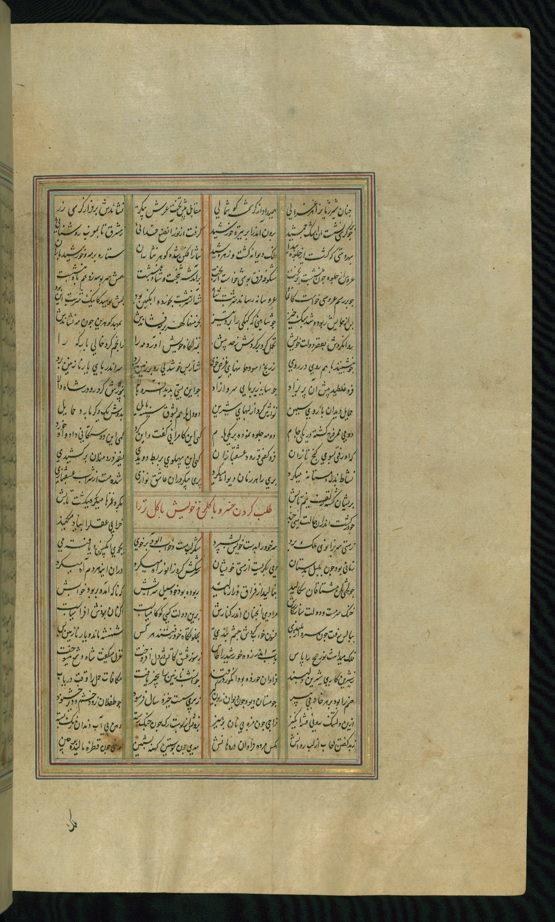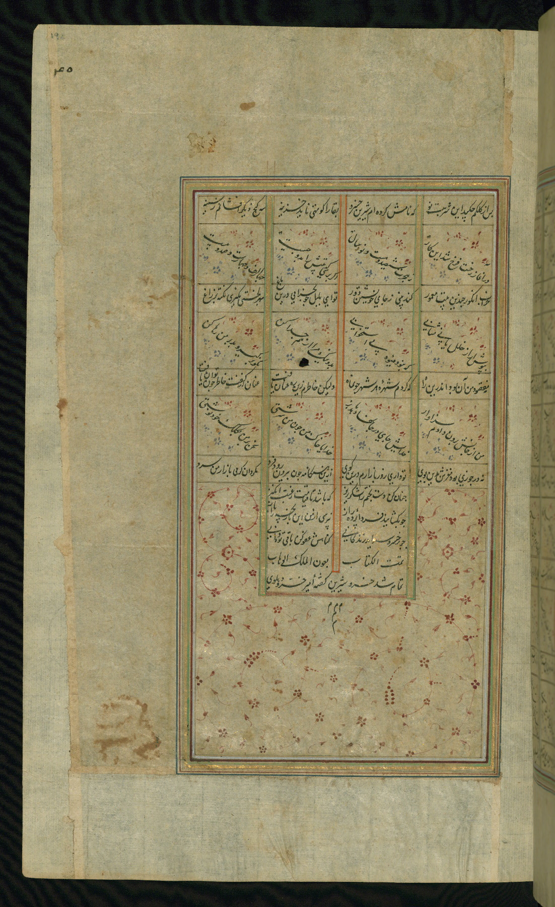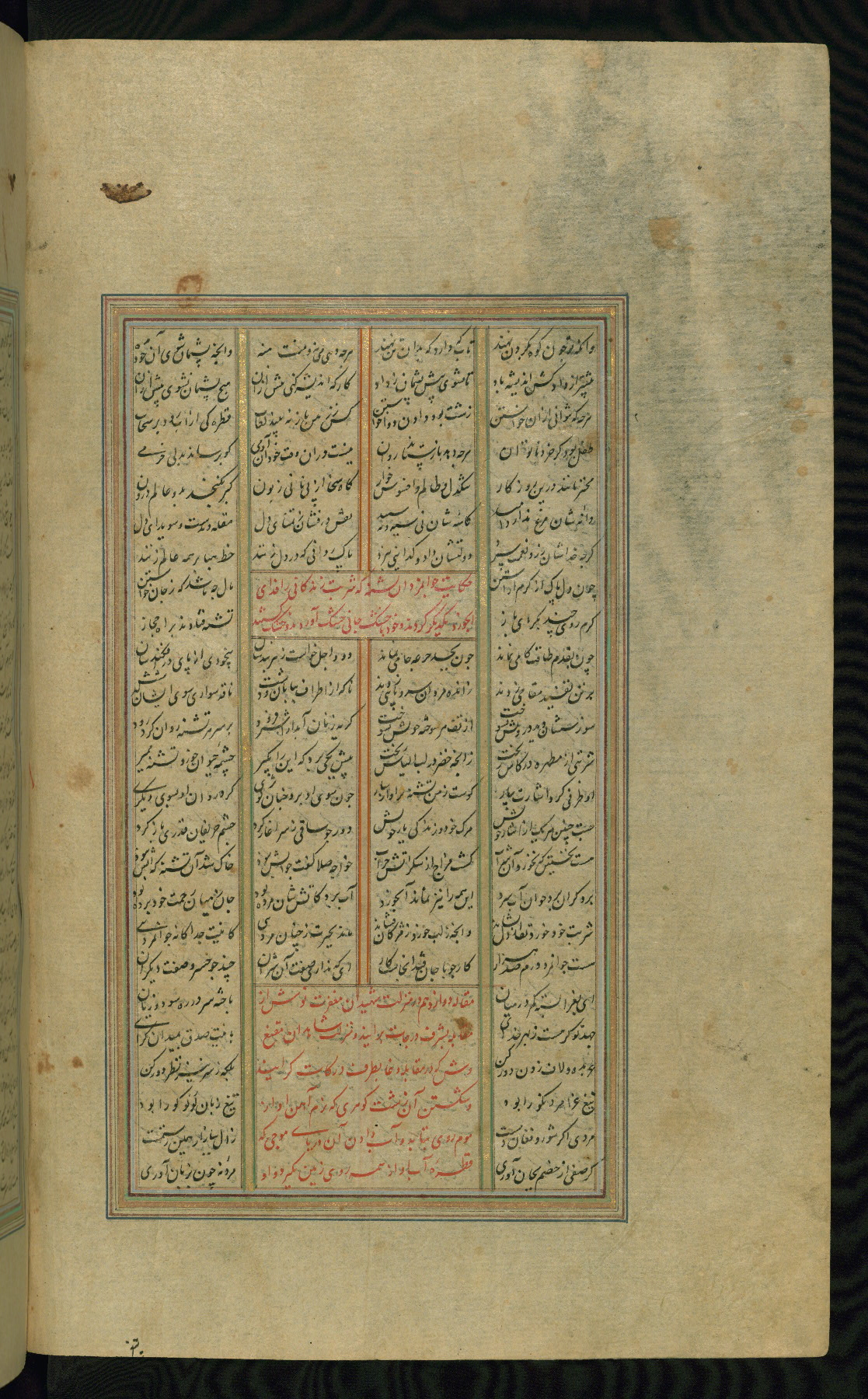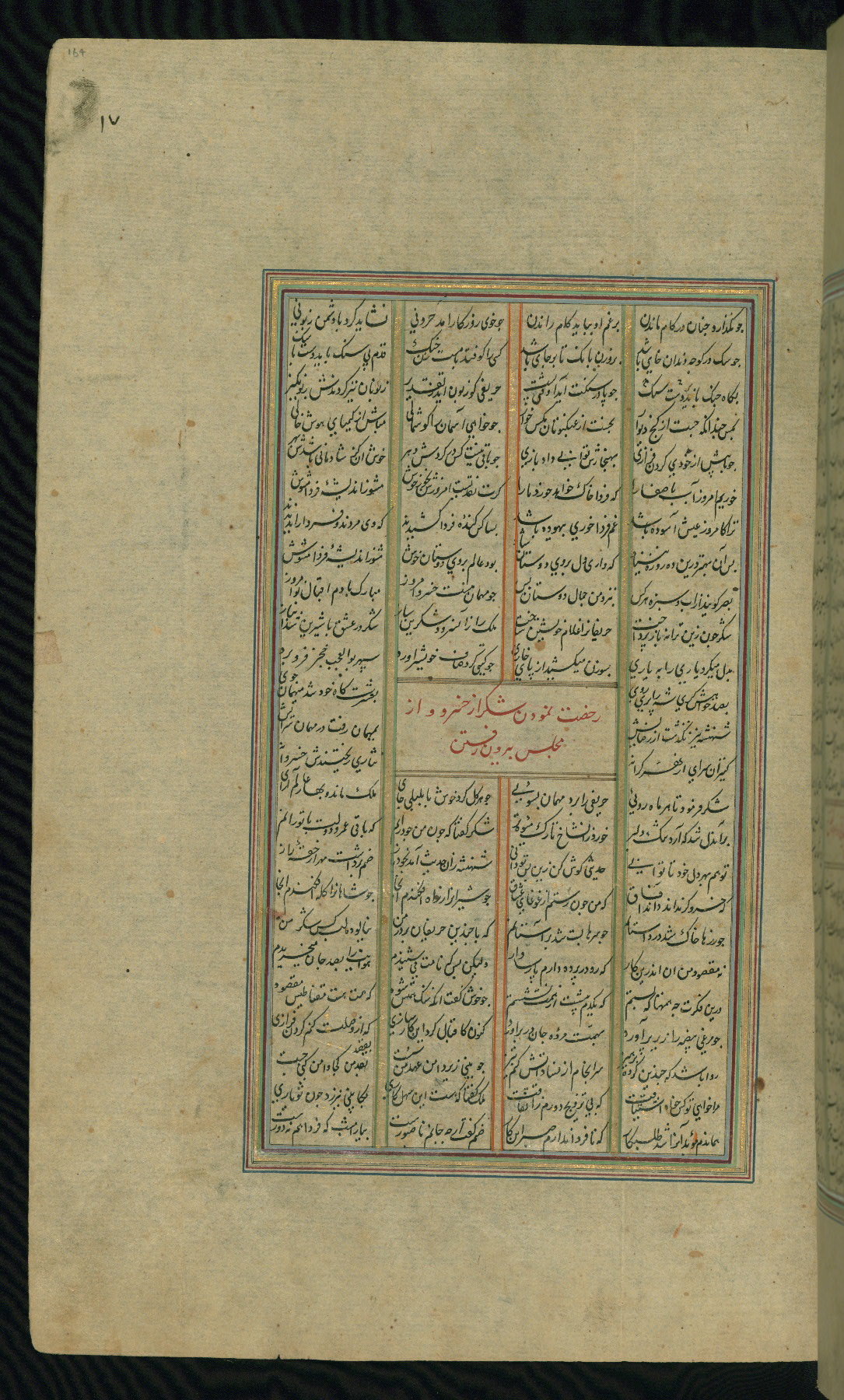 This illuminated and illustrated manuscript contains the Khamsah (quintet) and two historical poems (masnavi), Qirān-i saʿdayn and Nuh sipihr, by Amīr Khusraw Dihlavī (d. 725 AH / 1325 CE). The codex is dated 1017 AH / 1609 CE and was produced in Safavid Iran. All texts are written in black nastaʿlīq script with chapter headings in red. The manuscript opens with an illuminated and illustrated frontispiece of a hunting and court scene in the early Safavid style (fols. 1b-2a). The first text is Khamsah-i Dihlavī (fols. 2b-192a), which is introduced by an illuminated incipit and titlepiece with the title of the first poem of the quintet and the author's name. The second text is Qirān-i saʿdayn, a historical poem (masnavi) about the meeting of Sultan Muʿizz al-Dīn Kayqubād and his father, Nāṣir al-Din Bughrā Khān, on the banks of the Sarjū in Oudh. It is also introduced with an illuminated incipit and titlepiece (fol. 193b). The third text is Nuh sipihr, a historical poem (masnavi) describing the glories of Sultan Quṭb al-Dīn Mubārak Shāh Khaljī’s time, introduced with an illuminated incipit and headpiece (fol. 223b). The dark brown leather binding is original to the manuscript.
