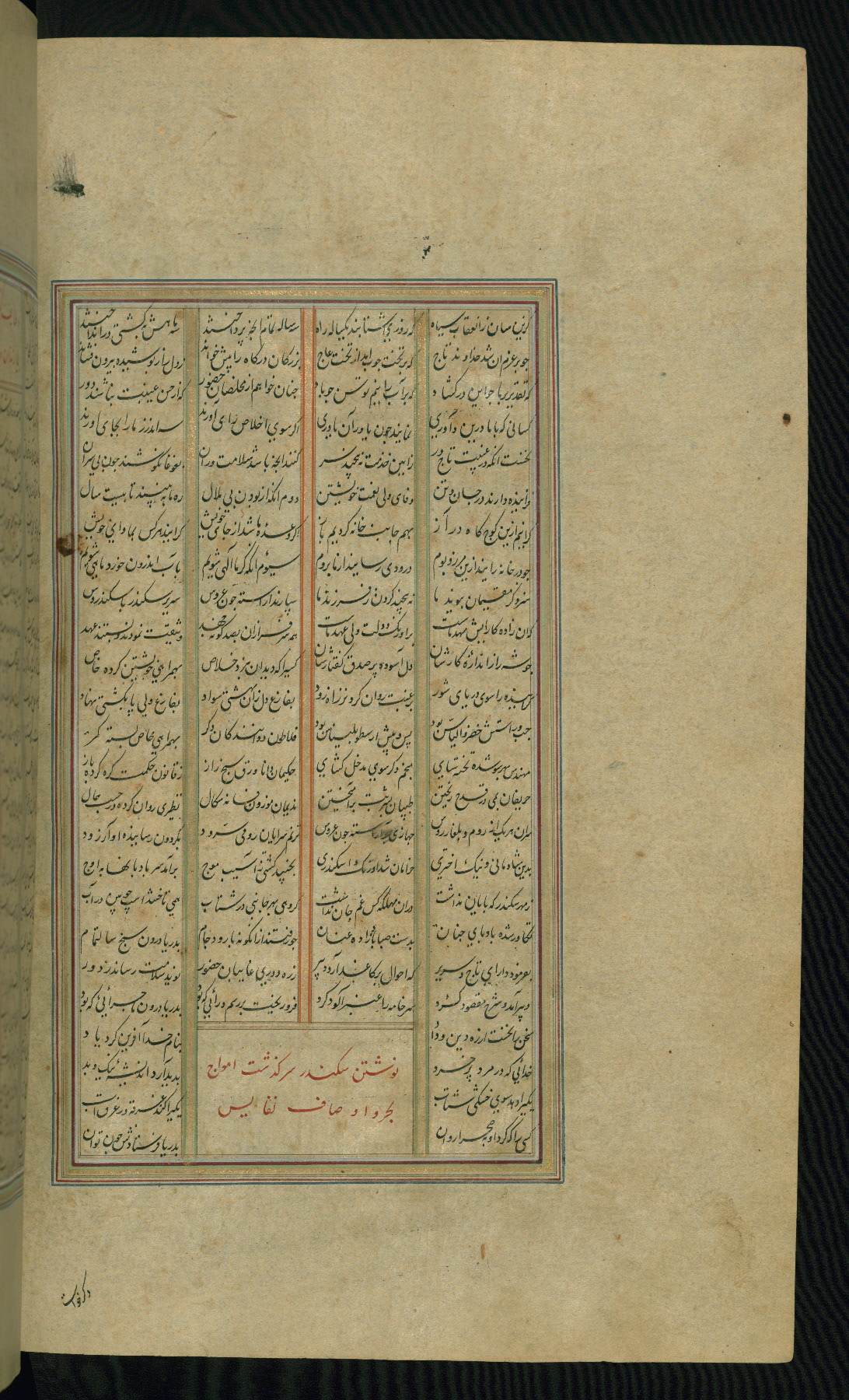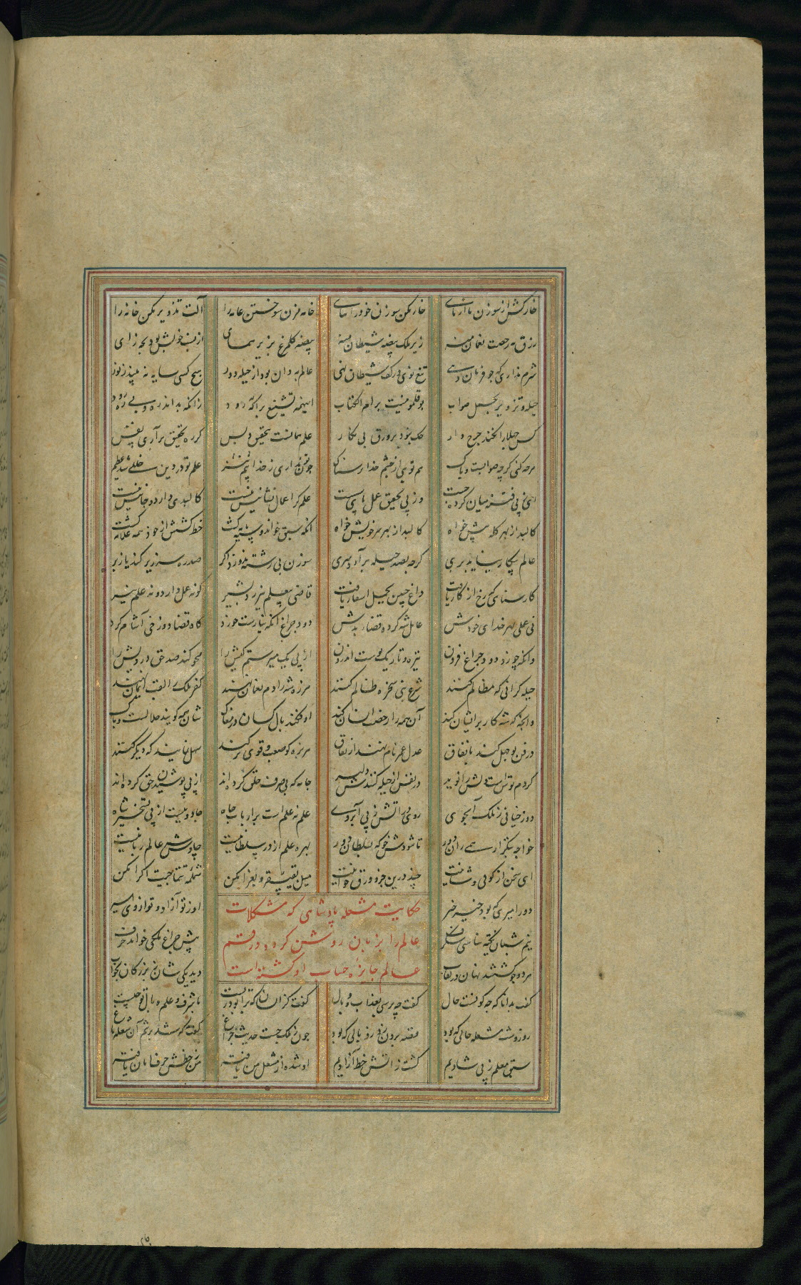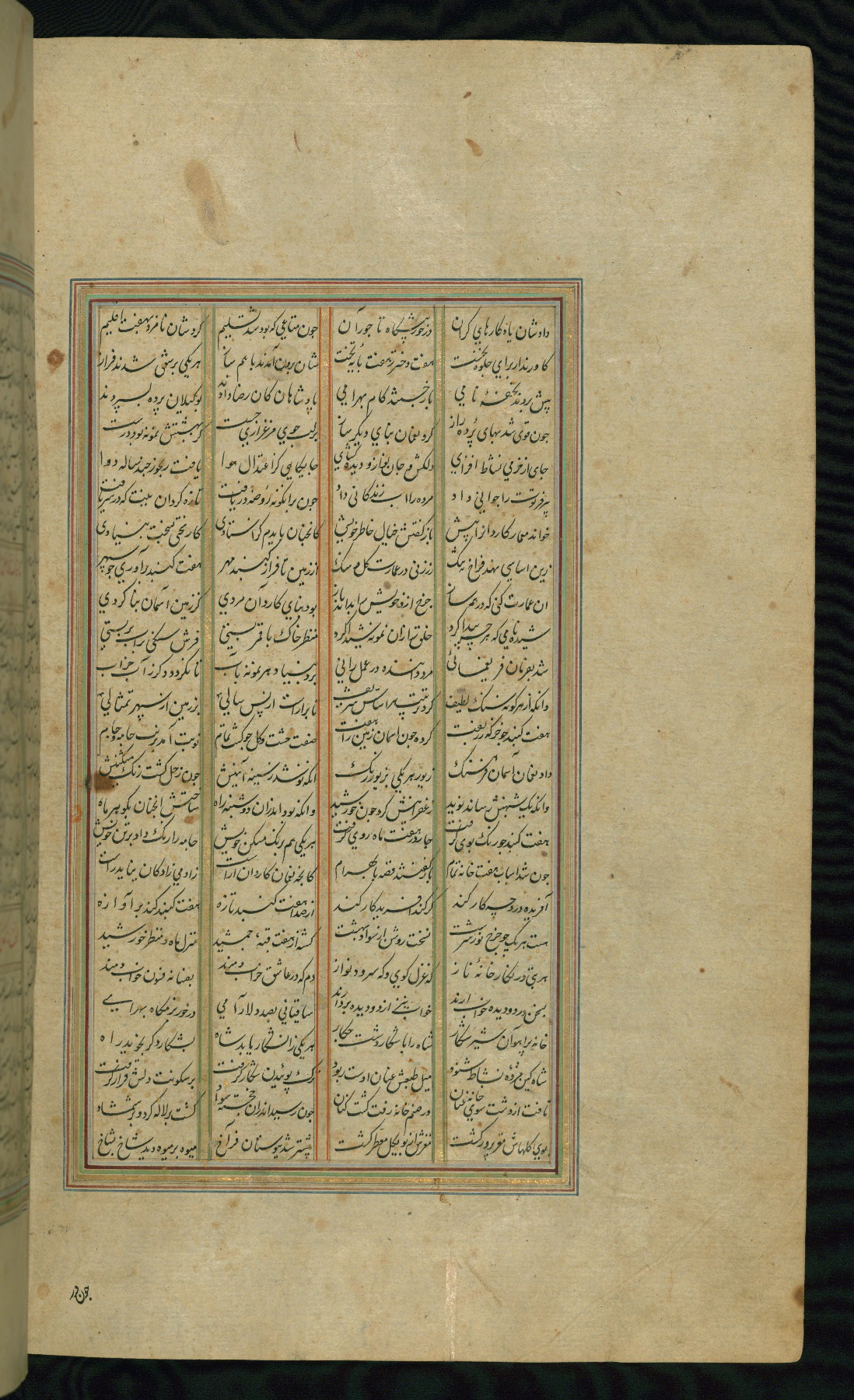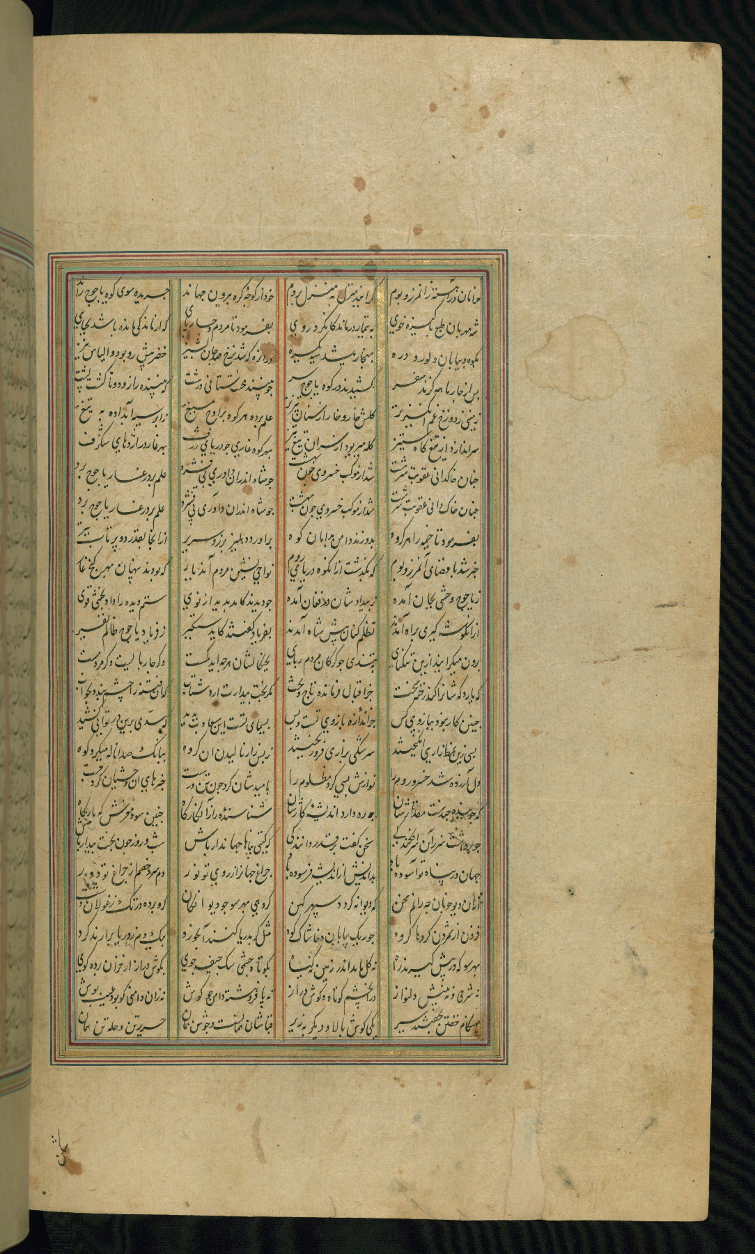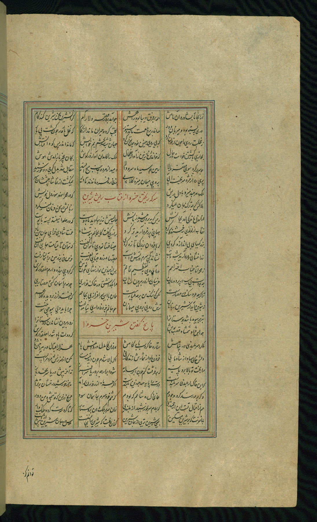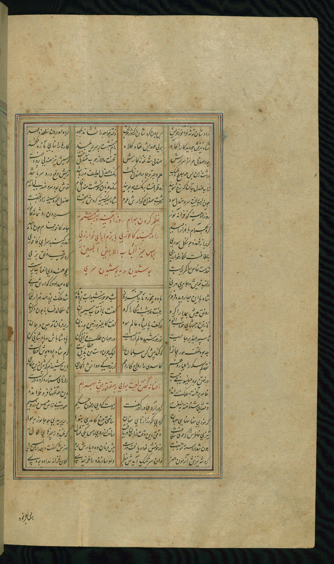 This illuminated and illustrated manuscript contains the Khamsah (quintet) and two historical poems (masnavi), Qirān-i saʿdayn and Nuh sipihr, by Amīr Khusraw Dihlavī (d. 725 AH / 1325 CE). The codex is dated 1017 AH / 1609 CE and was produced in Safavid Iran. All texts are written in black nastaʿlīq script with chapter headings in red. The manuscript opens with an illuminated and illustrated frontispiece of a hunting and court scene in the early Safavid style (fols. 1b-2a). The first text is Khamsah-i Dihlavī (fols. 2b-192a), which is introduced by an illuminated incipit and titlepiece with the title of the first poem of the quintet and the author's name. The second text is Qirān-i saʿdayn, a historical poem (masnavi) about the meeting of Sultan Muʿizz al-Dīn Kayqubād and his father, Nāṣir al-Din Bughrā Khān, on the banks of the Sarjū in Oudh. It is also introduced with an illuminated incipit and titlepiece (fol. 193b). The third text is Nuh sipihr, a historical poem (masnavi) describing the glories of Sultan Quṭb al-Dīn Mubārak Shāh Khaljī’s time, introduced with an illuminated incipit and headpiece (fol. 223b). The dark brown leather binding is original to the manuscript.