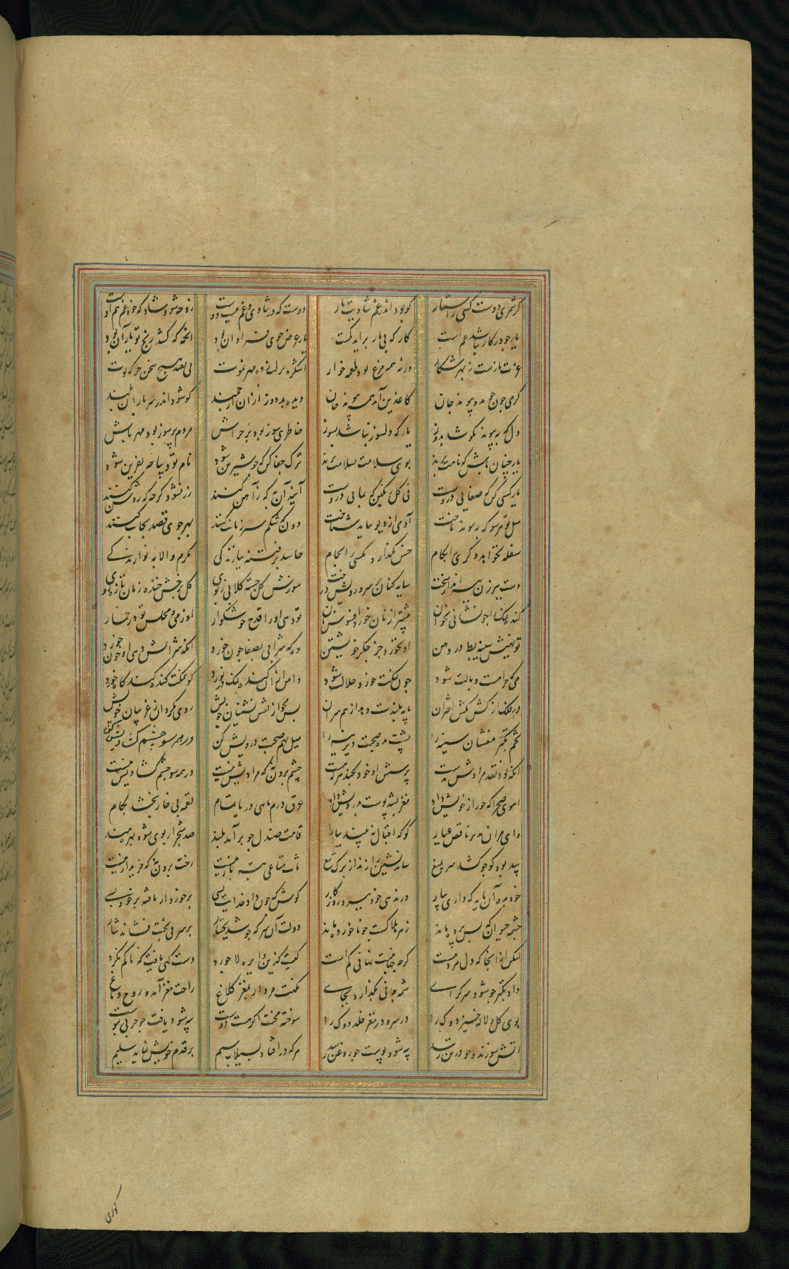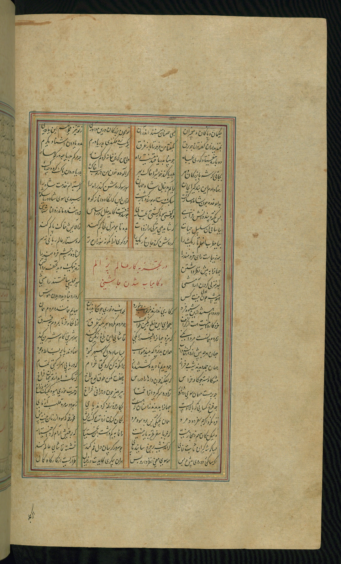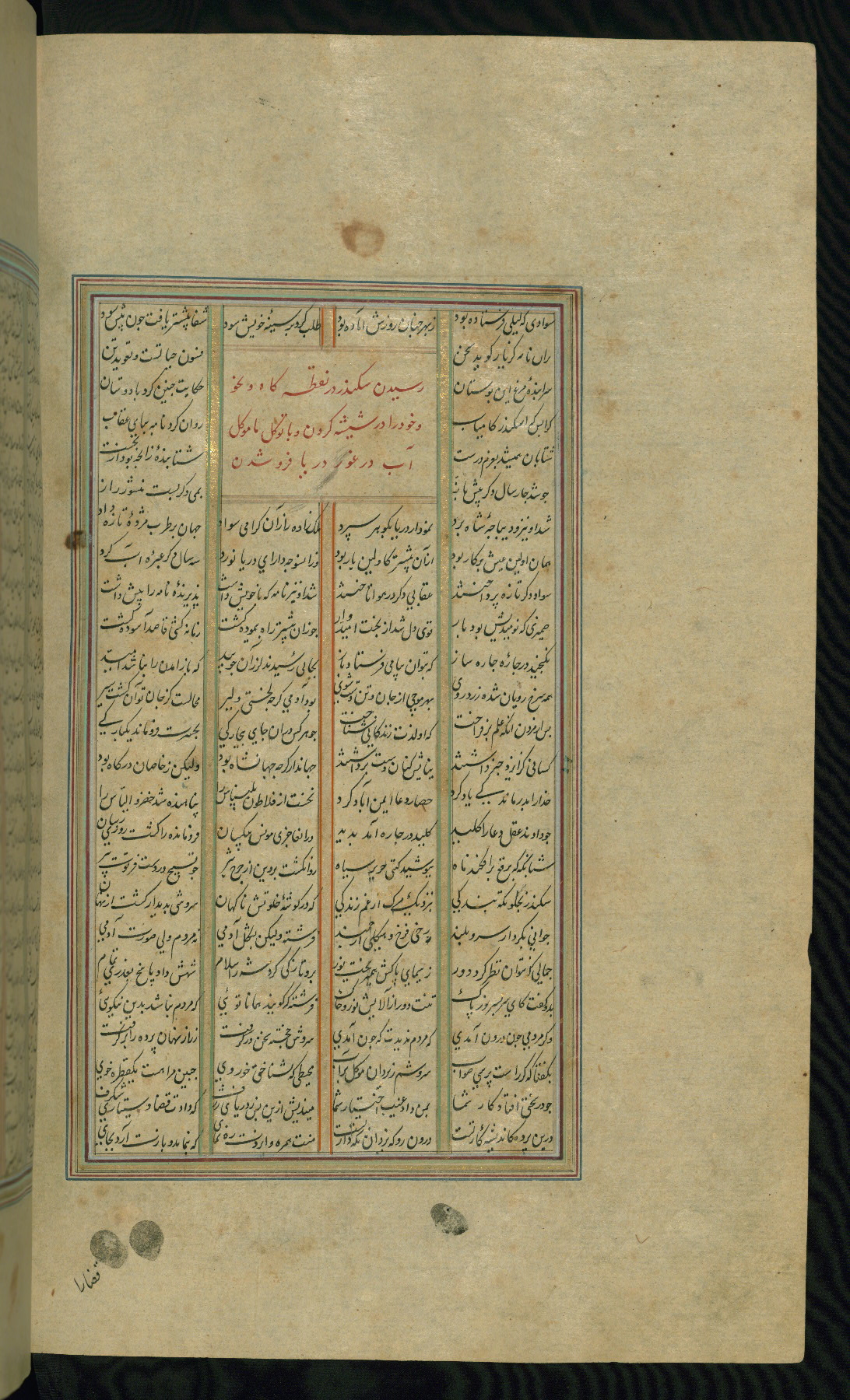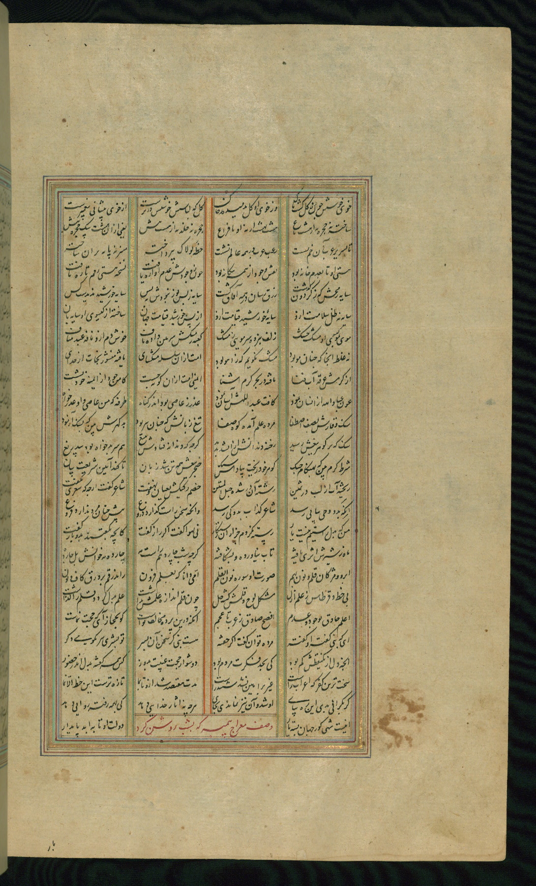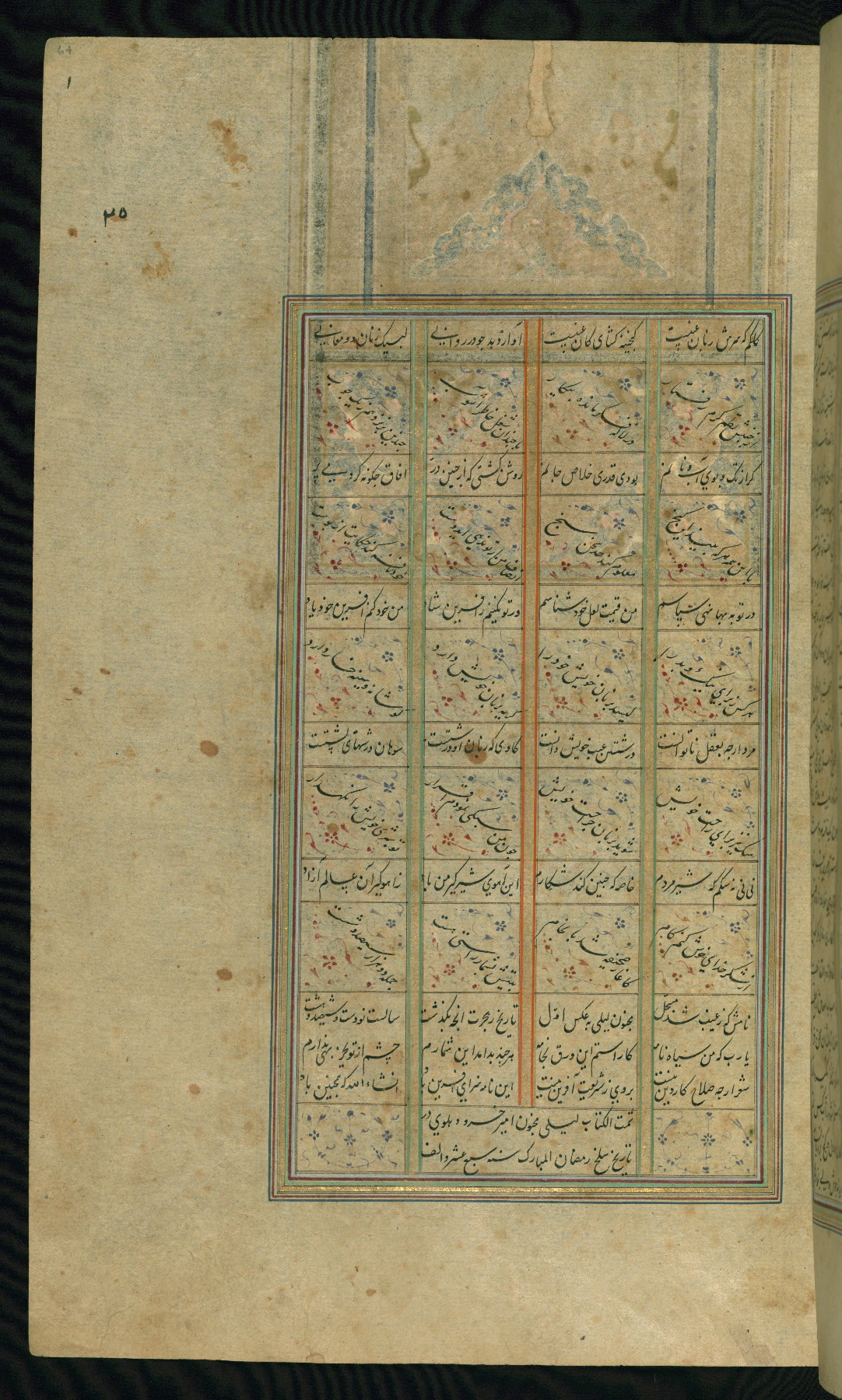 This illuminated and illustrated manuscript contains the Khamsah (quintet) and two historical poems (masnavi), Qirān-i saʿdayn and Nuh sipihr, by Amīr Khusraw Dihlavī (d. 725 AH / 1325 CE). The codex is dated 1017 AH / 1609 CE and was produced in Safavid Iran. All texts are written in black nastaʿlīq script with chapter headings in red. The manuscript opens with an illuminated and illustrated frontispiece of a hunting and court scene in the early Safavid style (fols. 1b-2a). The first text is Khamsah-i Dihlavī (fols. 2b-192a), which is introduced by an illuminated incipit and titlepiece with the title of the first poem of the quintet and the author's name. The second text is Qirān-i saʿdayn, a historical poem (masnavi) about the meeting of Sultan Muʿizz al-Dīn Kayqubād and his father, Nāṣir al-Din Bughrā Khān, on the banks of the Sarjū in Oudh. It is also introduced with an illuminated incipit and titlepiece (fol. 193b). The third text is Nuh sipihr, a historical poem (masnavi) describing the glories of Sultan Quṭb al-Dīn Mubārak Shāh Khaljī’s time, introduced with an illuminated incipit and headpiece (fol. 223b). The dark brown leather binding is original to the manuscript.