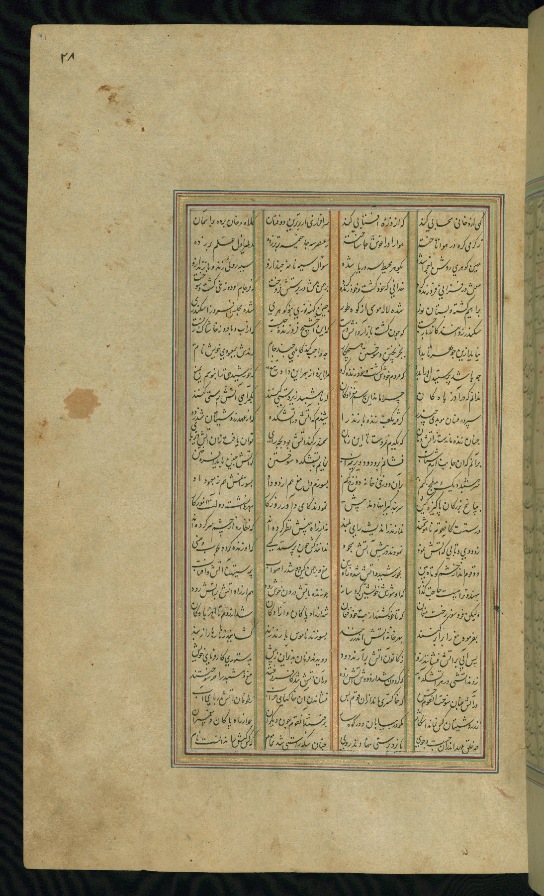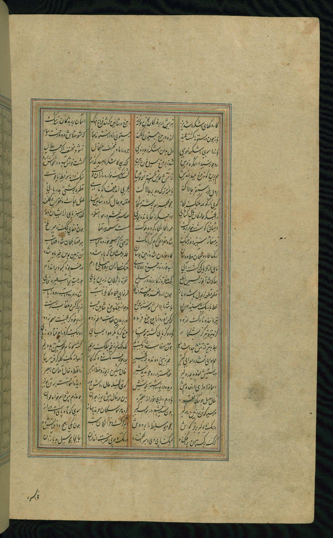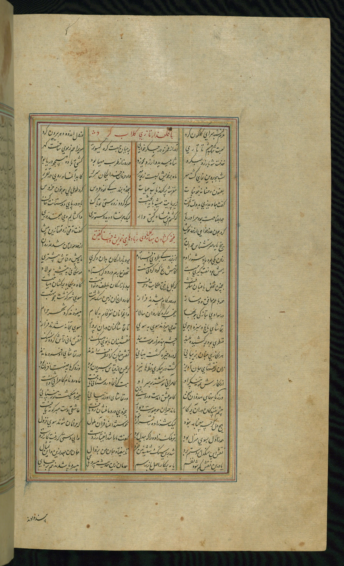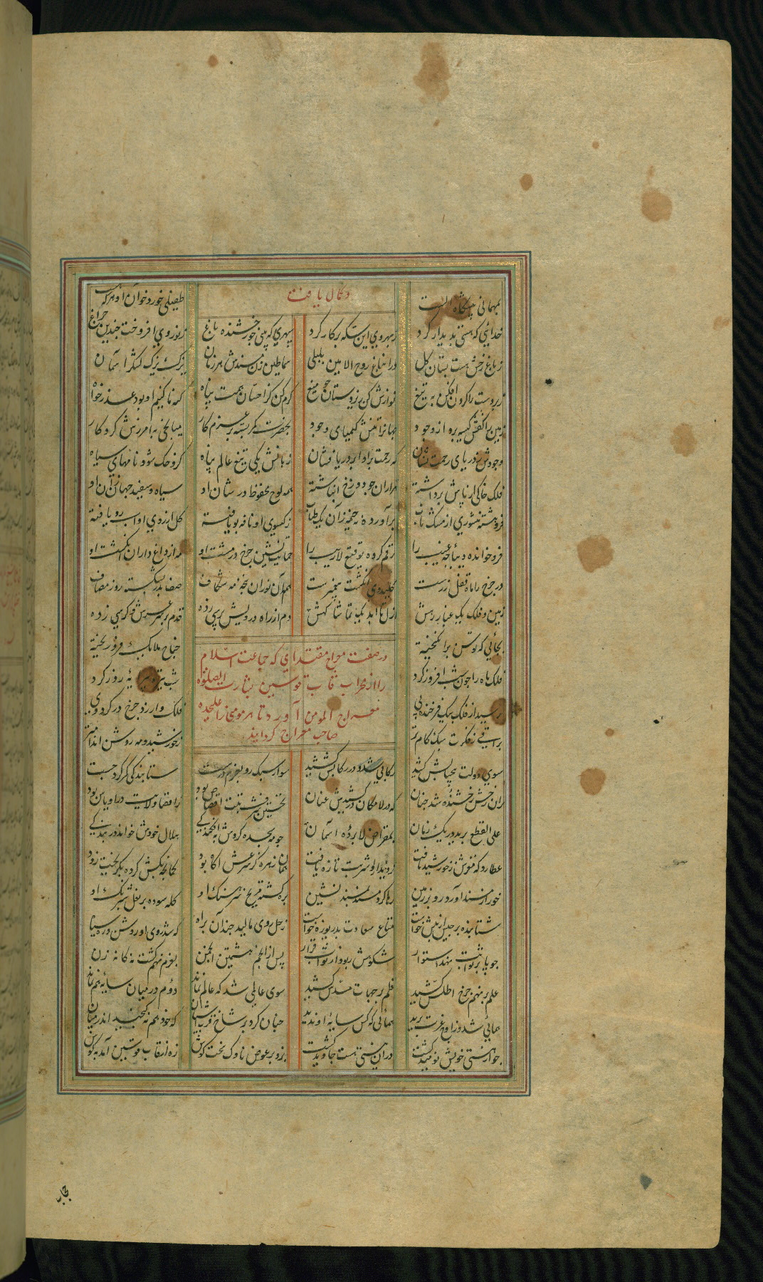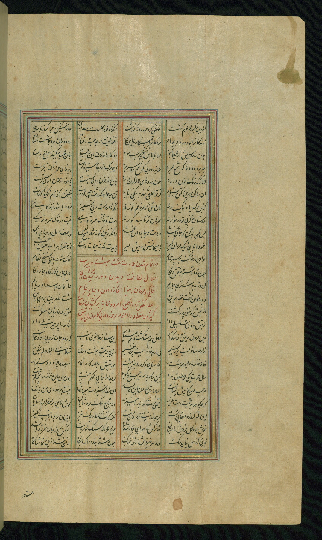This illuminated and illustrated manuscript contains the Khamsah (quintet) and two historical poems (masnavi), Qirān-i saʿdayn and Nuh sipihr, by Amīr Khusraw Dihlavī (d. 725 AH / 1325 CE). The codex is dated 1017 AH / 1609 CE and was produced in Safavid Iran. All texts are written in black nastaʿlīq script with chapter headings in red. The manuscript opens with an illuminated and illustrated frontispiece of a hunting and court scene in the early Safavid style (fols. 1b-2a). The first text is Khamsah-i Dihlavī (fols. 2b-192a), which is introduced by an illuminated incipit and titlepiece with the title of the first poem of the quintet and the author's name. The second text is Qirān-i saʿdayn, a historical poem (masnavi) about the meeting of Sultan Muʿizz al-Dīn Kayqubād and his father, Nāṣir al-Din Bughrā Khān, on the banks of the Sarjū in Oudh. It is also introduced with an illuminated incipit and titlepiece (fol. 193b). The third text is Nuh sipihr, a historical poem (masnavi) describing the glories of Sultan Quṭb al-Dīn Mubārak Shāh Khaljī’s time, introduced with an illuminated incipit and headpiece (fol. 223b). The dark brown leather binding is original to the manuscript.
