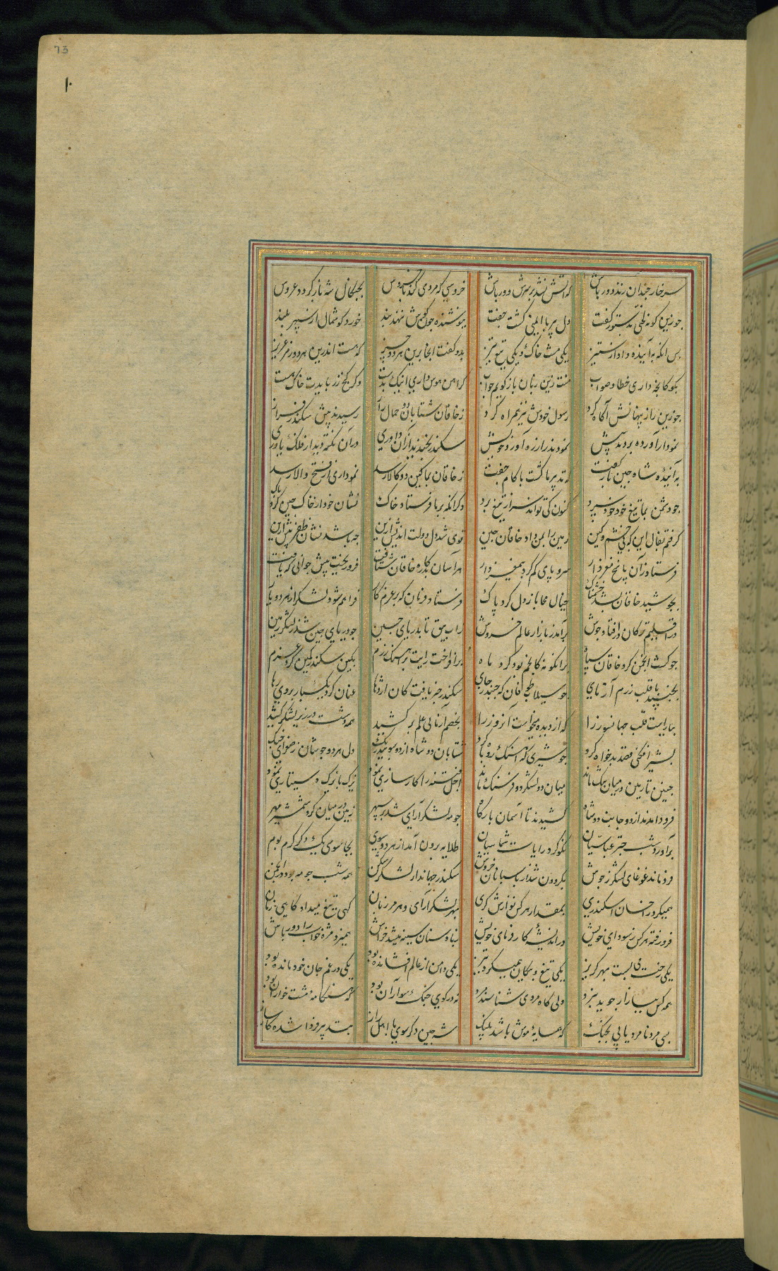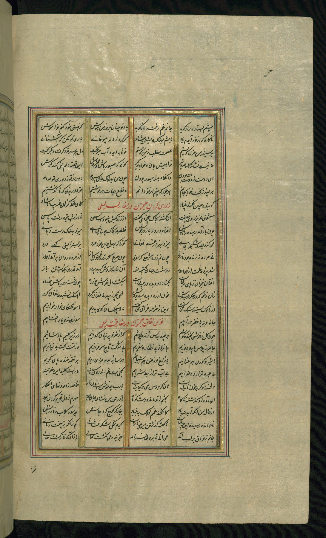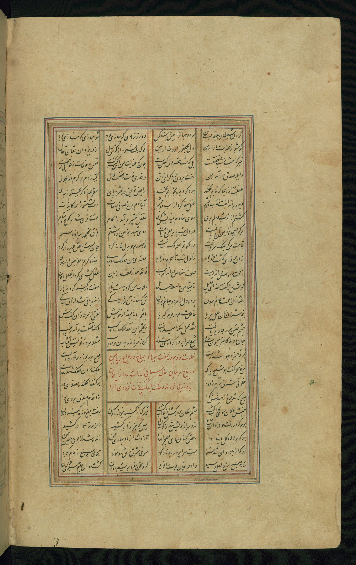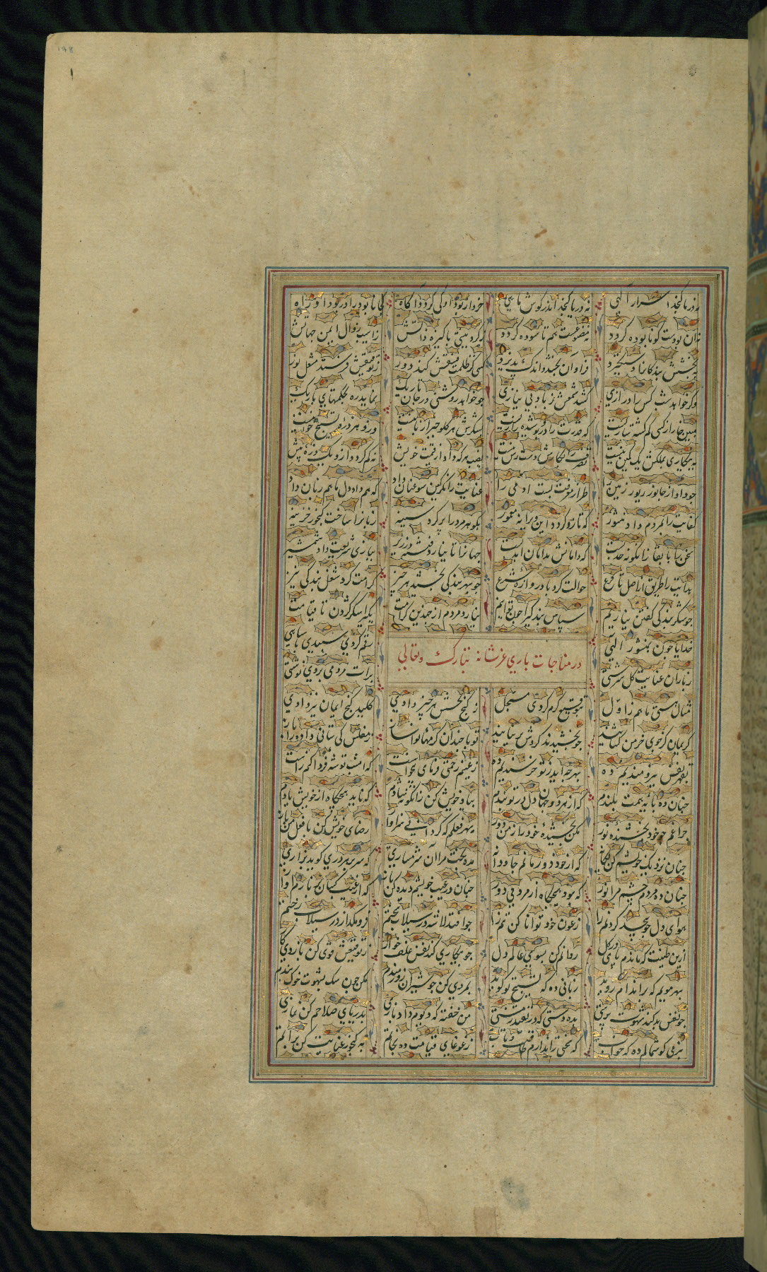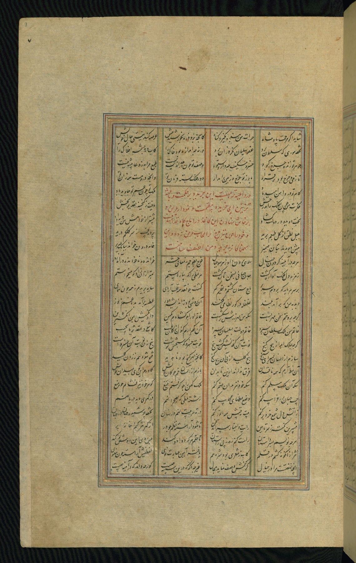 This illuminated and illustrated manuscript contains the Khamsah (quintet) and two historical poems (masnavi), Qirān-i saʿdayn and Nuh sipihr, by Amīr Khusraw Dihlavī (d. 725 AH / 1325 CE). The codex is dated 1017 AH / 1609 CE and was produced in Safavid Iran. All texts are written in black nastaʿlīq script with chapter headings in red. The manuscript opens with an illuminated and illustrated frontispiece of a hunting and court scene in the early Safavid style (fols. 1b-2a). The first text is Khamsah-i Dihlavī (fols. 2b-192a), which is introduced by an illuminated incipit and titlepiece with the title of the first poem of the quintet and the author's name. The second text is Qirān-i saʿdayn, a historical poem (masnavi) about the meeting of Sultan Muʿizz al-Dīn Kayqubād and his father, Nāṣir al-Din Bughrā Khān, on the banks of the Sarjū in Oudh. It is also introduced with an illuminated incipit and titlepiece (fol. 193b). The third text is Nuh sipihr, a historical poem (masnavi) describing the glories of Sultan Quṭb al-Dīn Mubārak Shāh Khaljī’s time, introduced with an illuminated incipit and headpiece (fol. 223b). The dark brown leather binding is original to the manuscript.
